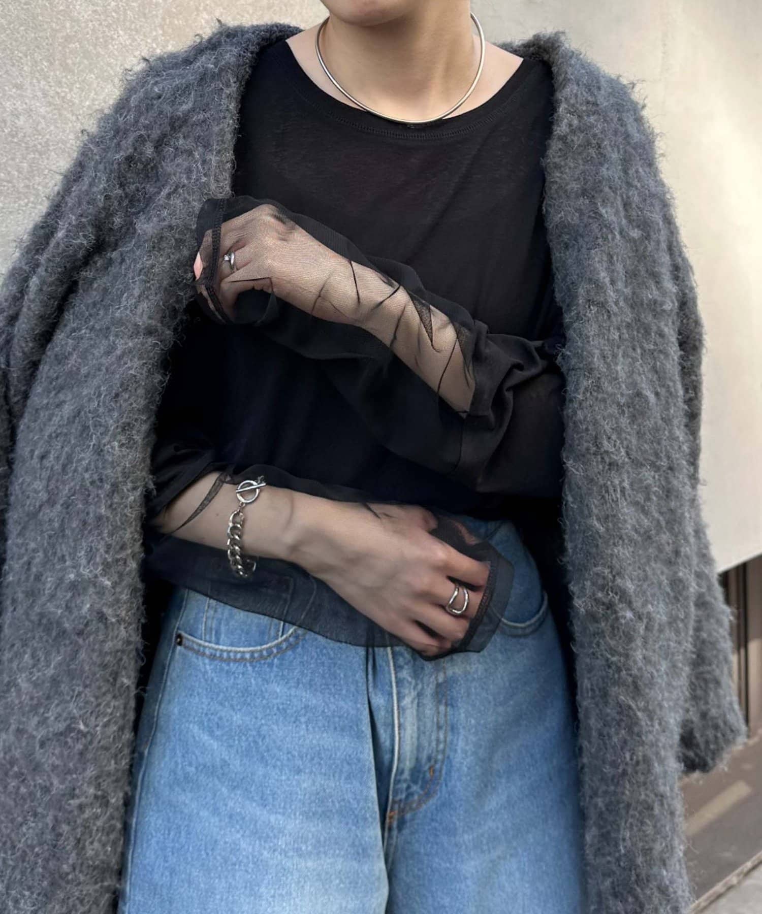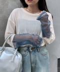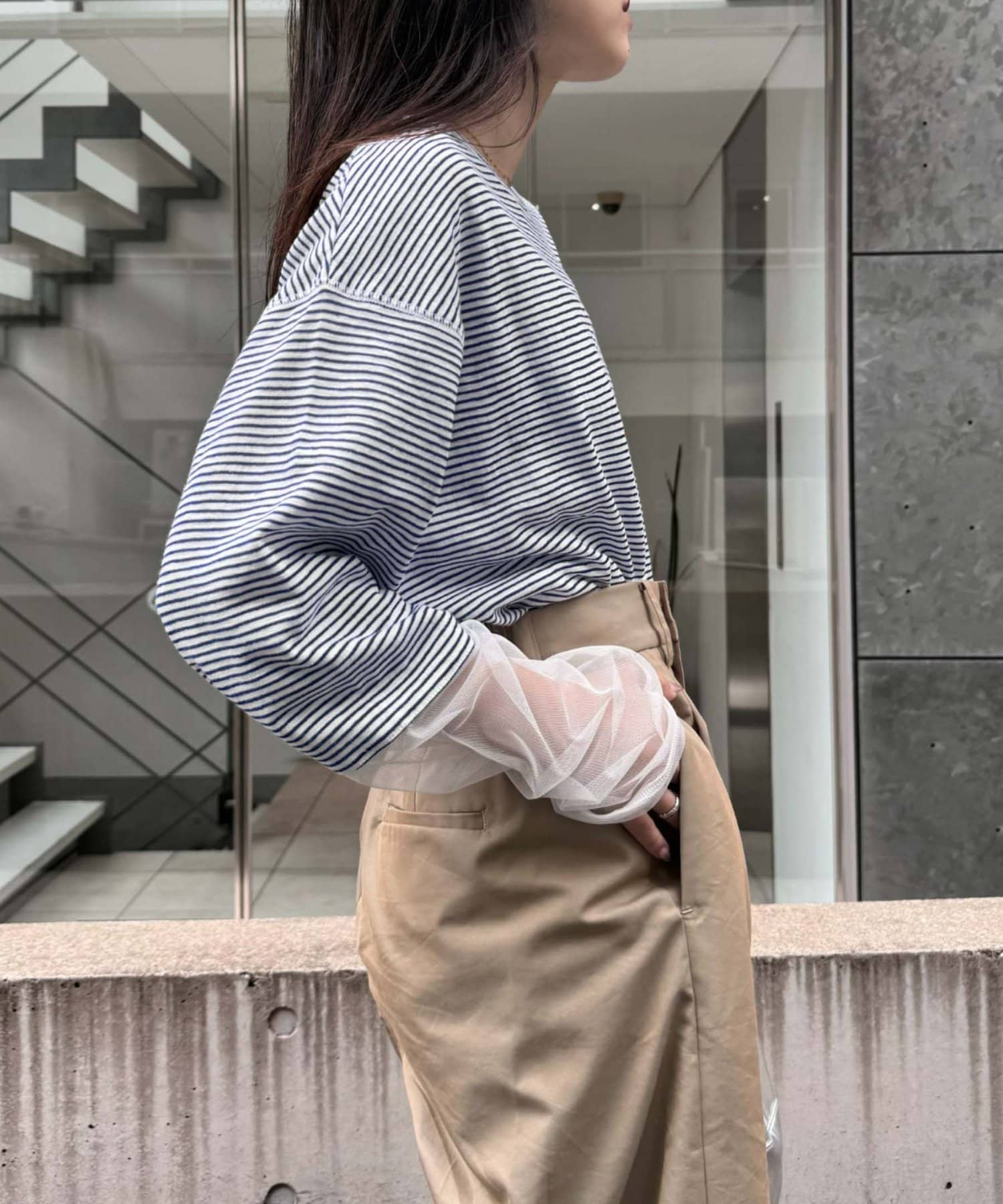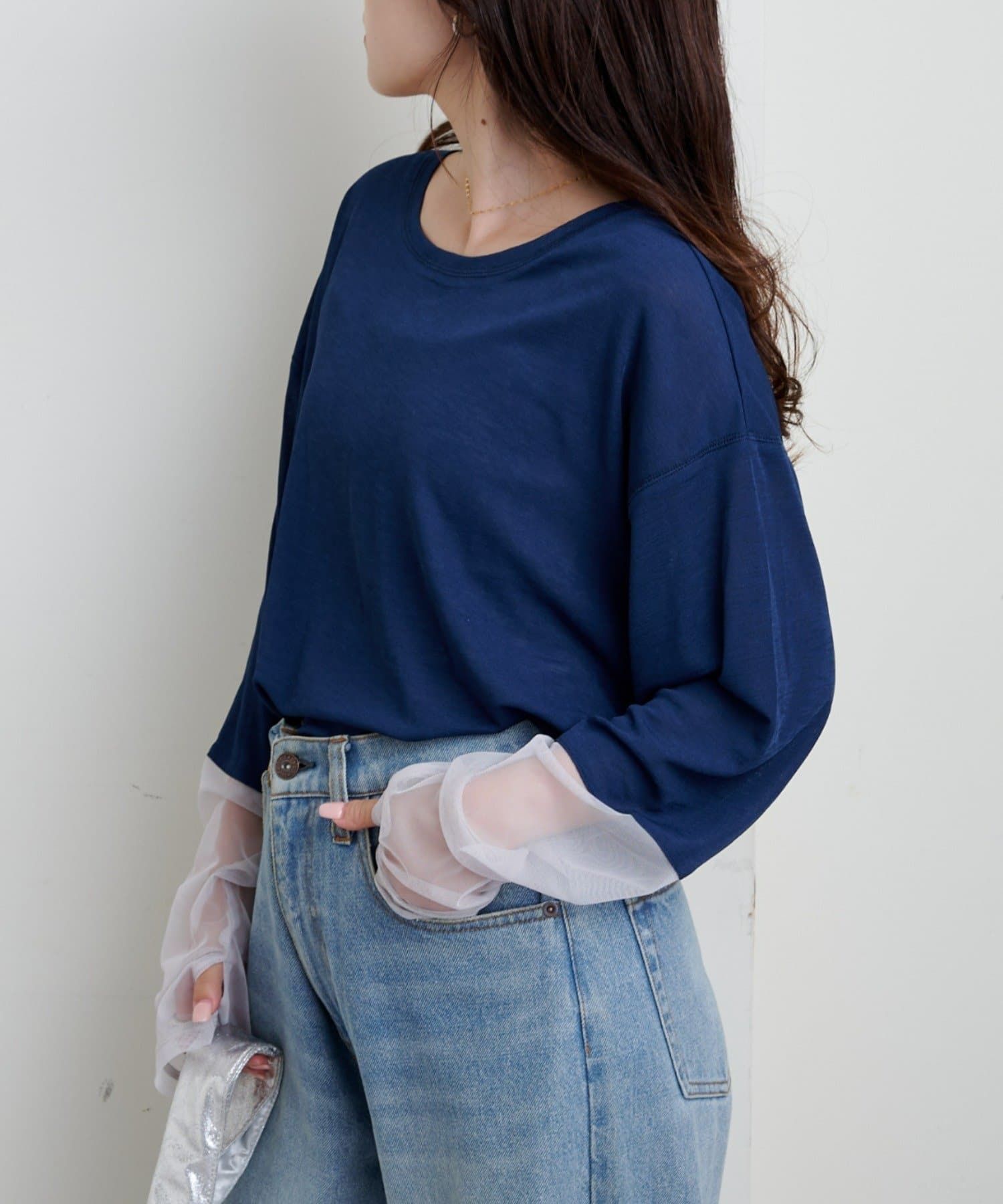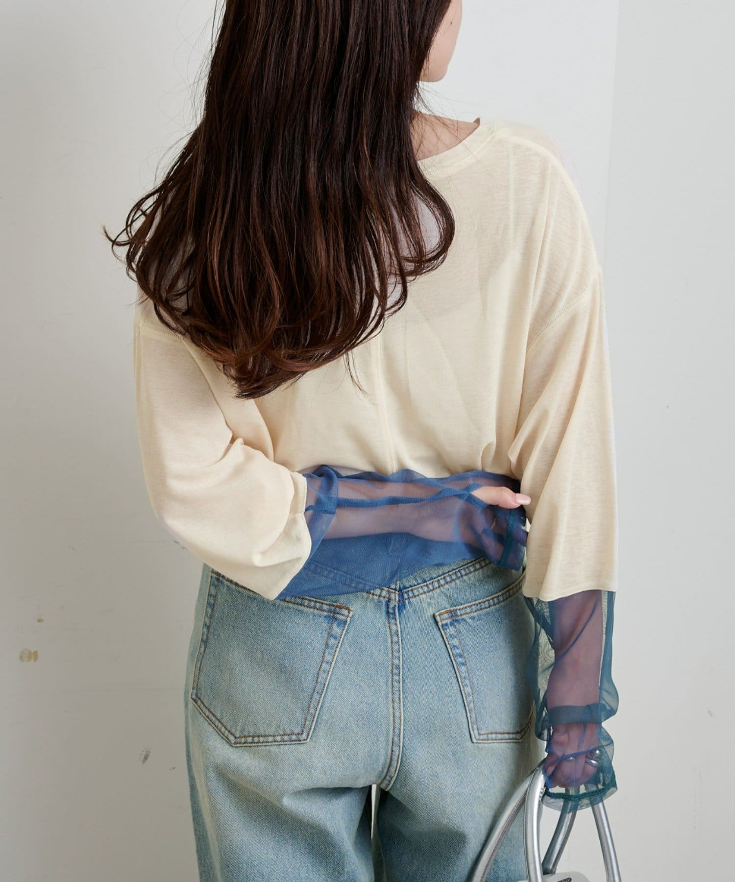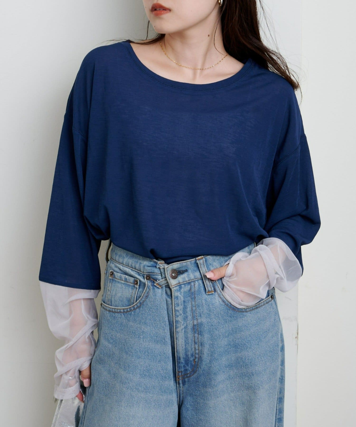 購入場所:店舗袖は長め。全体がシアー感ありのため、アクセントが強いボトムにさらっと流行りを添えたい時に良いです。