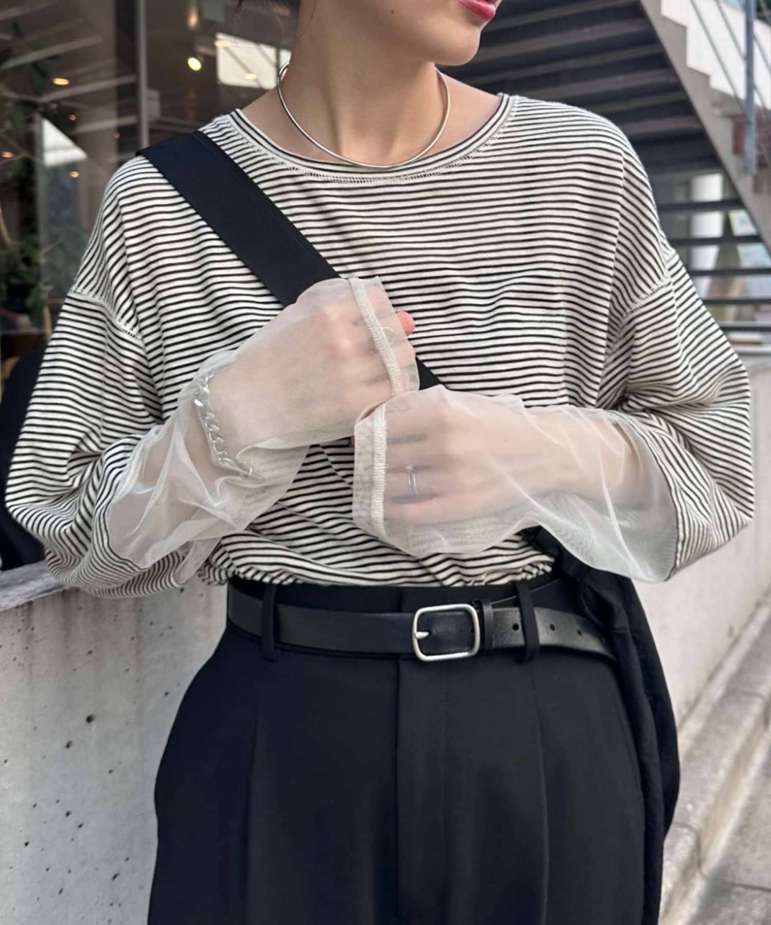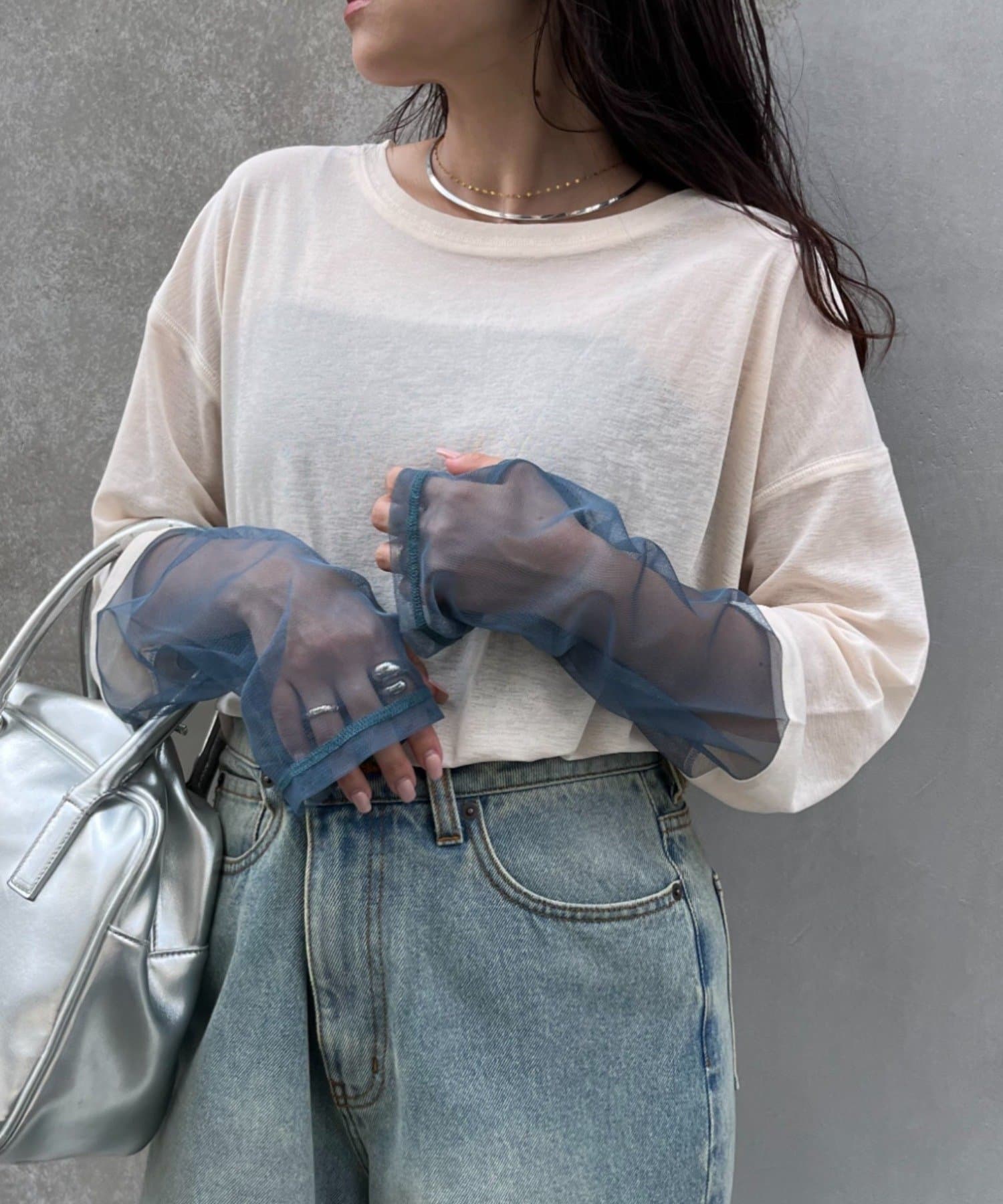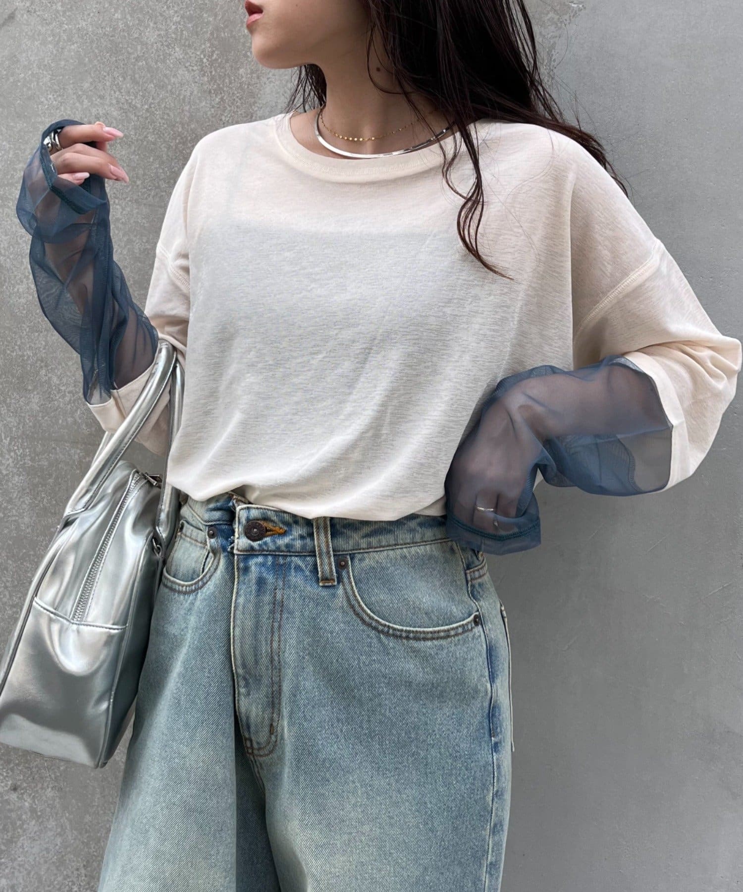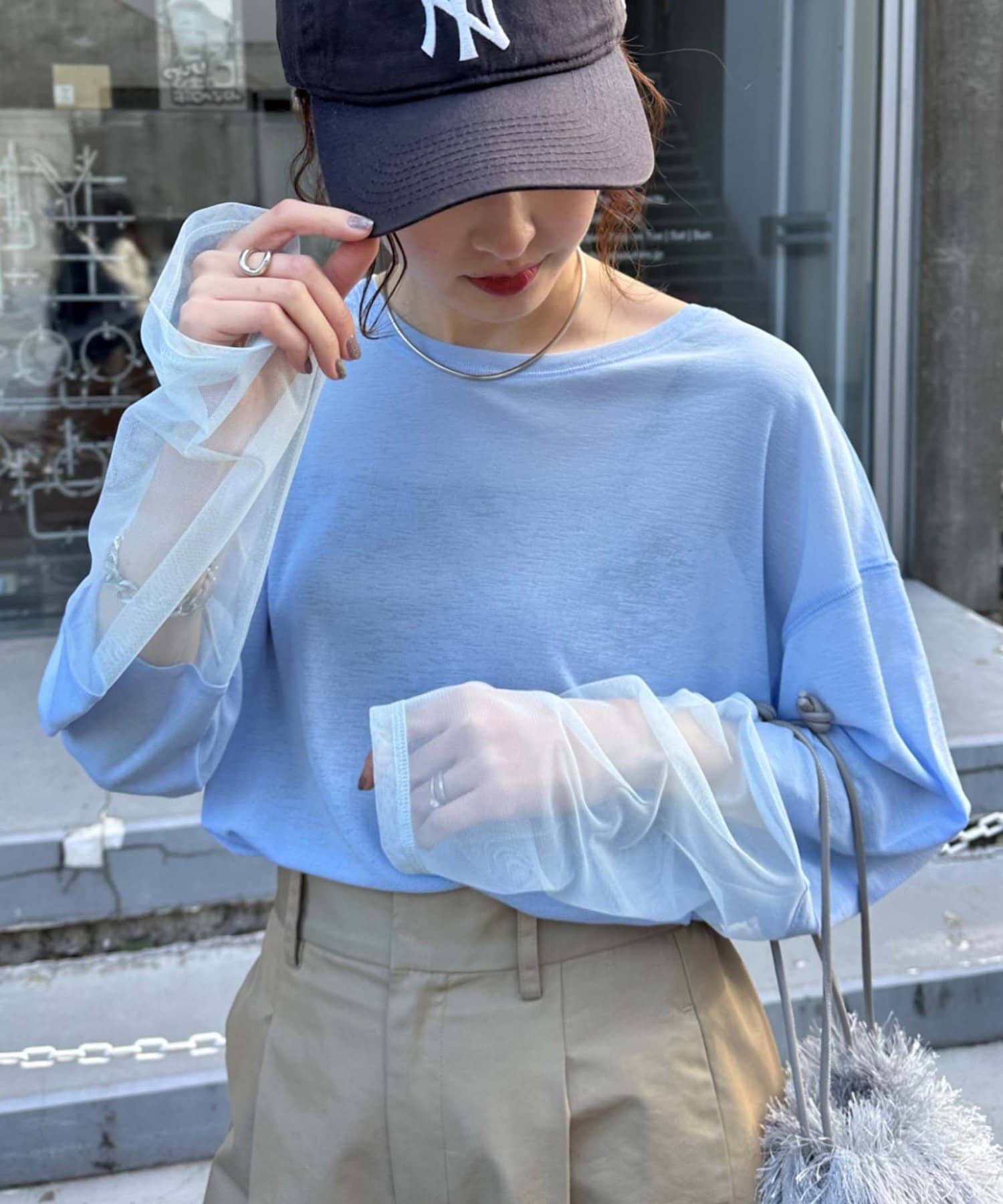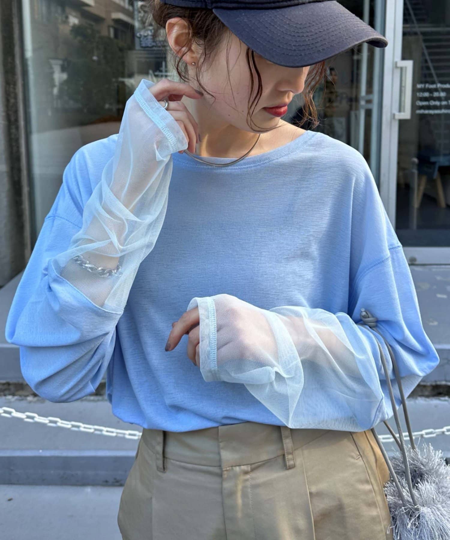 購入場所:店舗袖は長め。全体がシアー感ありのため、アクセントが強いボトムにさらっと流行りを添えたい時に良いです。