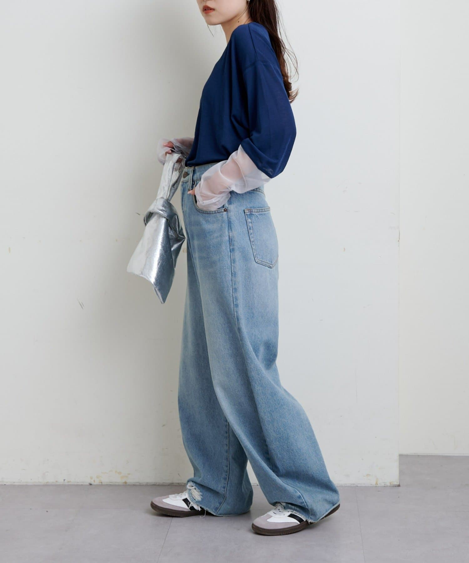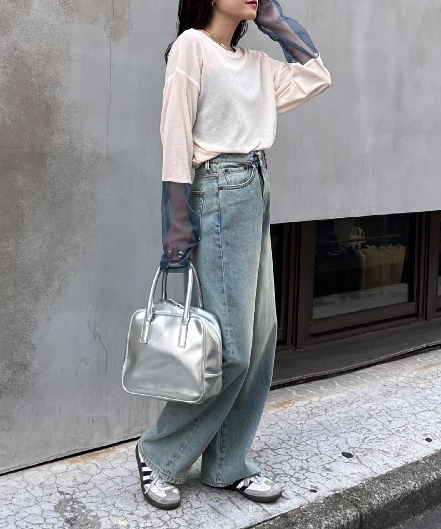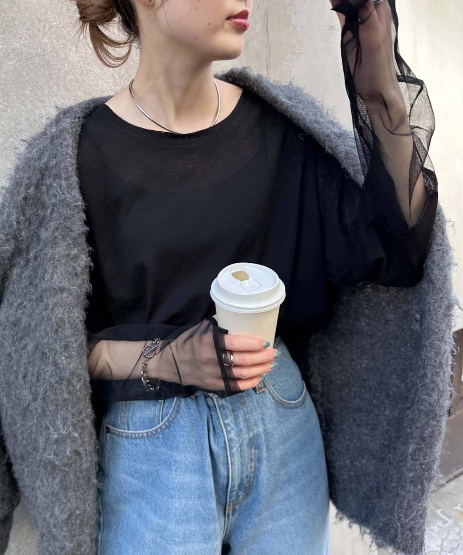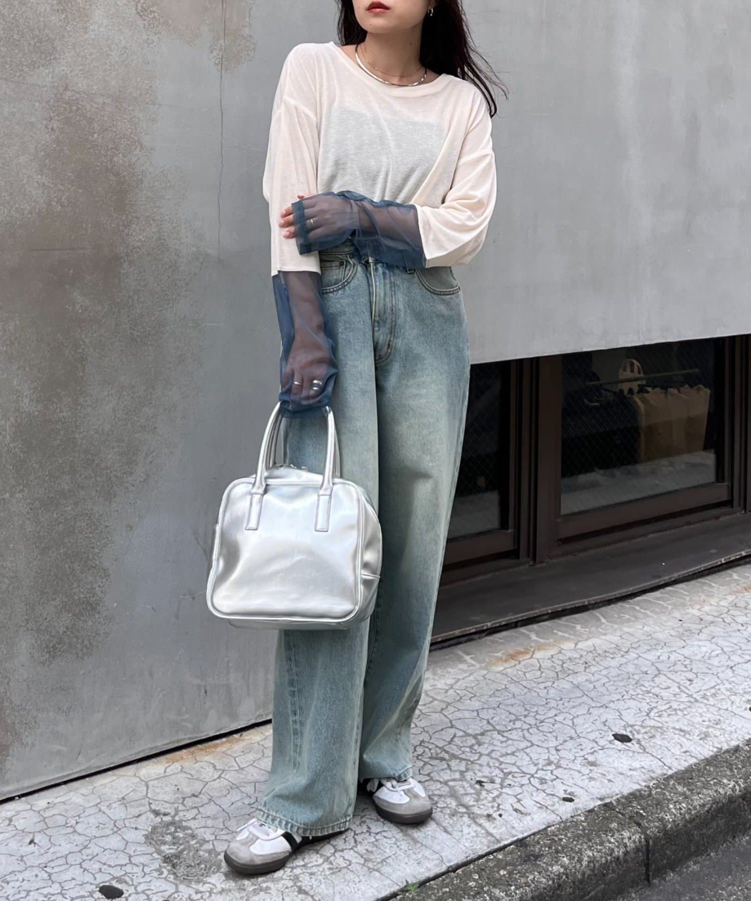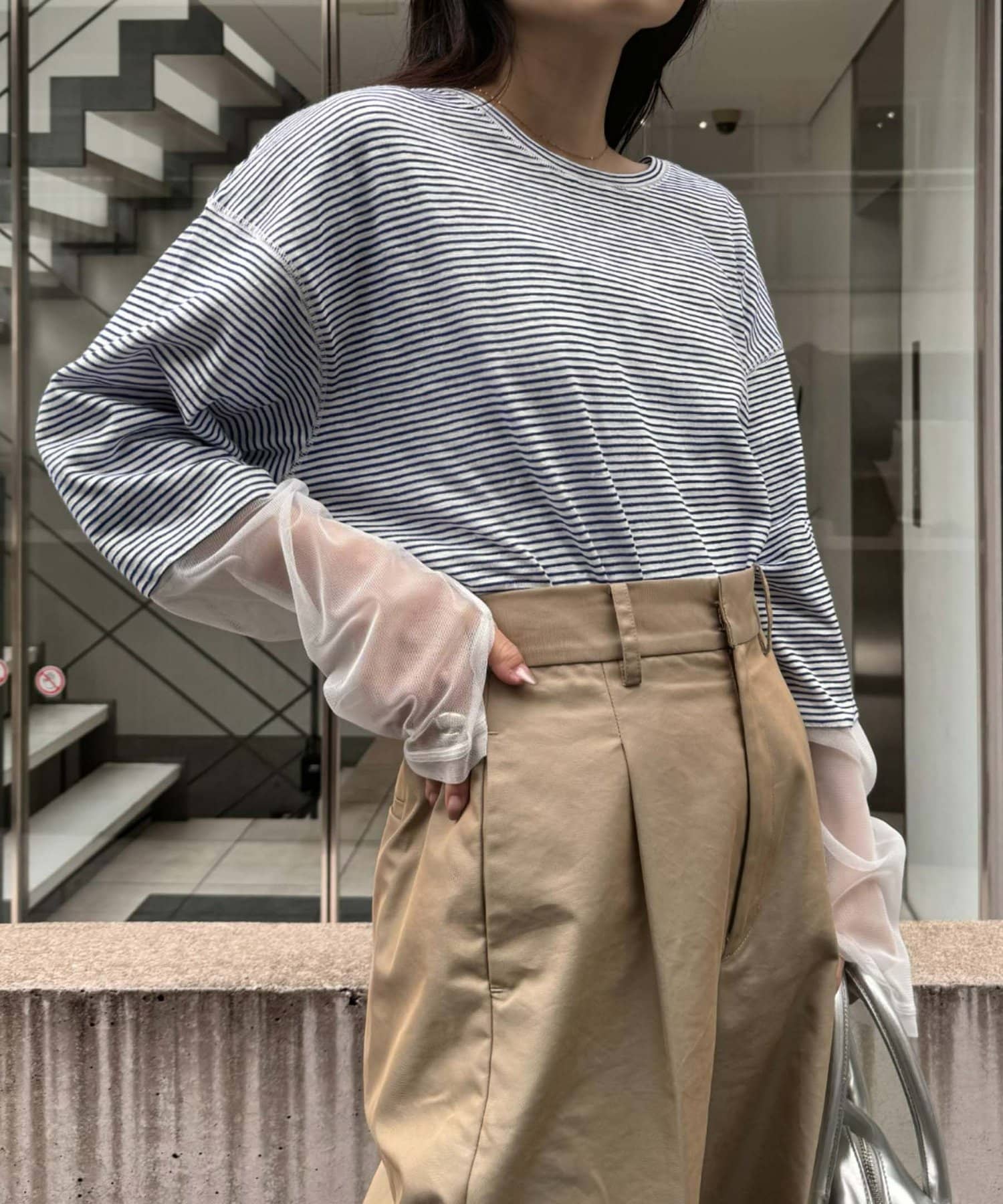 購入場所:店舗袖は長め。全体がシアー感ありのため、アクセントが強いボトムにさらっと流行りを添えたい時に良いです。