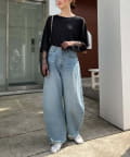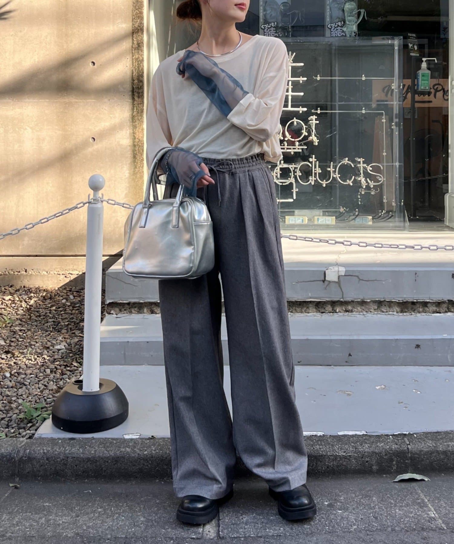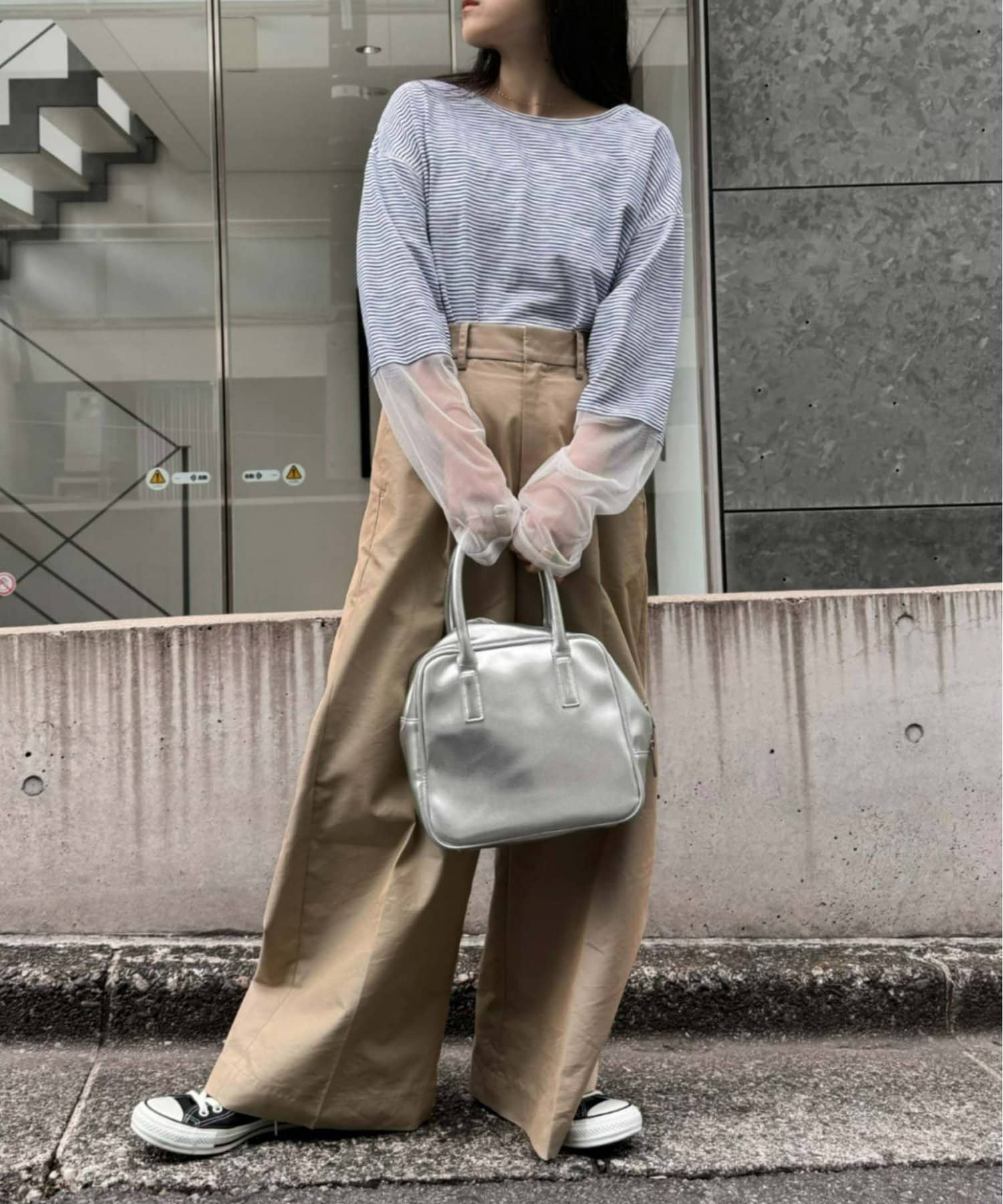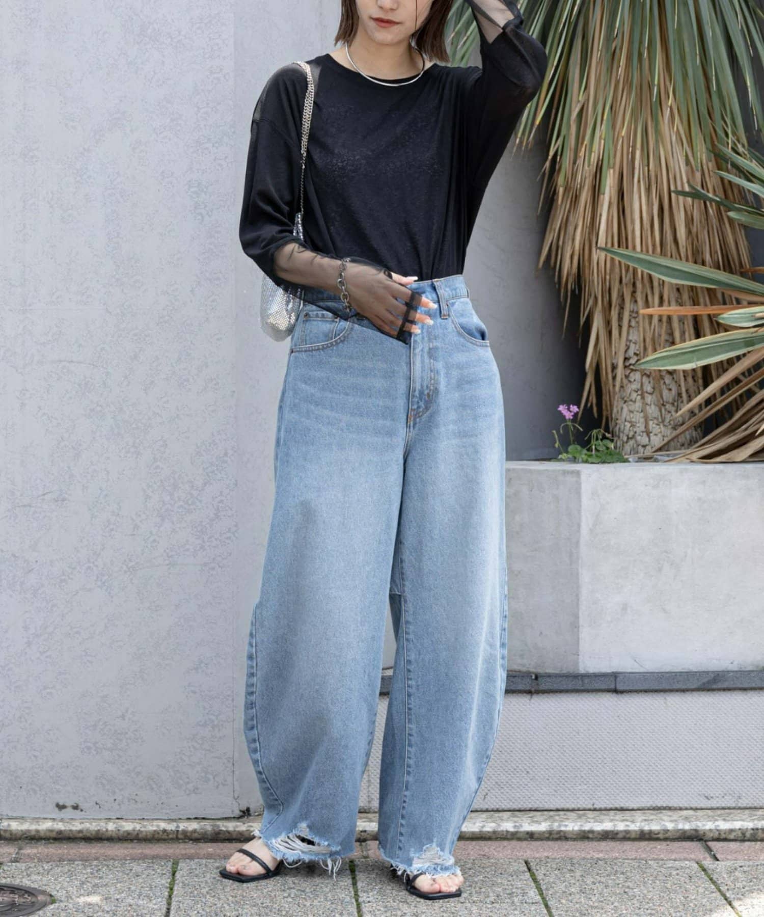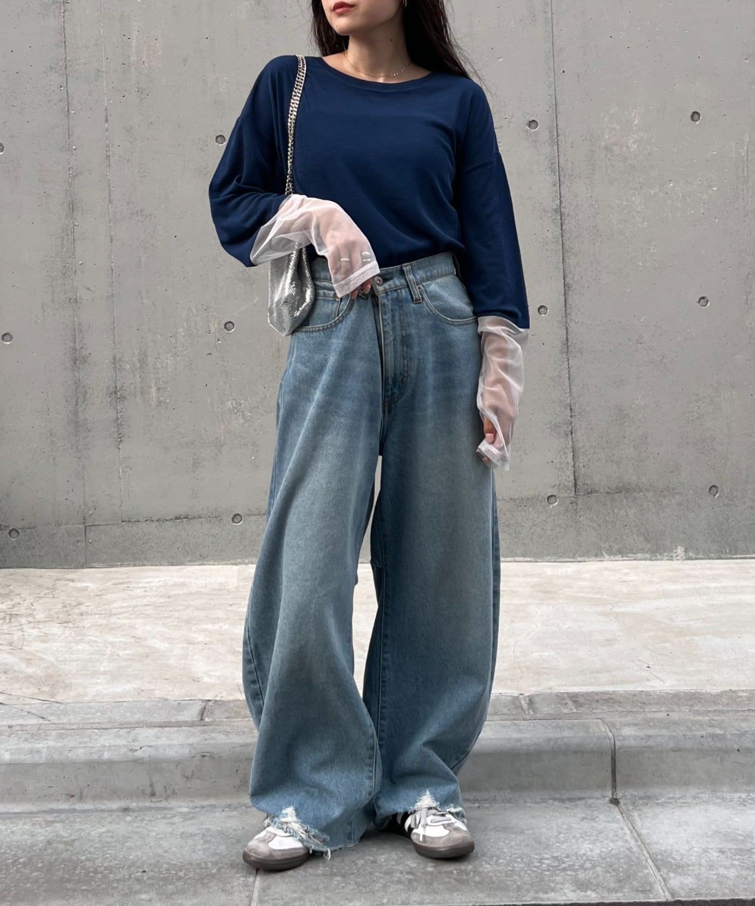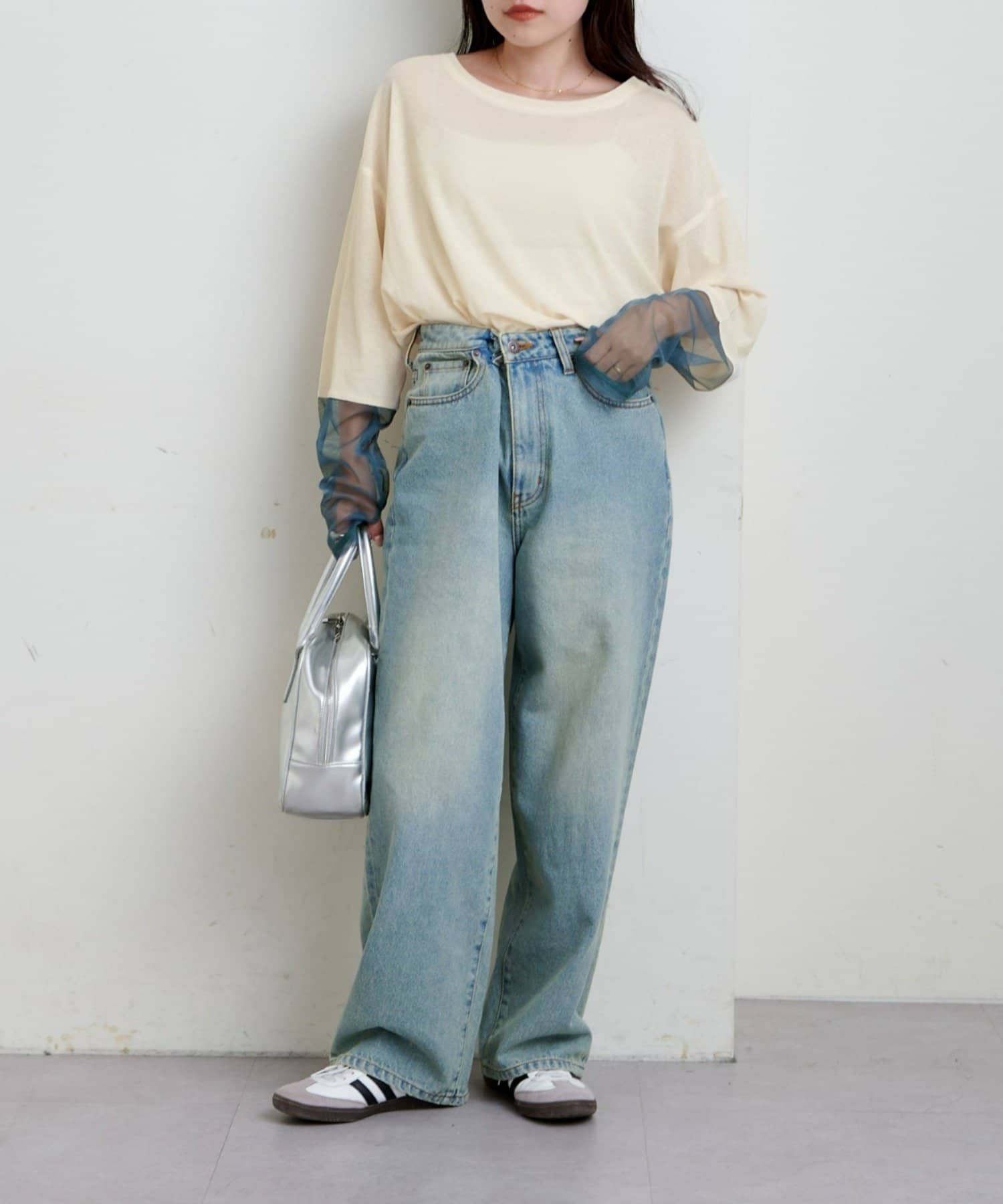 購入場所:店舗袖は長め。全体がシアー感ありのため、アクセントが強いボトムにさらっと流行りを添えたい時に良いです。