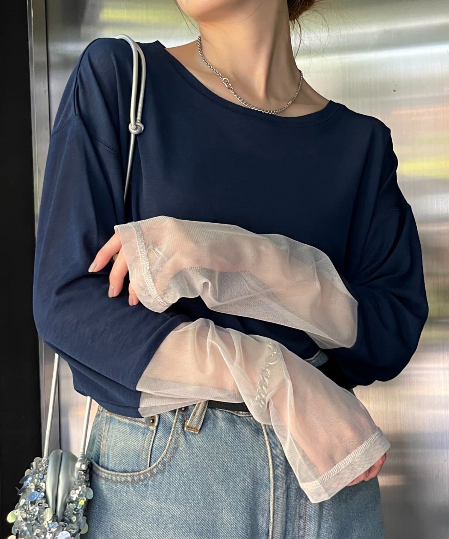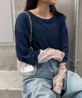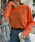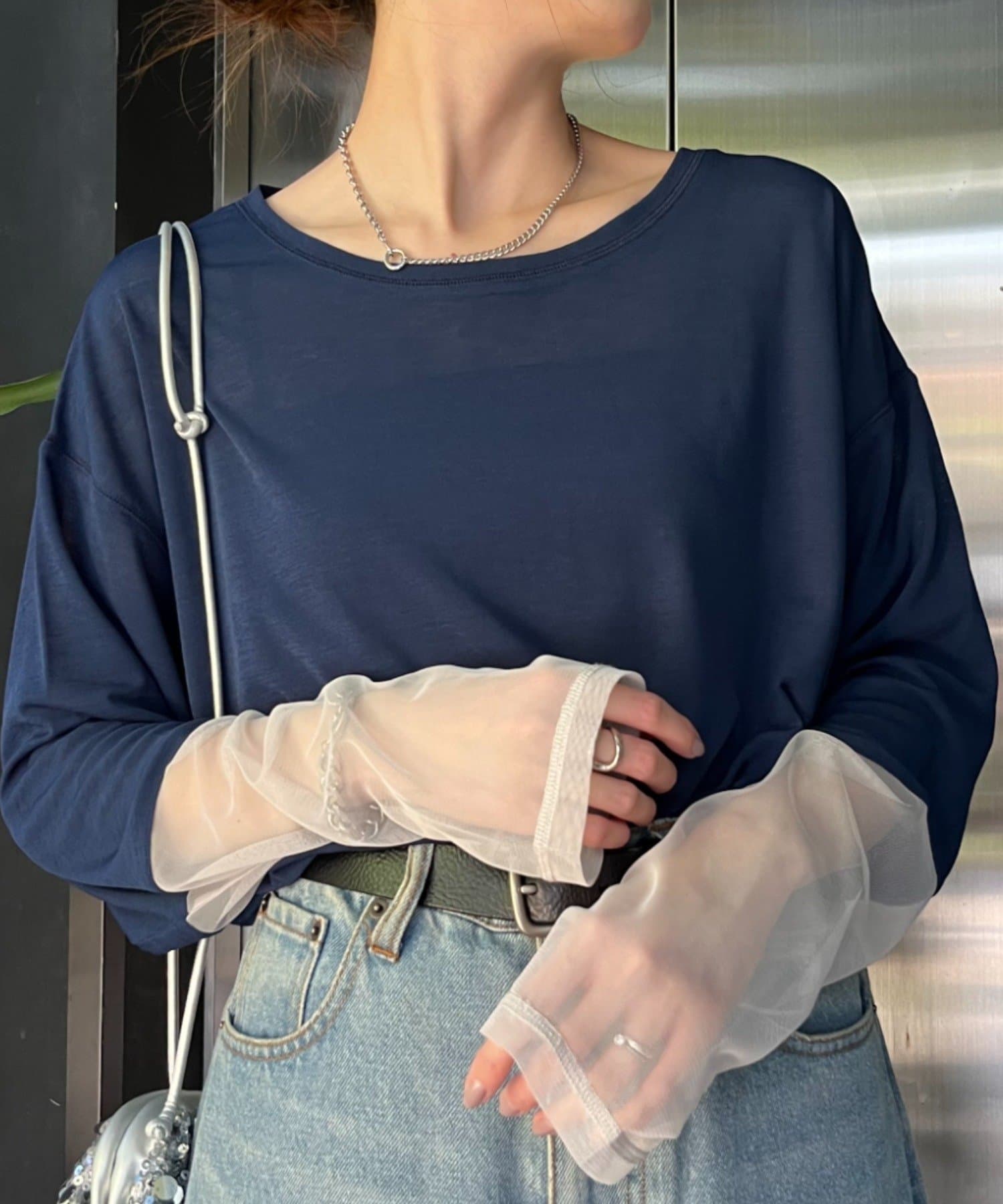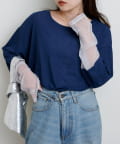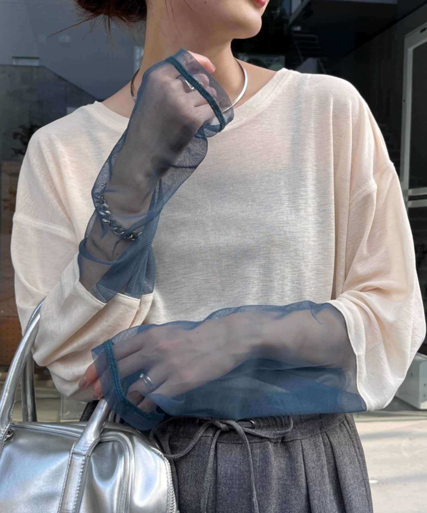 シアー感と袖切り替えがポイントなので、1枚でもインナー使いでも活躍します。