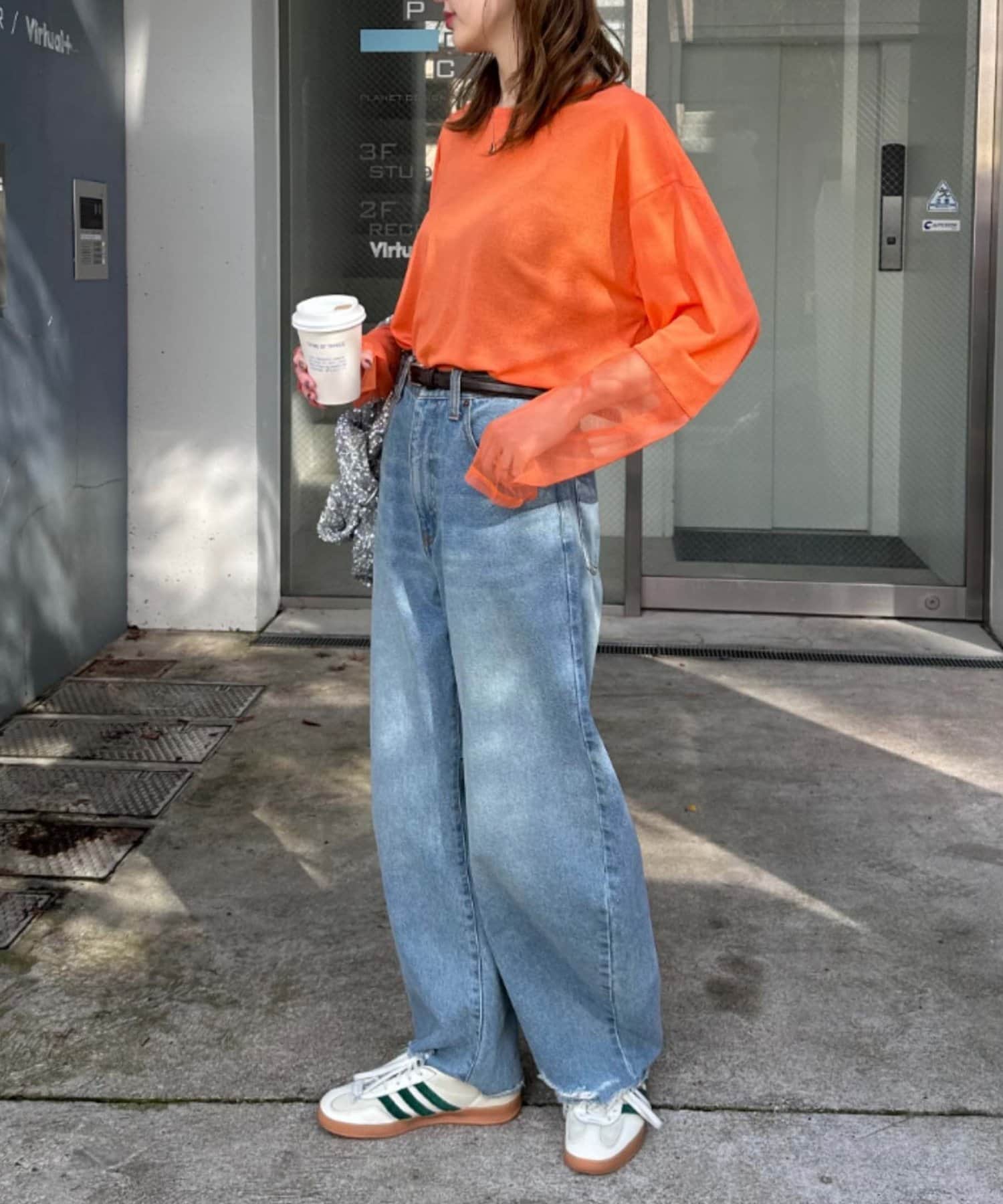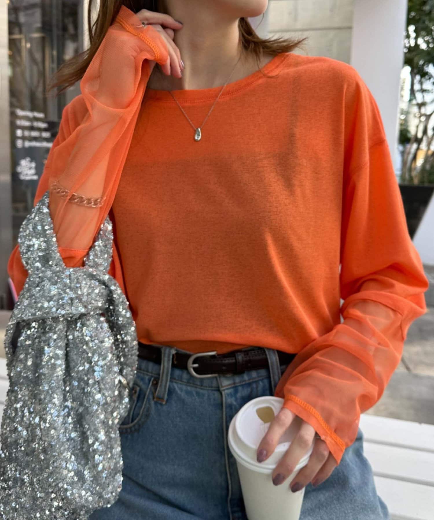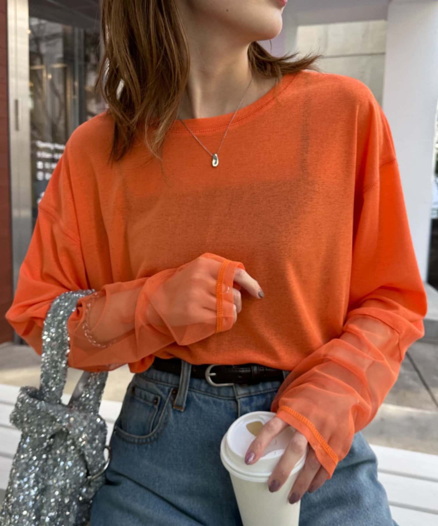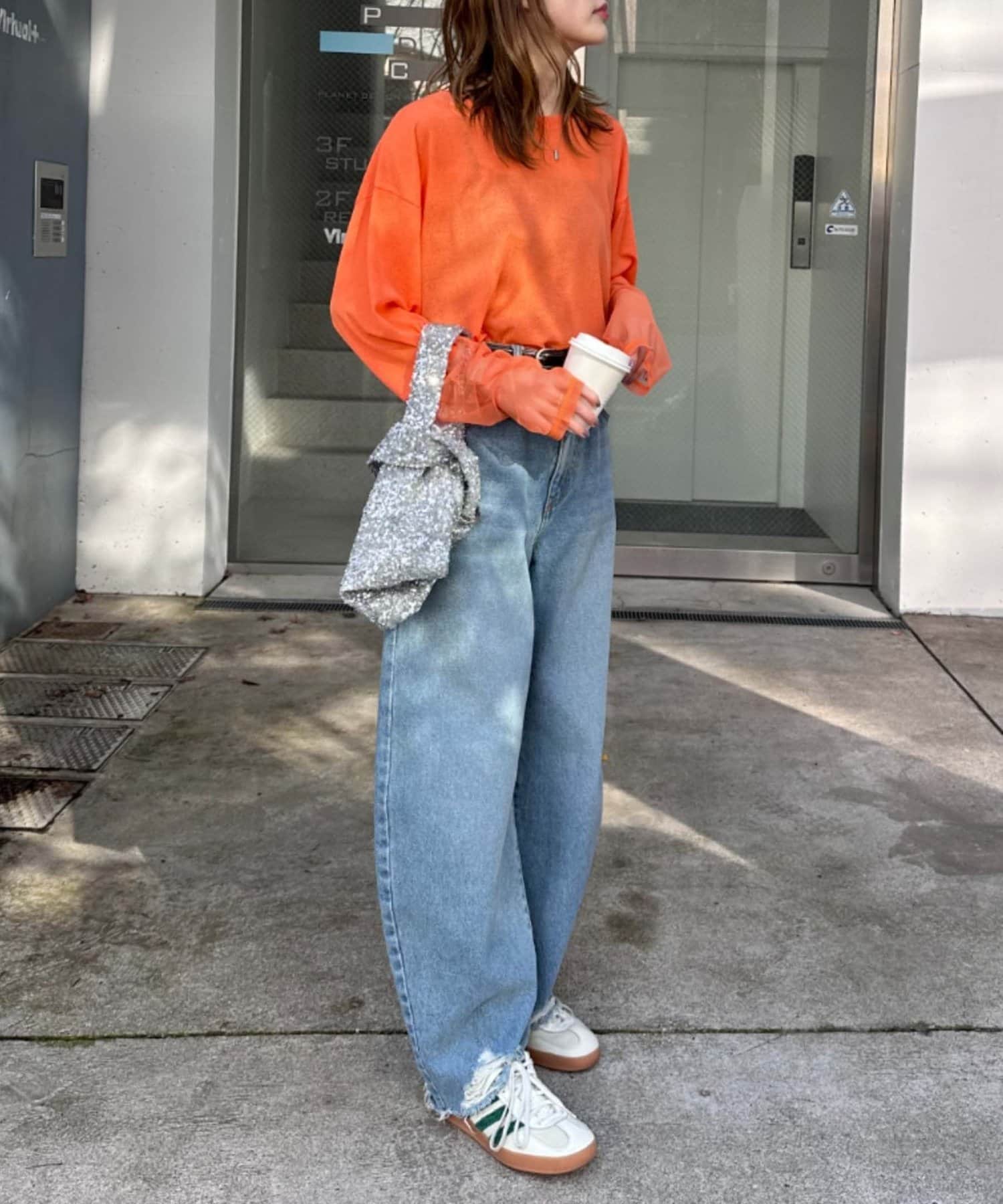 購入場所:店舗ジーンズが多いので、パッと明るくなるオレンジを選びました。インナーに着てチラ見せも可愛いです。