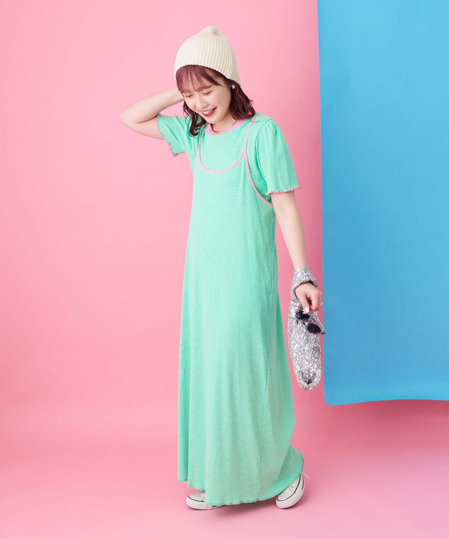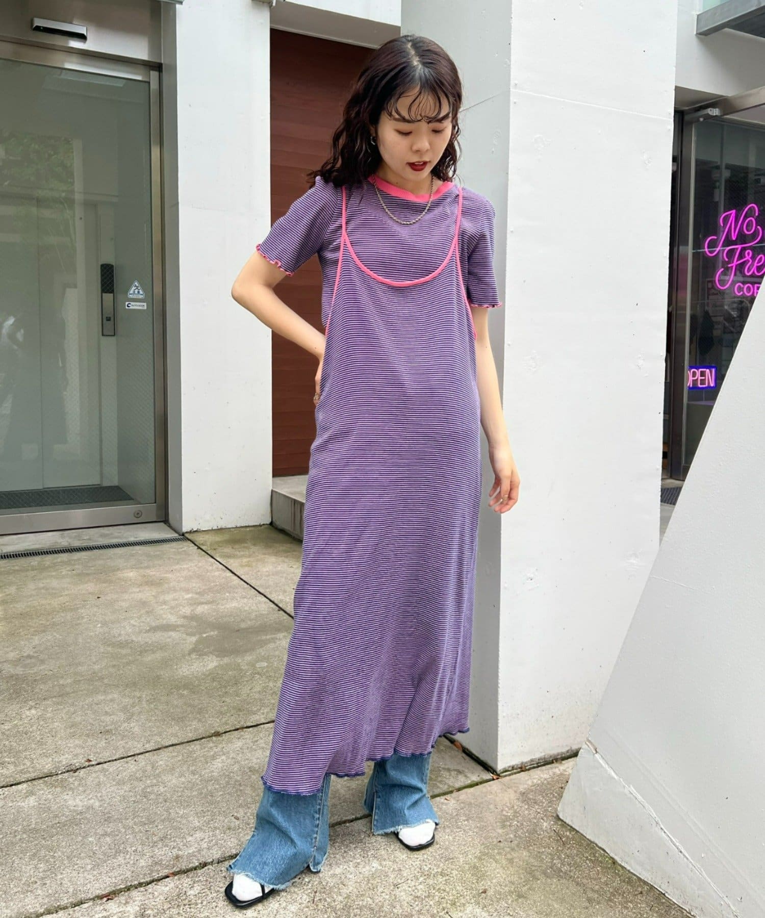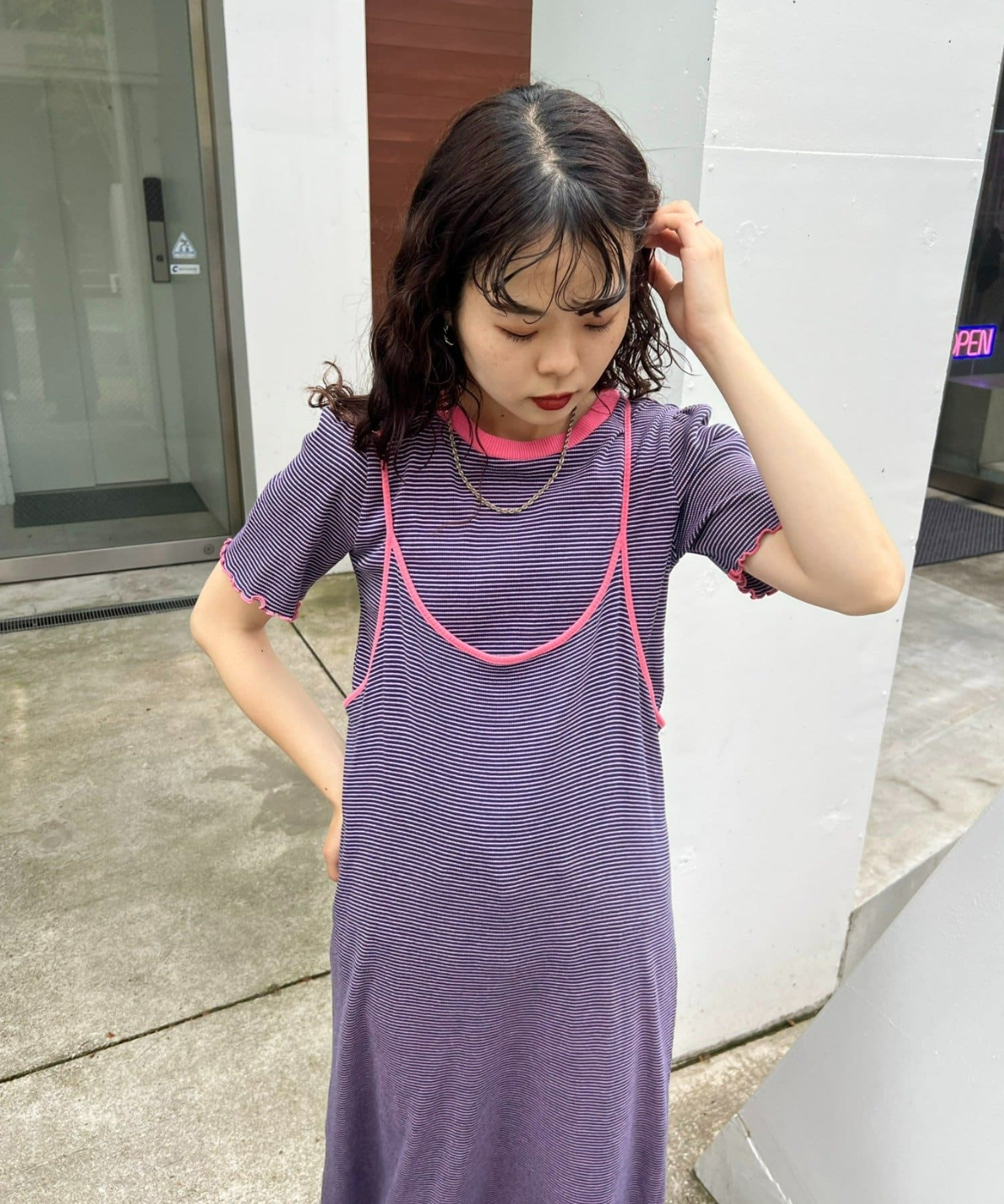 キャミワンピースは、裾部分を切りっぱなし風にすることでこなれ感を演出してます。