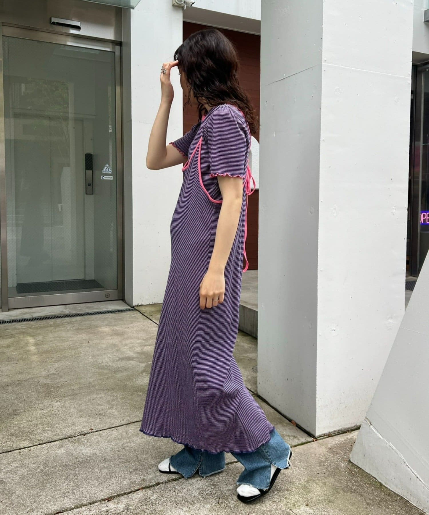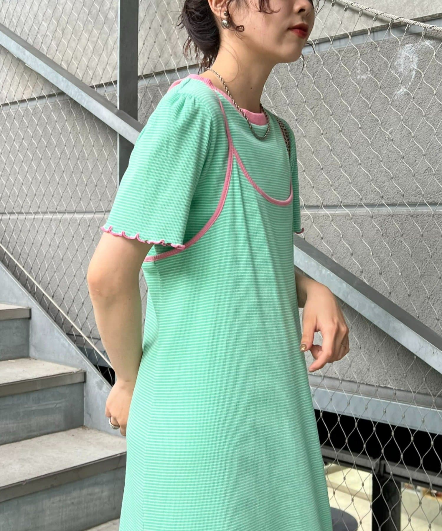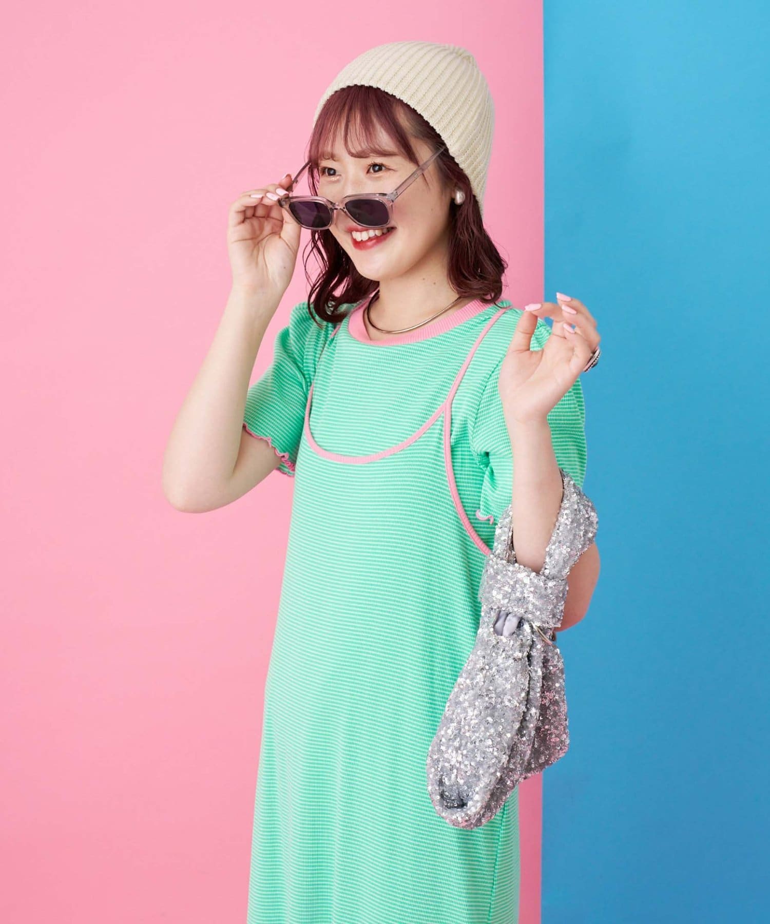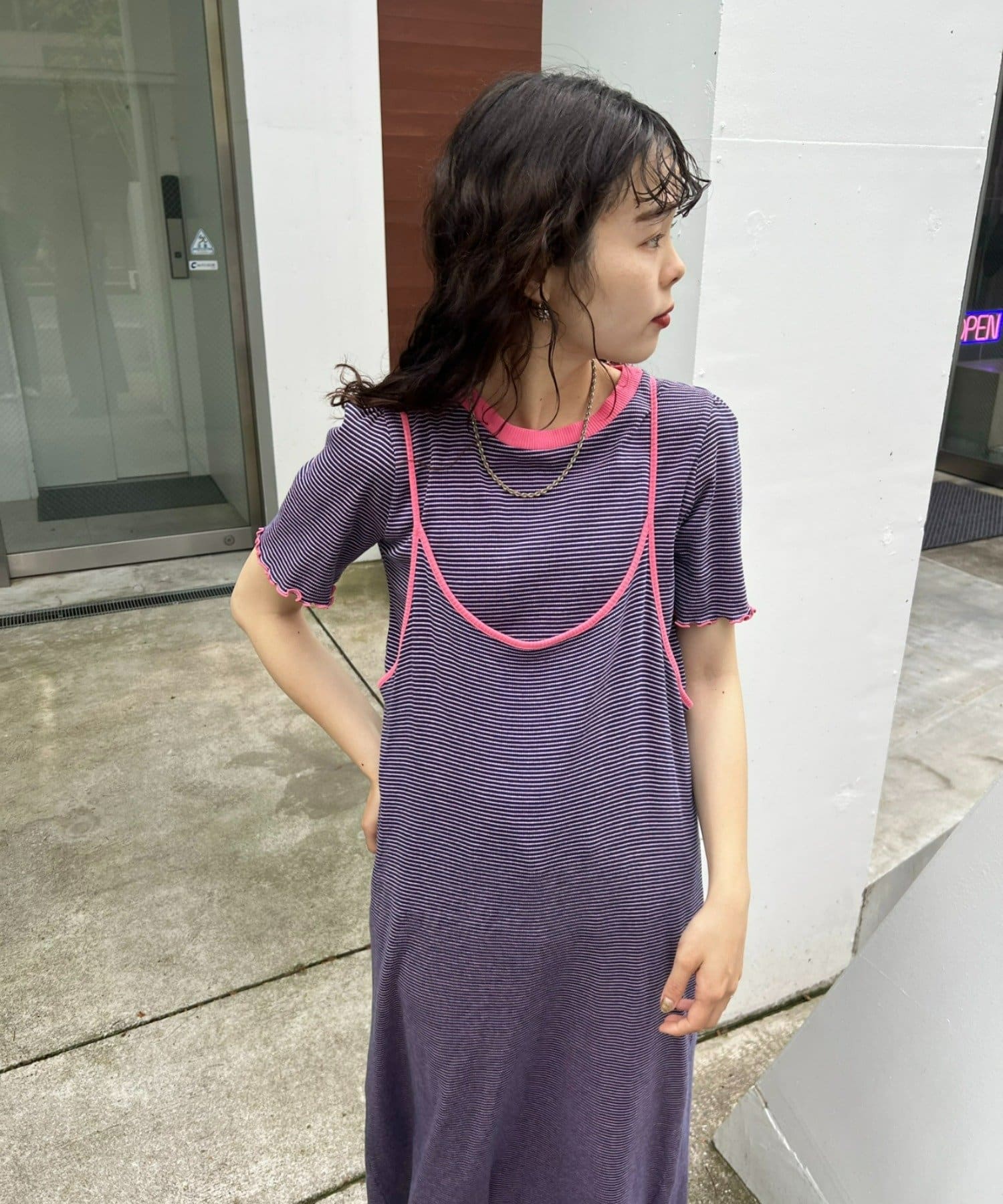 キャミワンピースは、裾部分を切りっぱなし風にすることでこなれ感を演出してます。