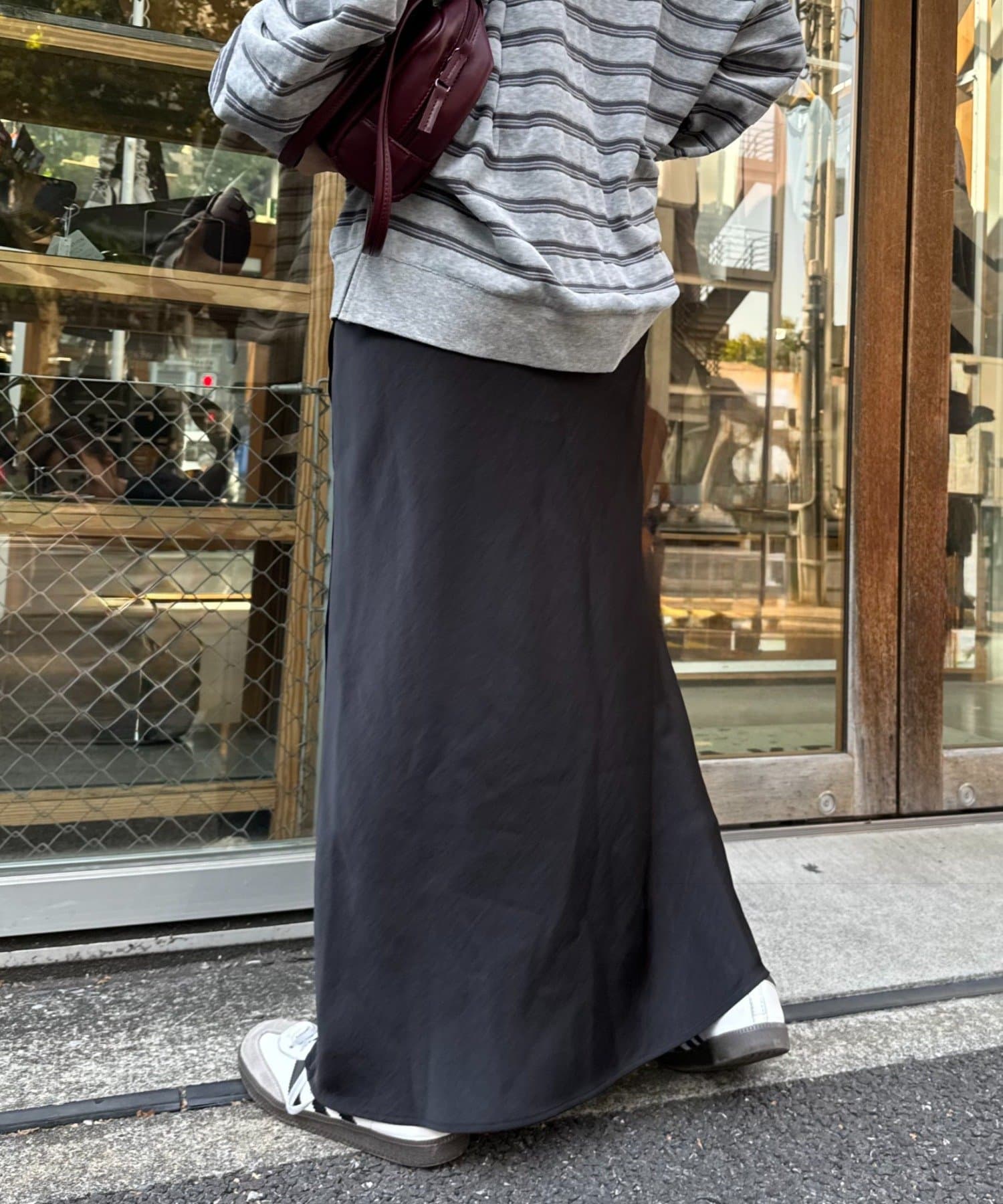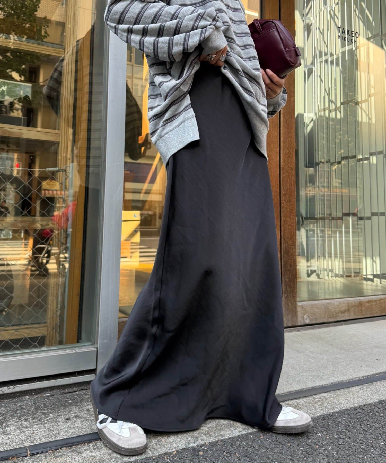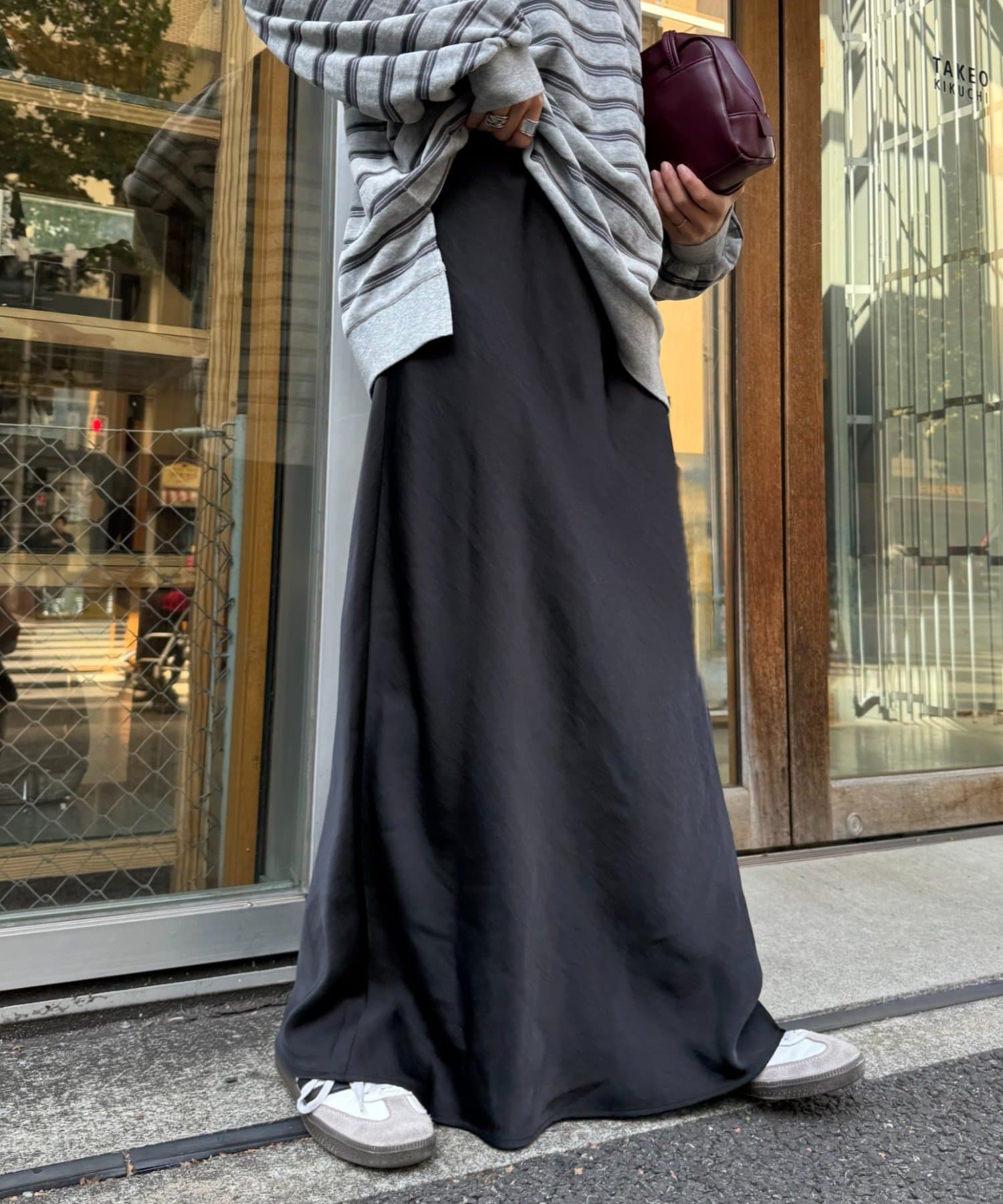 購入場所:店舗サテンスカートは生地が伸びない分大股で歩くのが難しい商品が多いですが、こちらのスカートは少しフレアになっているのでとても歩きやすいです。着痩せ効果も抜群です!