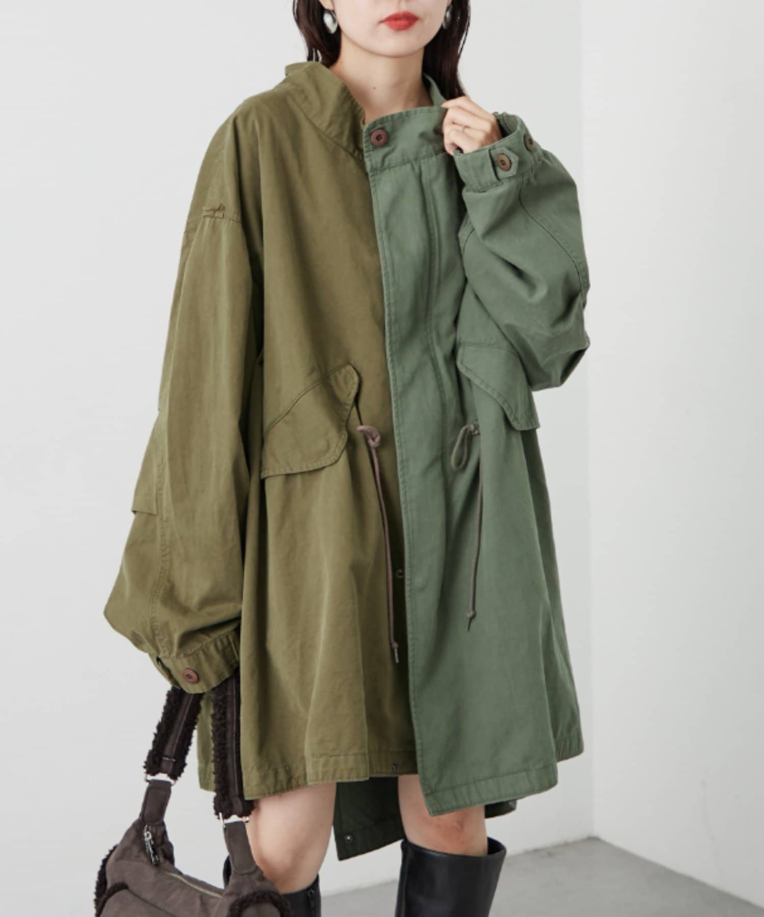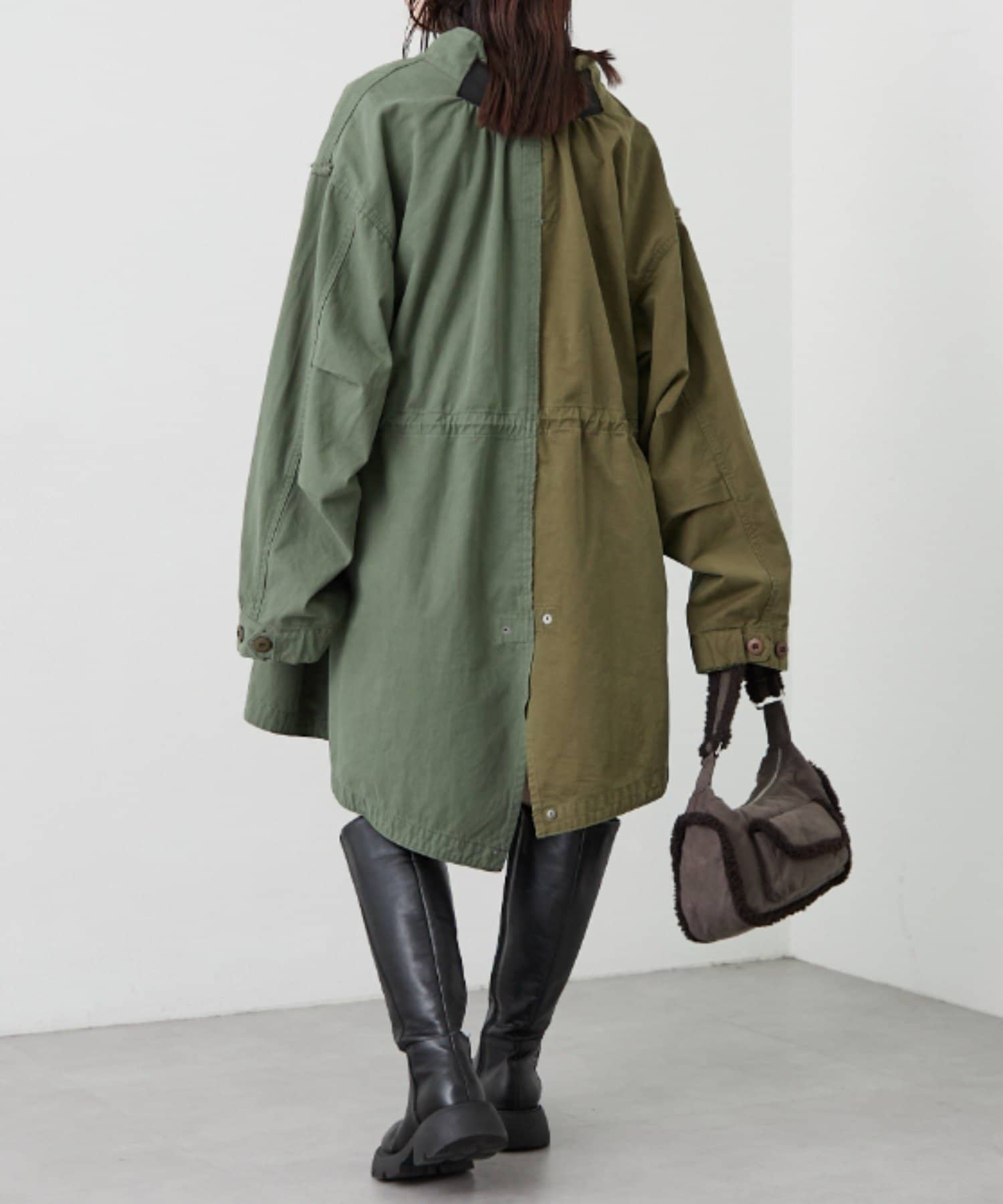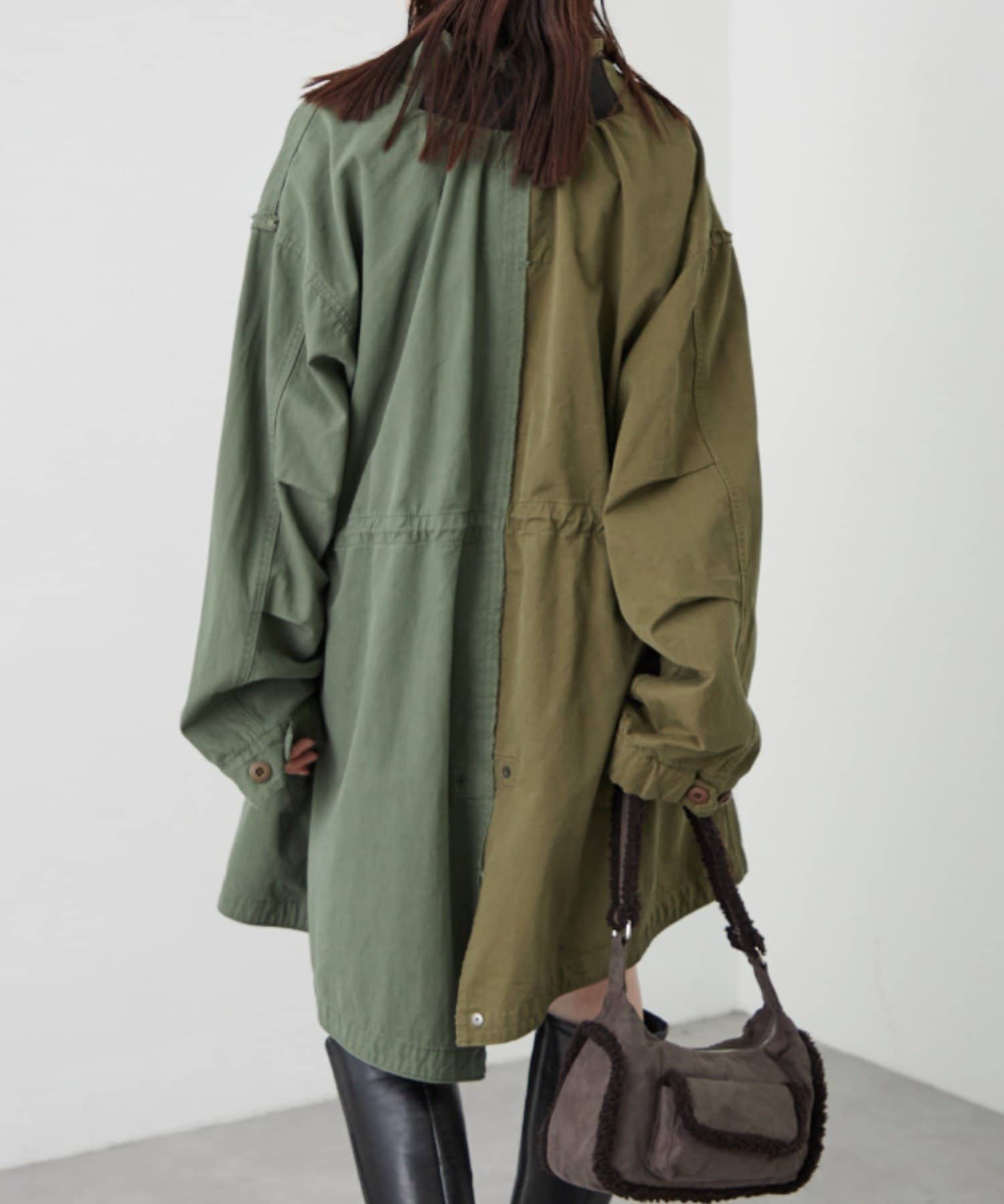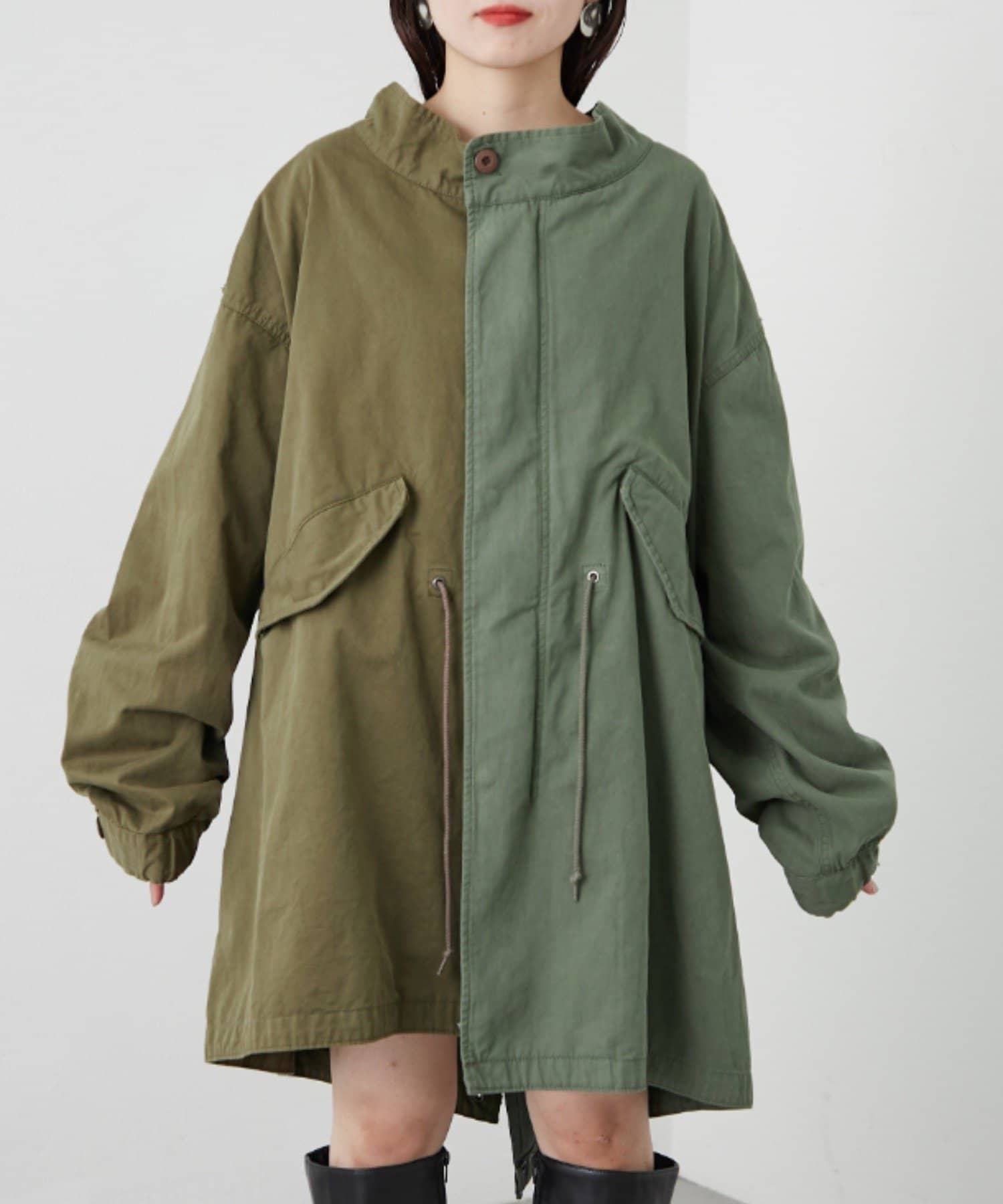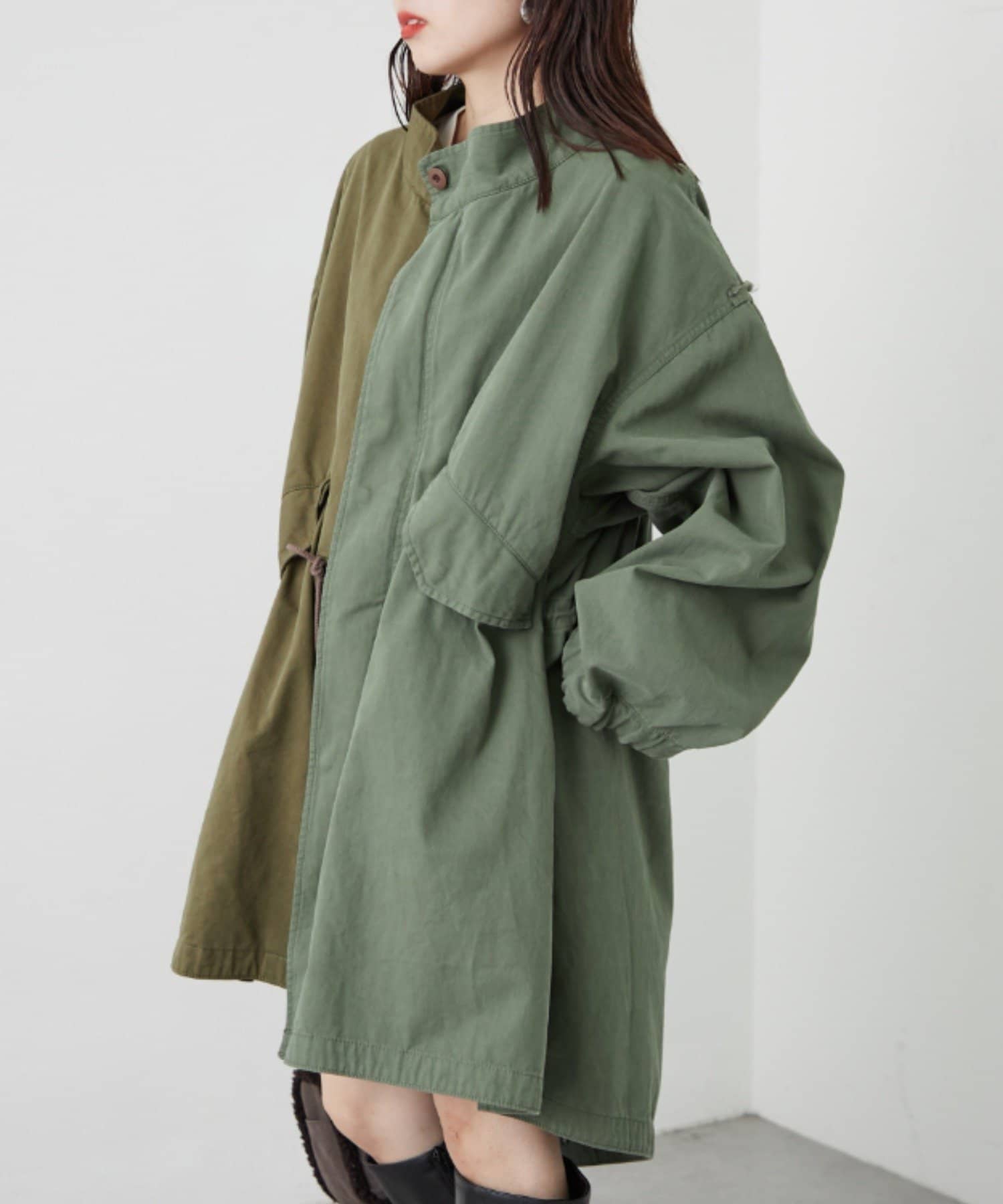 左右の切り替えが特徴的なミドル丈のモッズコート