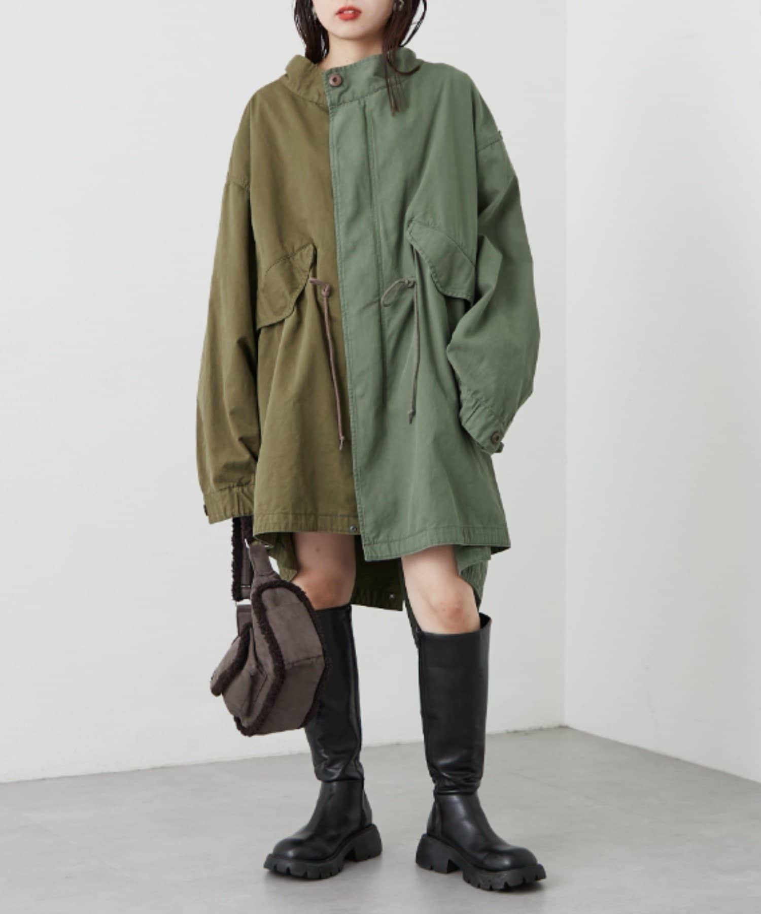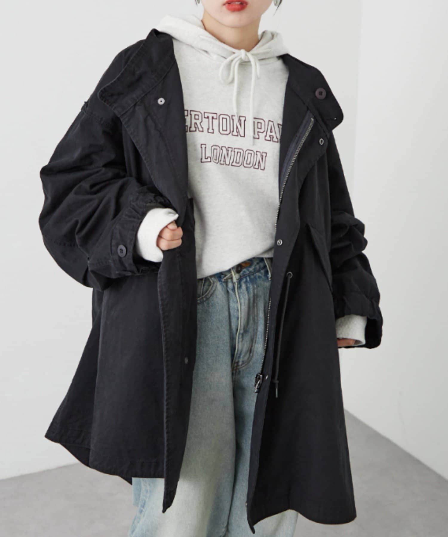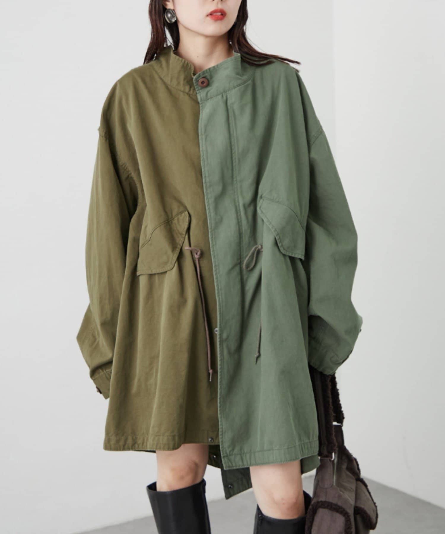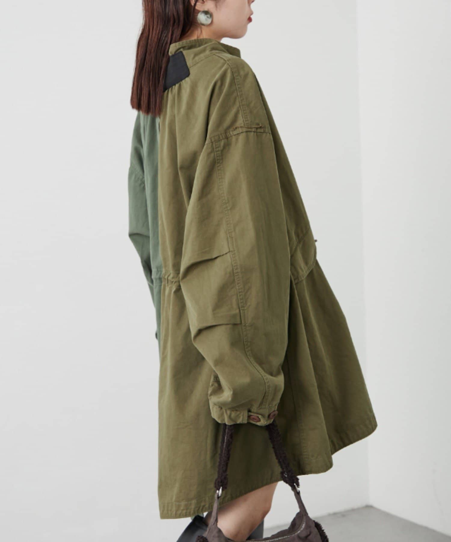 左右の切り替えが特徴的なミドル丈のモッズコート