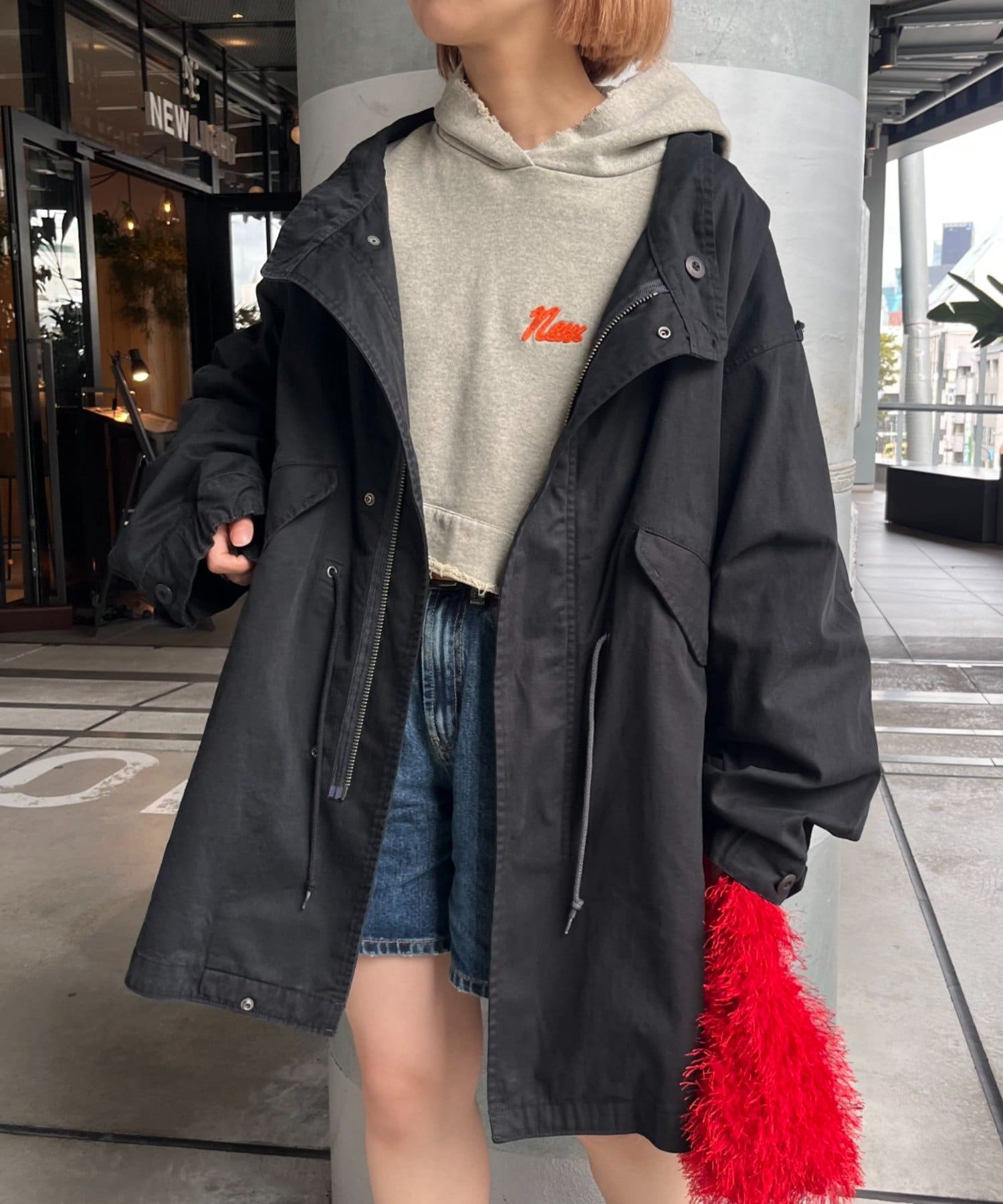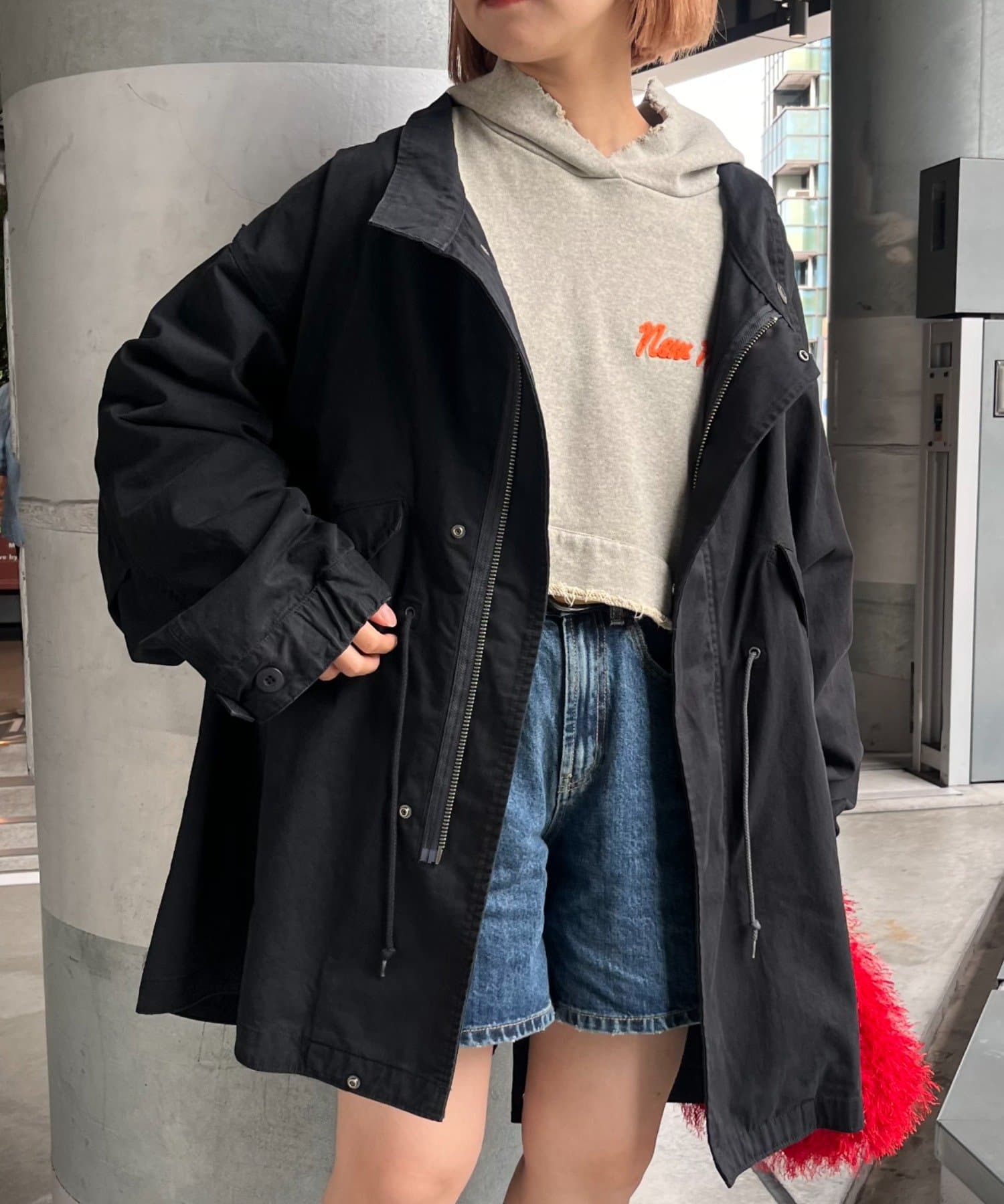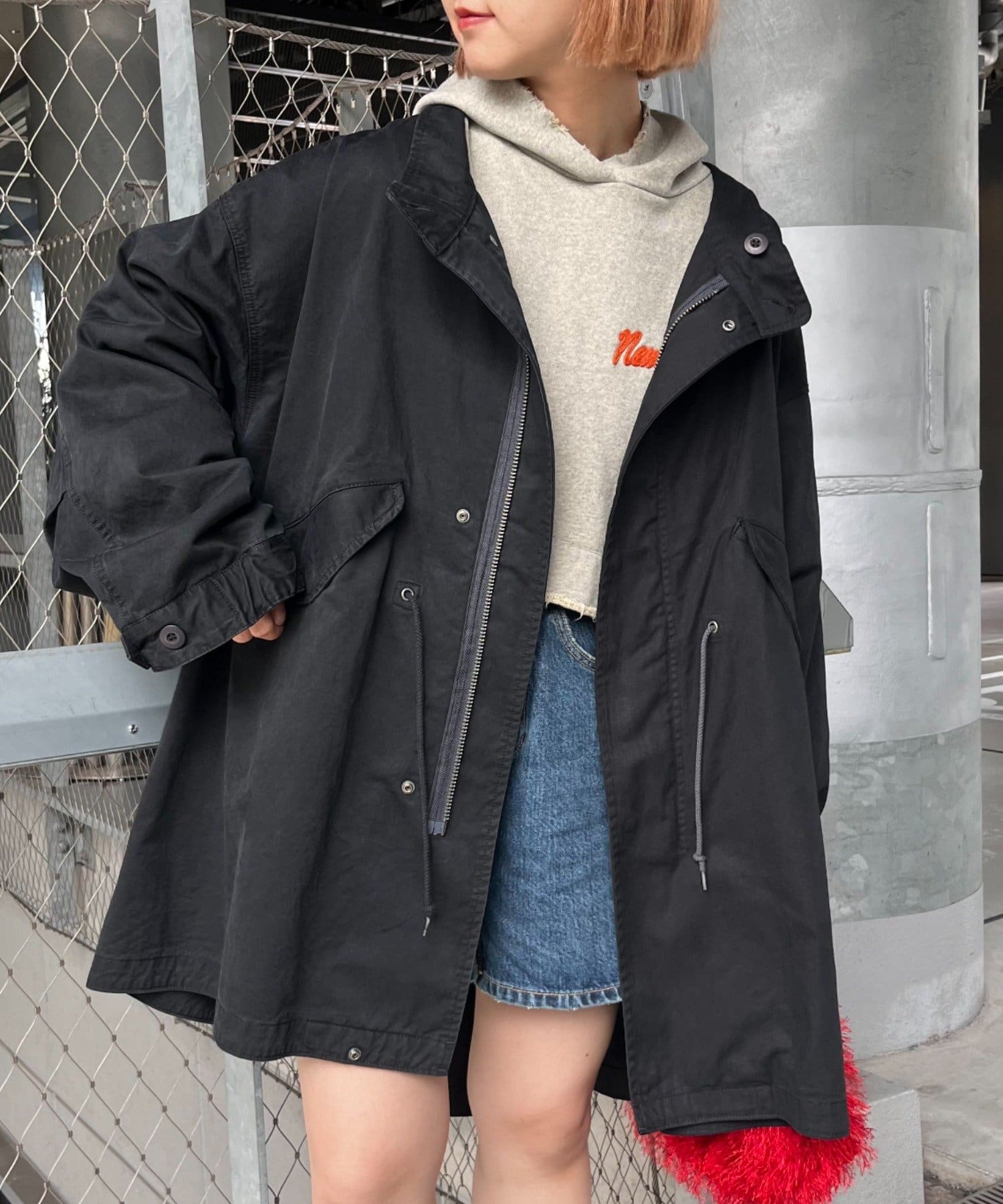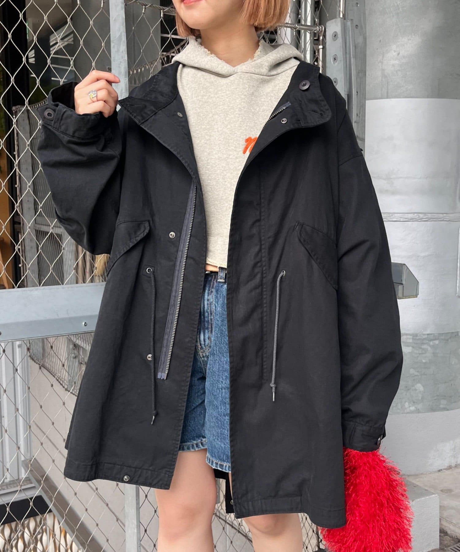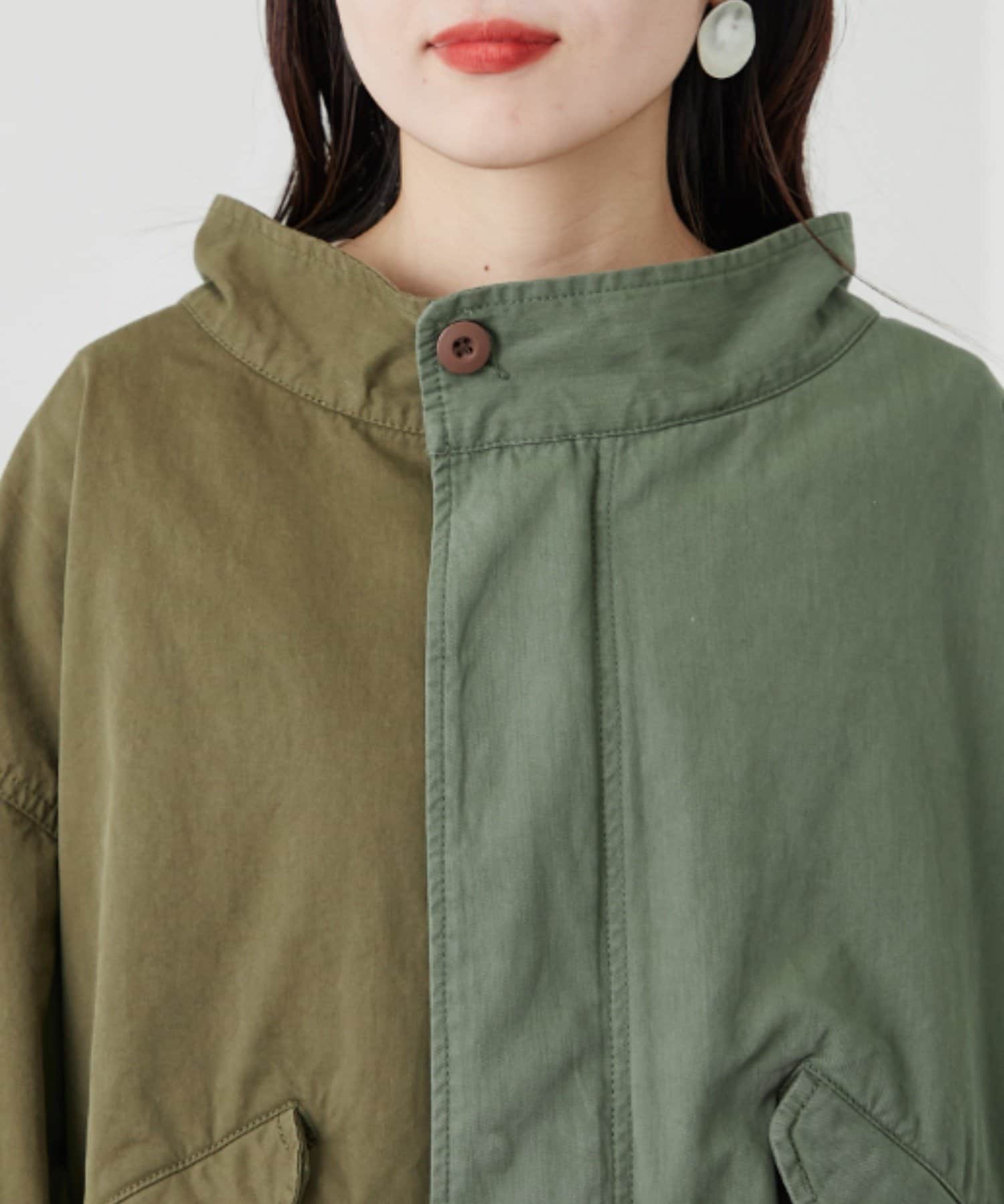 左右の切り替えが特徴的なミドル丈のモッズコート
