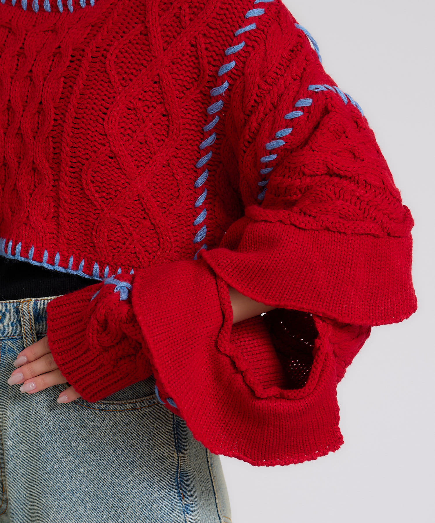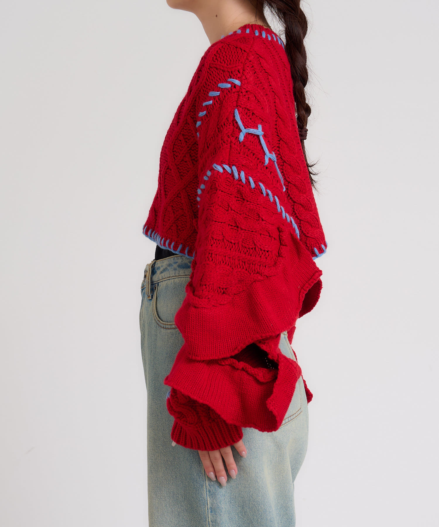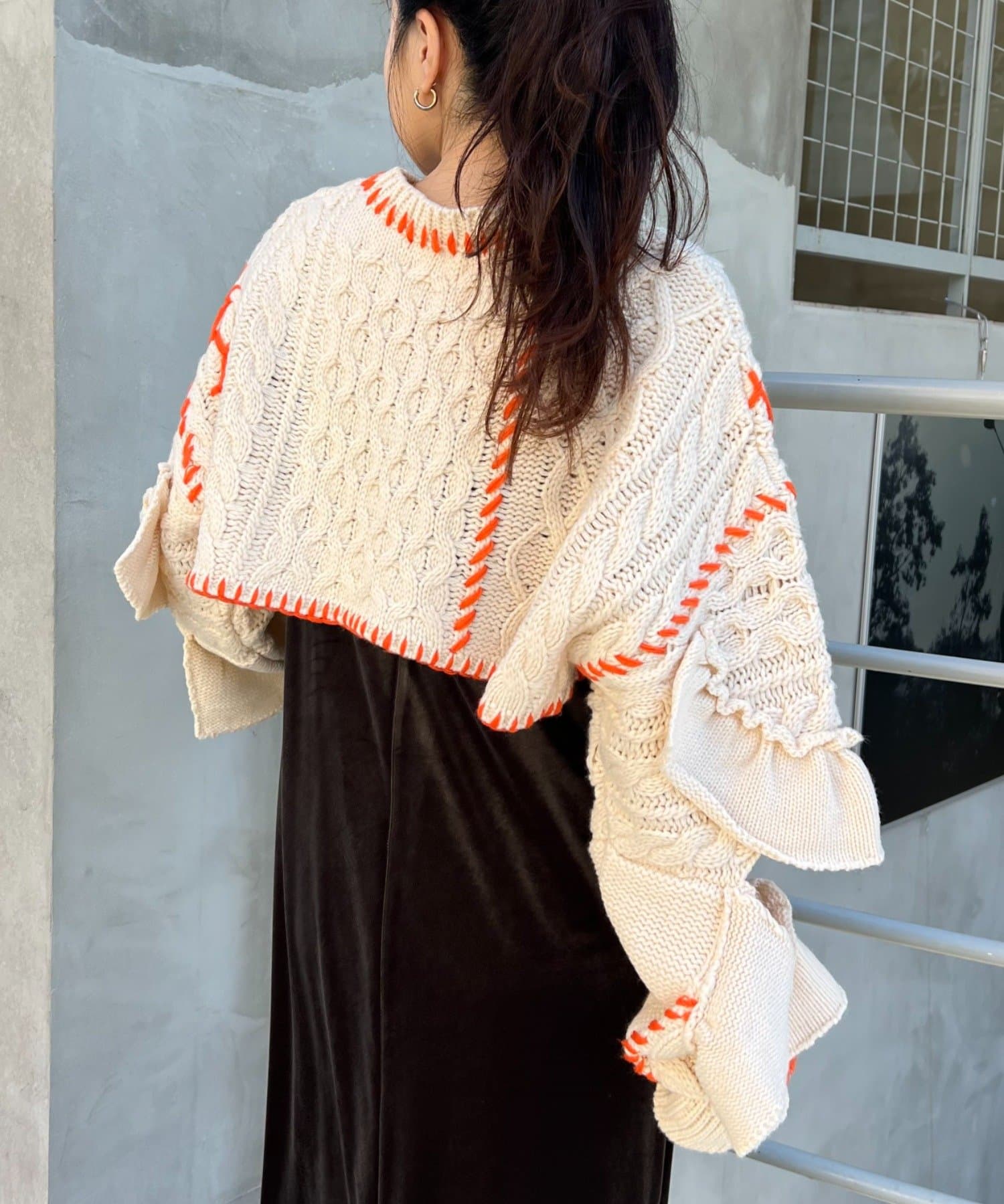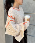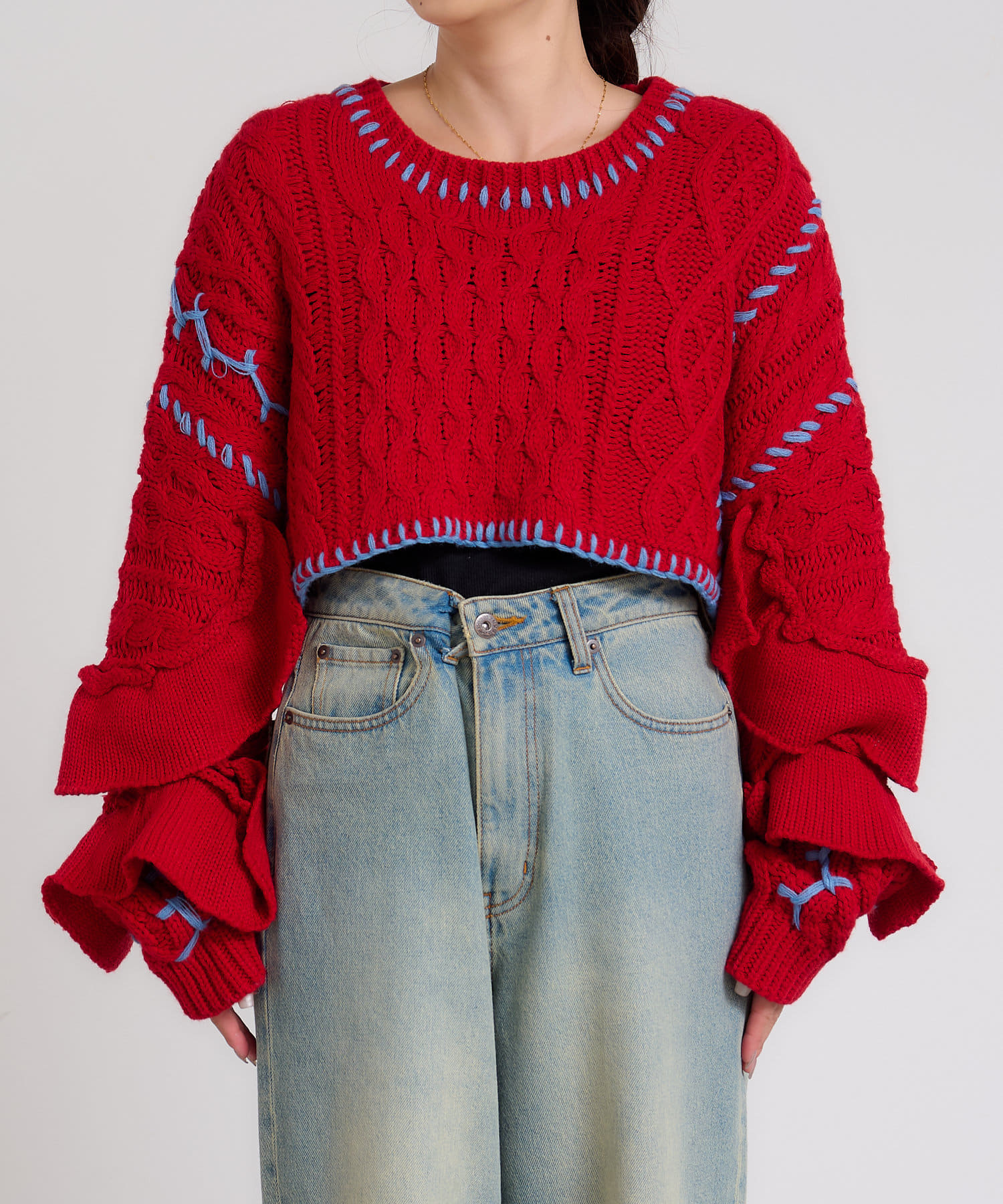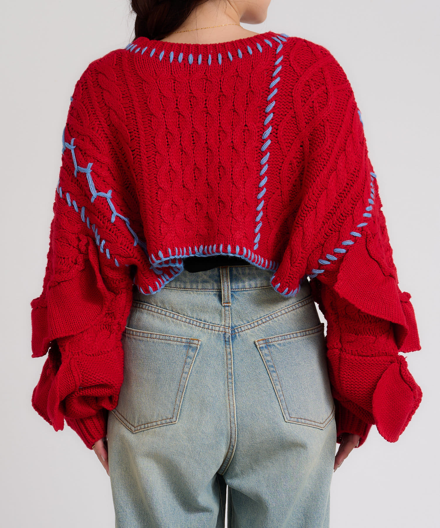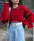 ショート丈のケーブルニットにフリルとハンドステッチを施したトレンドライクな1枚。