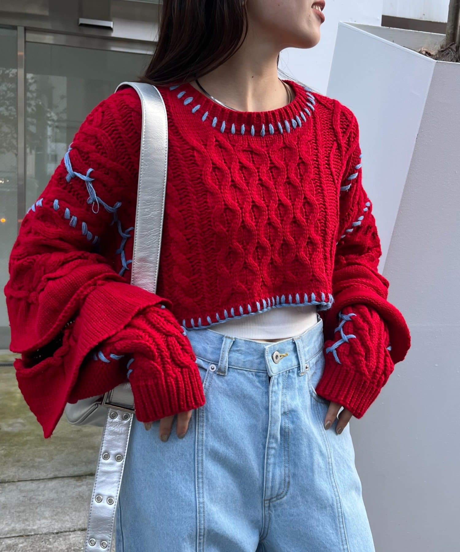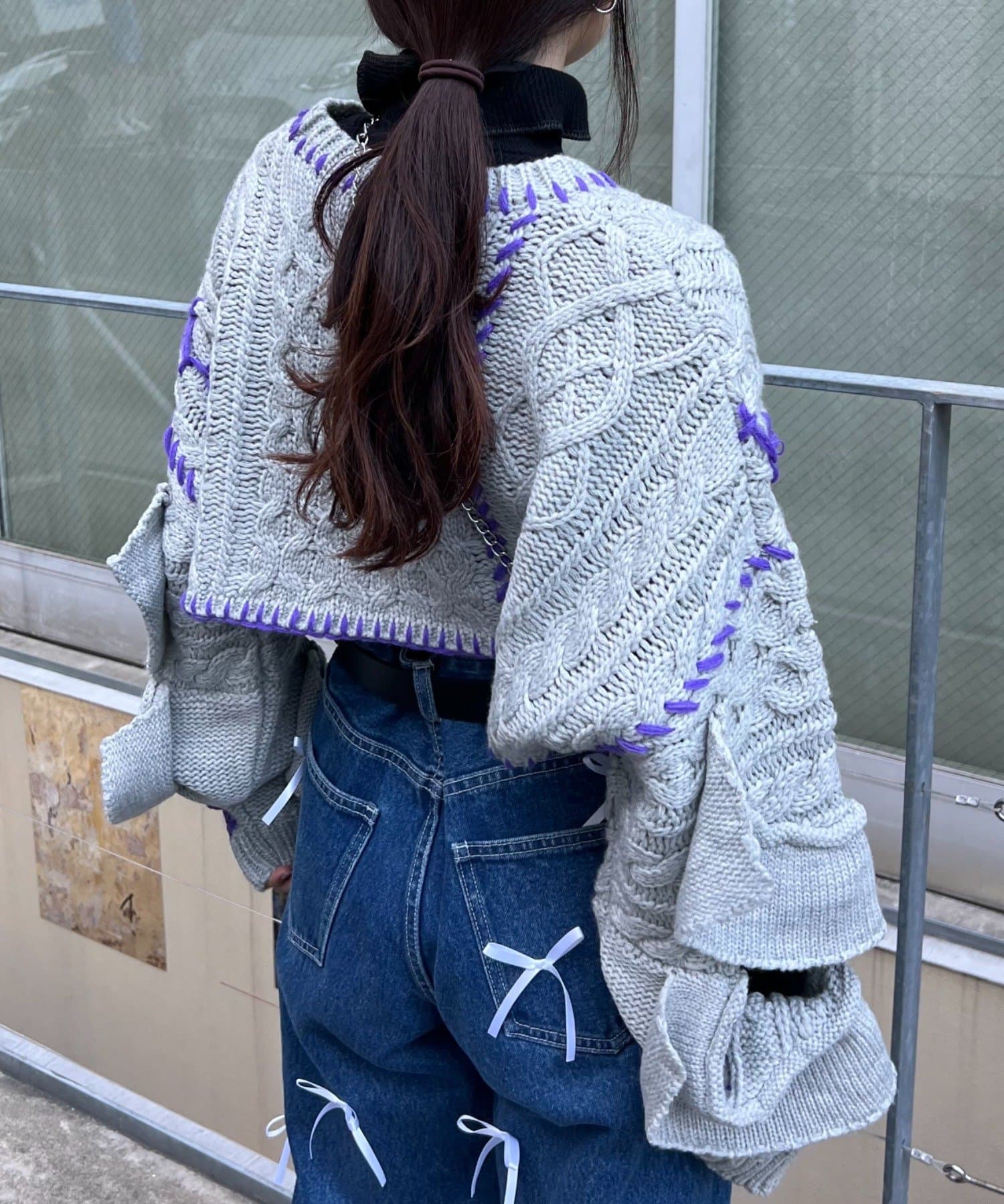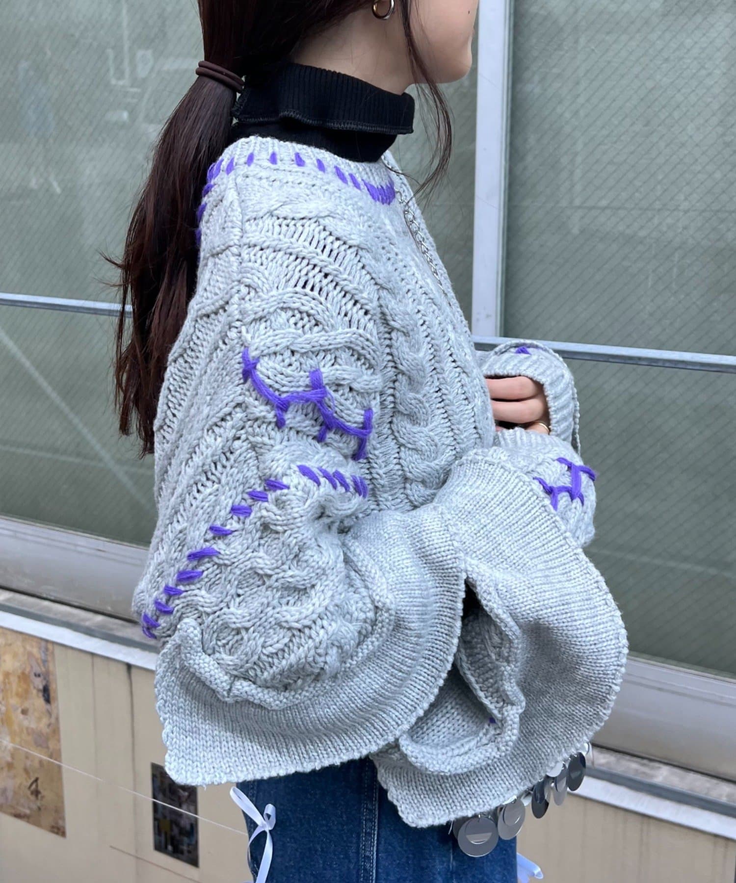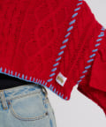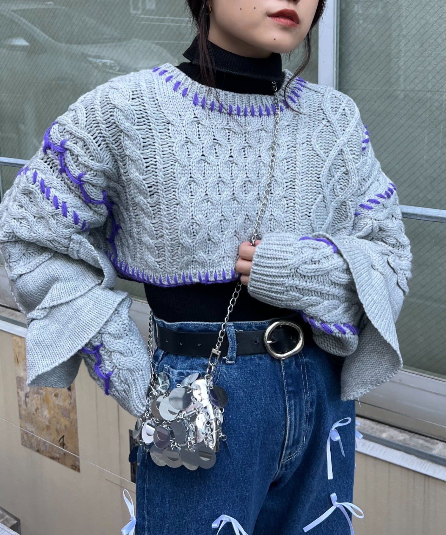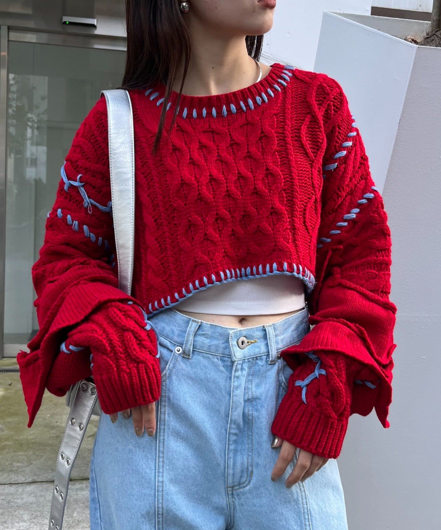ショート丈のケーブルニットにフリルとハンドステッチを施したトレンドライクな1枚。