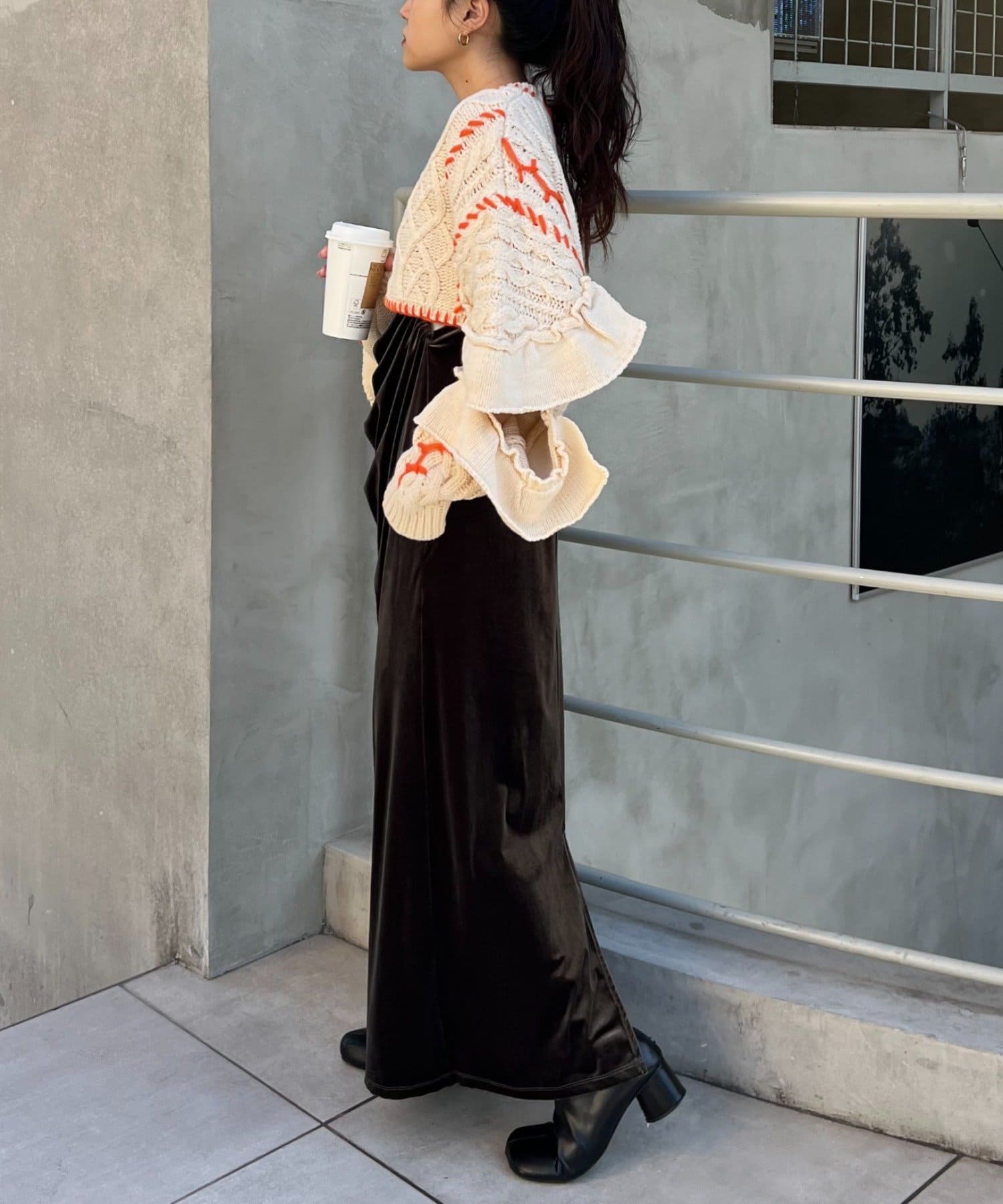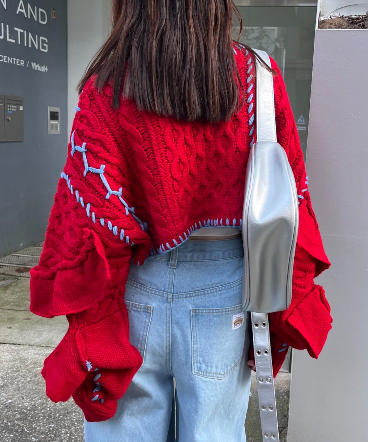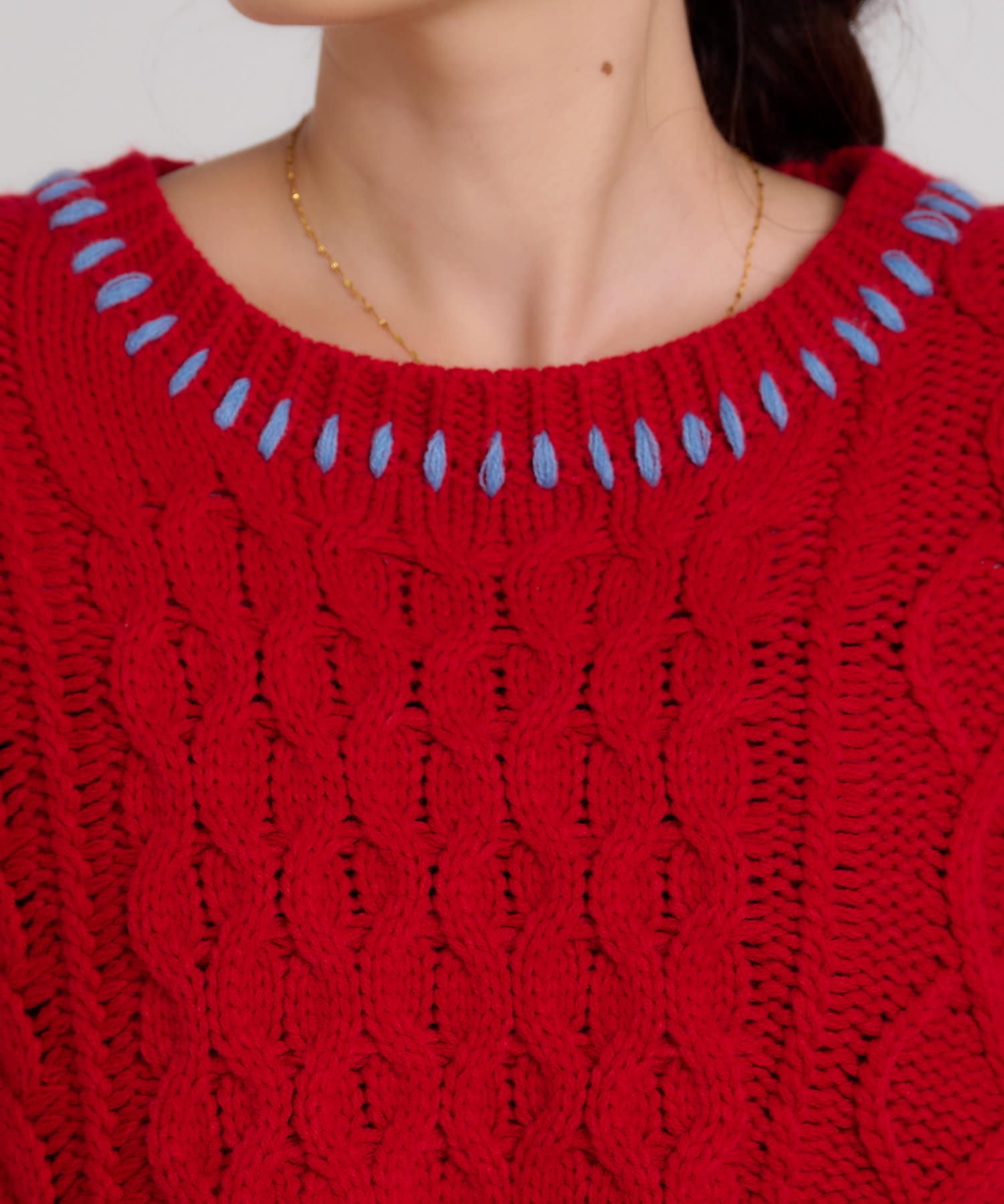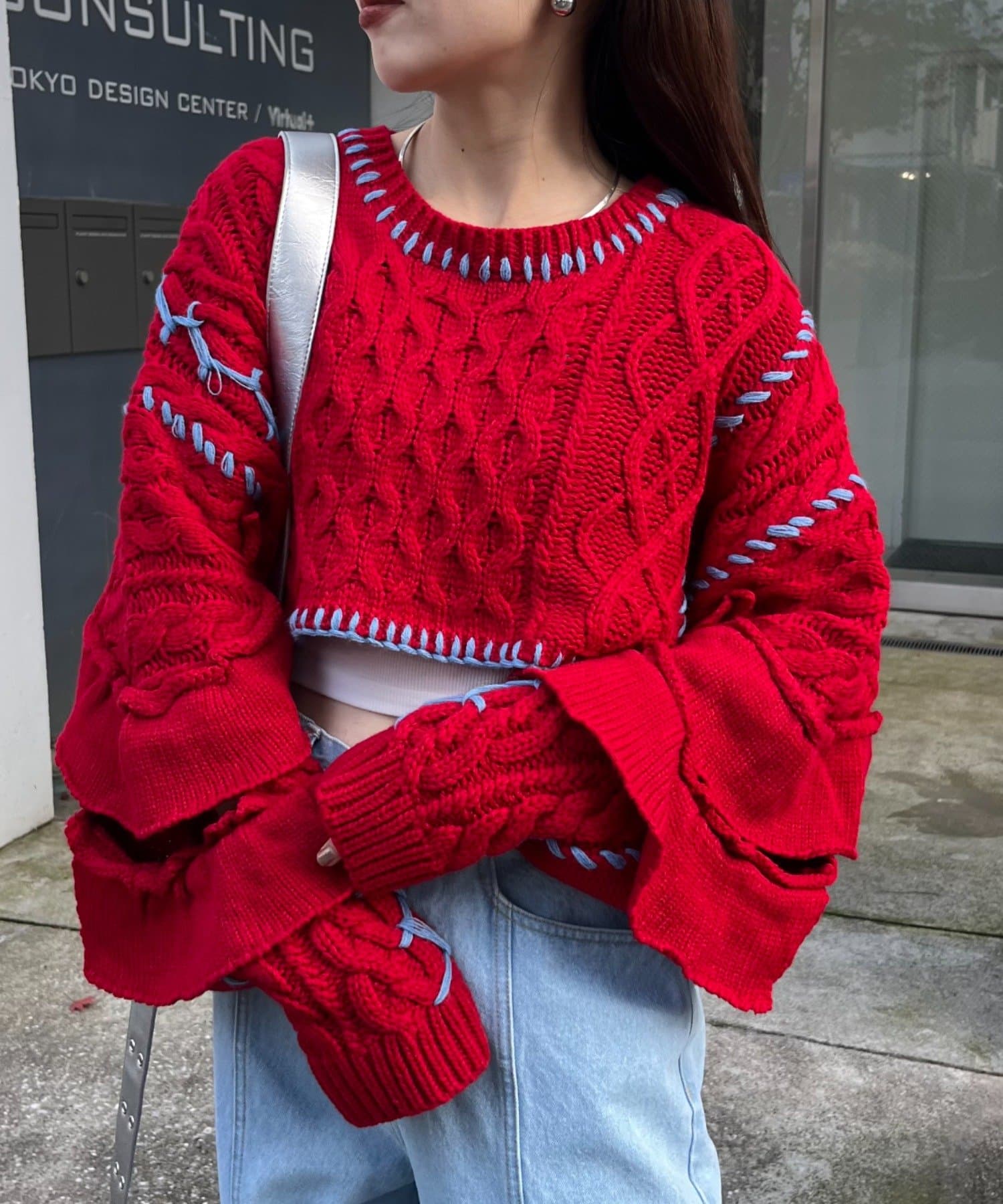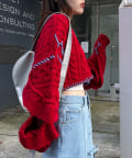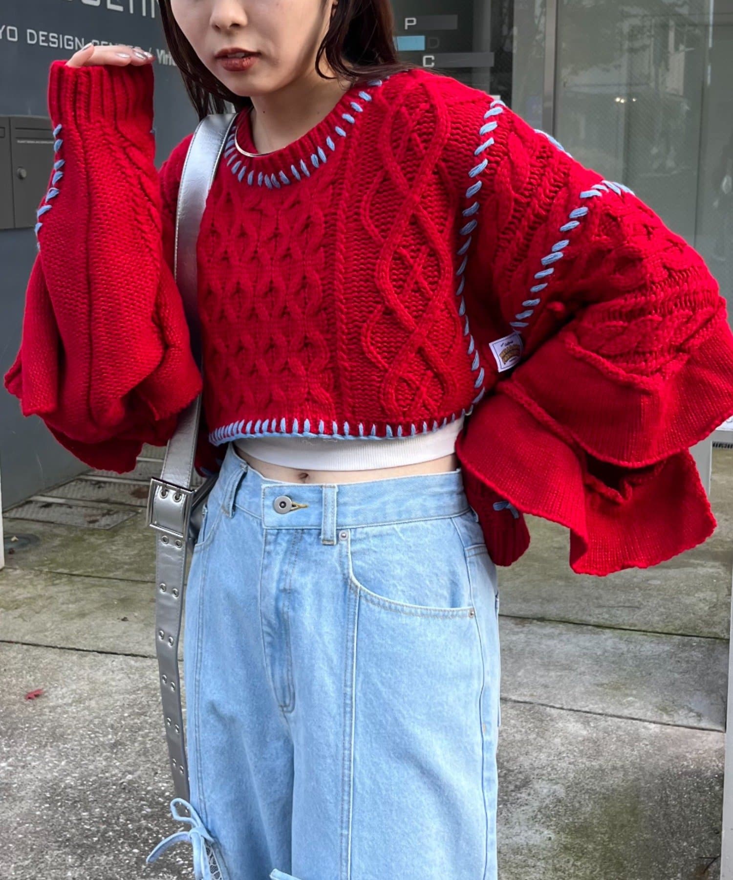 ショート丈のケーブルニットにフリルとハンドステッチを施したトレンドライクな1枚。