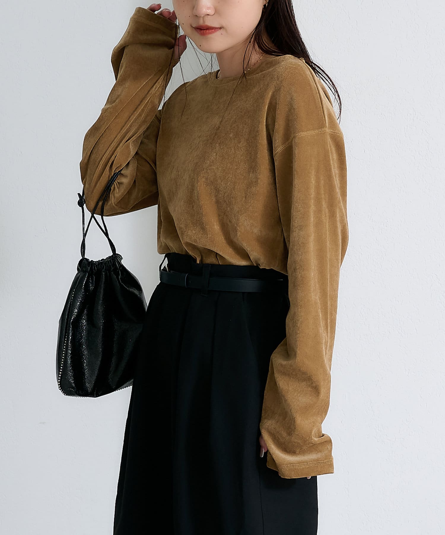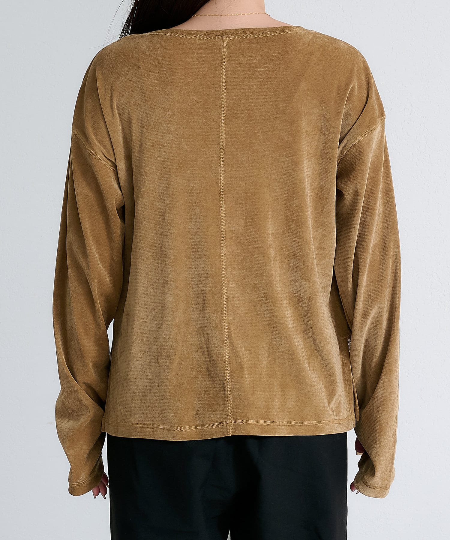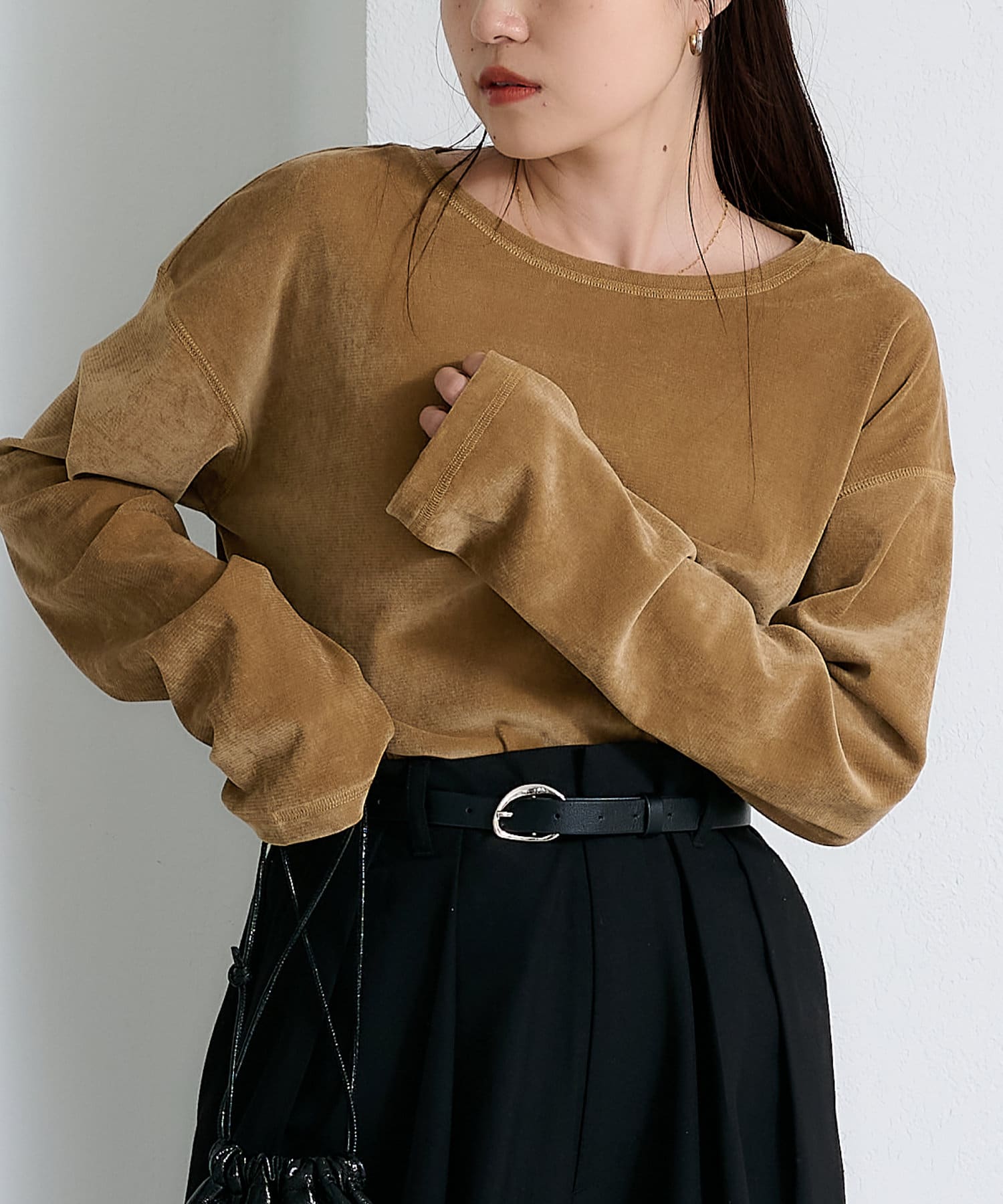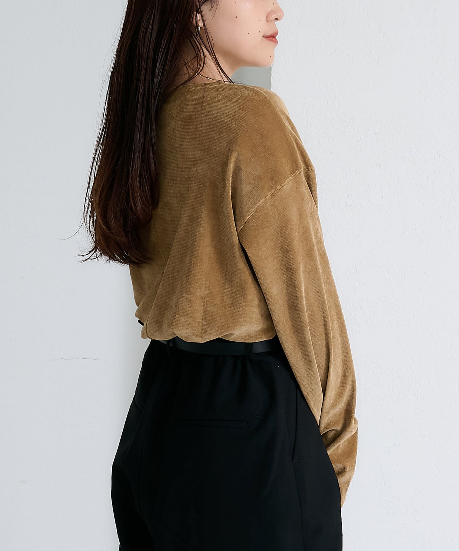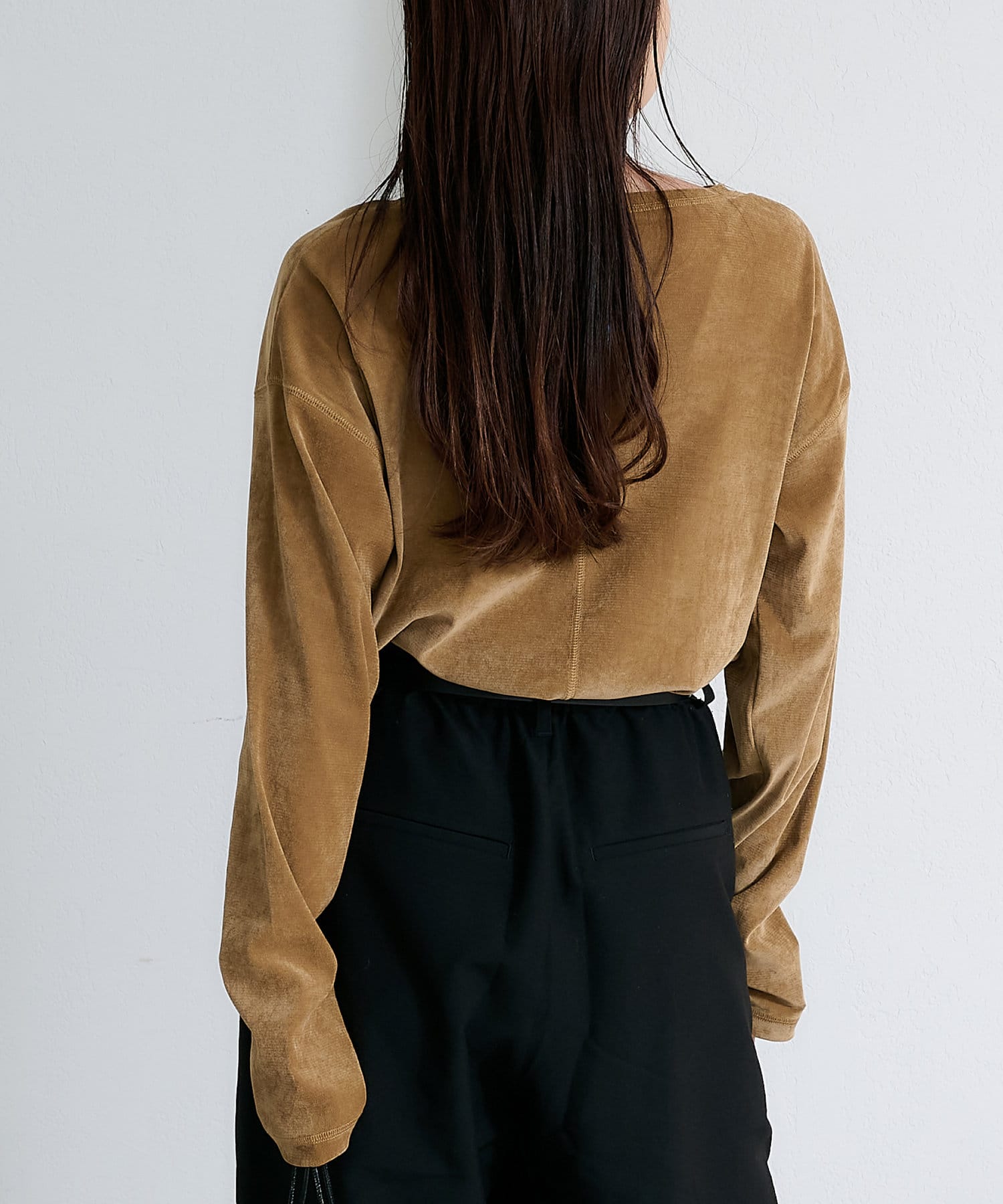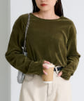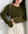 品のある光沢感が魅力のベロアのような触り心地のトップス。