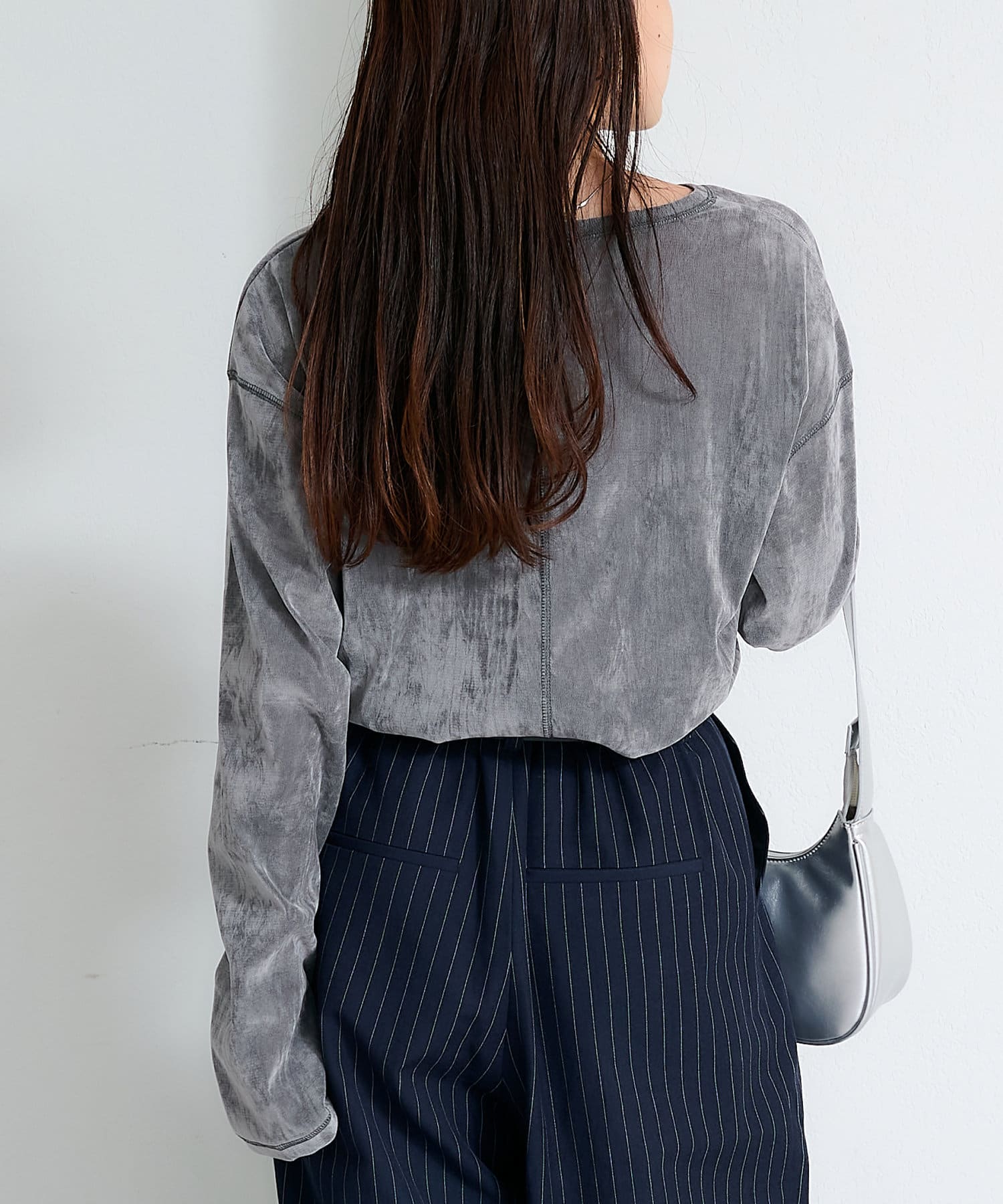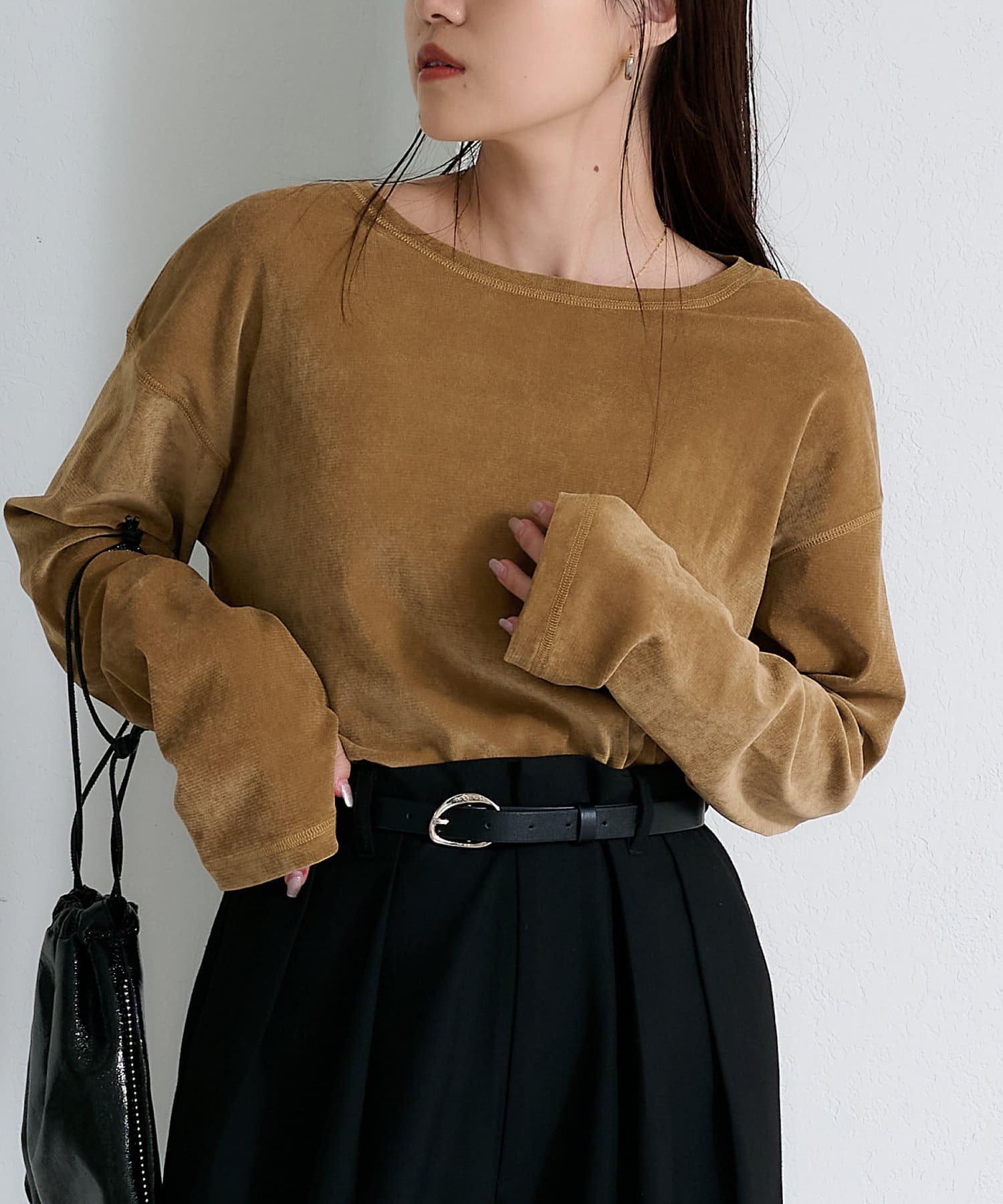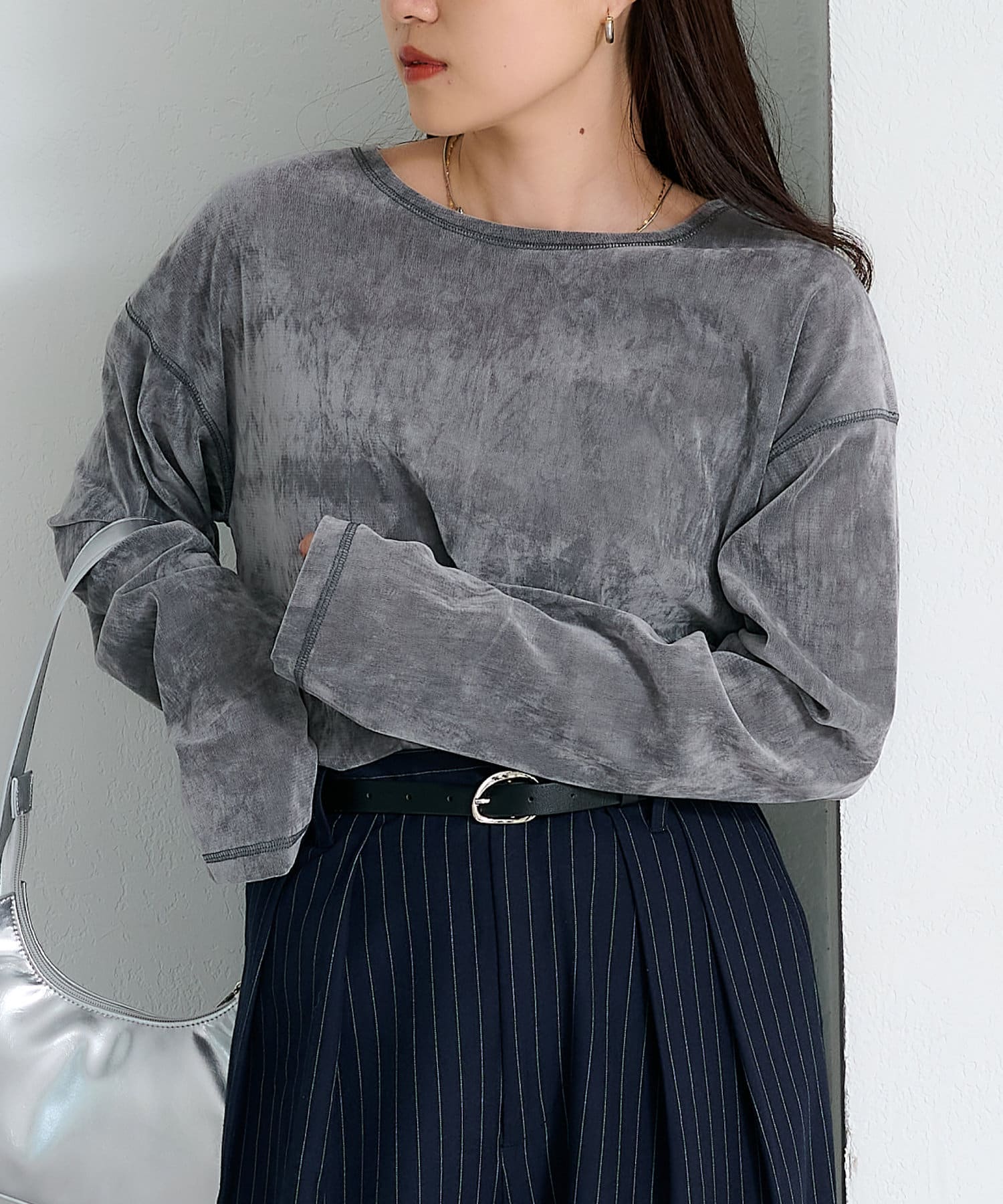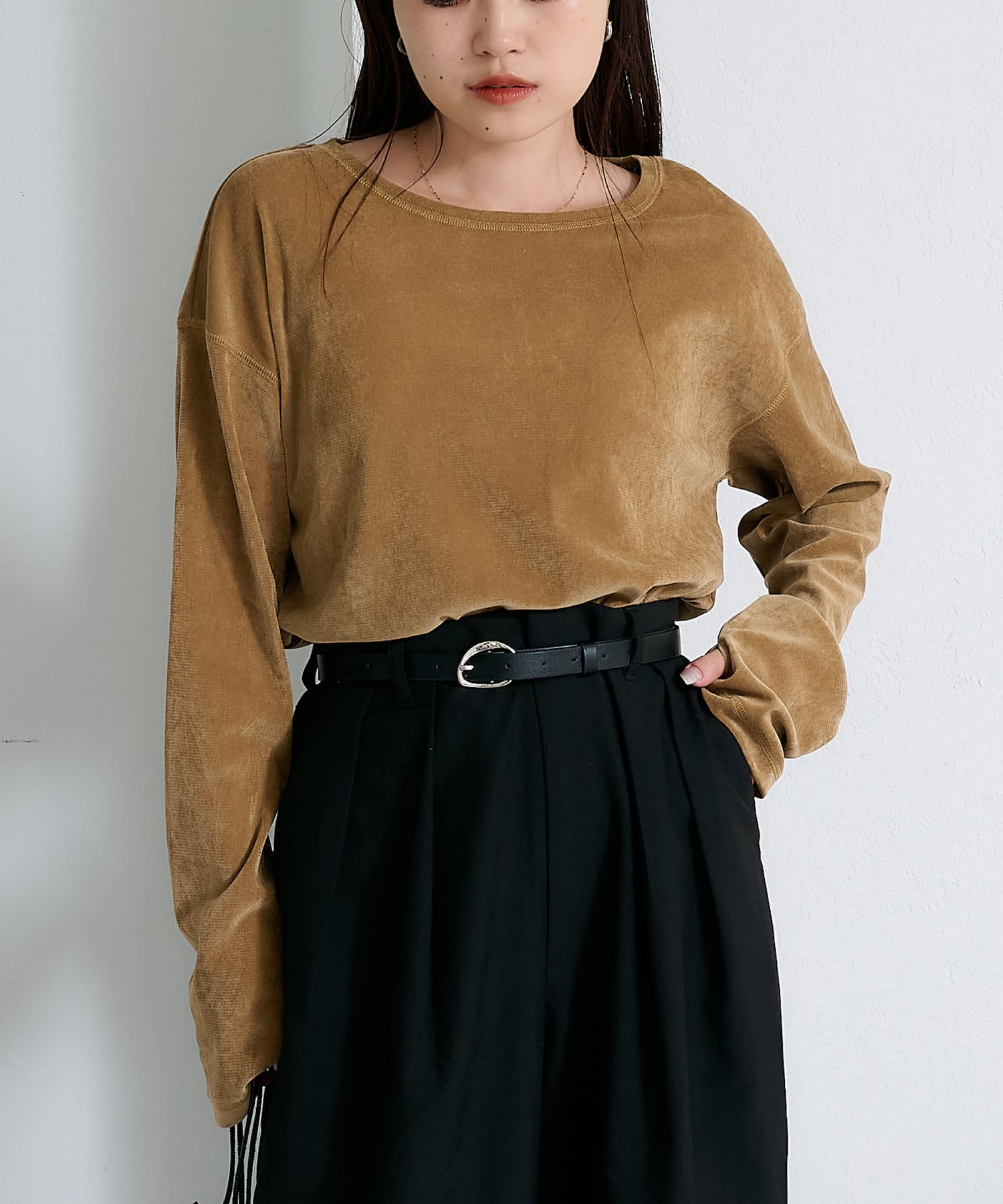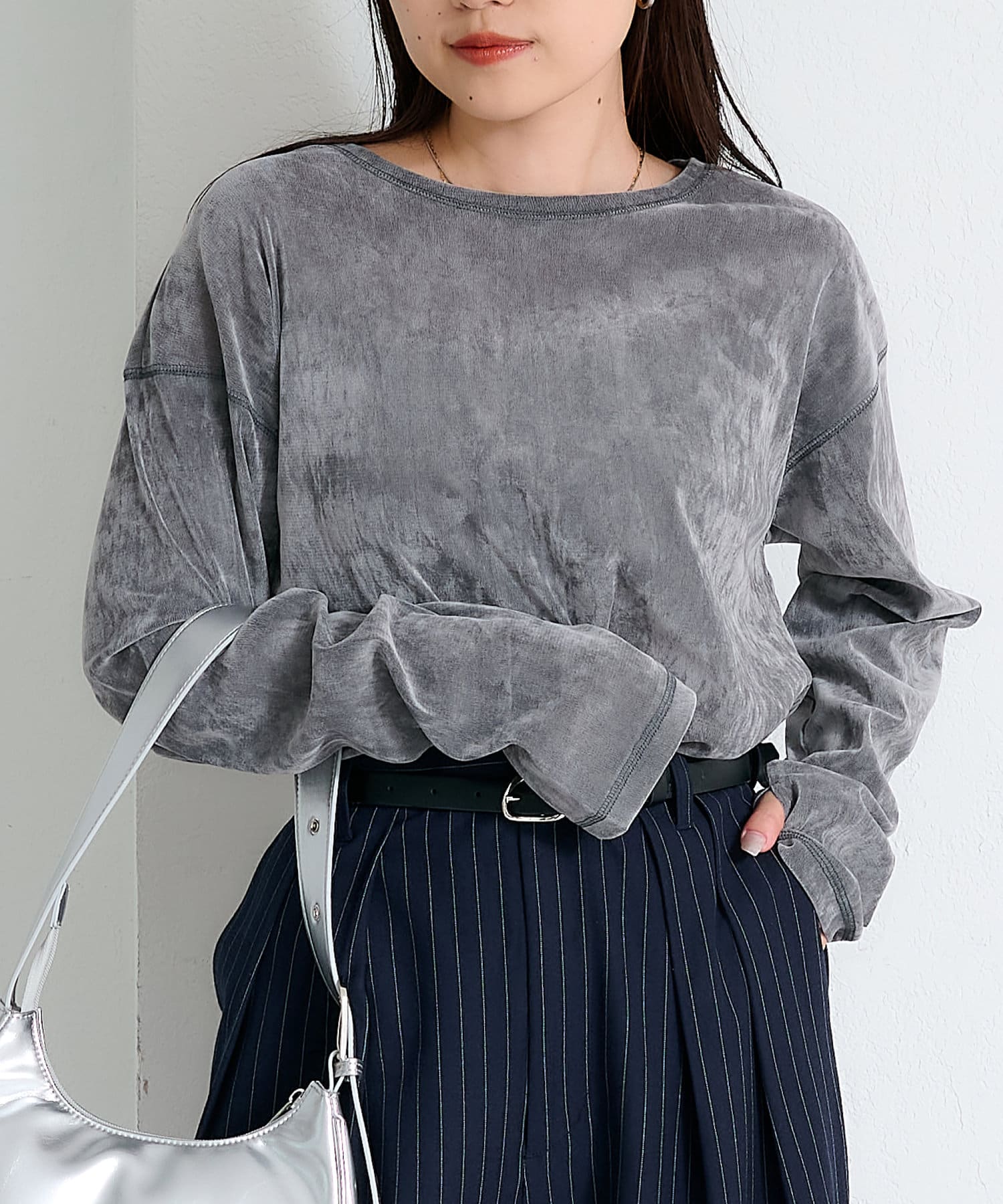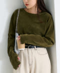 品のある光沢感が魅力のベロアのような触り心地のトップス。