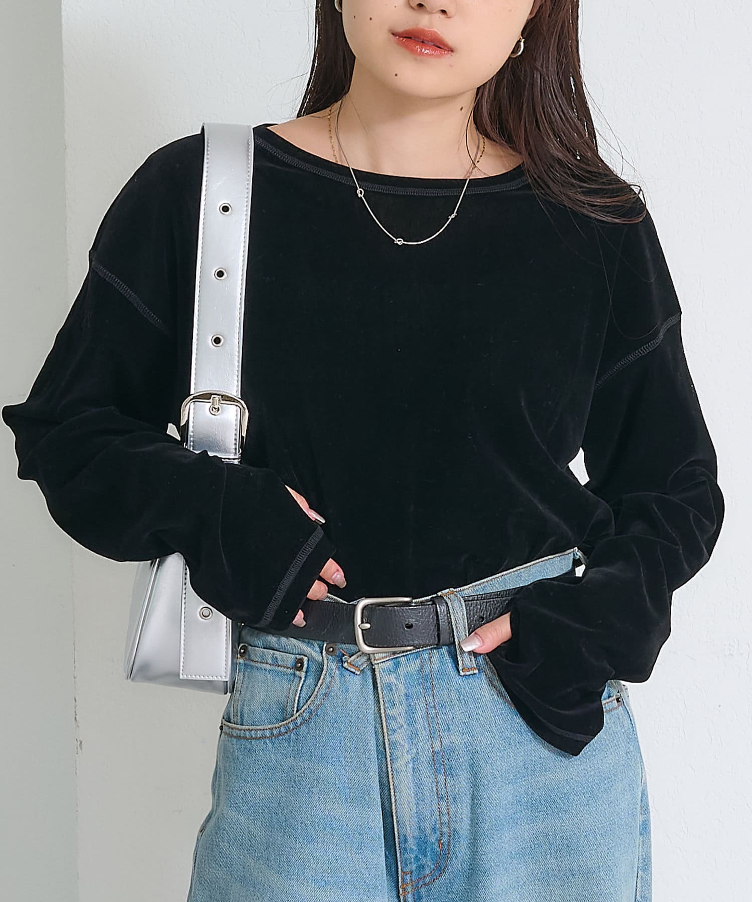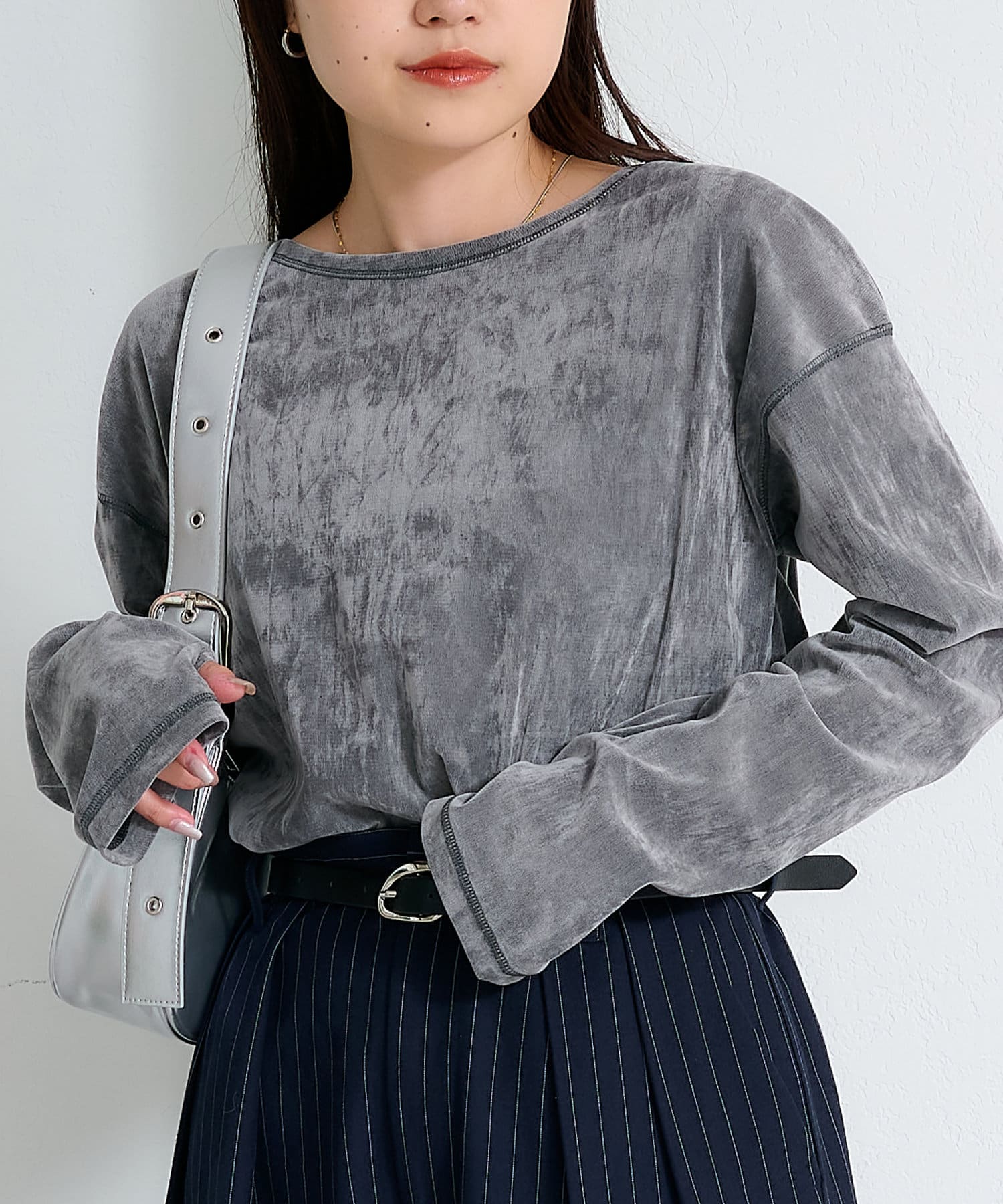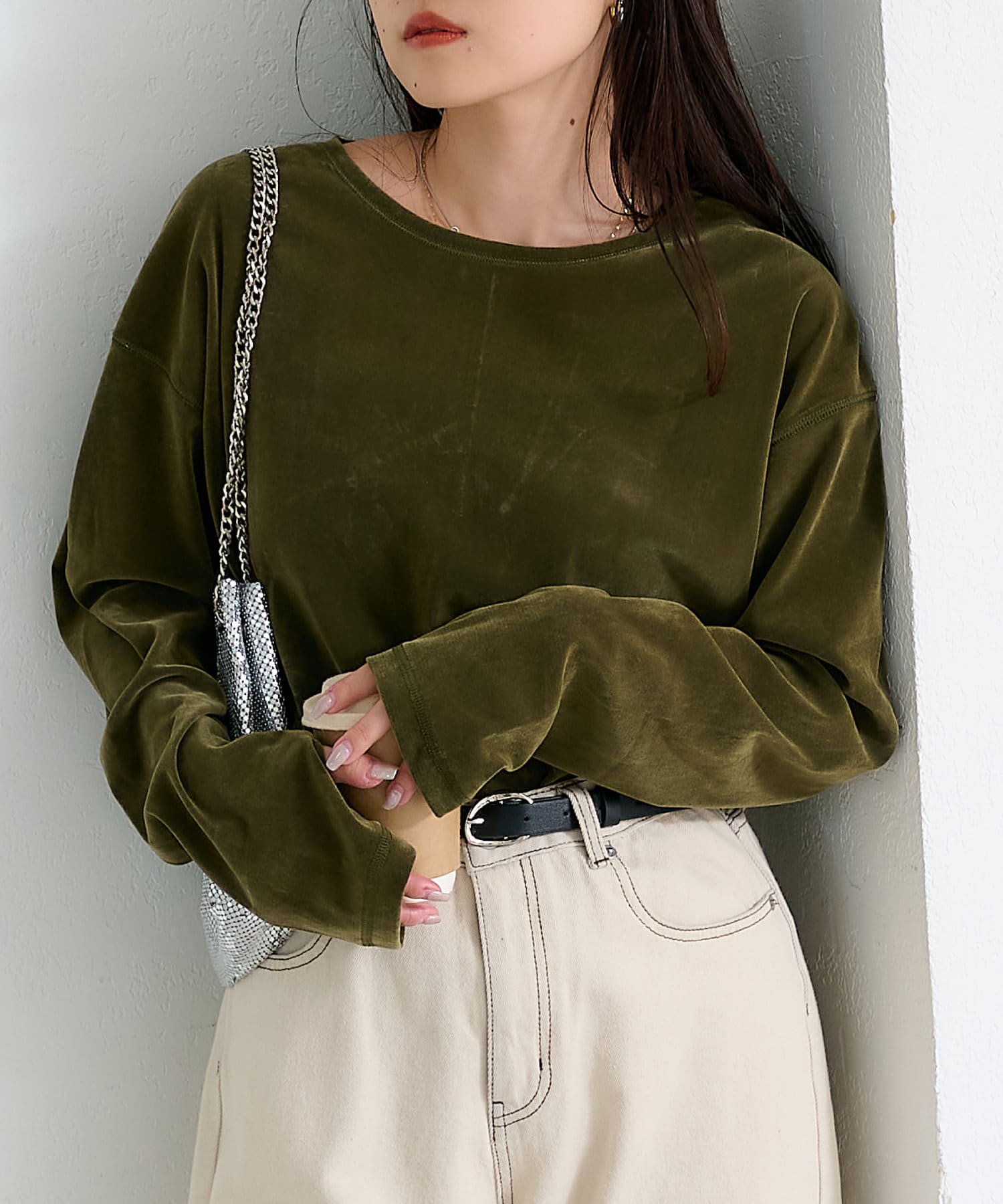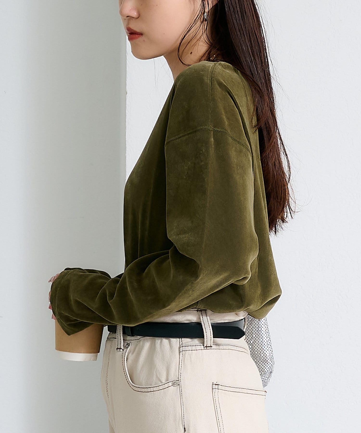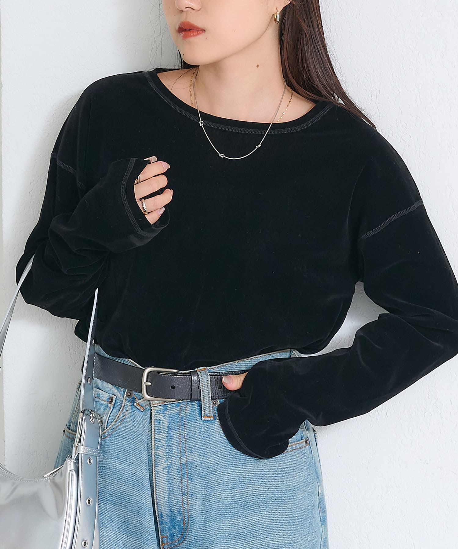 品のある光沢感が魅力のベロアのような触り心地のトップス。