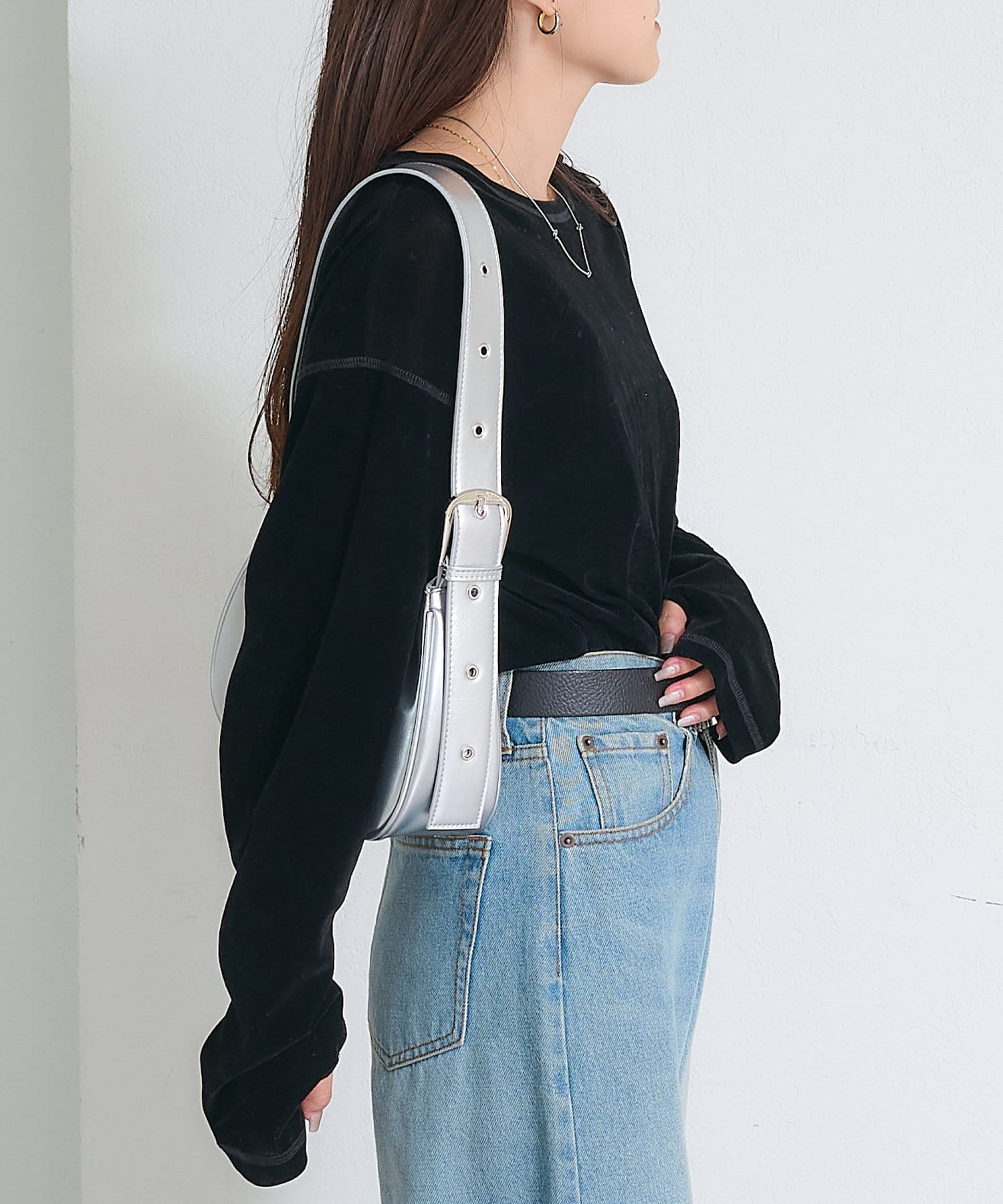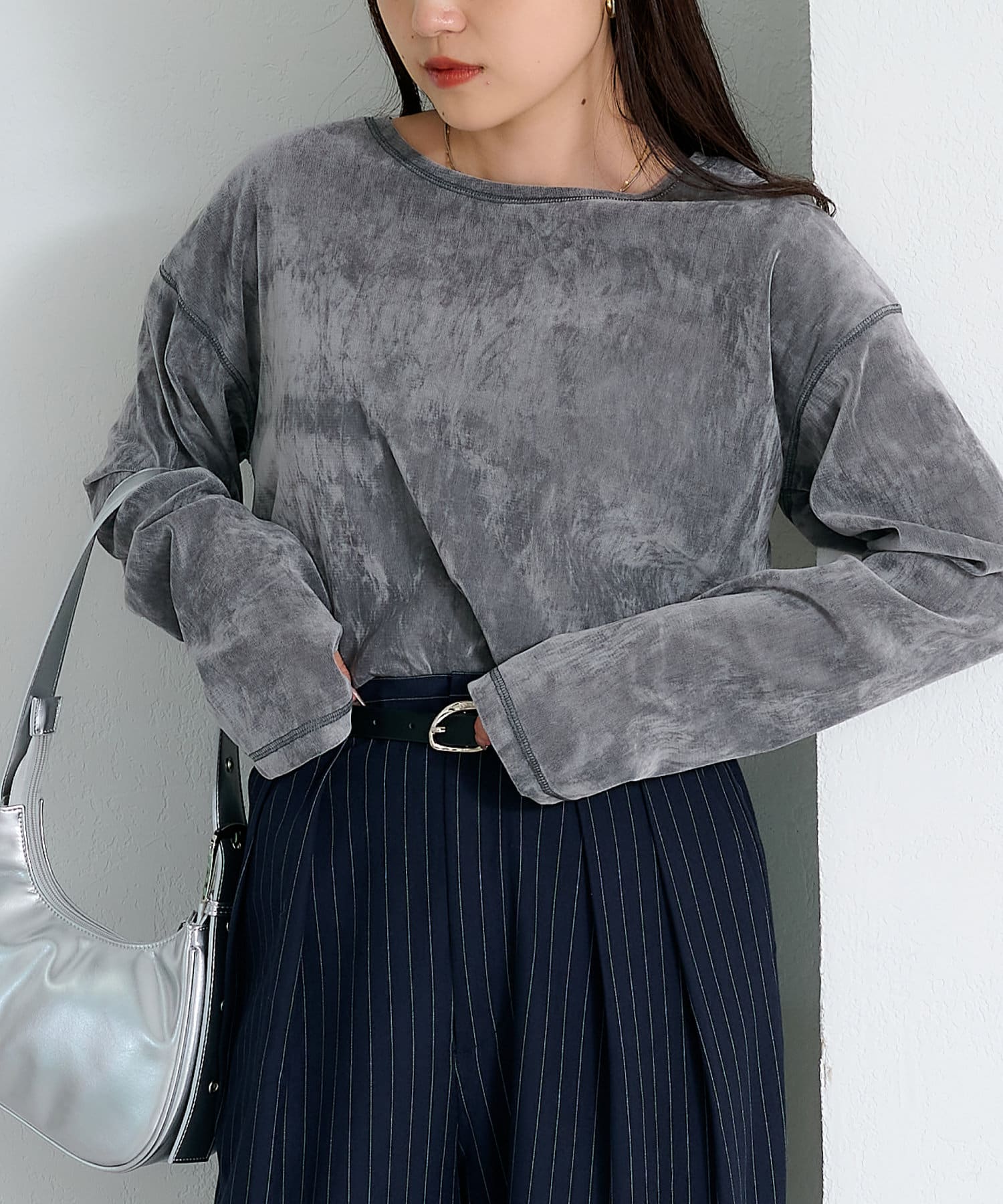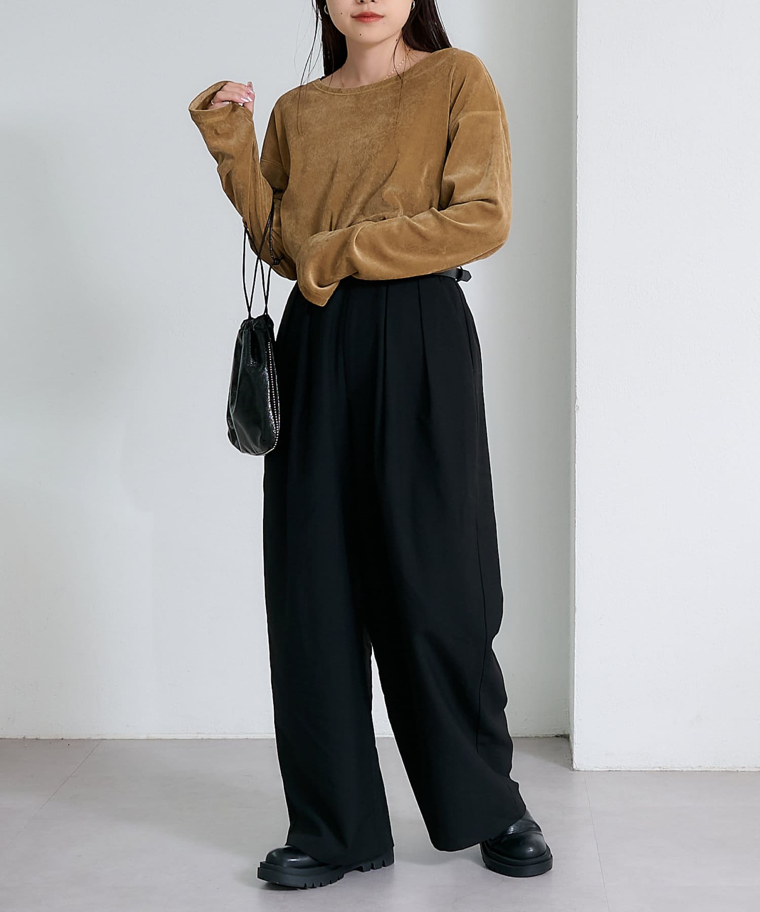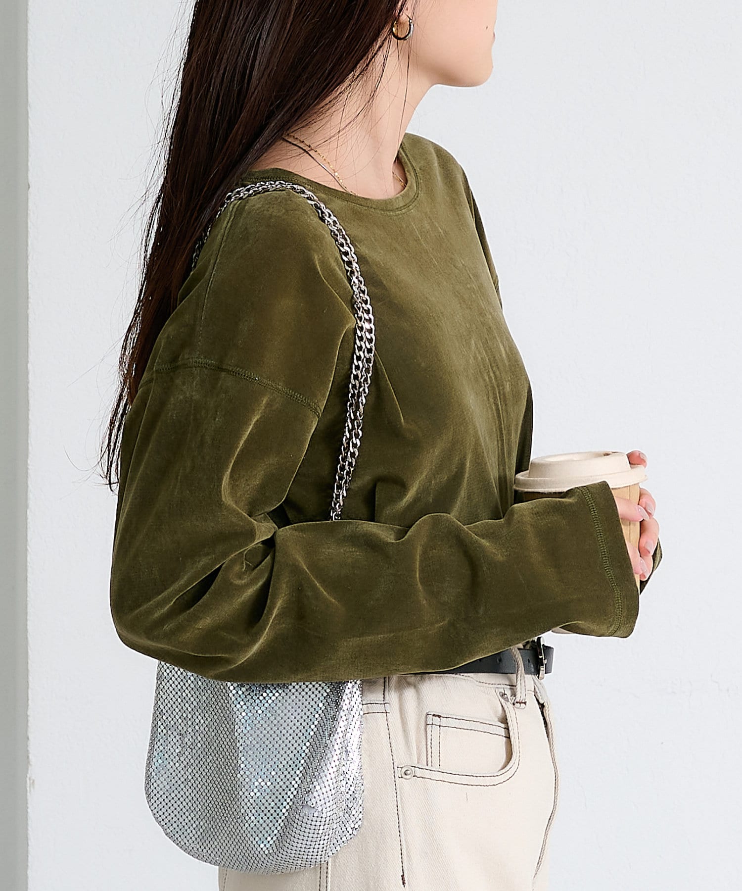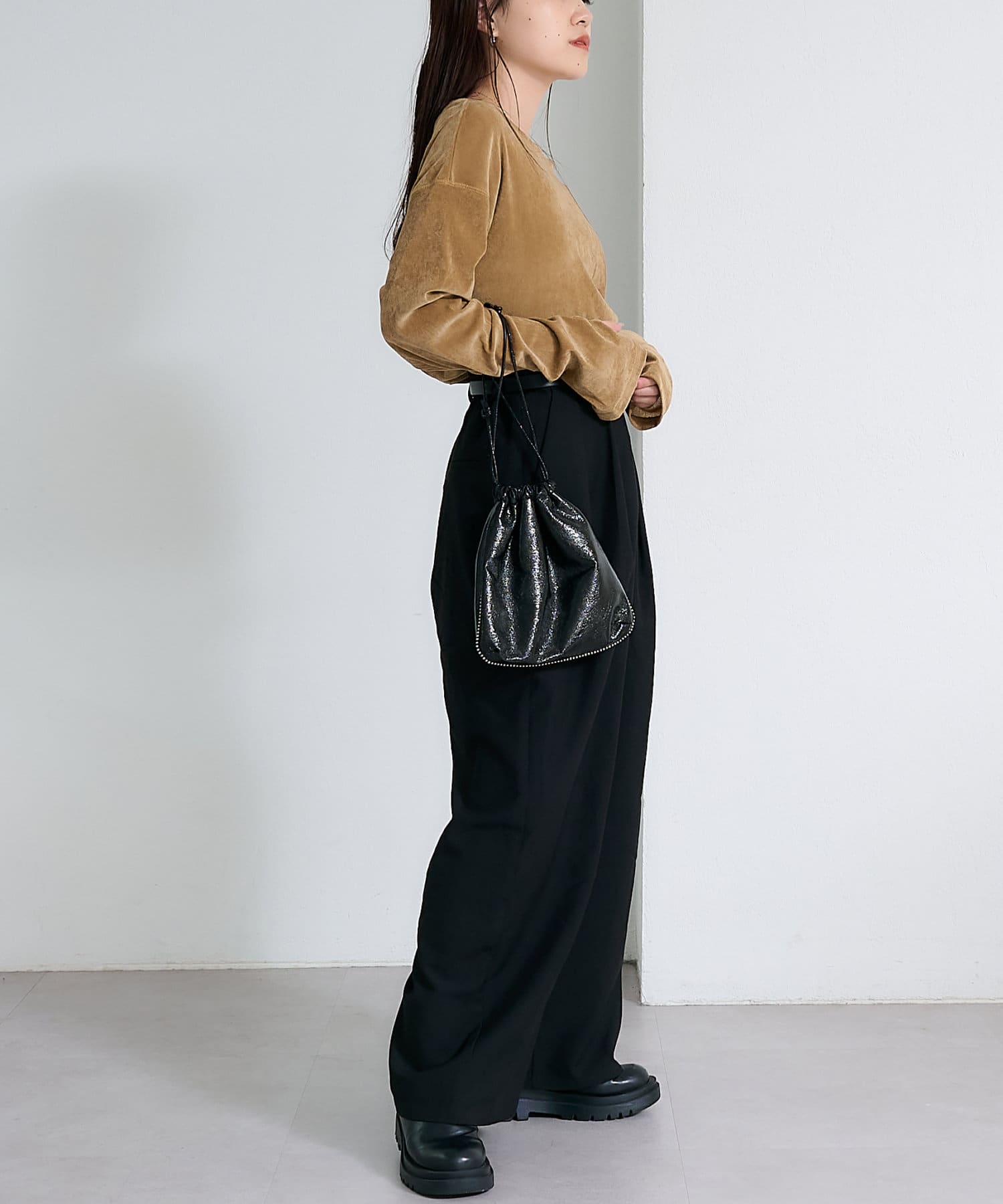 品のある光沢感が魅力のベロアのような触り心地のトップス。