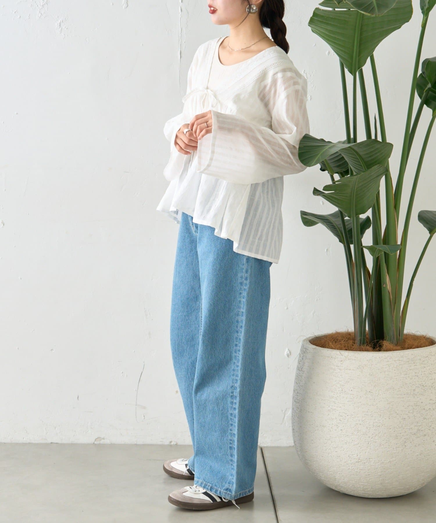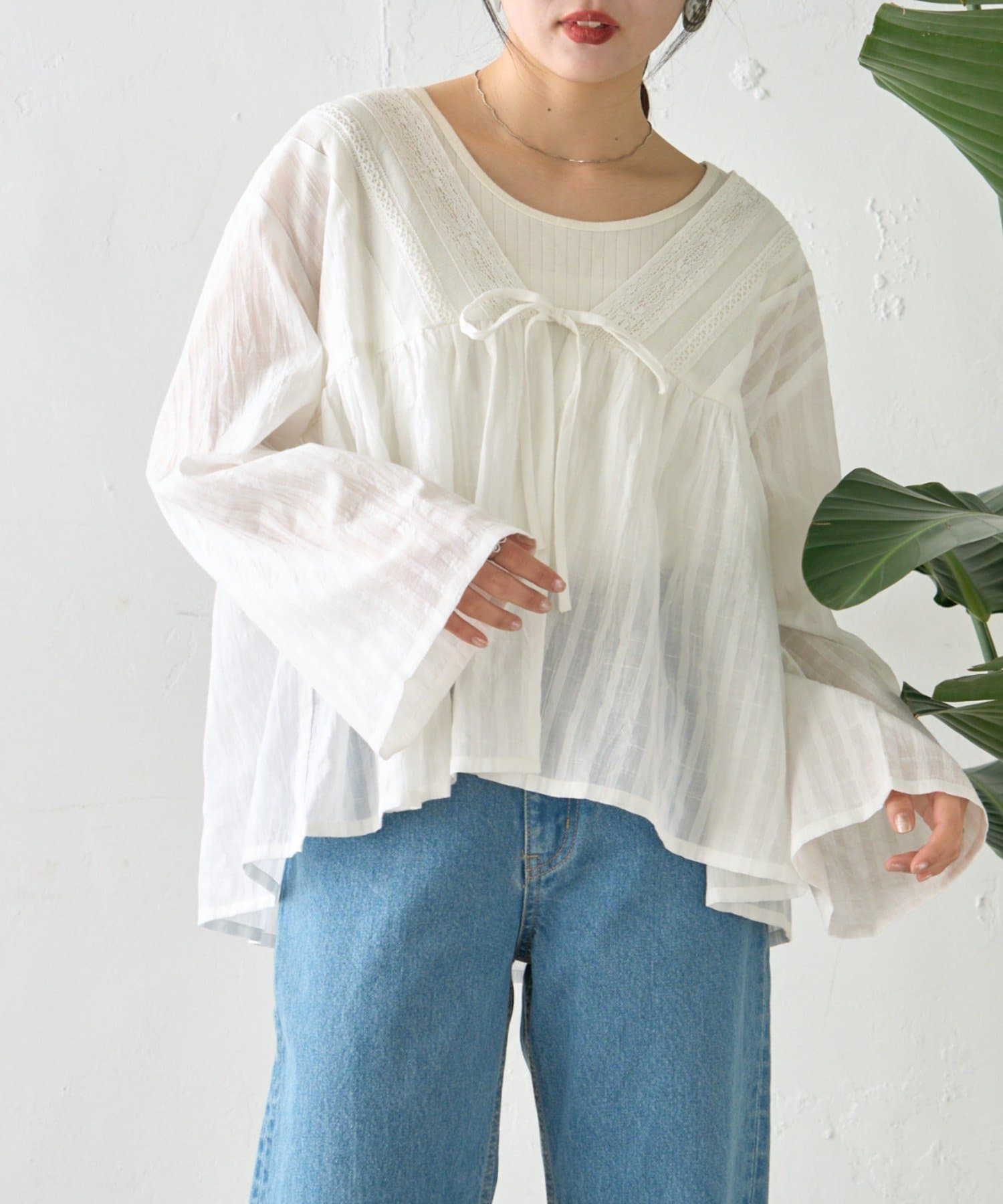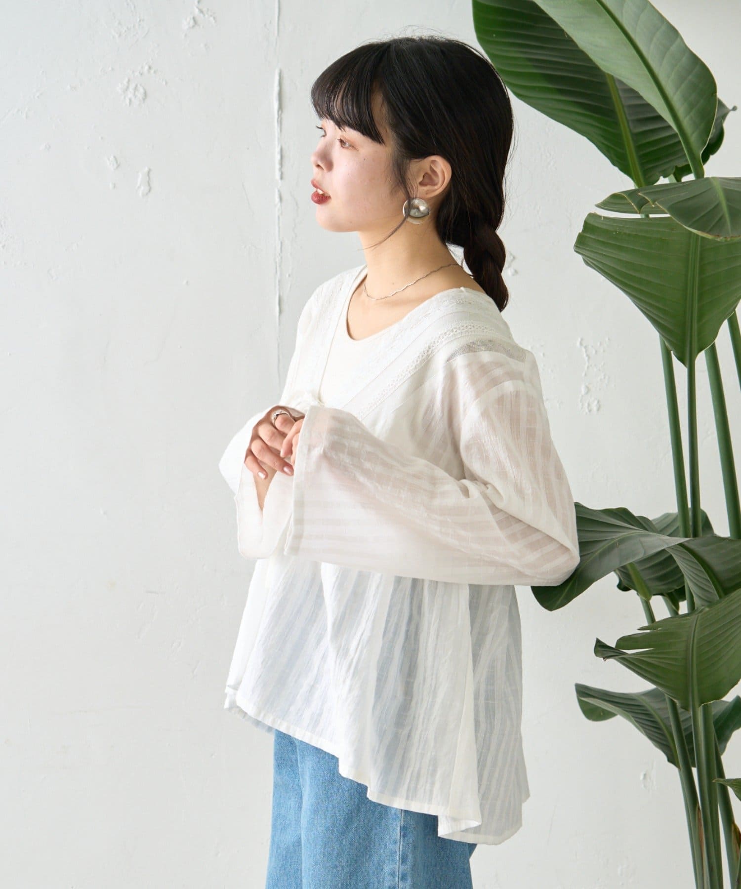 ヘルシーな肌見せが叶うシアー素材に爽やかなストライプ柄を施したシアーブラウス。