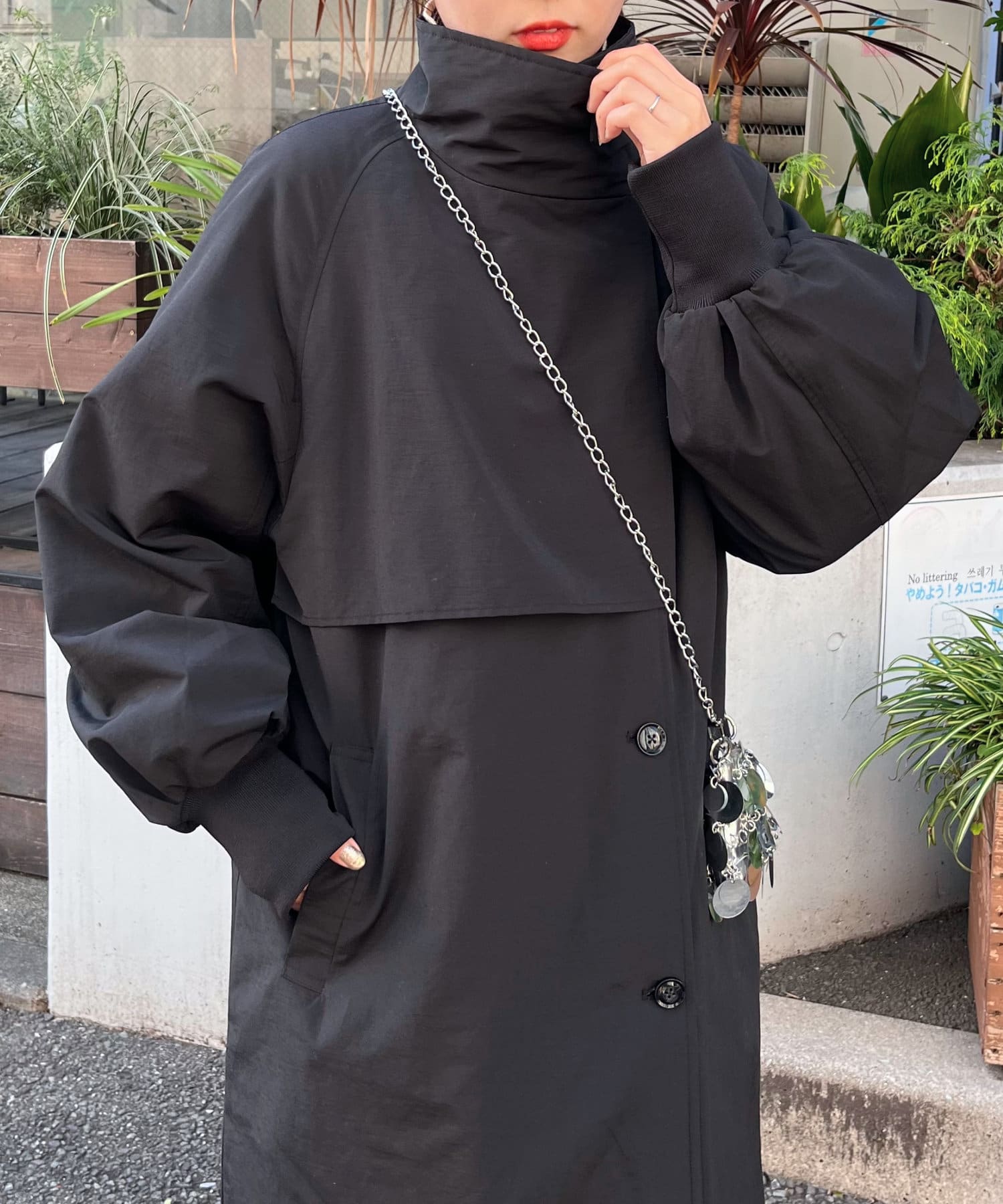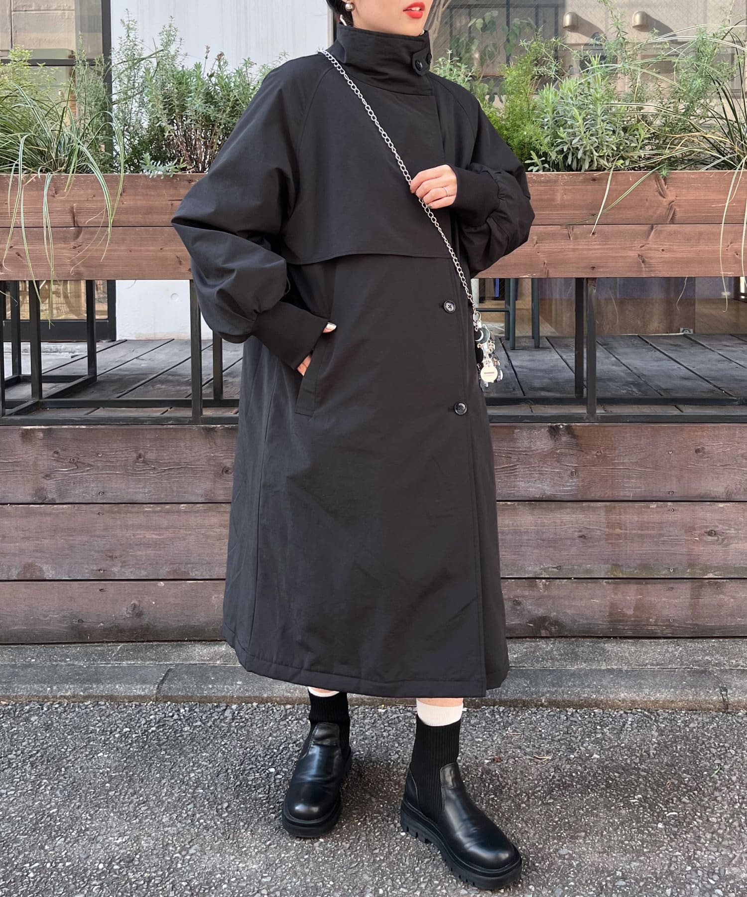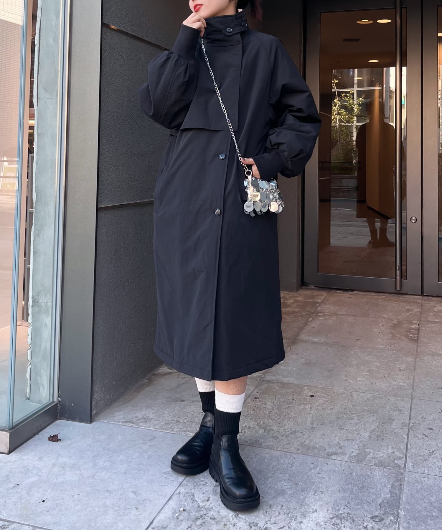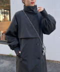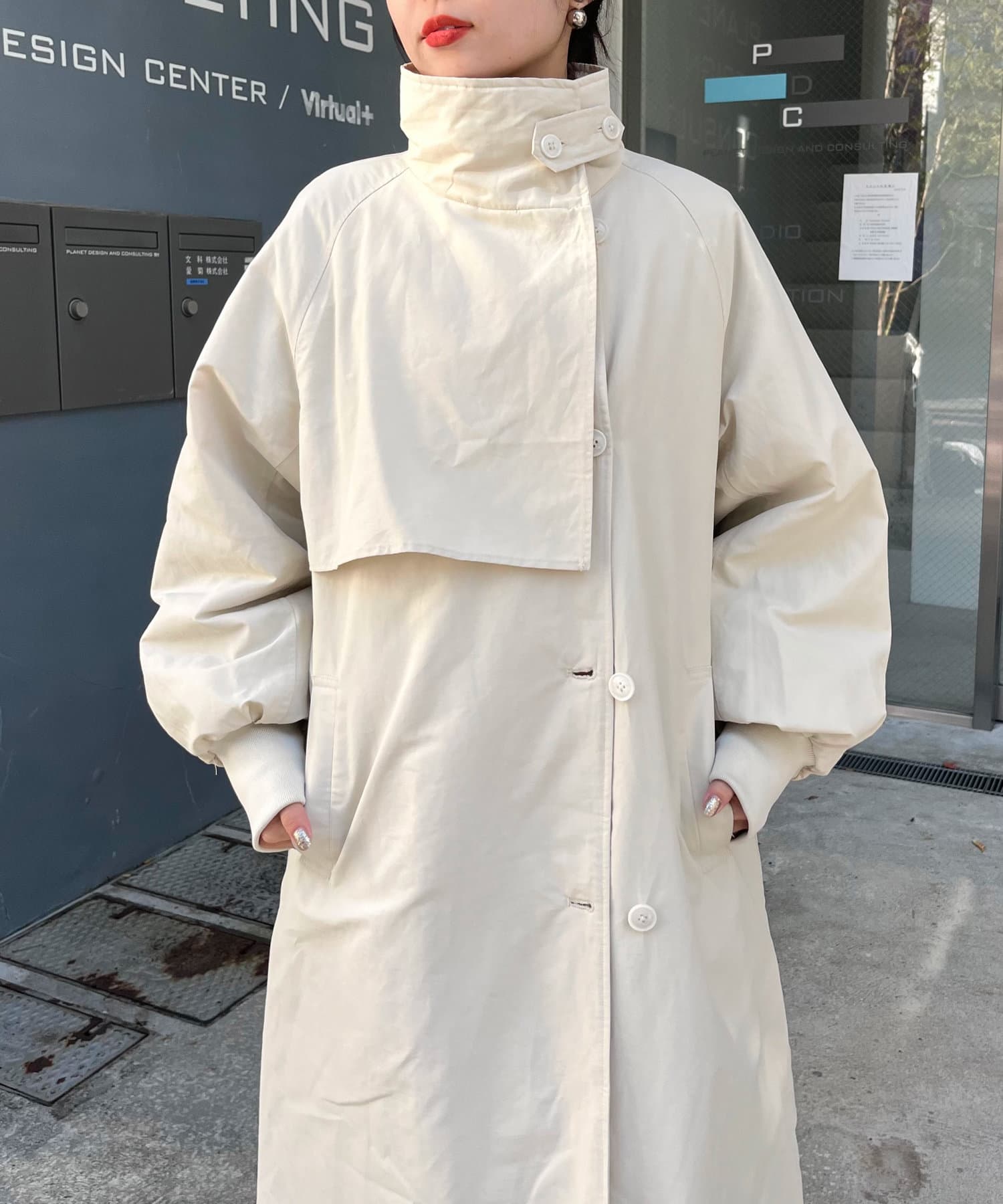 衿はステンカラーとスタンドカラーの2way仕様のロングコート。
