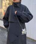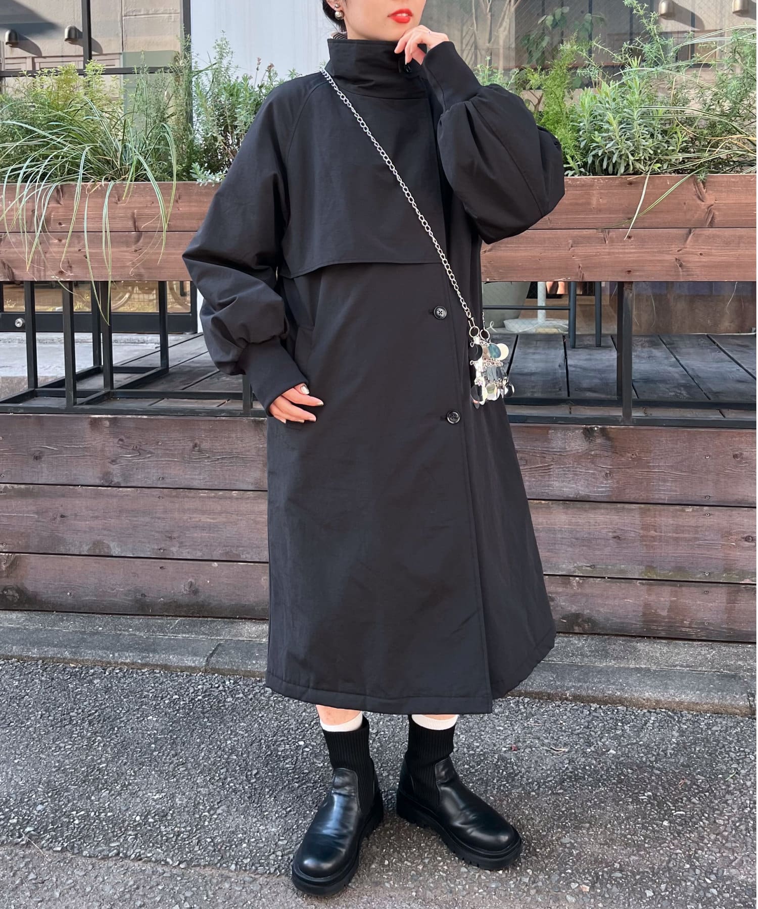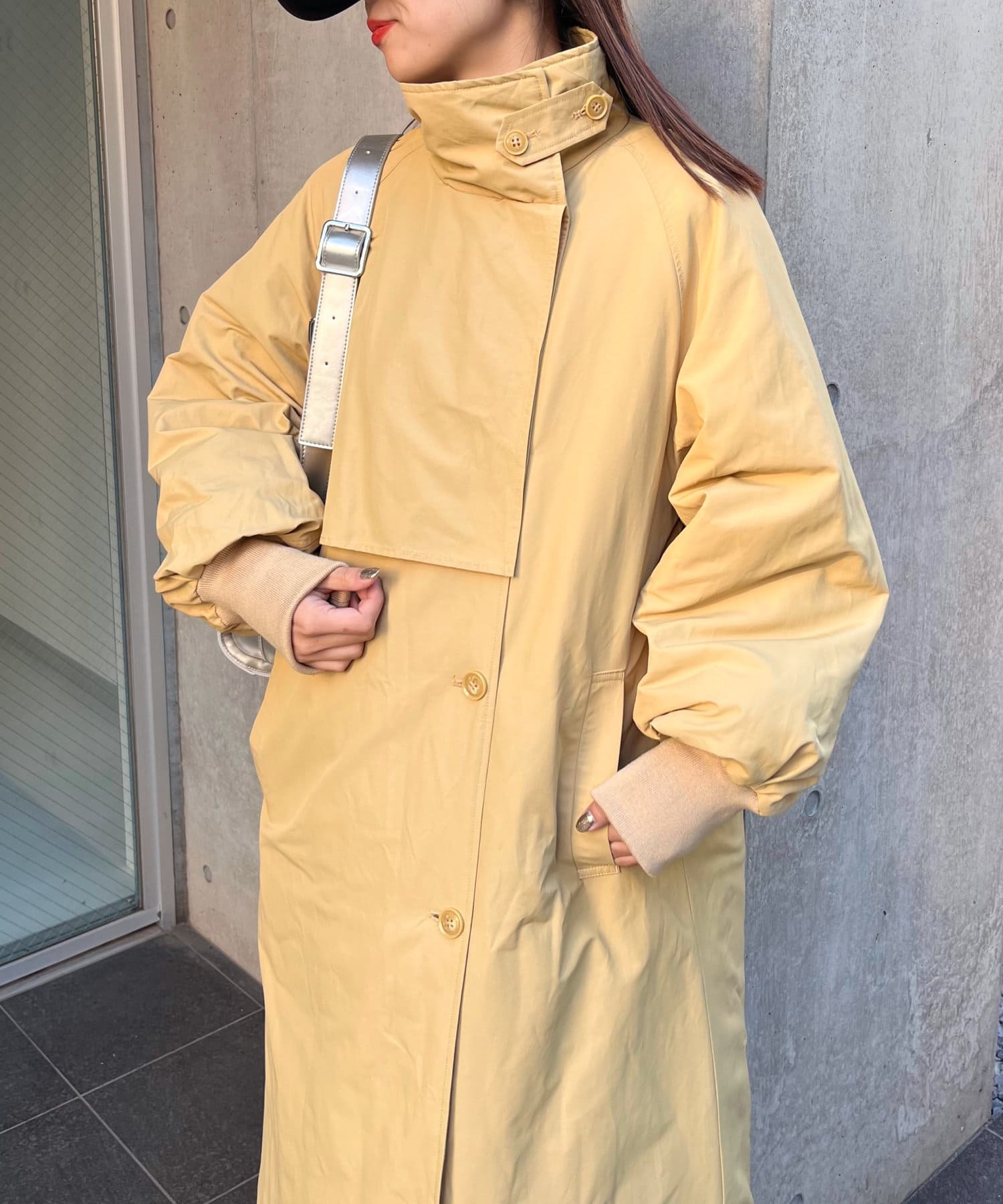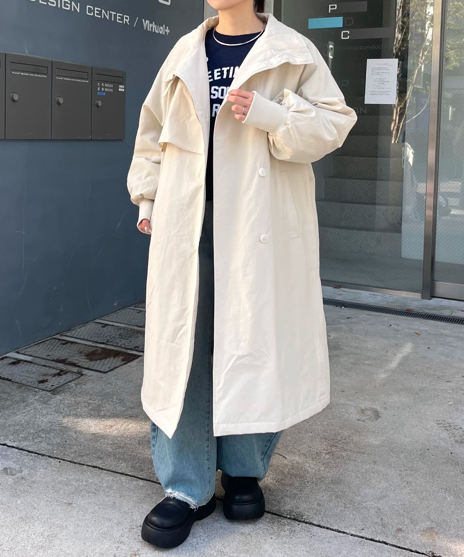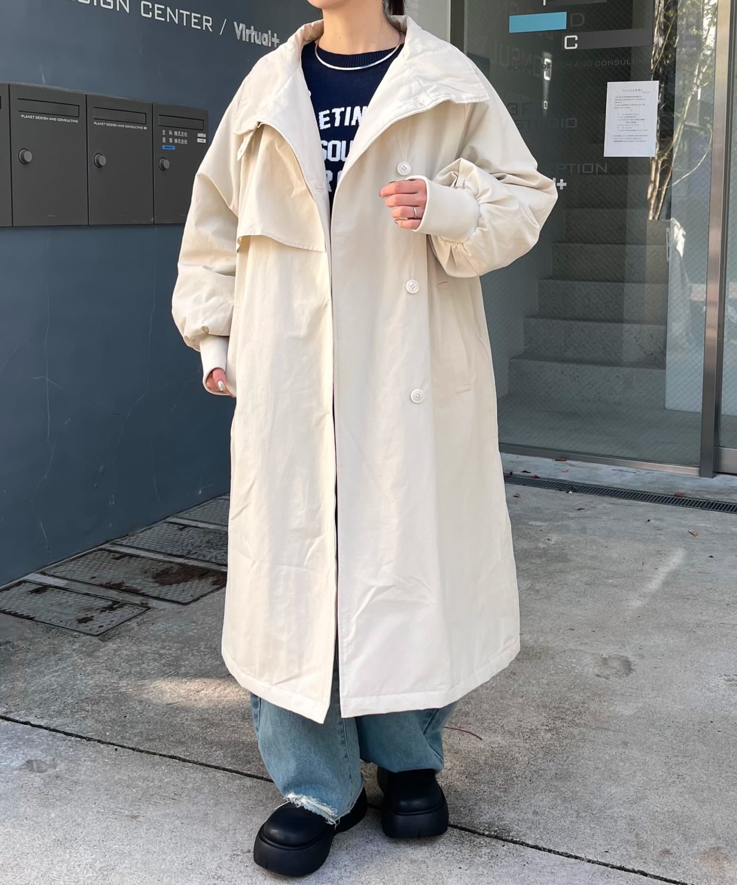 衿はステンカラーとスタンドカラーの2way仕様のロングコート。