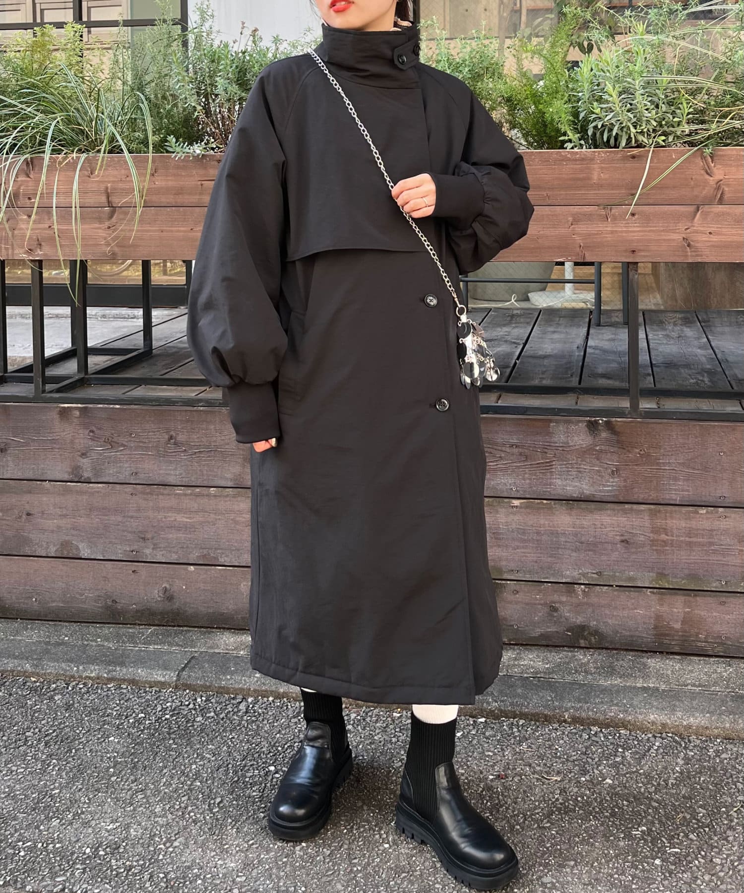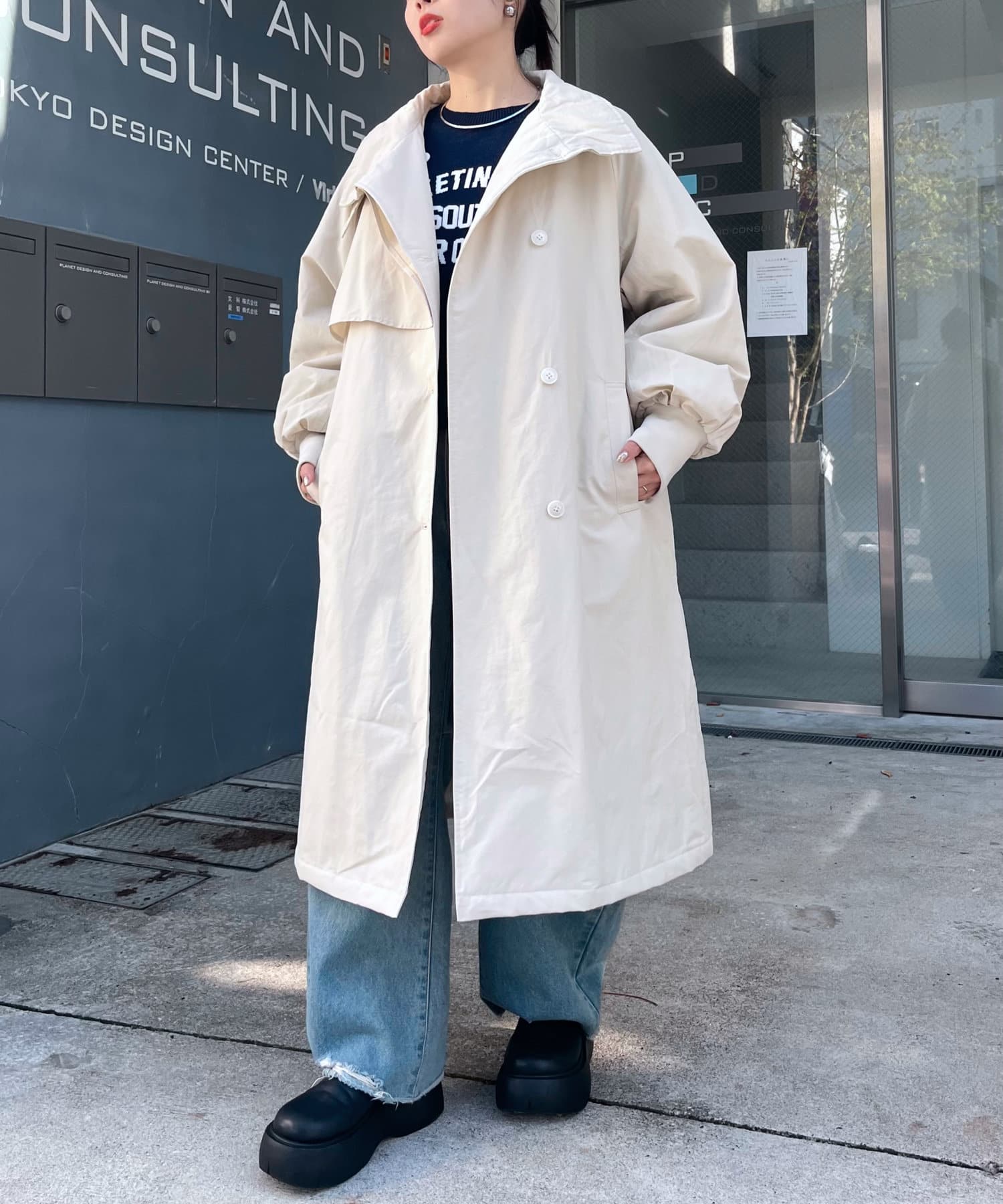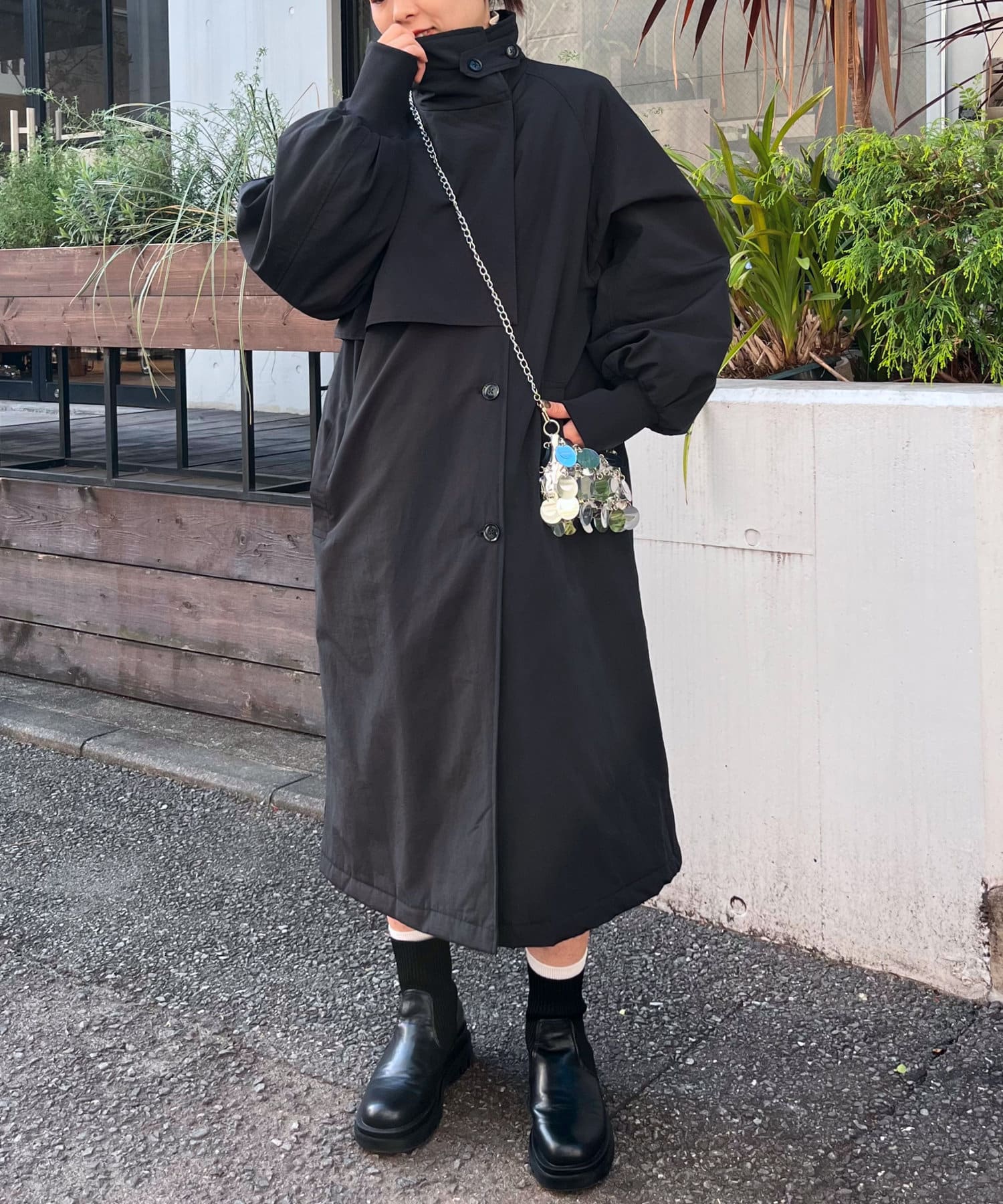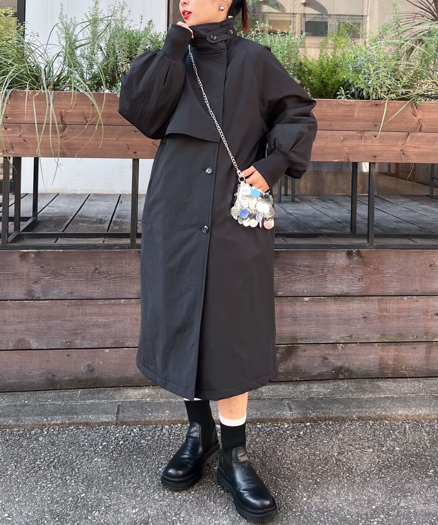 衿はステンカラーとスタンドカラーの2way仕様のロングコート。