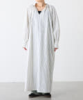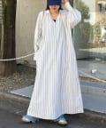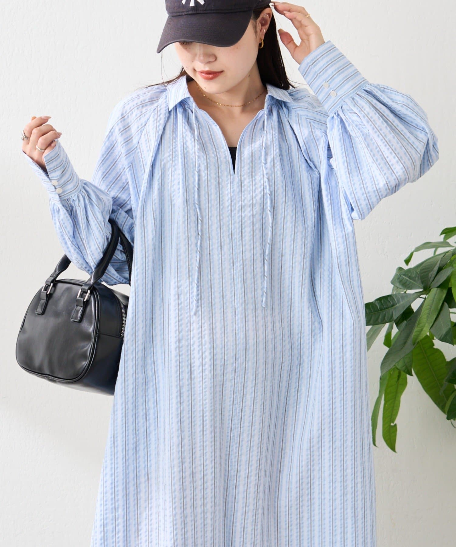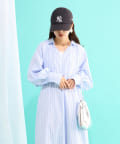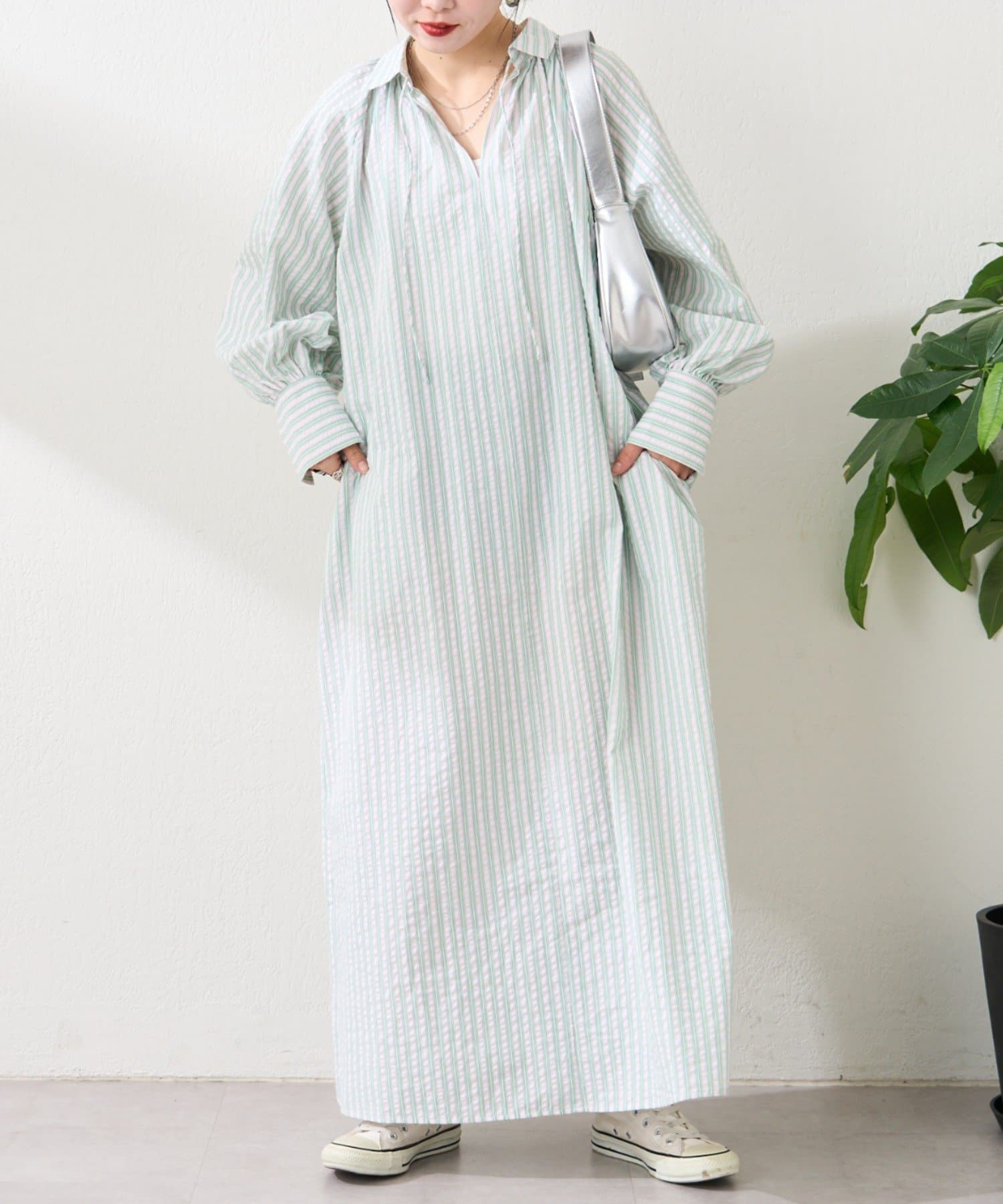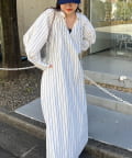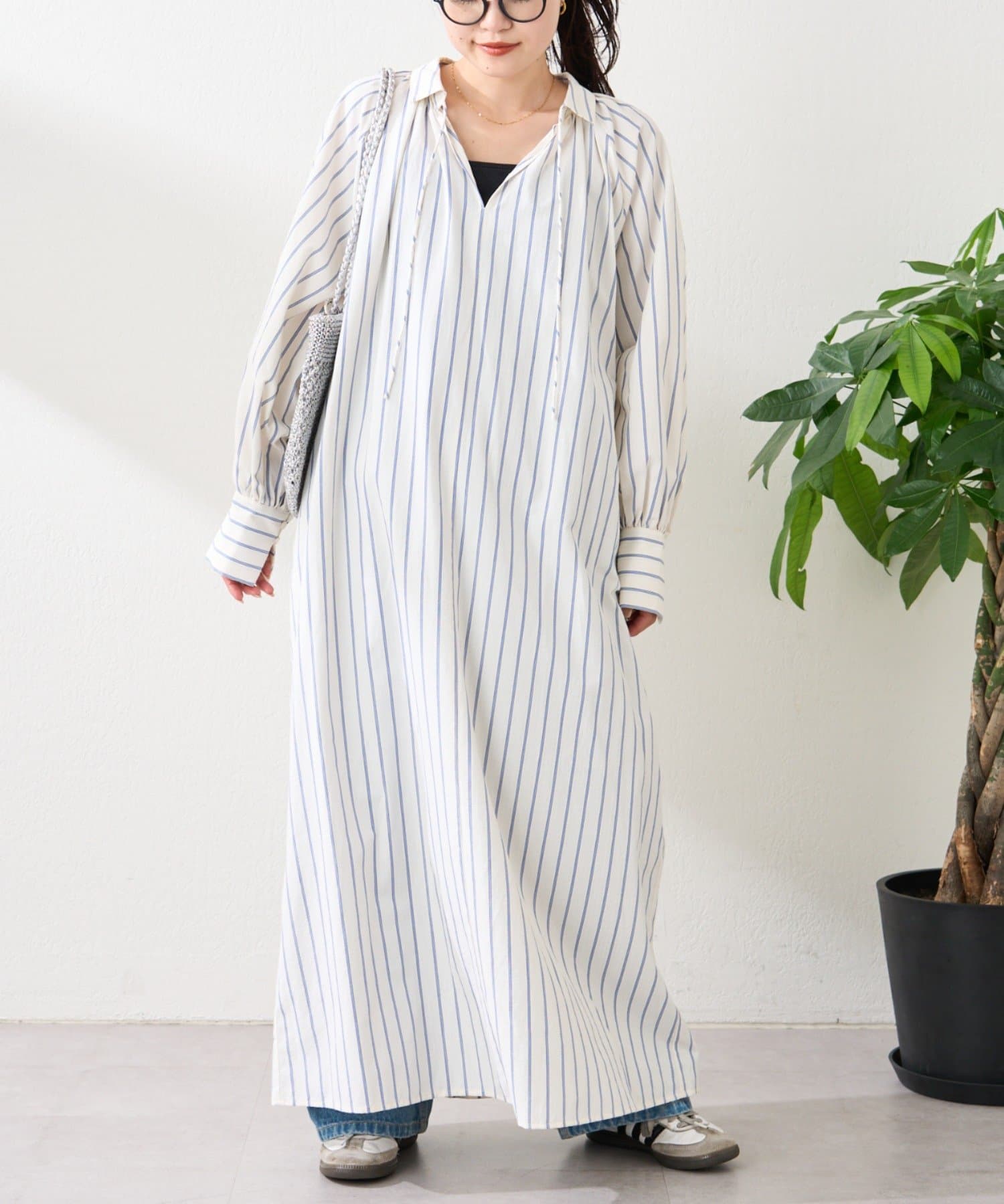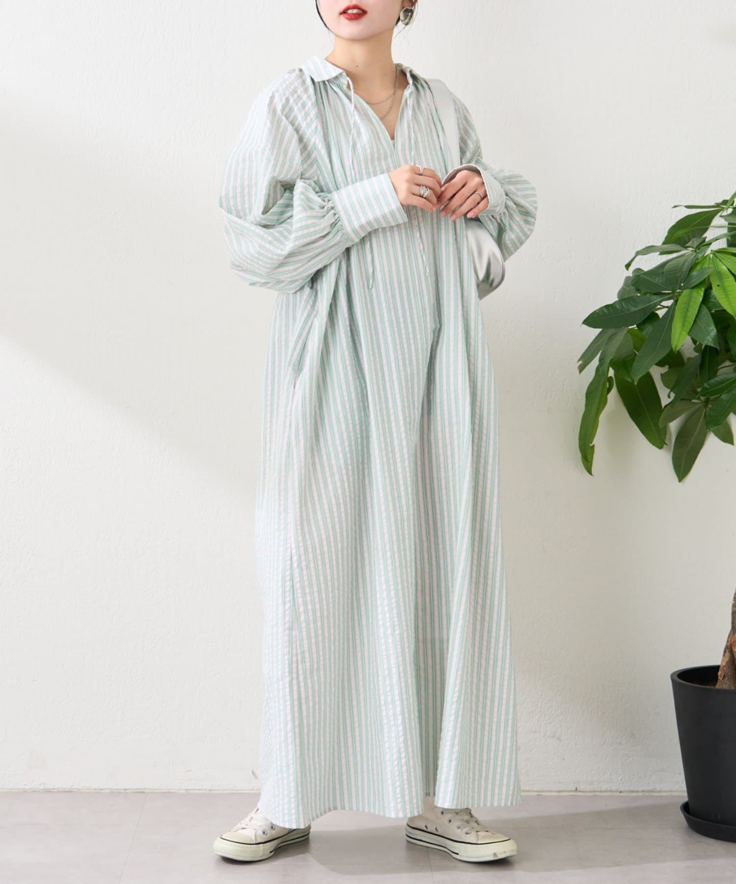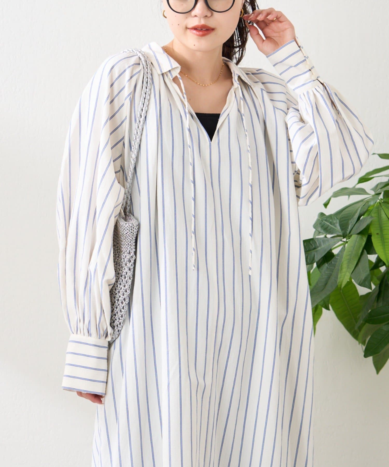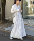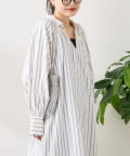 春らしいストライプが爽やかな、ゆったり大きめサイズのシャツワンピース。