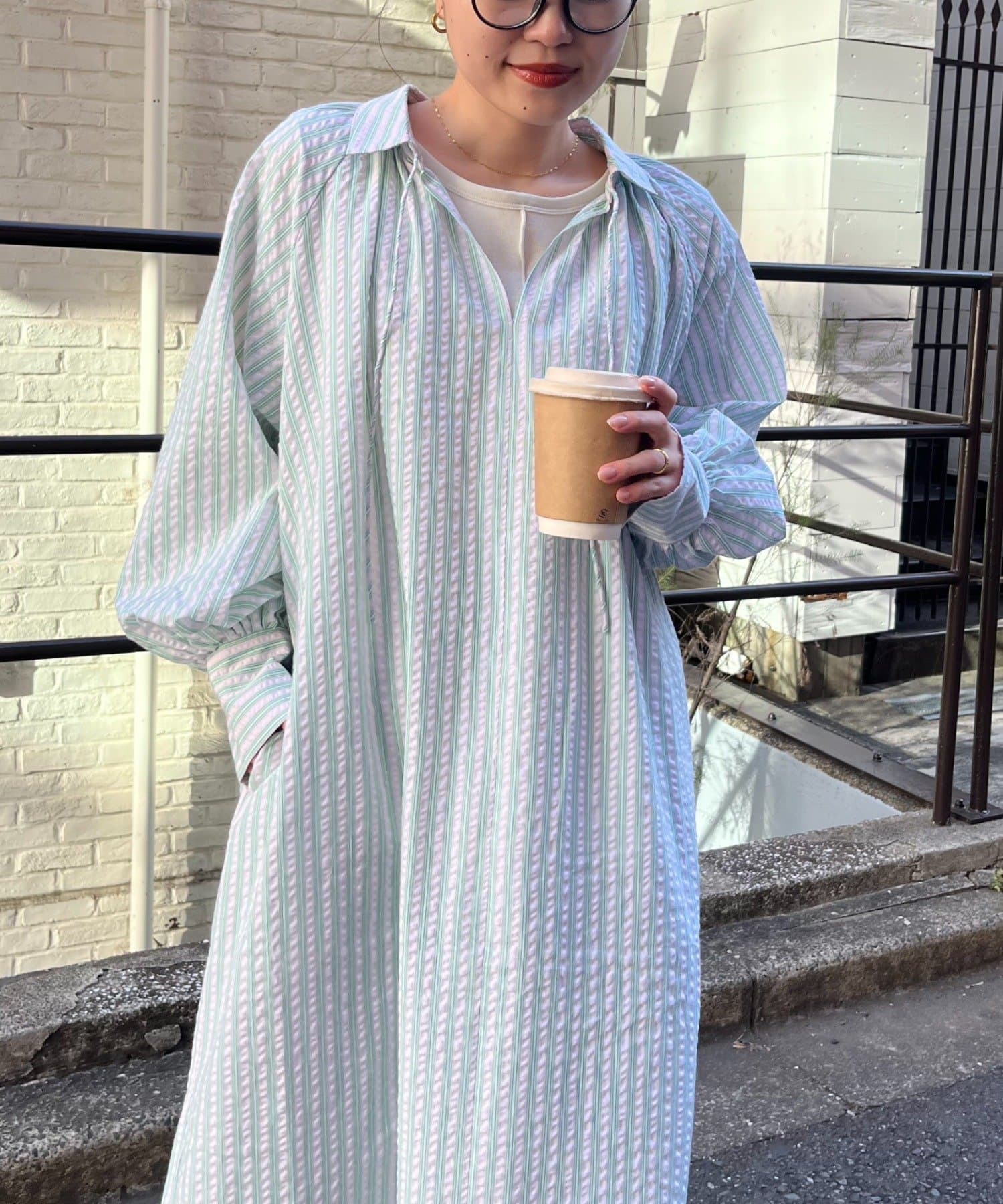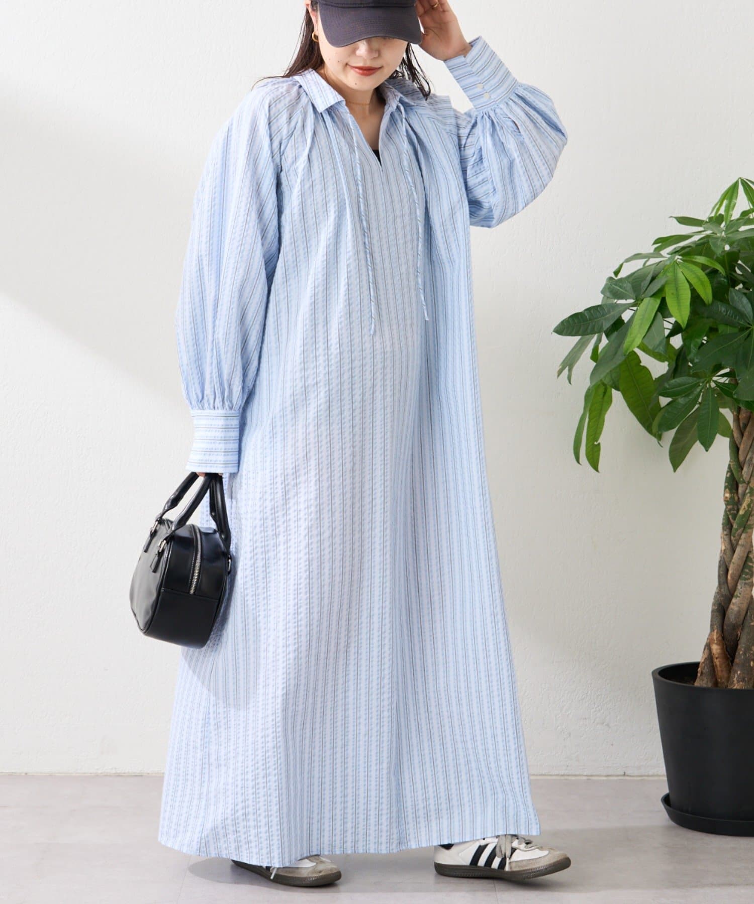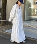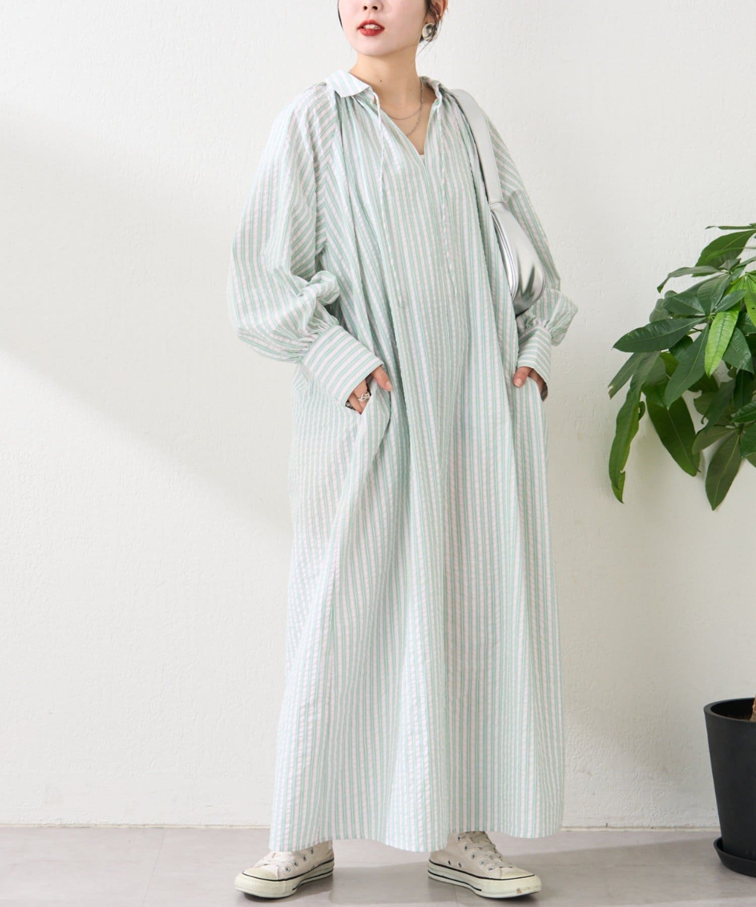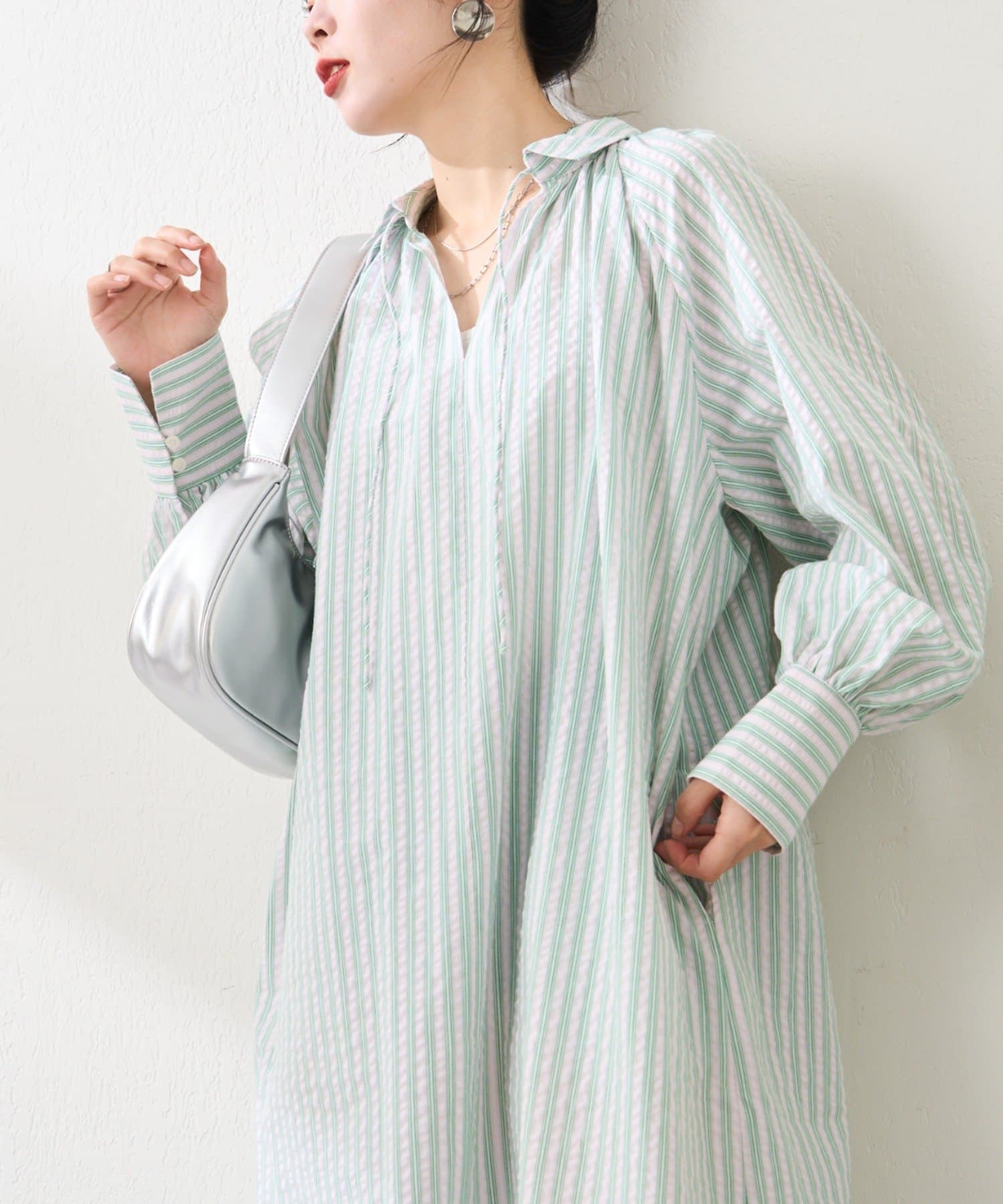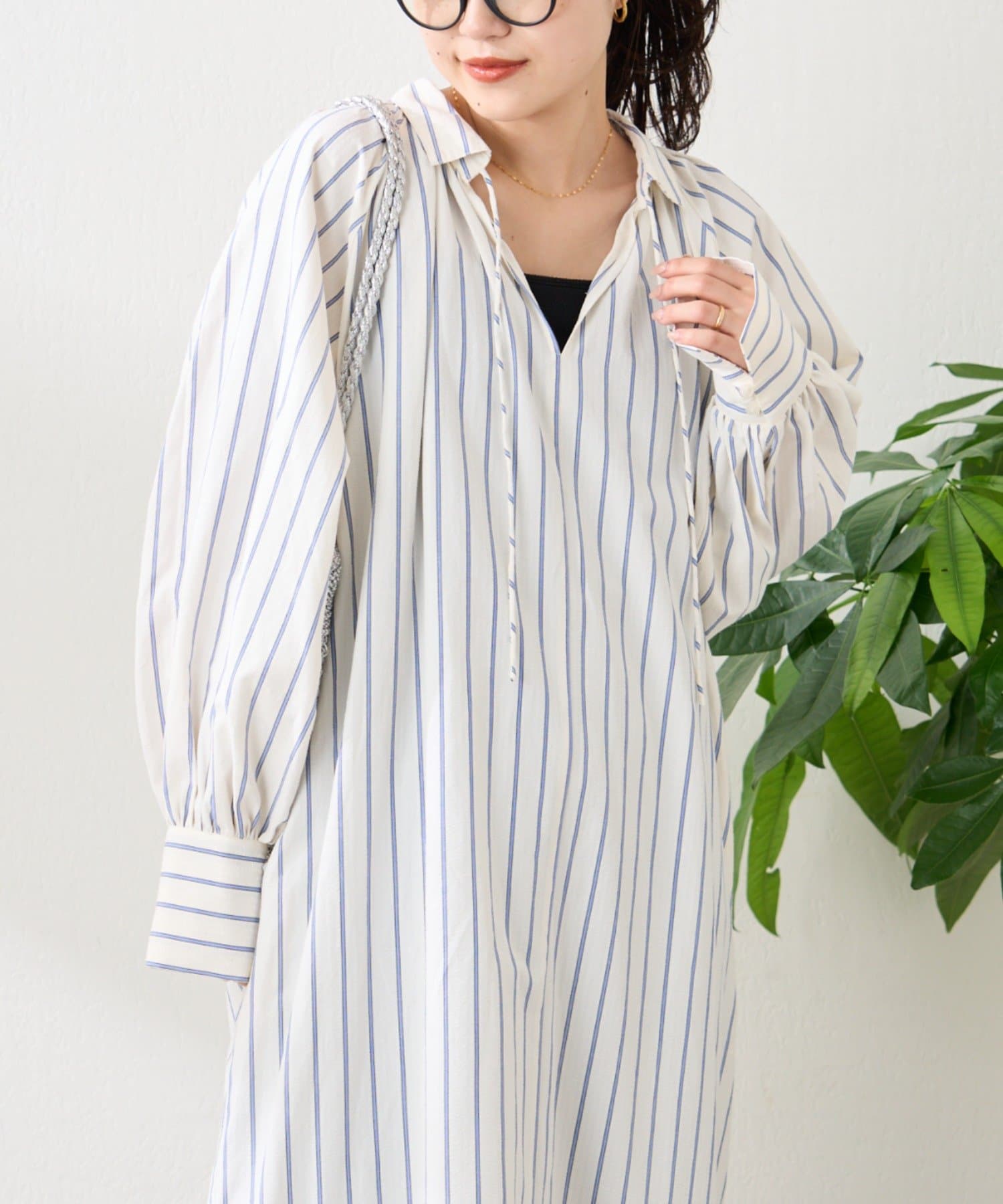 春らしいストライプが爽やかな、ゆったり大きめサイズのシャツワンピース。