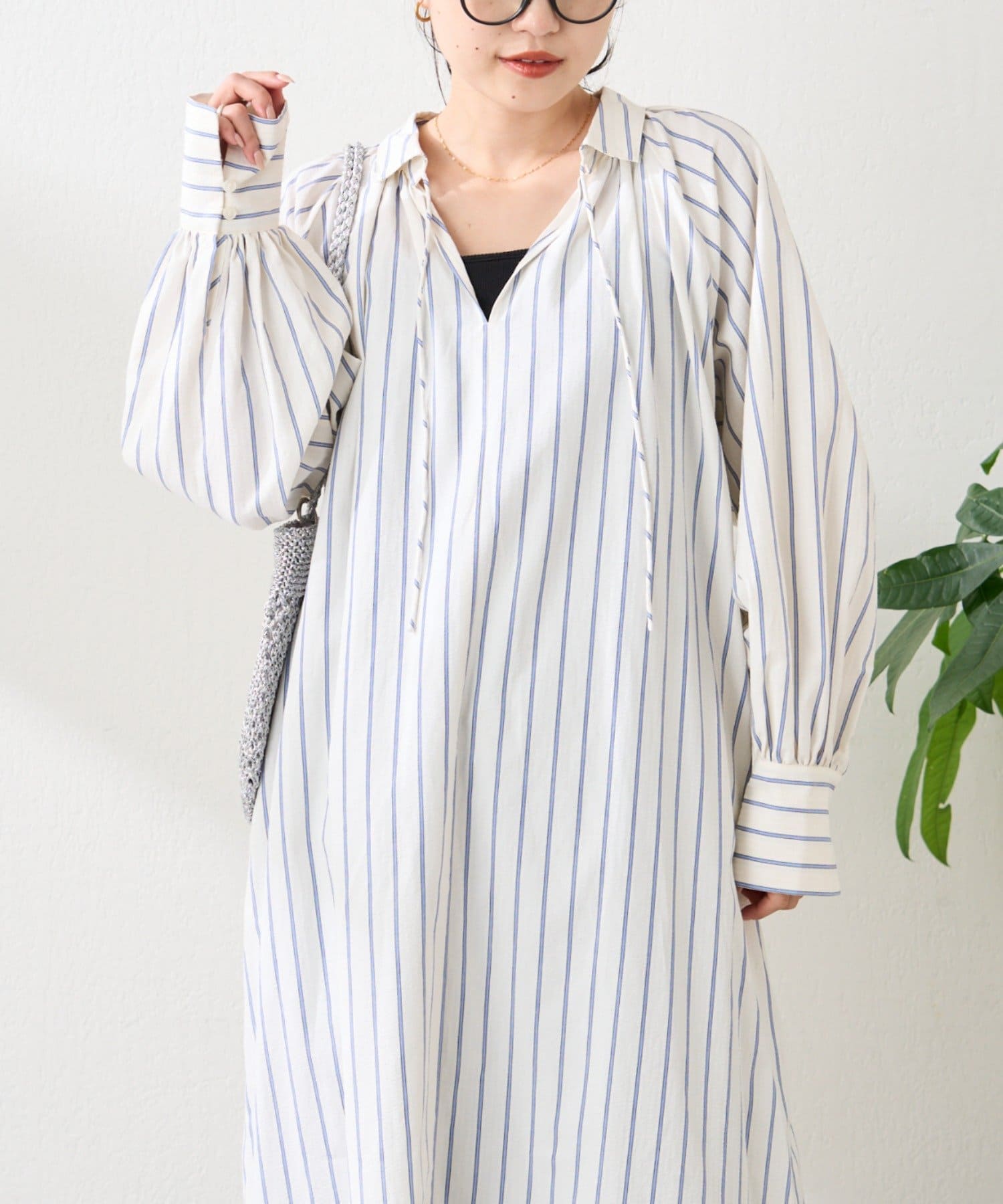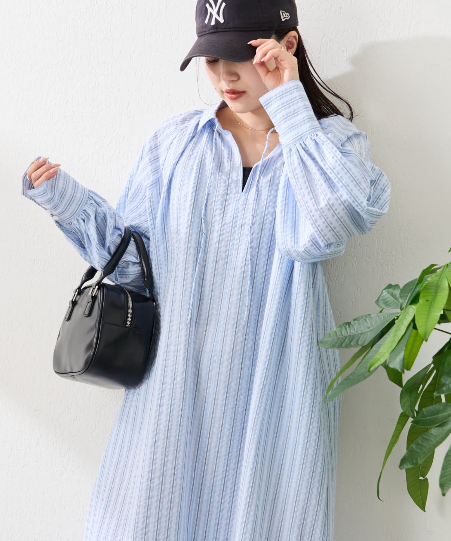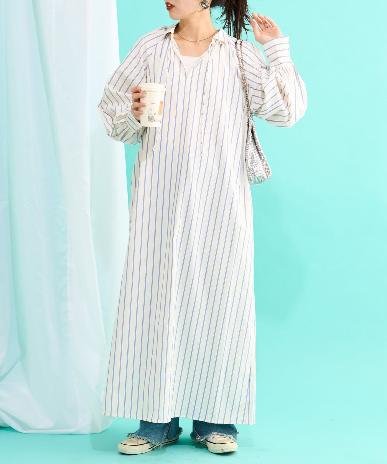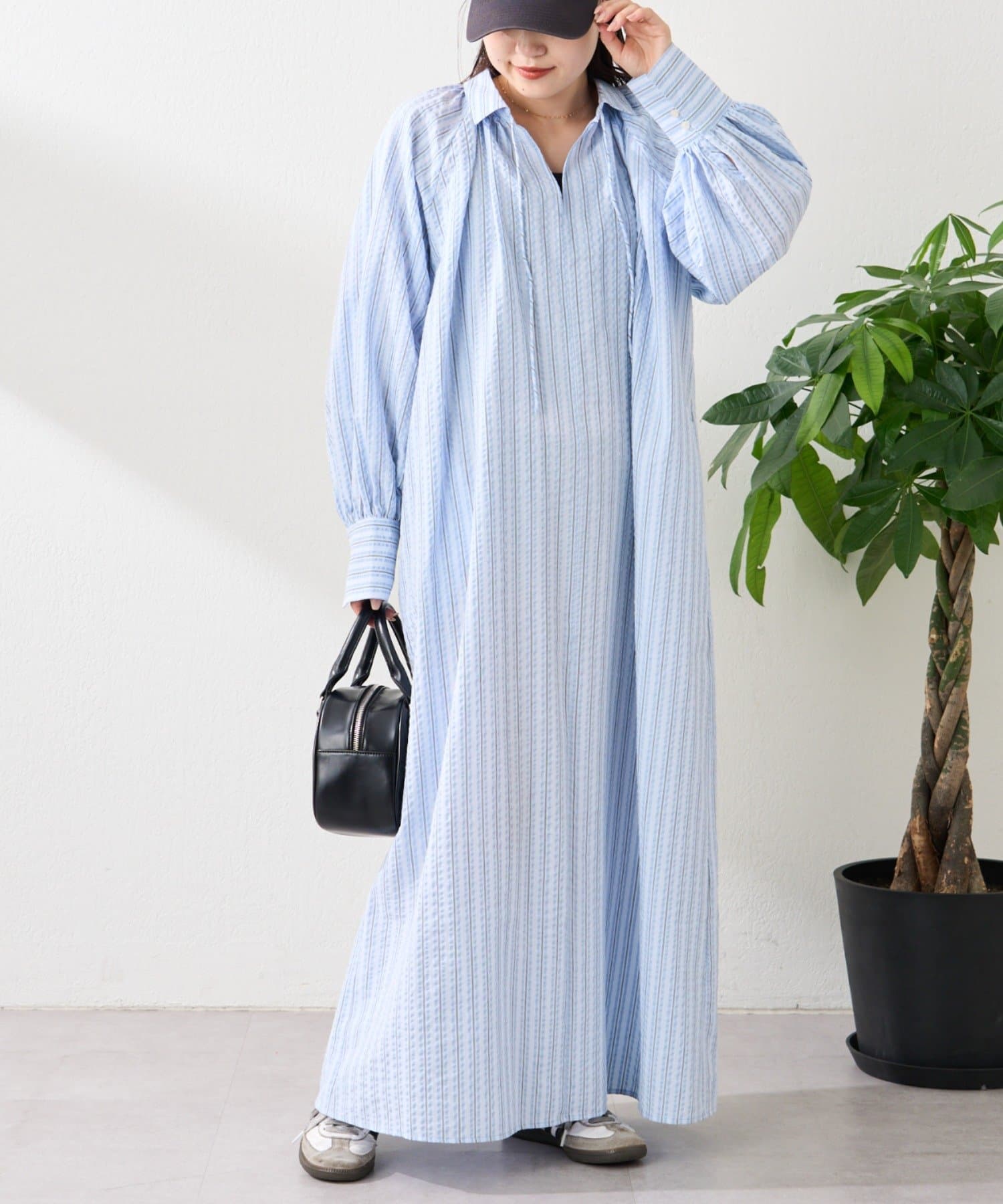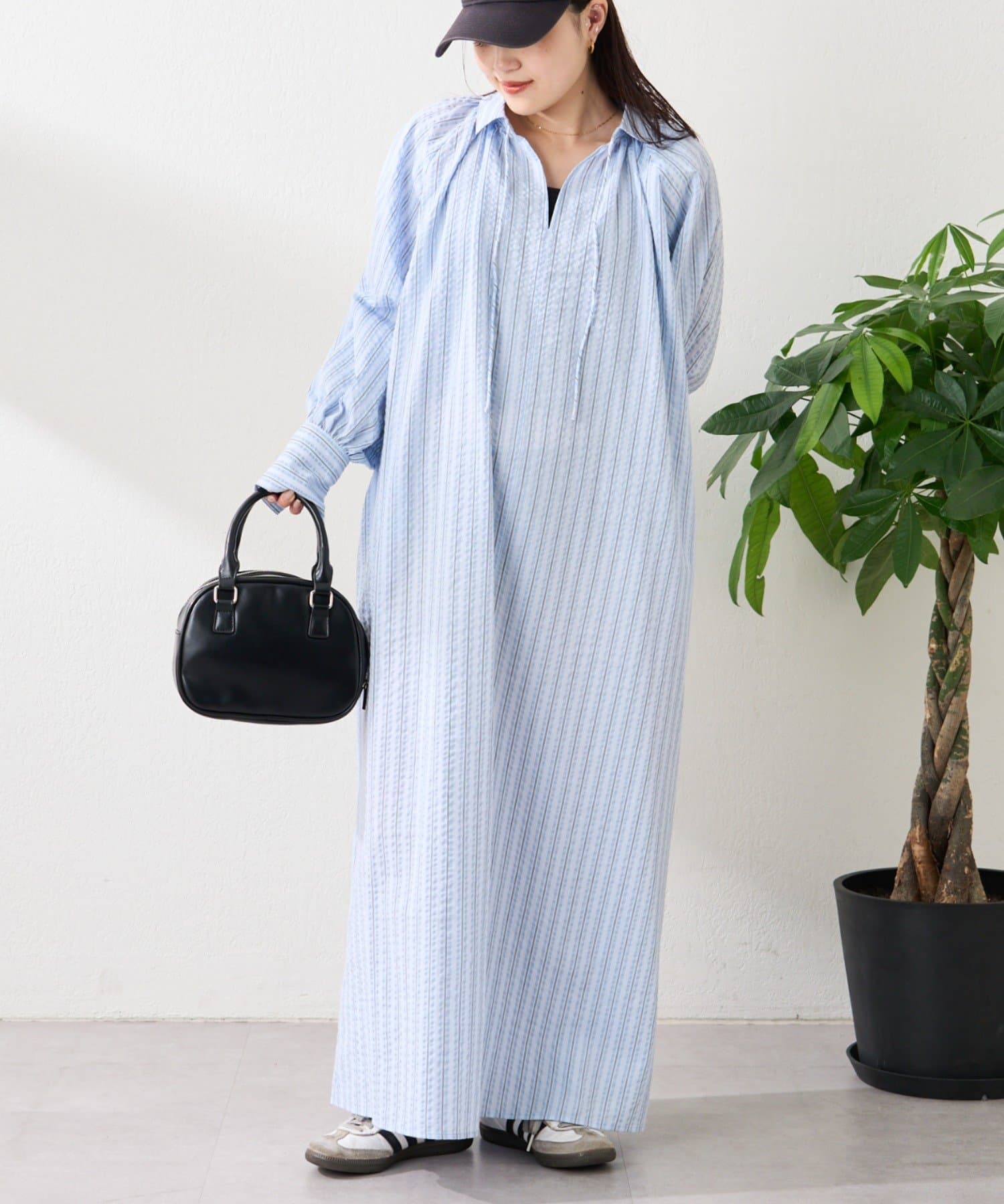 春らしいストライプが爽やかな、ゆったり大きめサイズのシャツワンピース。