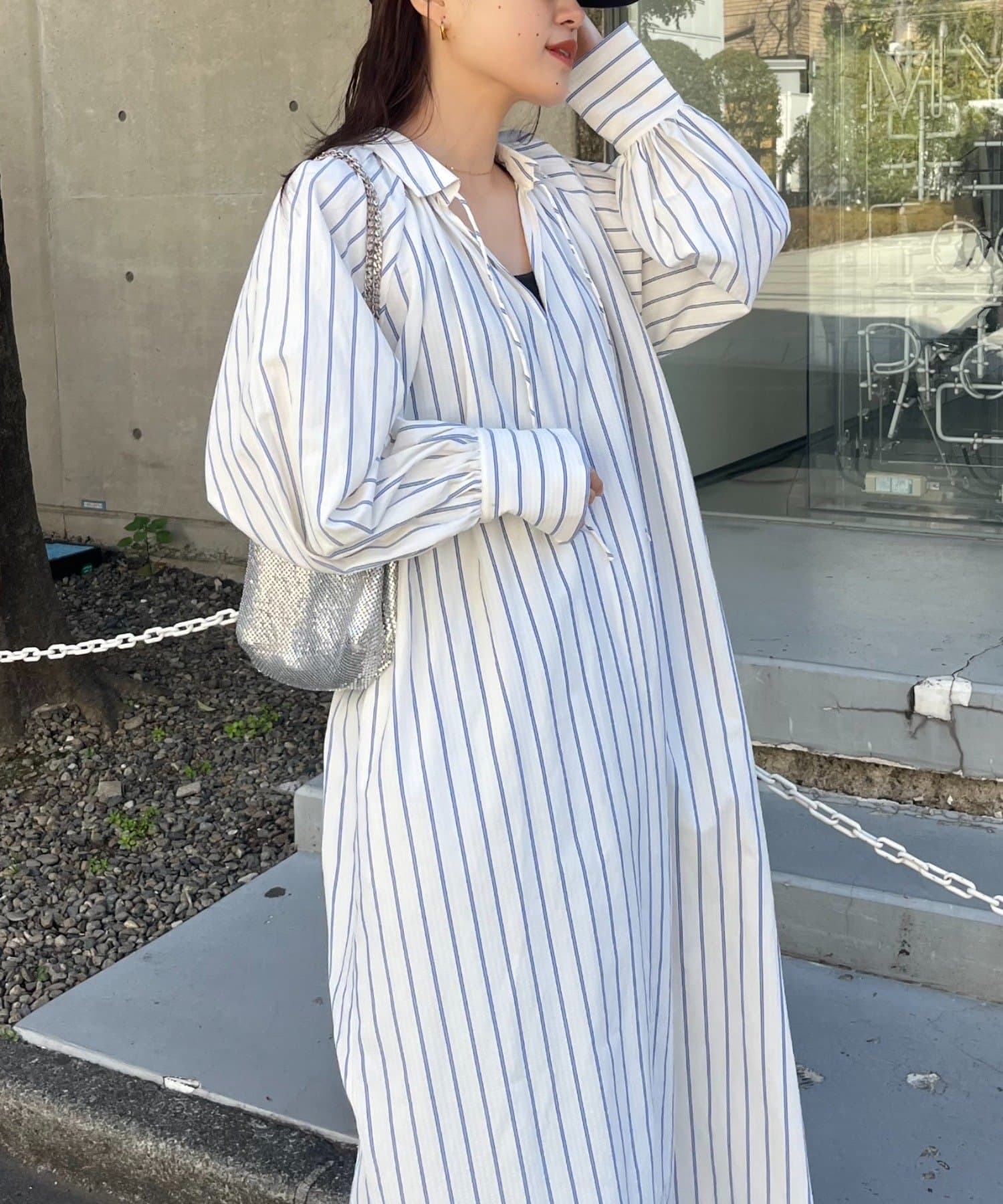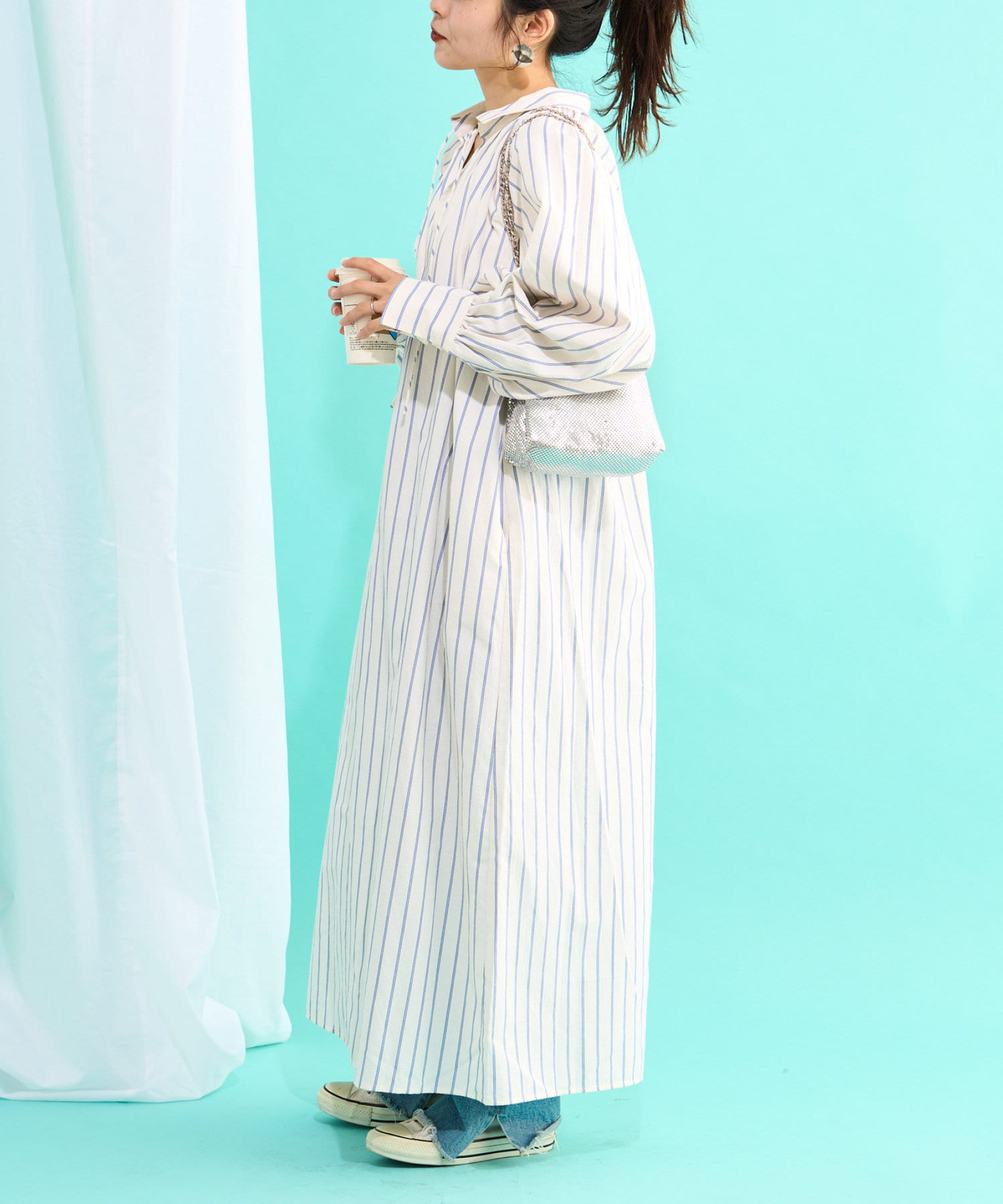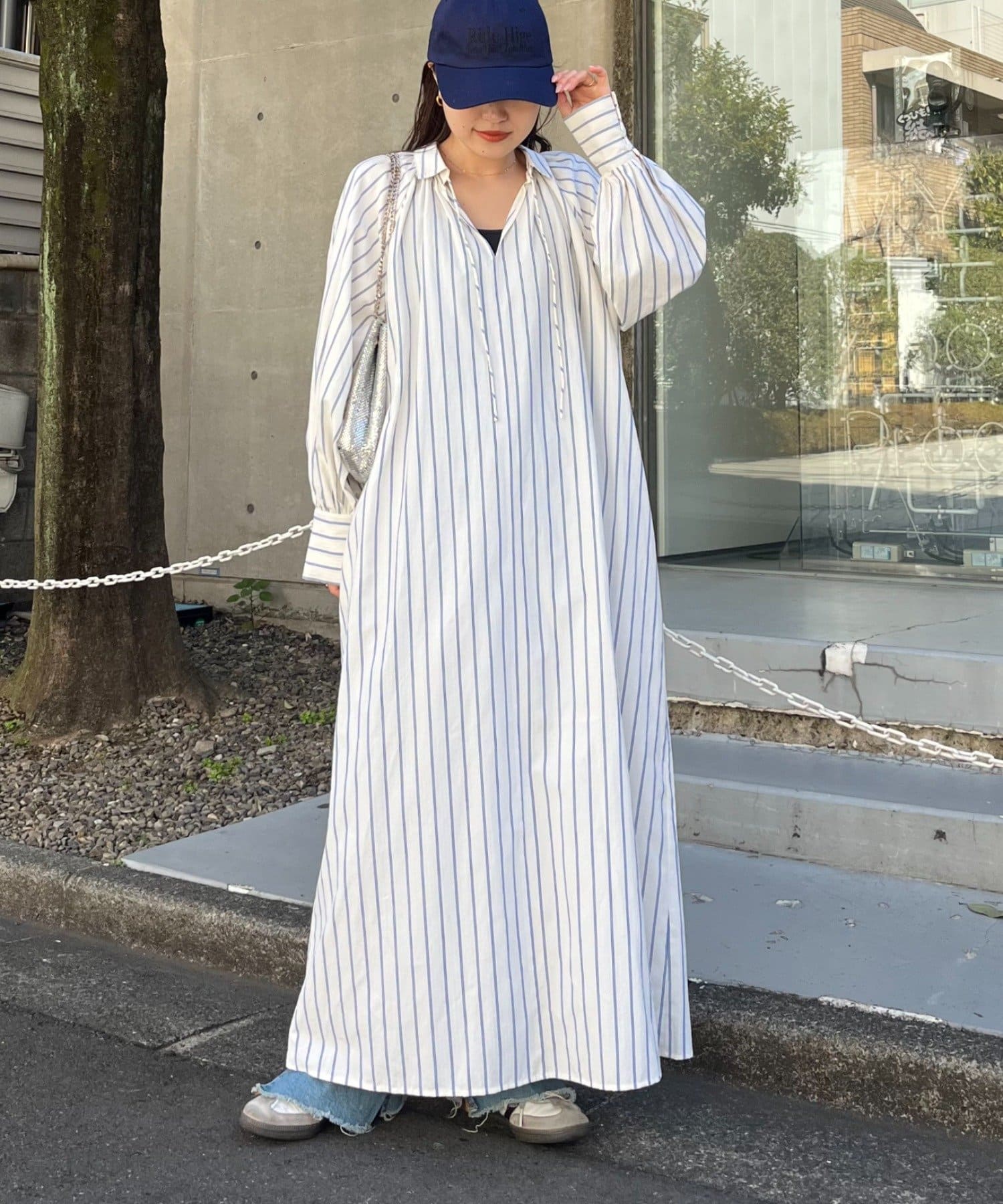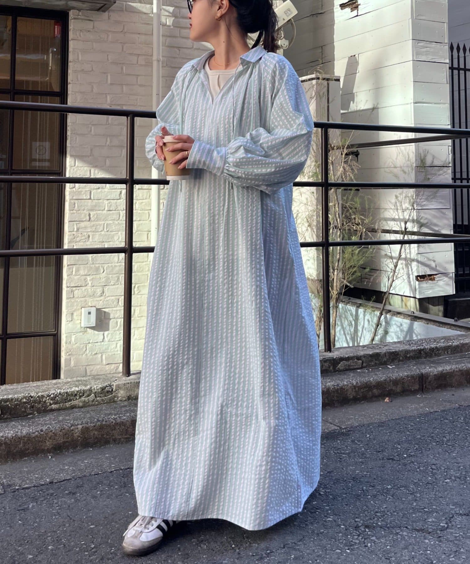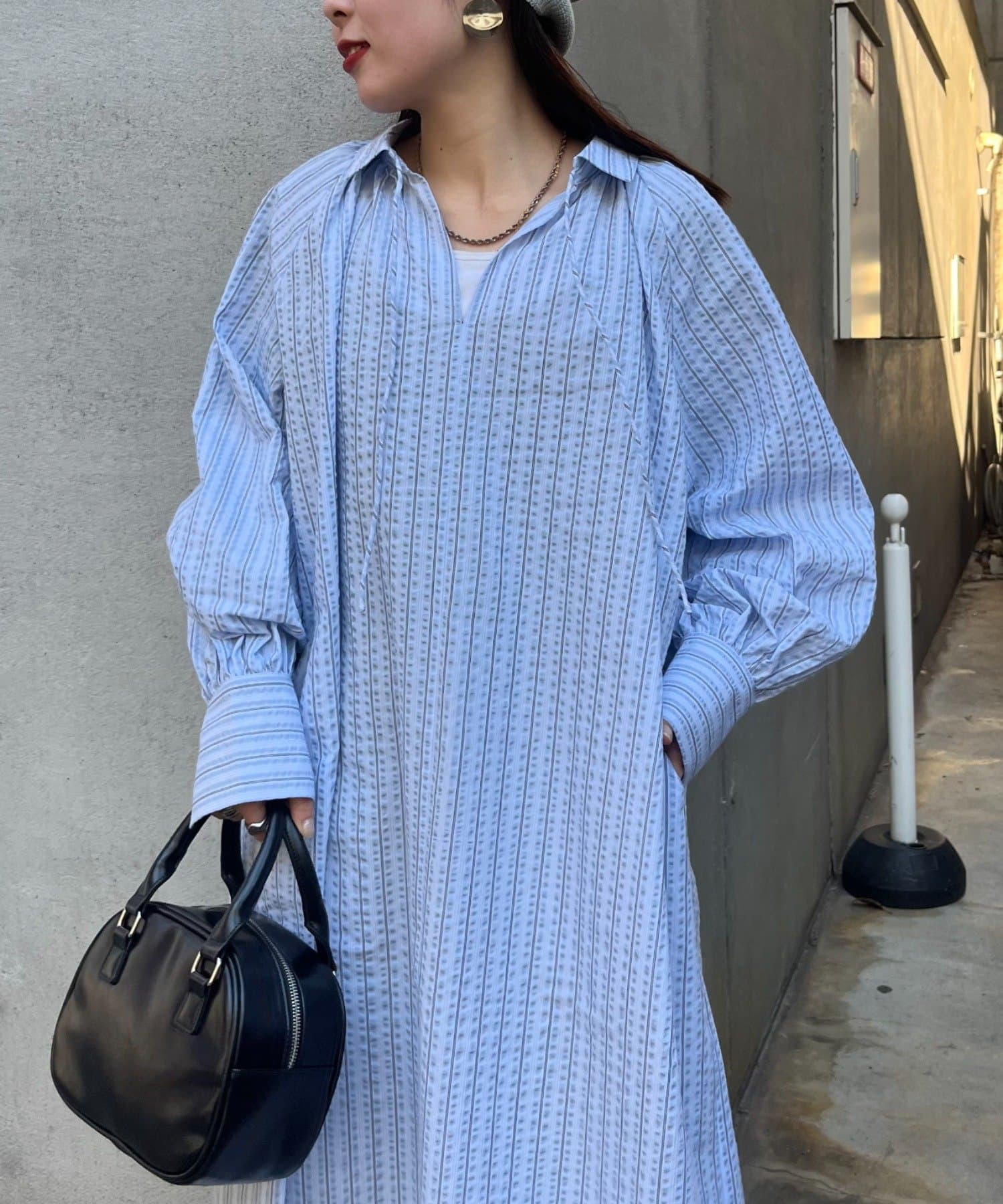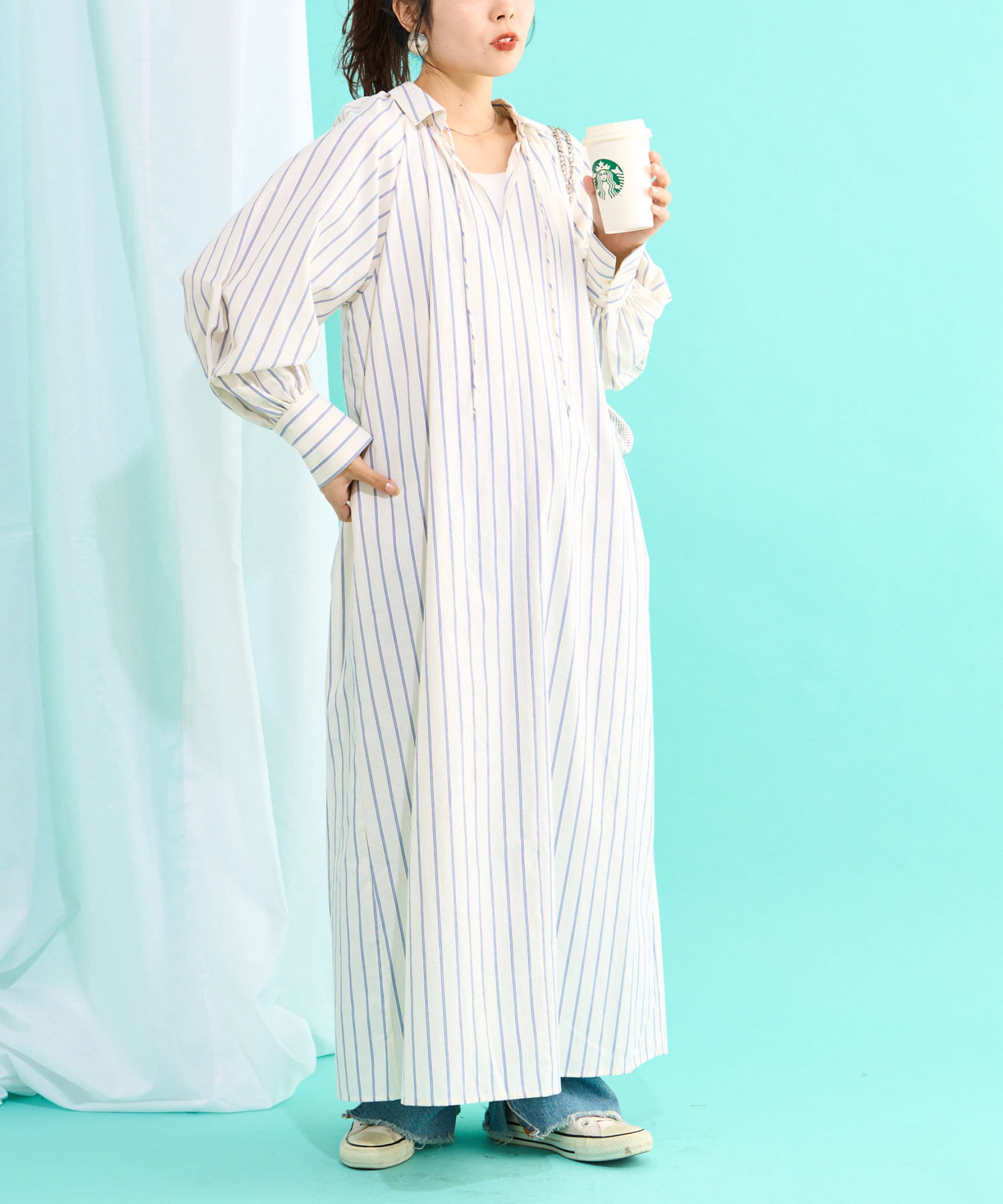 春らしいストライプが爽やかな、ゆったり大きめサイズのシャツワンピース。