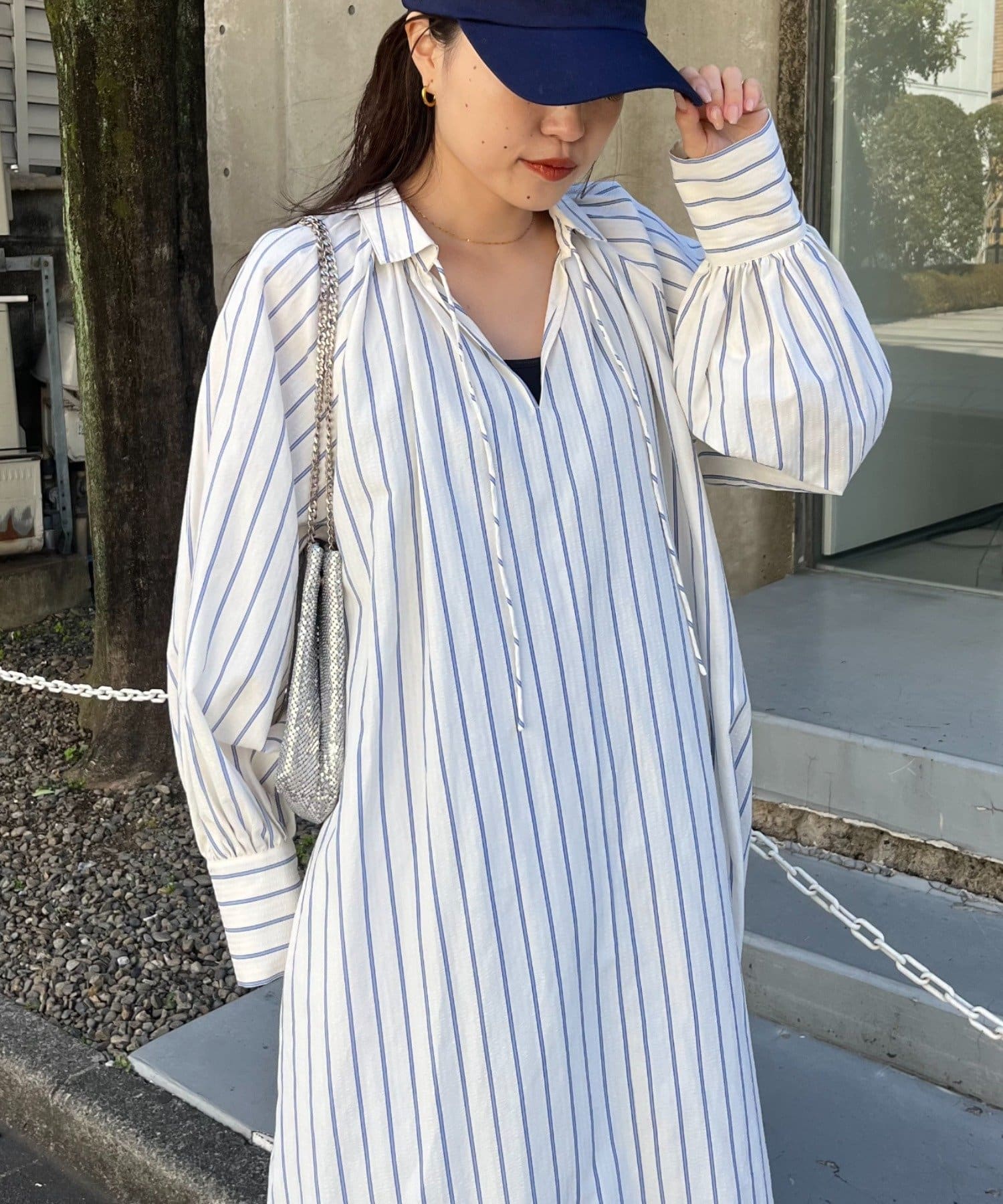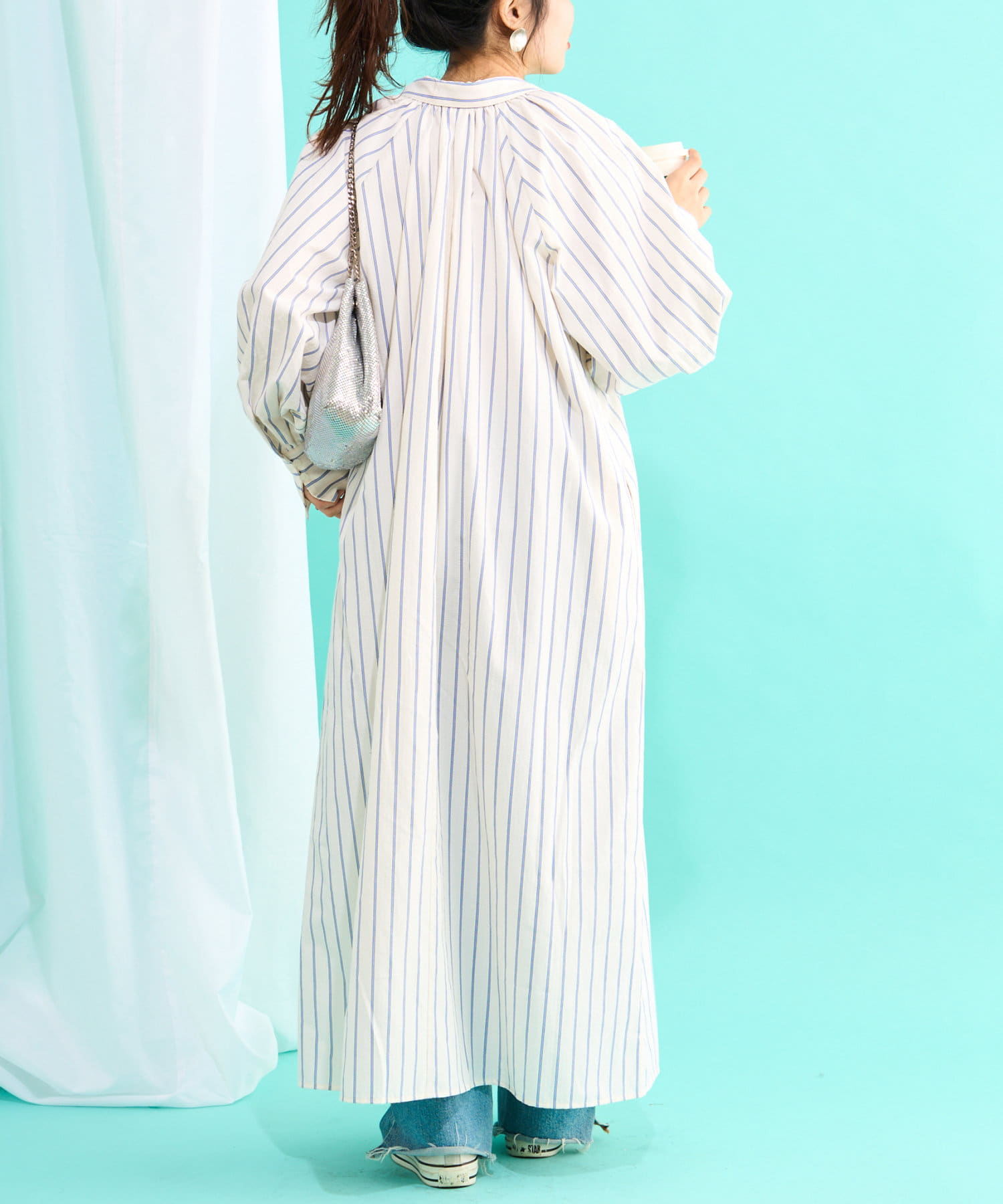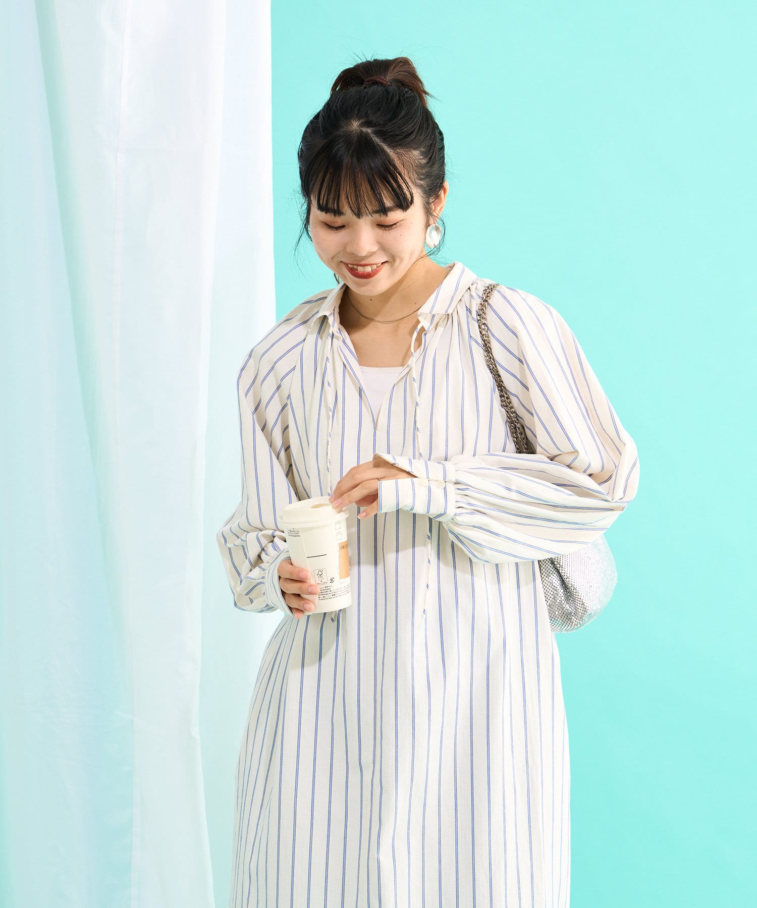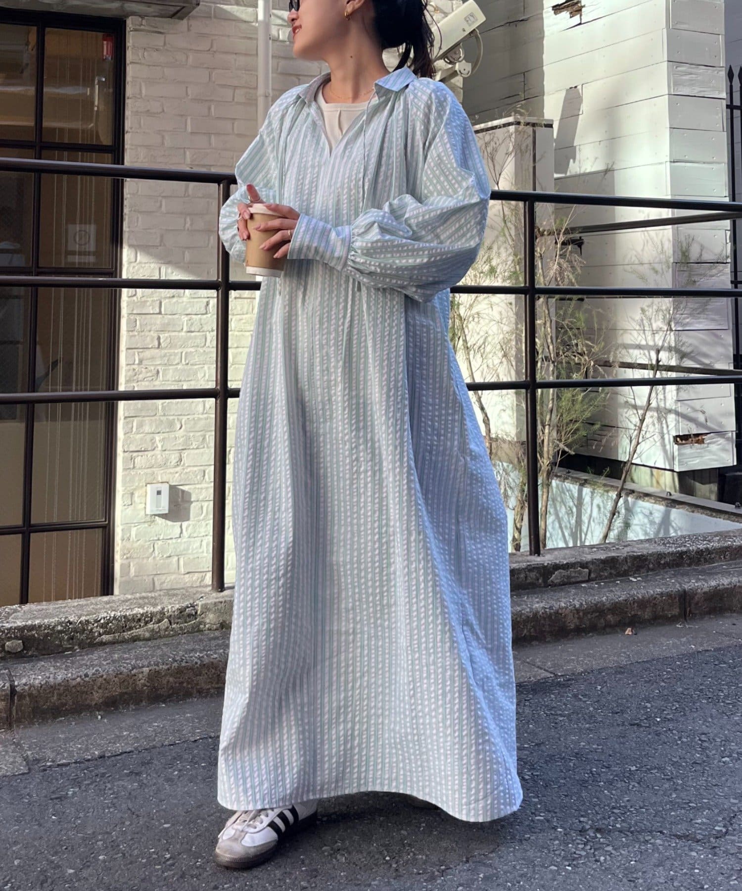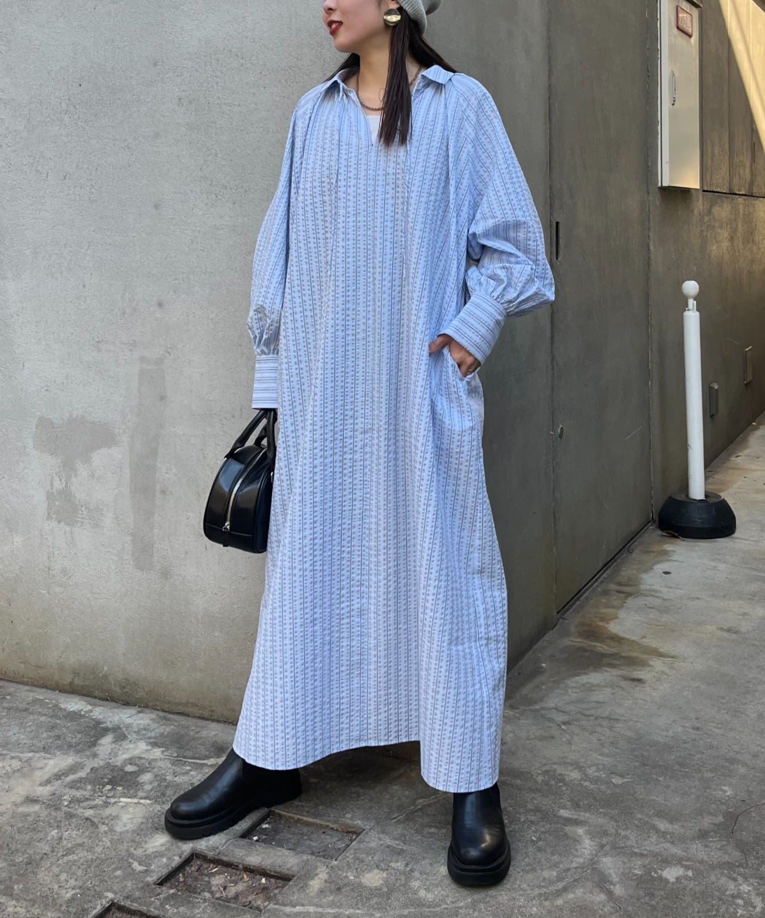 春らしいストライプが爽やかな、ゆったり大きめサイズのシャツワンピース。