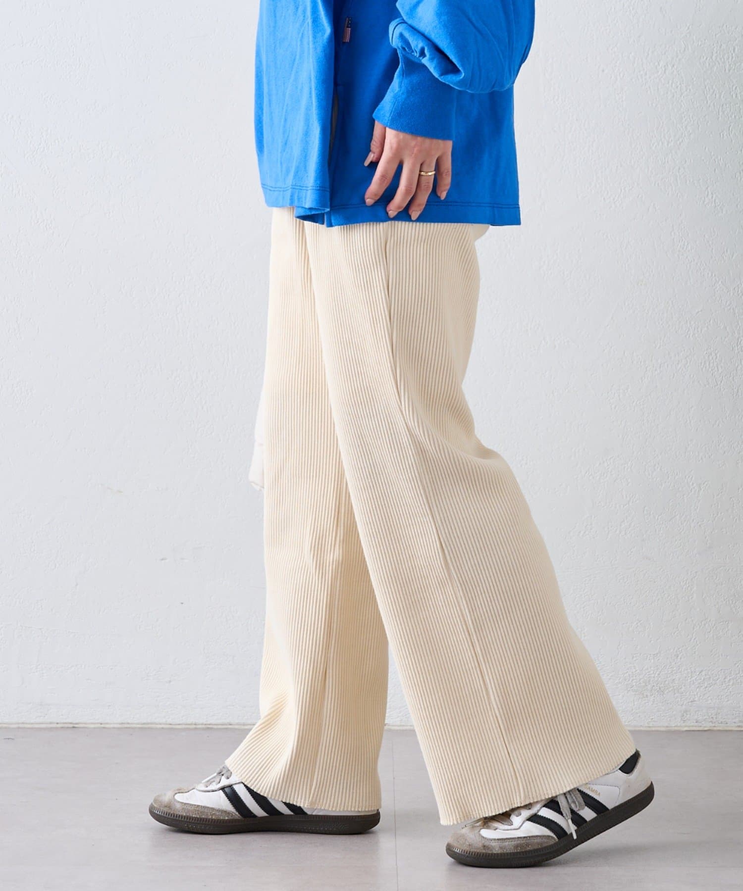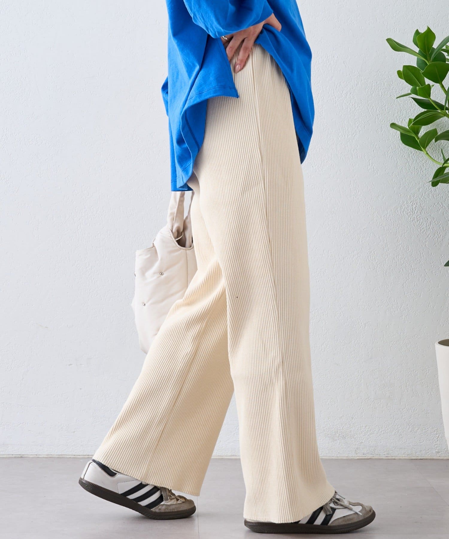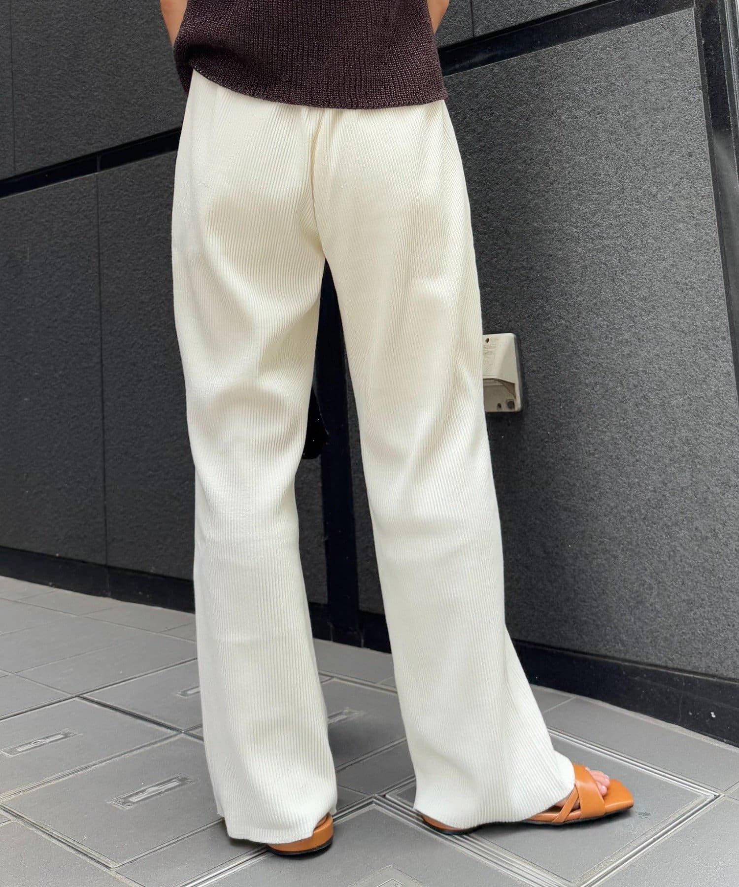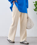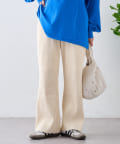 柔らかな生地にウエストゴムで、リラックスして履けるイージーパンツ仕様。