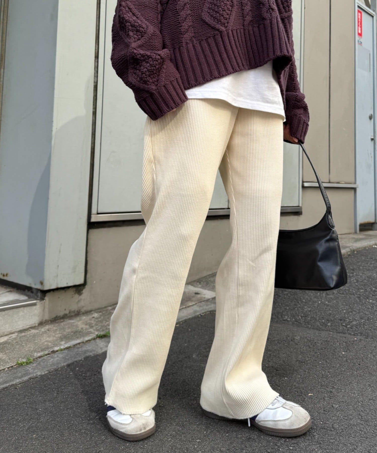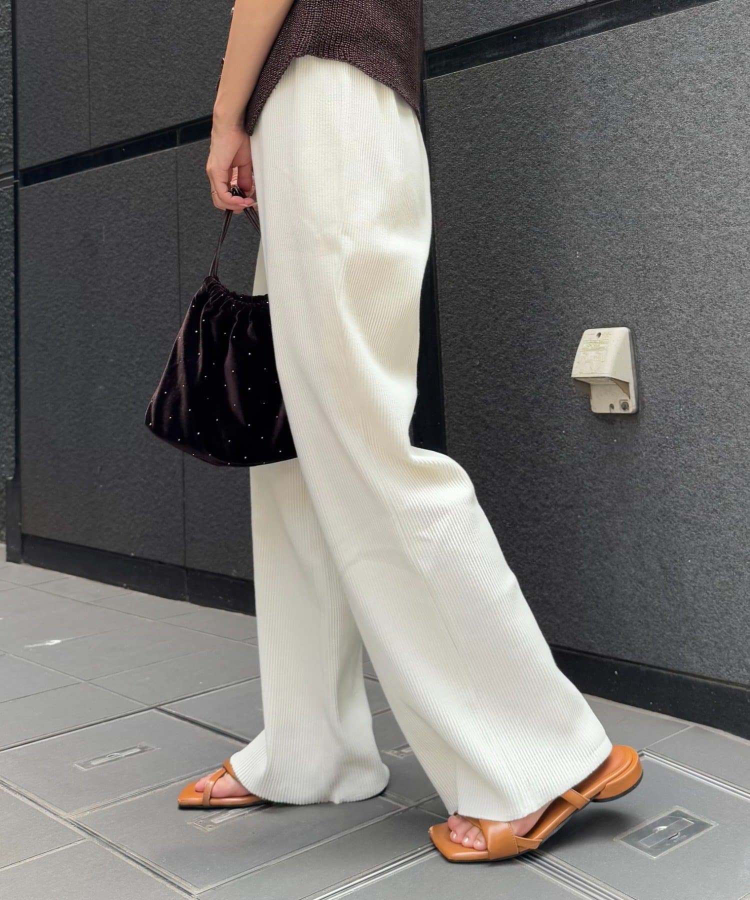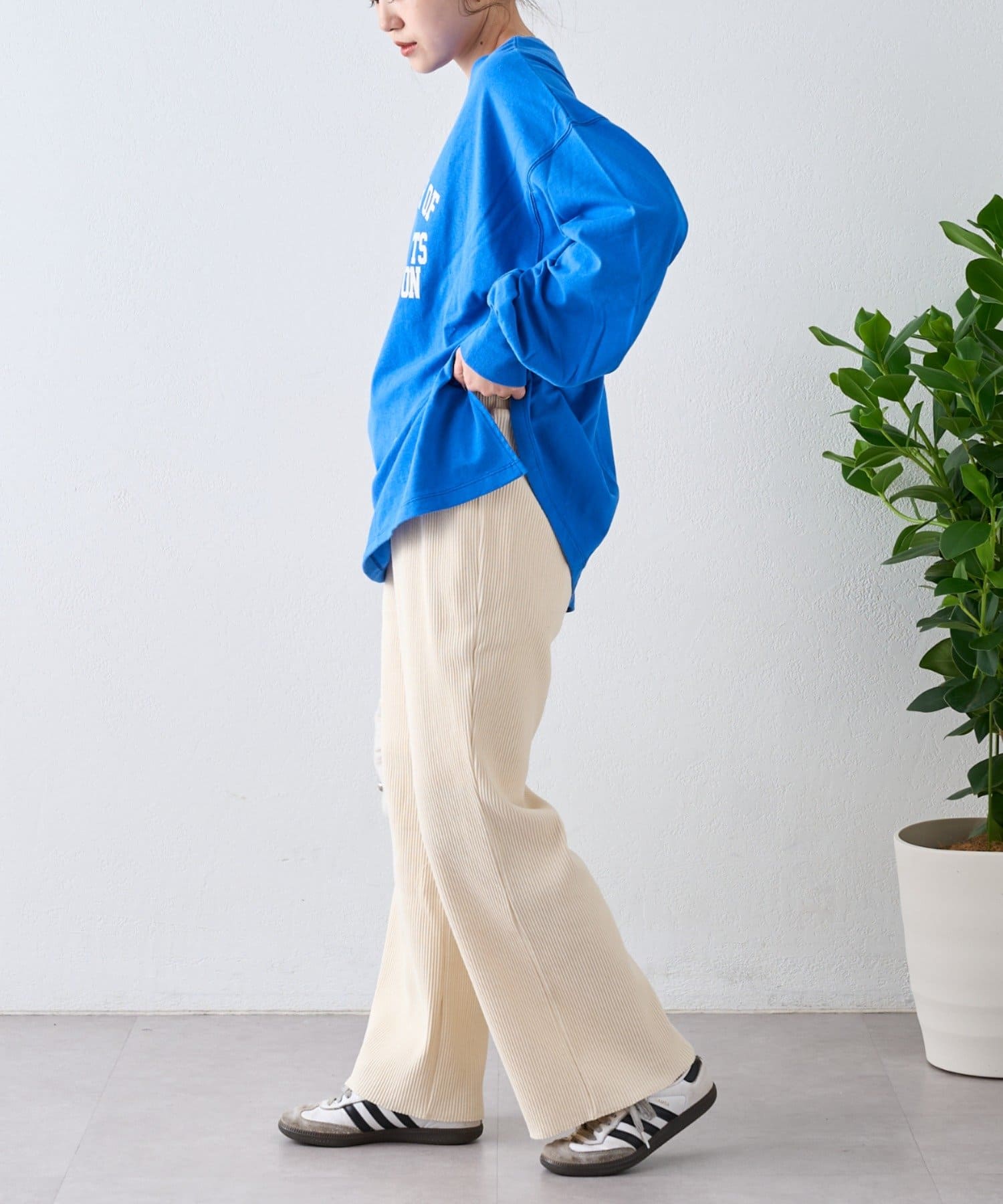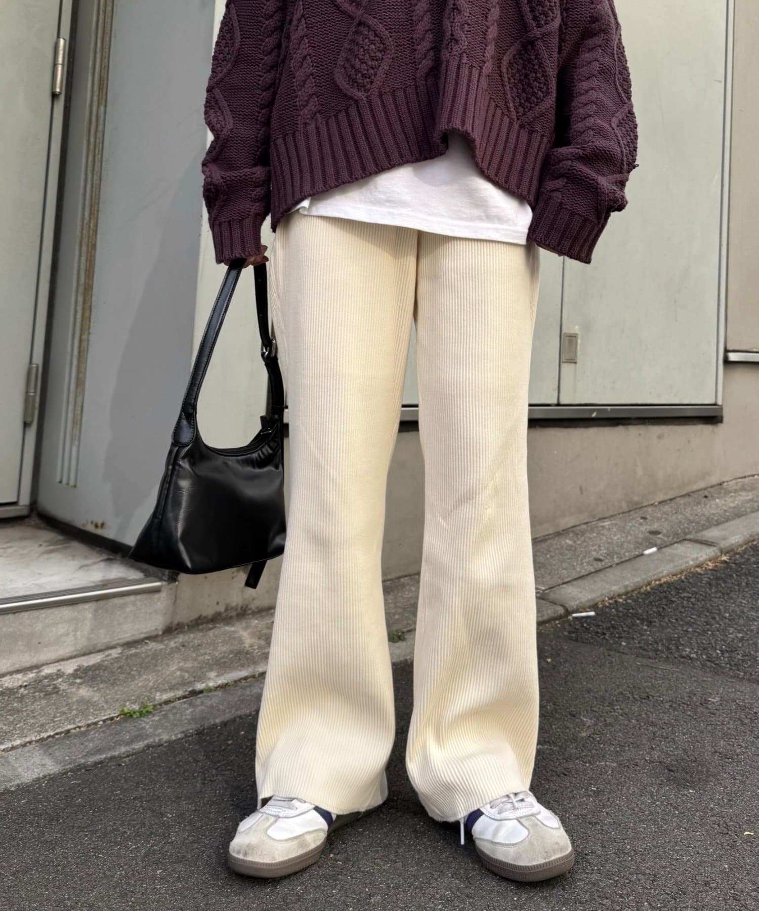 柔らかな生地にウエストゴムで、リラックスして履けるイージーパンツ仕様。