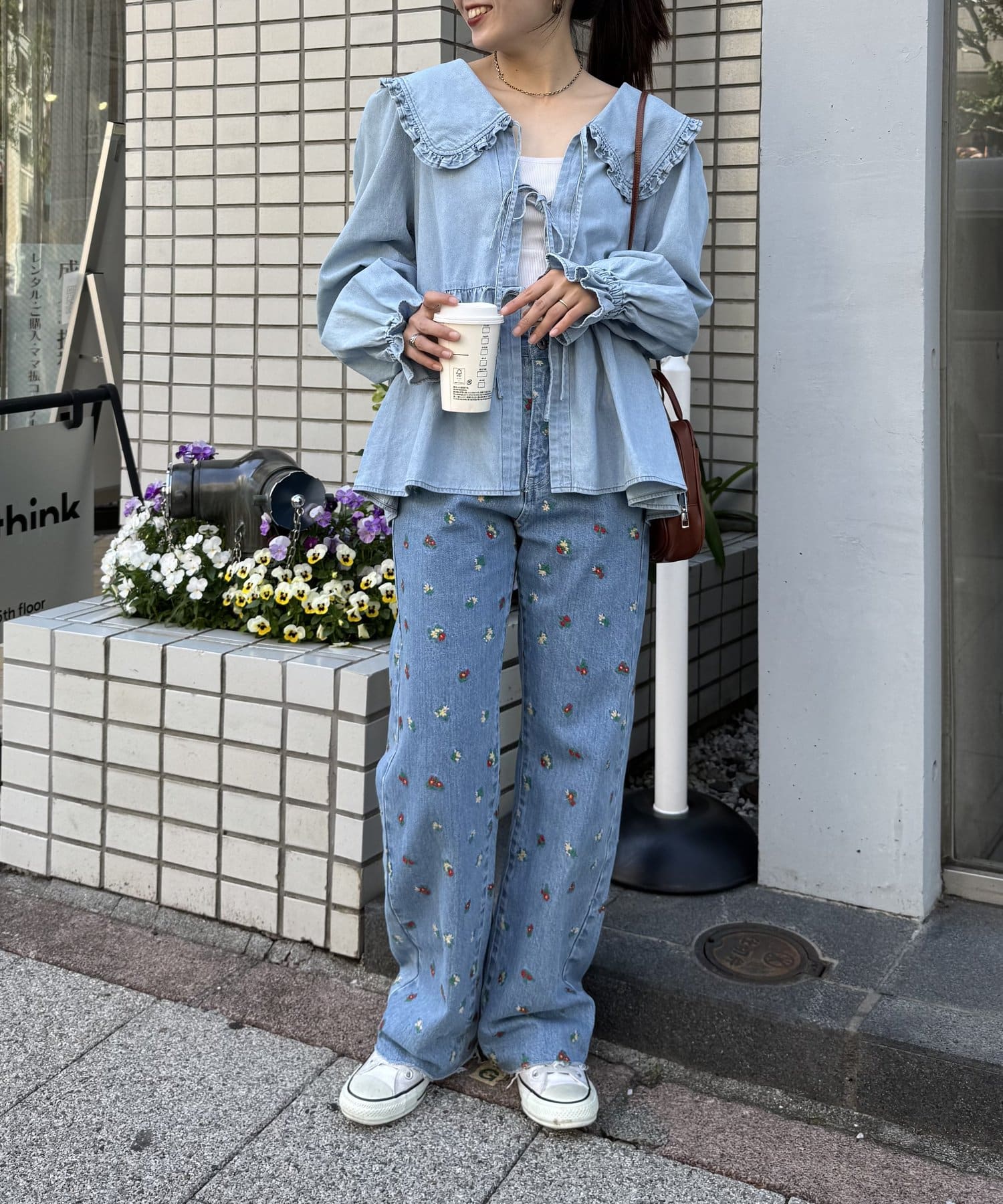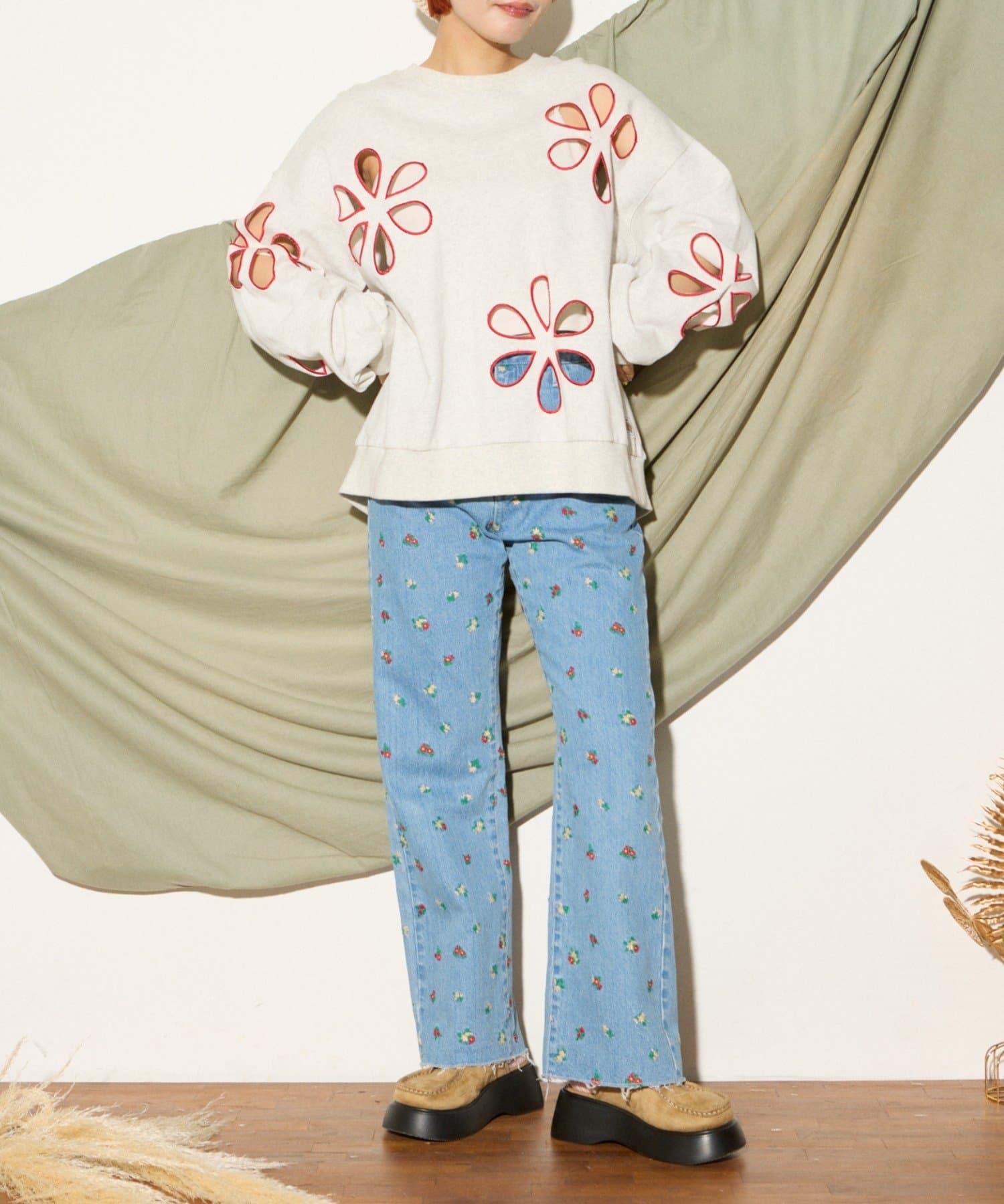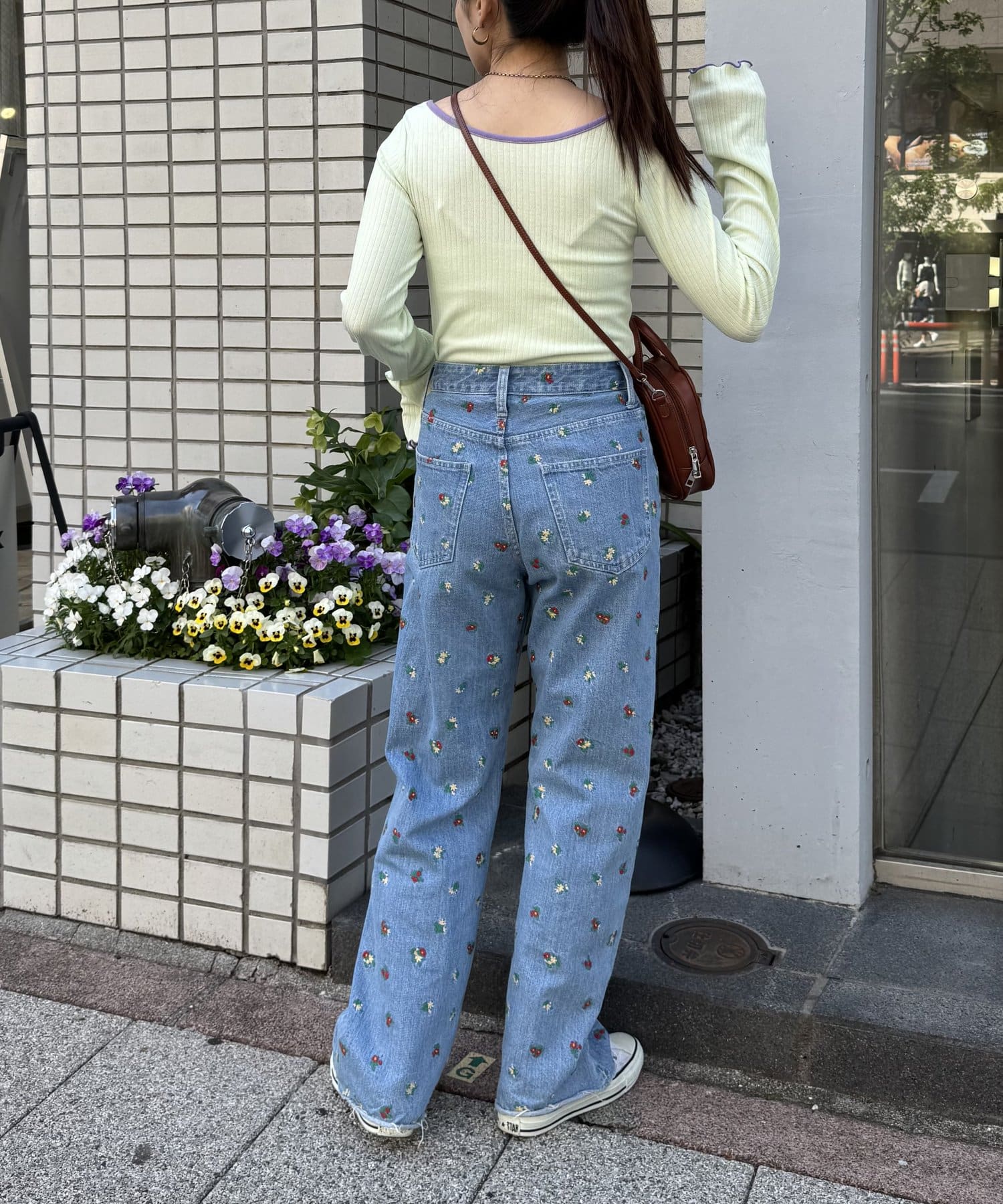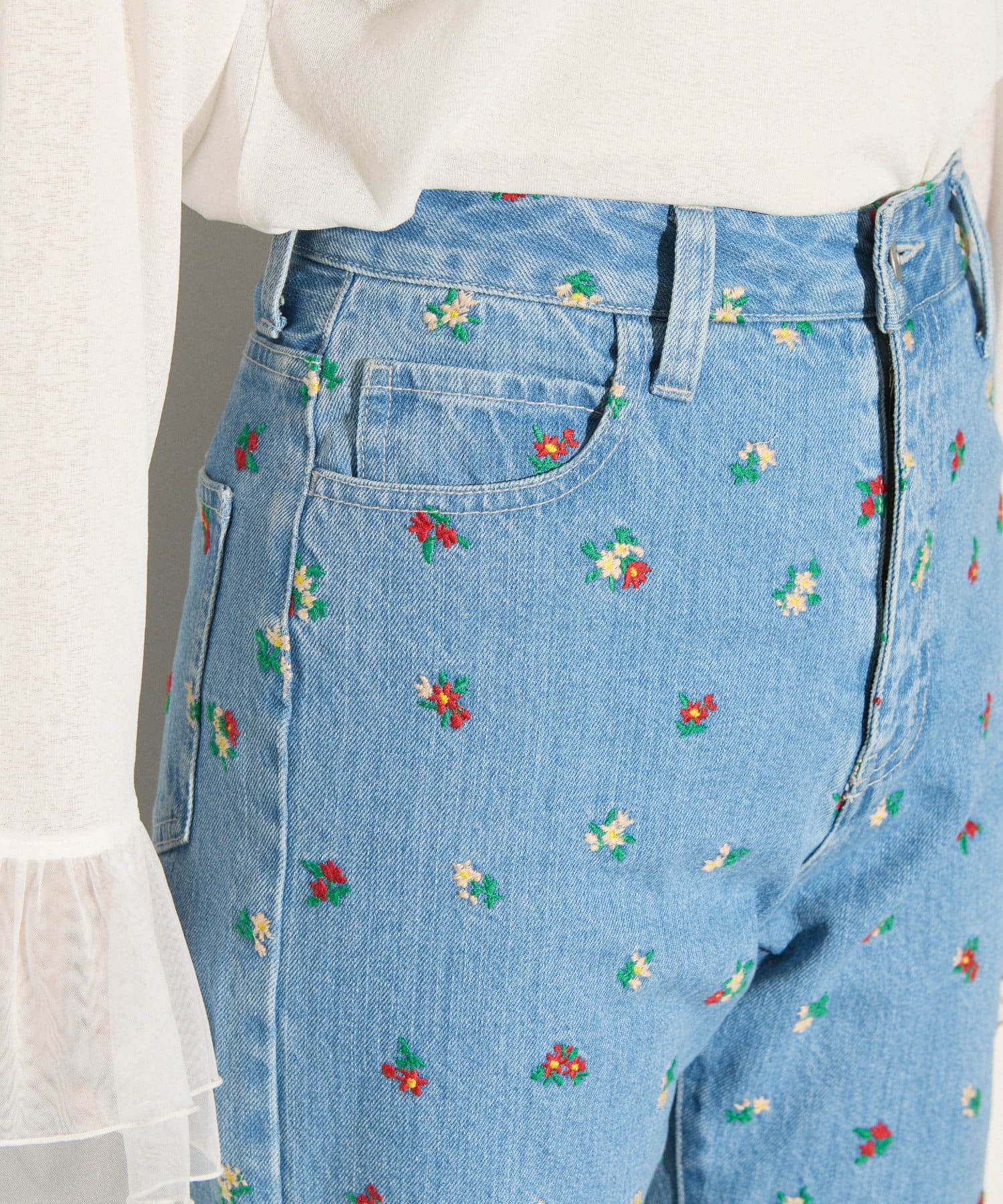ユーズド感のあるデニムに施されたフラワー刺繍が可愛らしいデニム。