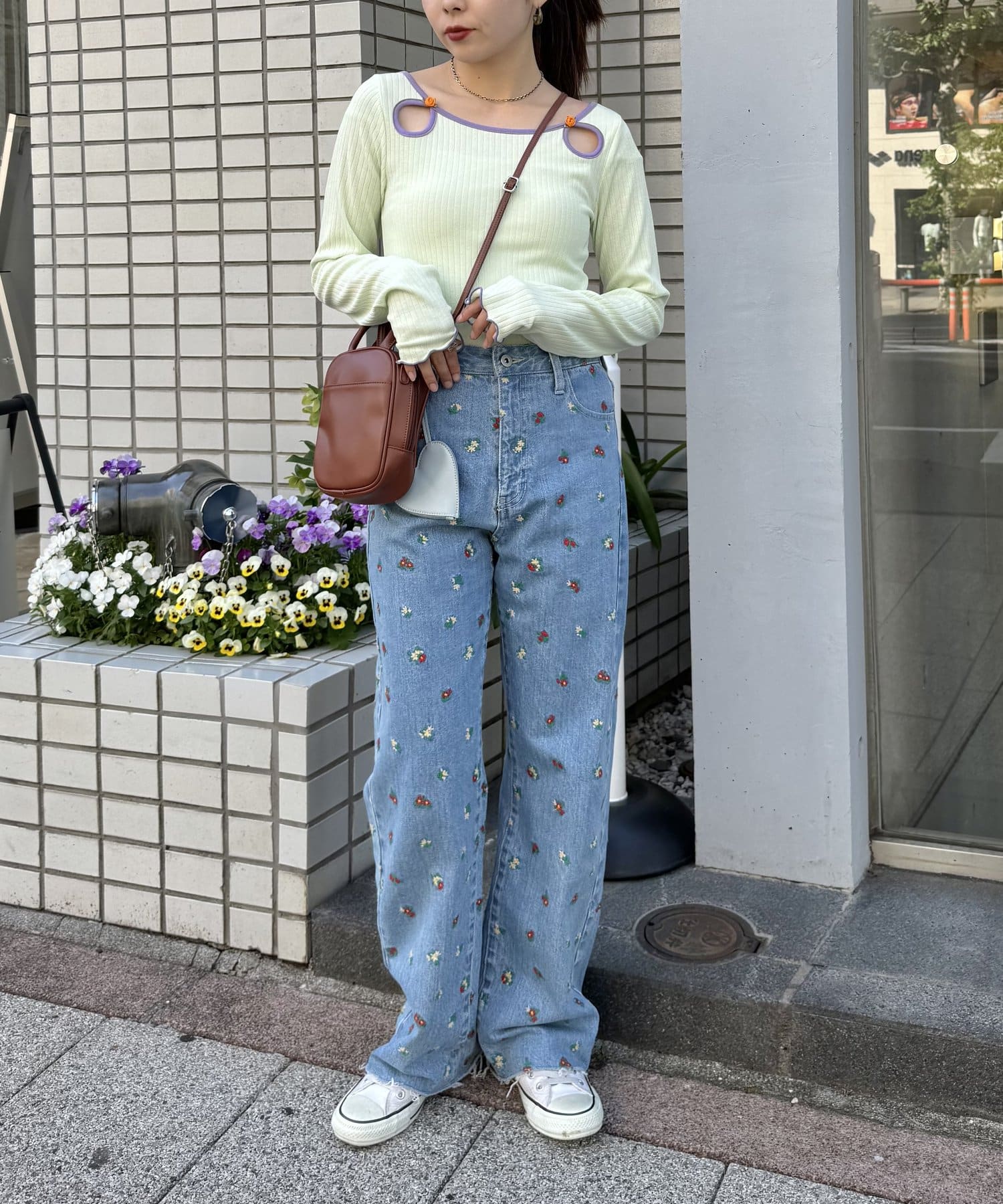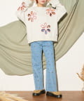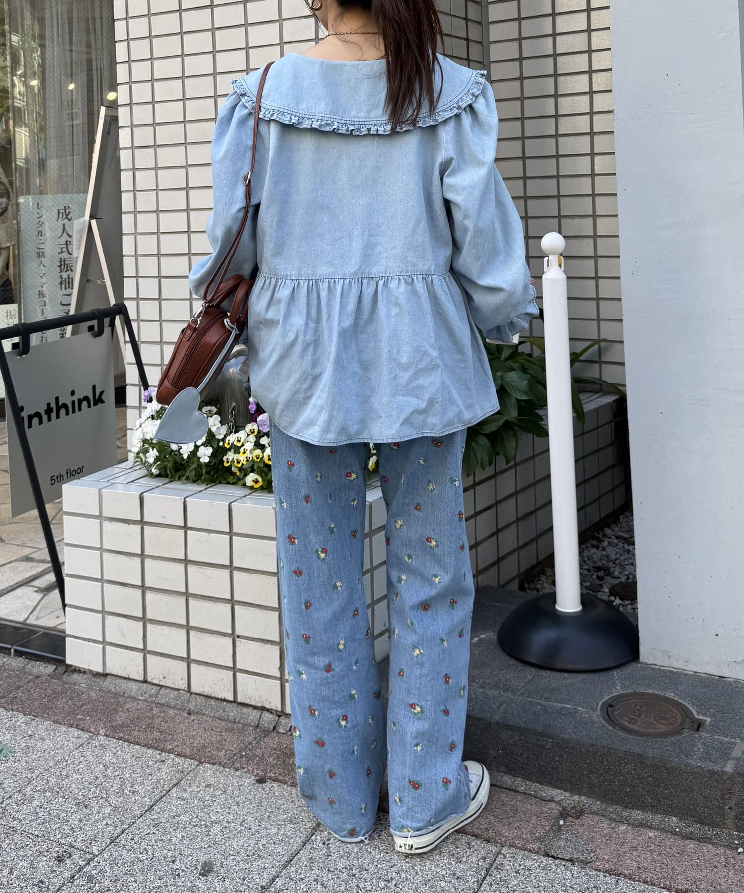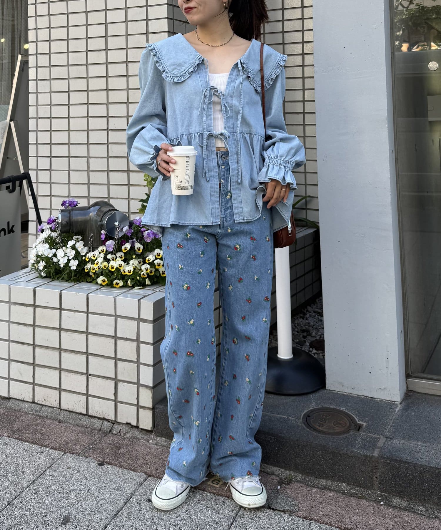 ユーズド感のあるデニムに施されたフラワー刺繍が可愛らしいデニム。