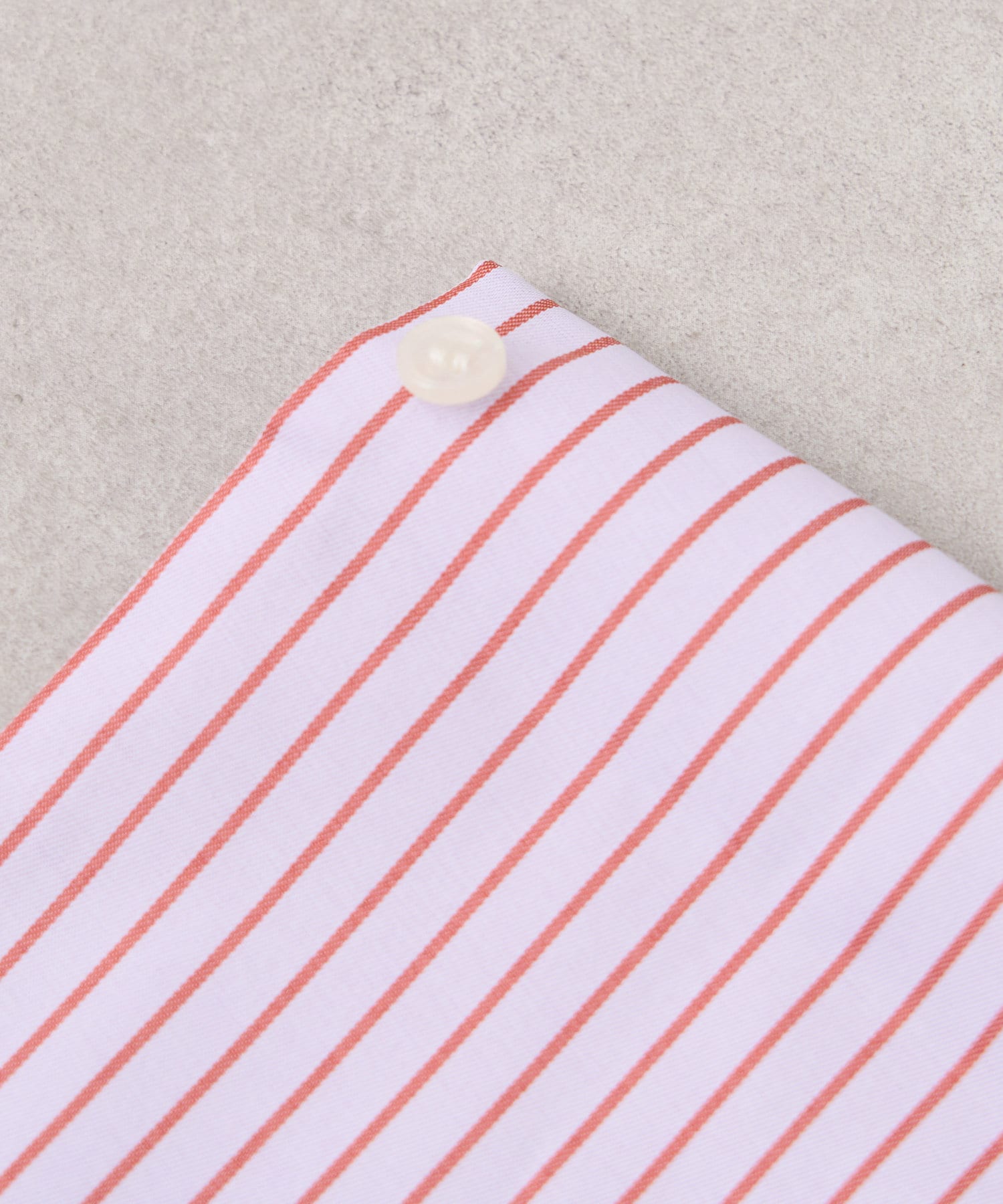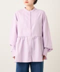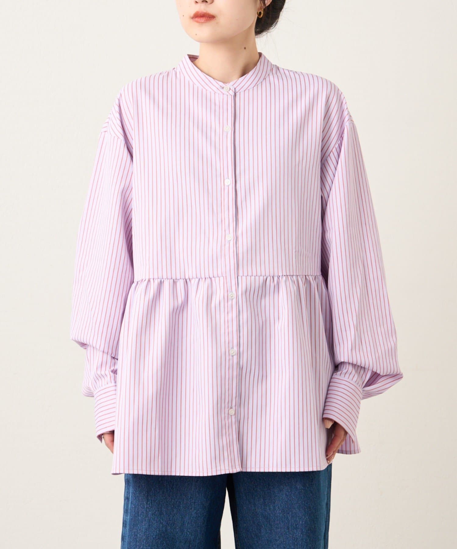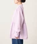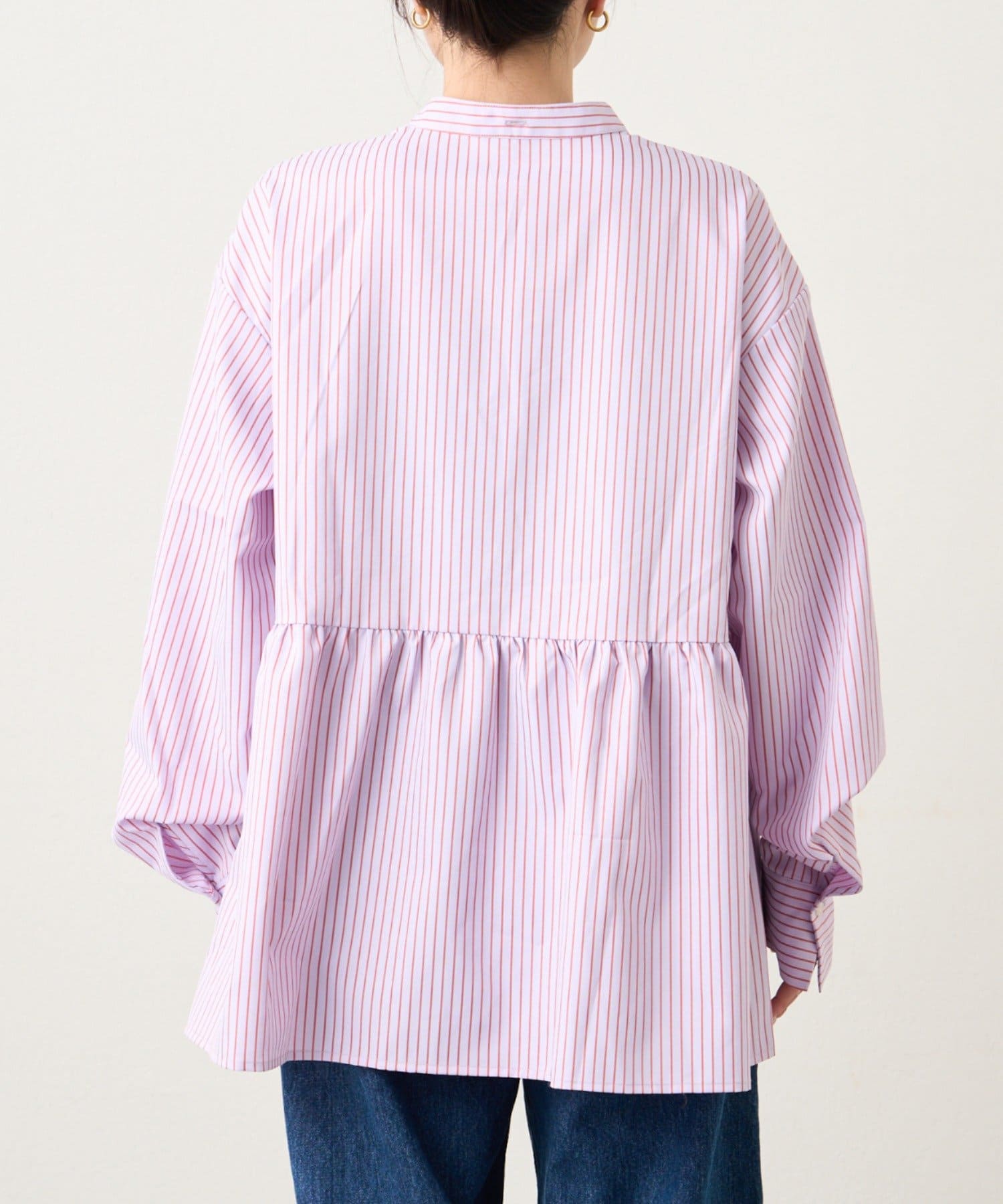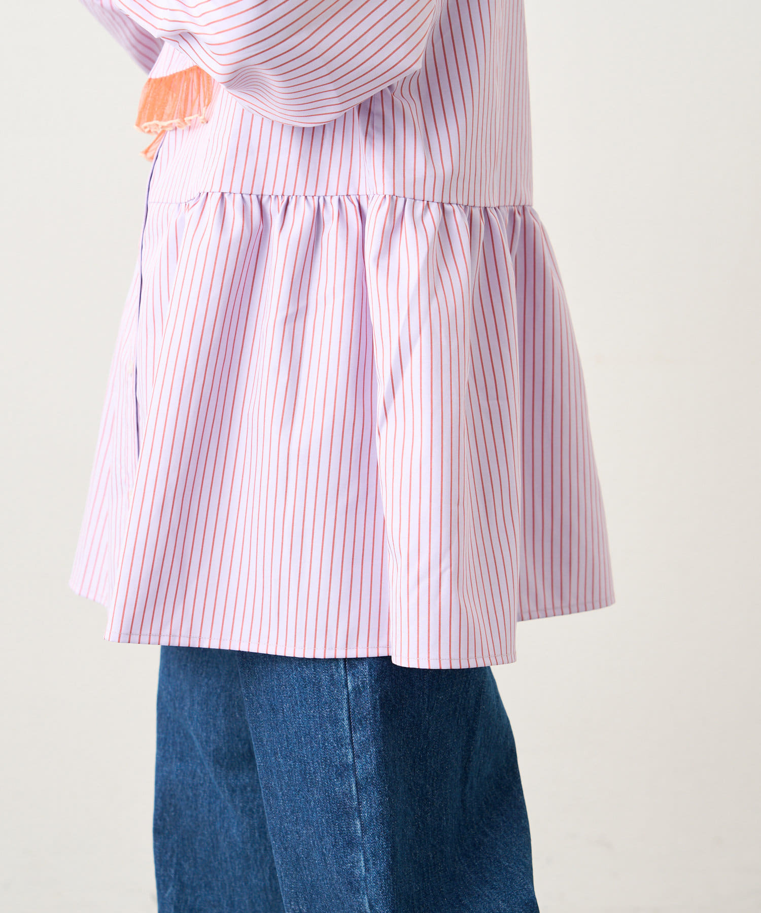 お尻まで隠れる丈が嬉しいストライプシャツ。ウエスト部分の切り替えデザインで、一枚で着ても様になります。