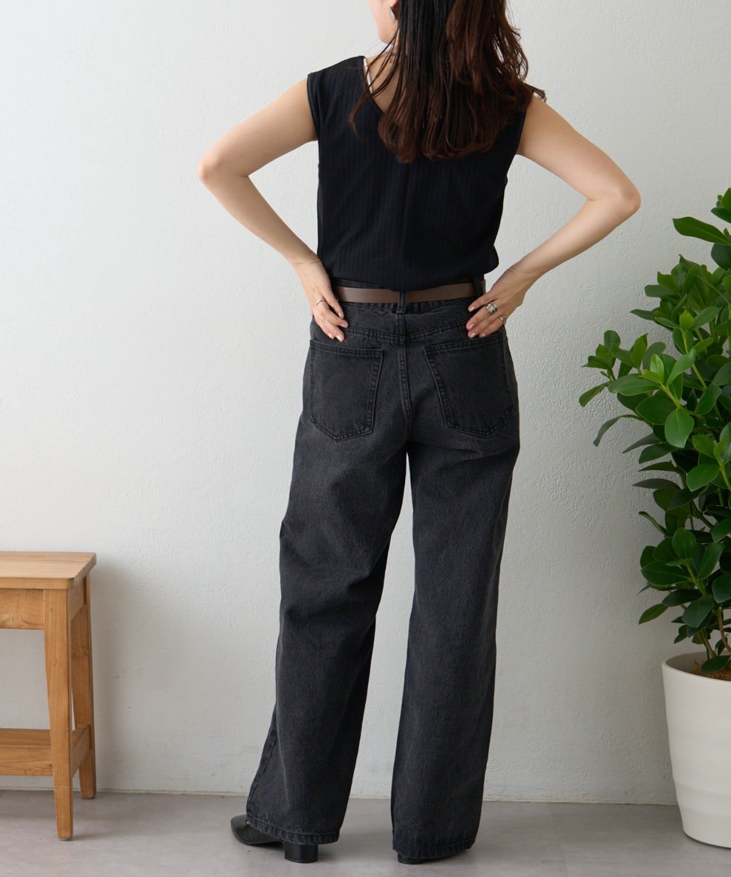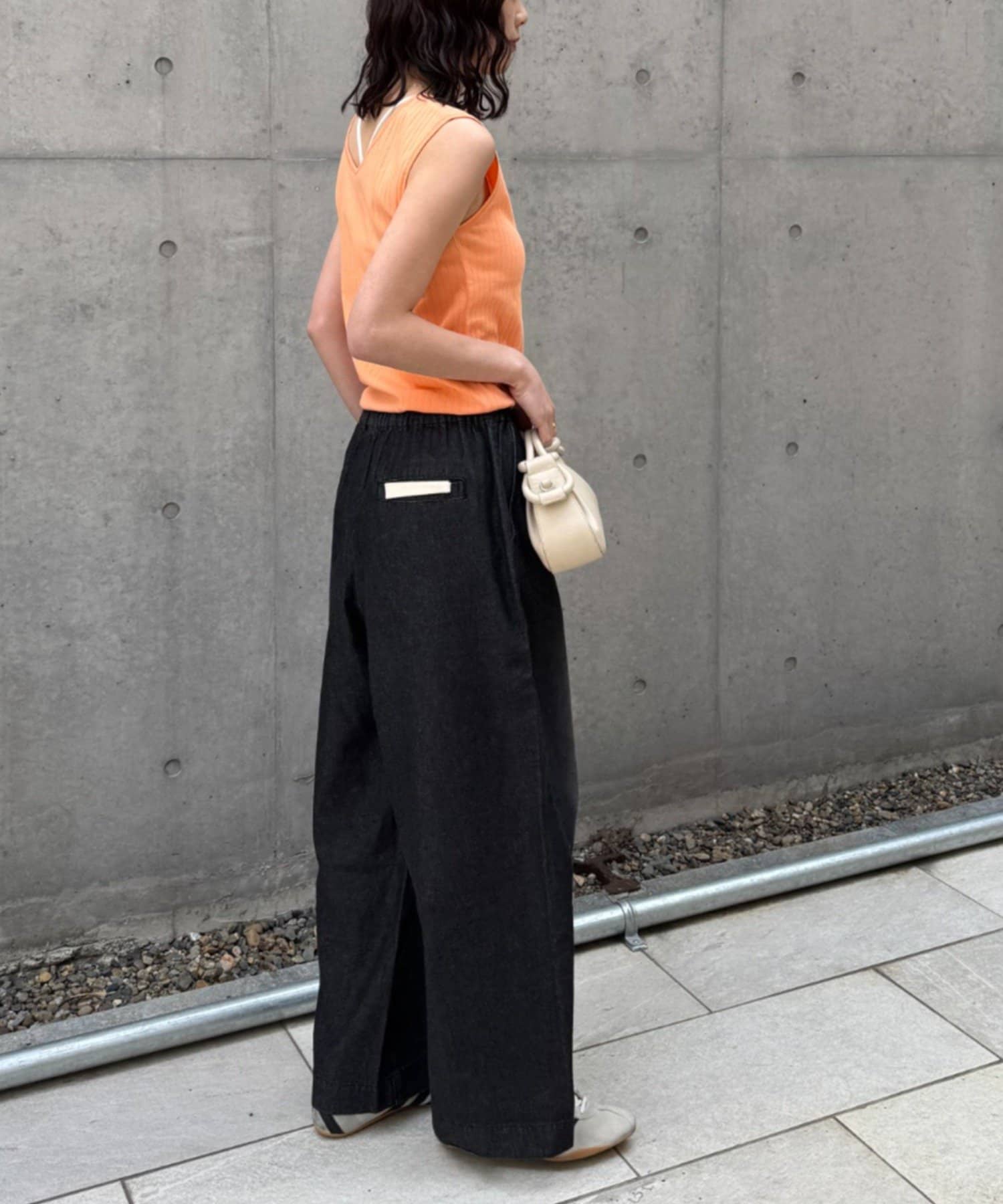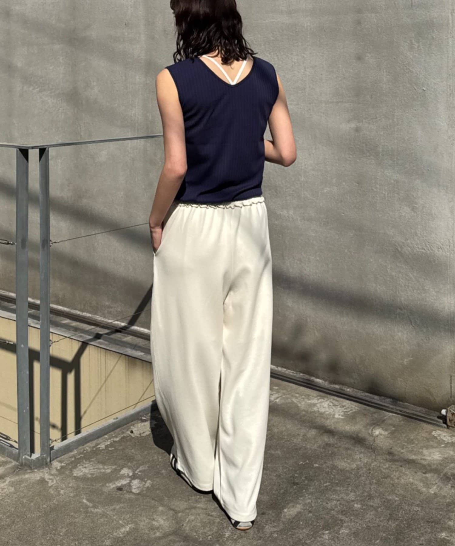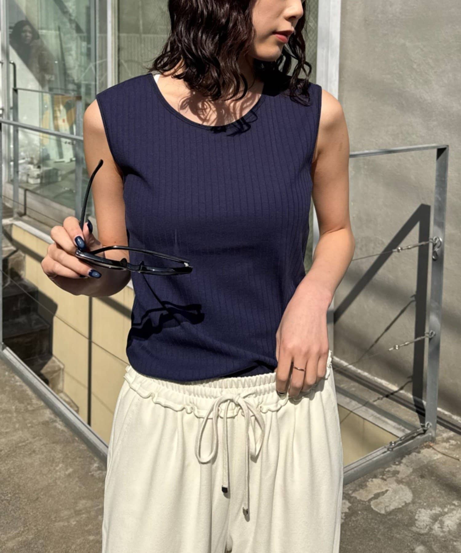 リブ素材で体に程よくフィットし、縦のラインを強調してくれるのですっきり見えシルエットに。