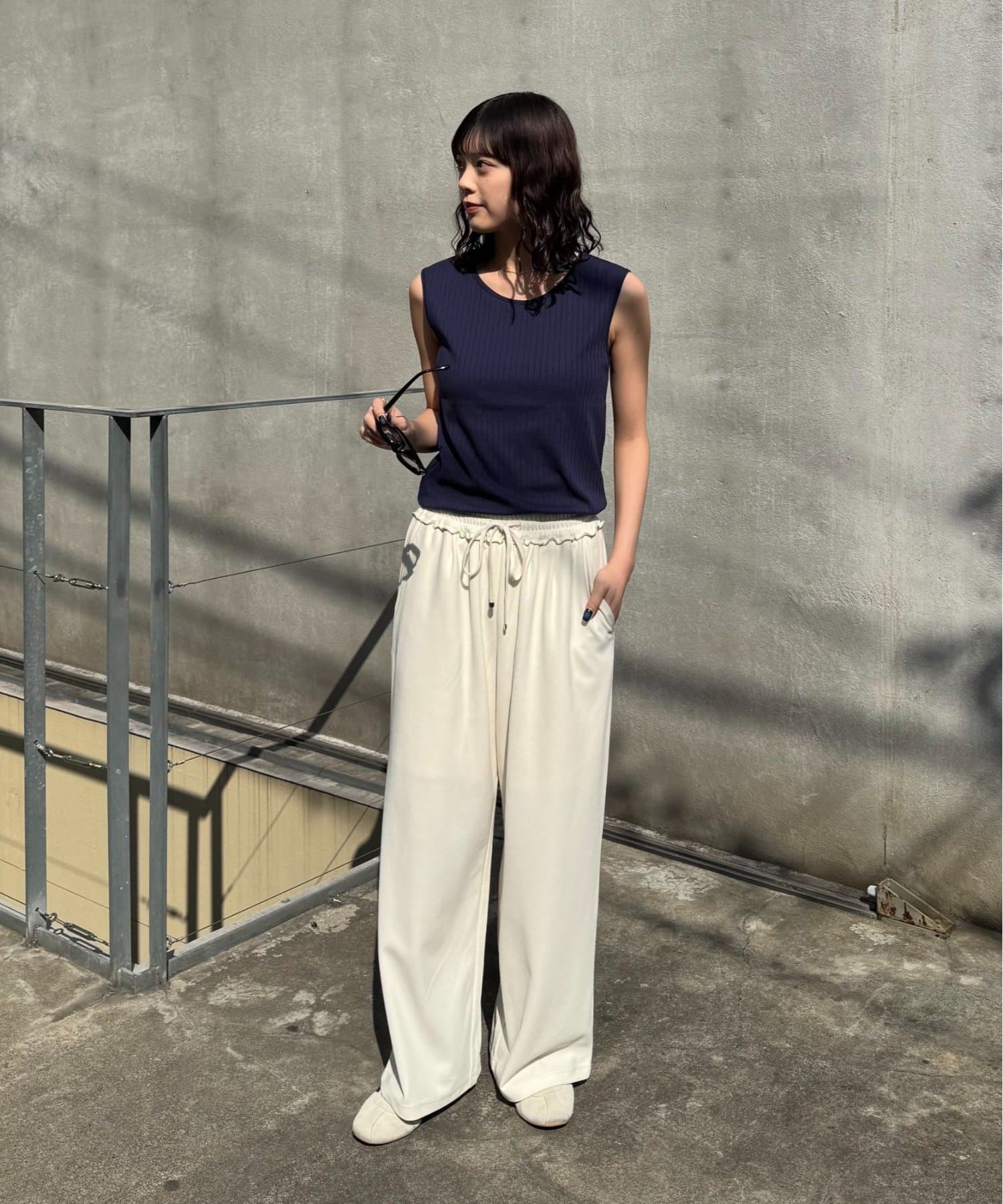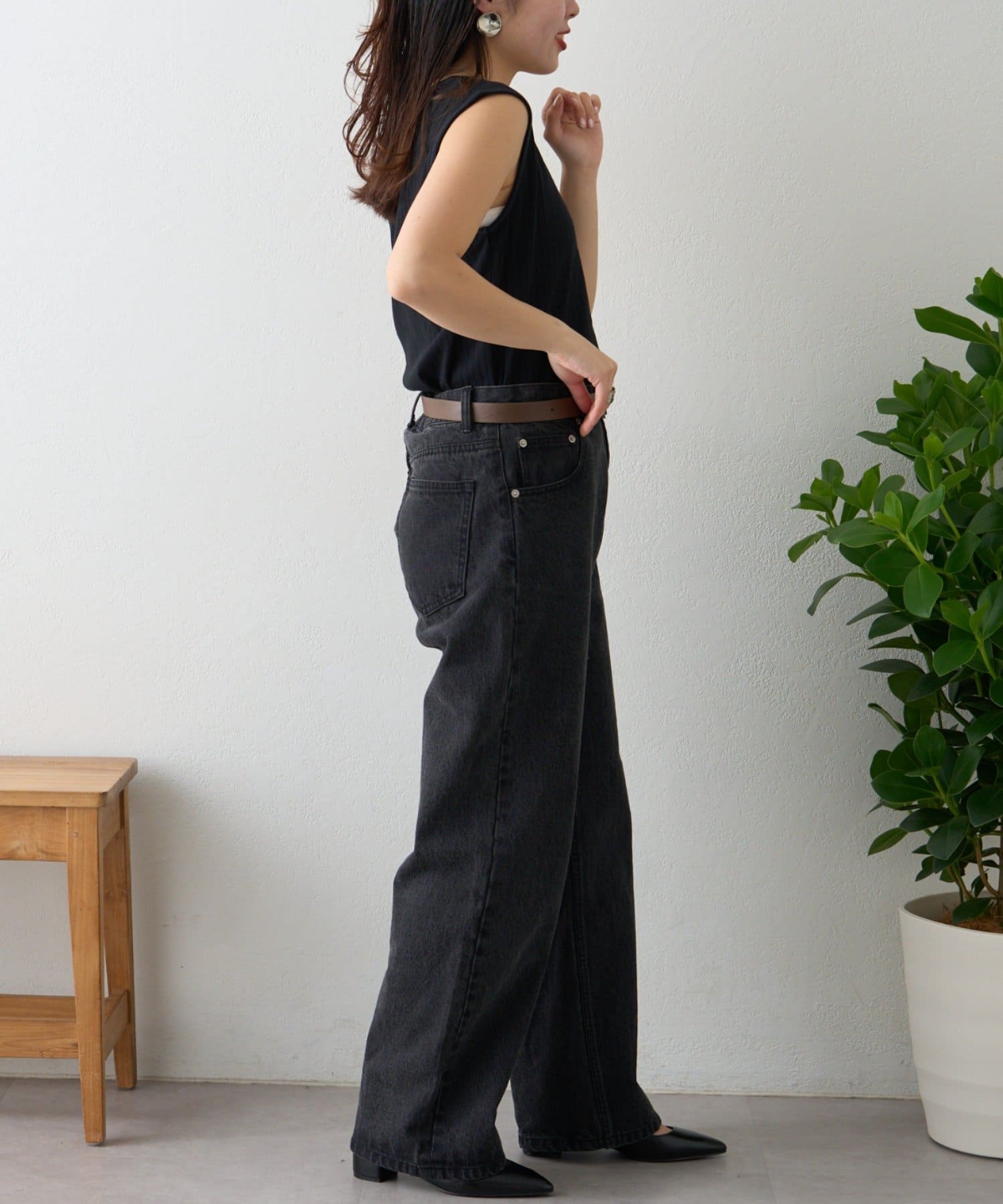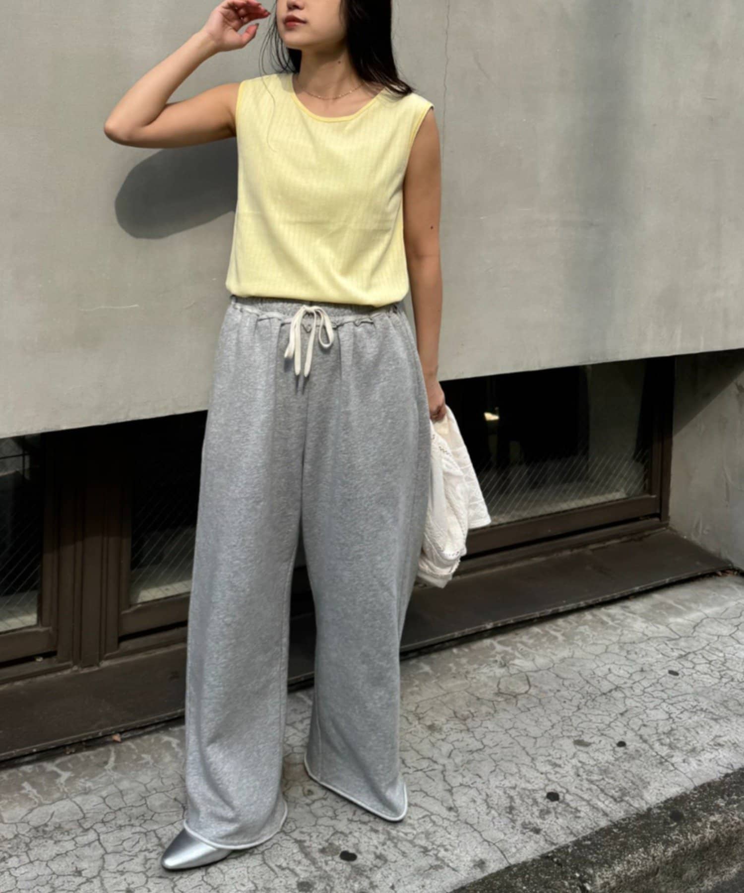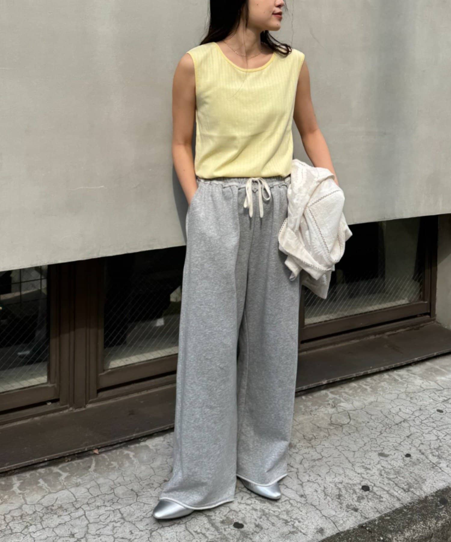 リブ素材で体に程よくフィットし、縦のラインを強調してくれるのですっきり見えシルエットに。