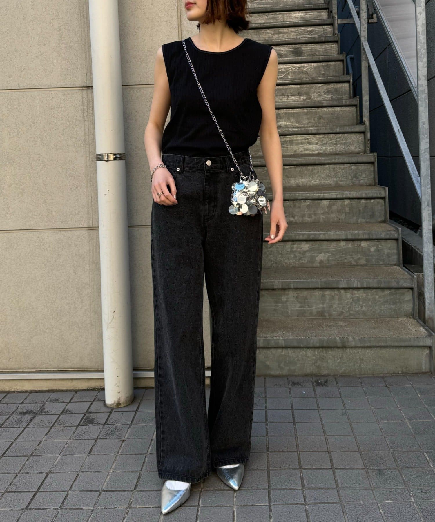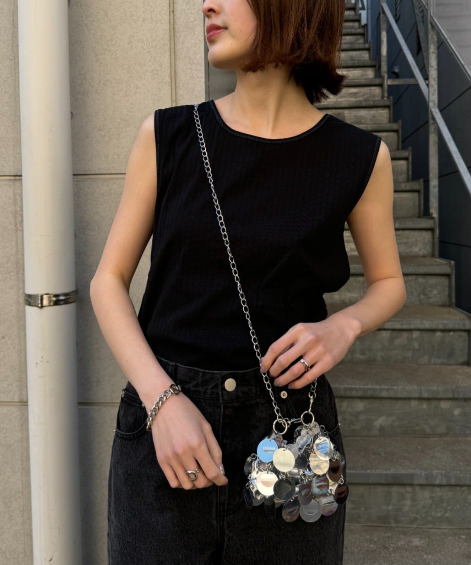 シンプルになりがちなインナーも、配色ステッチがあることでコーデのポイントになってくれます。