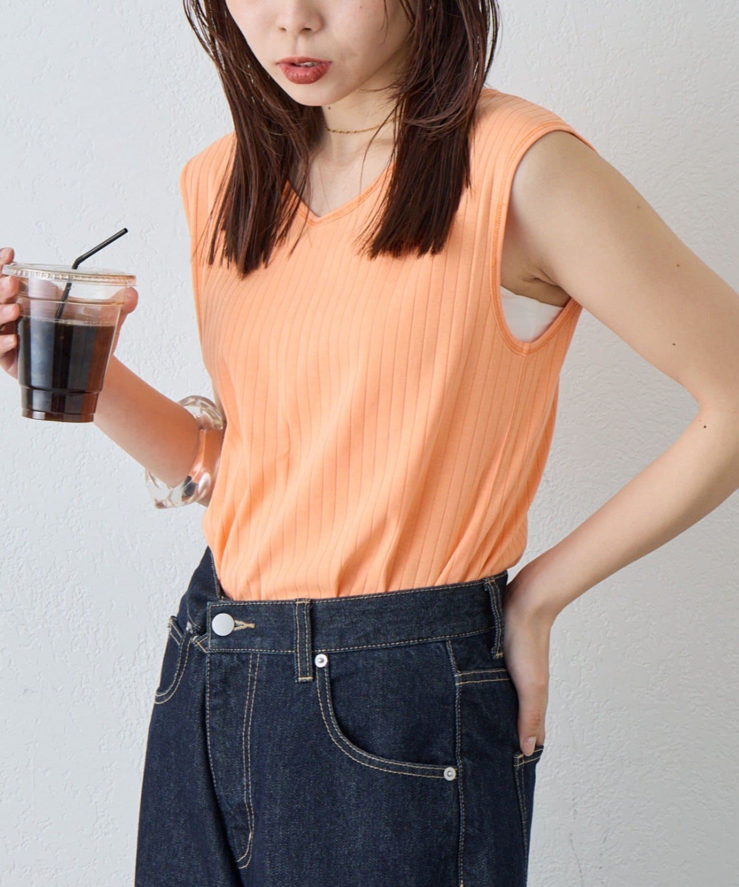 購入場所:パルクローゼットホワイト、オレンジの2色買いをしました!2wayになっていて服装に合わせてVネックにもできるのがいいです。ホワイトは透け感が気になっていましたが、思ったより透けずに着れそうです。