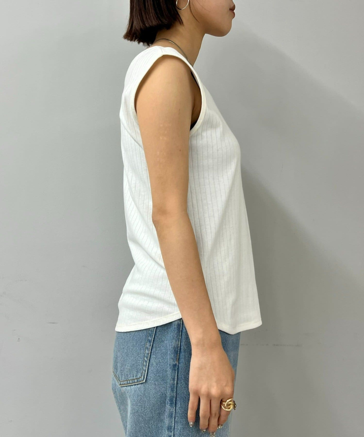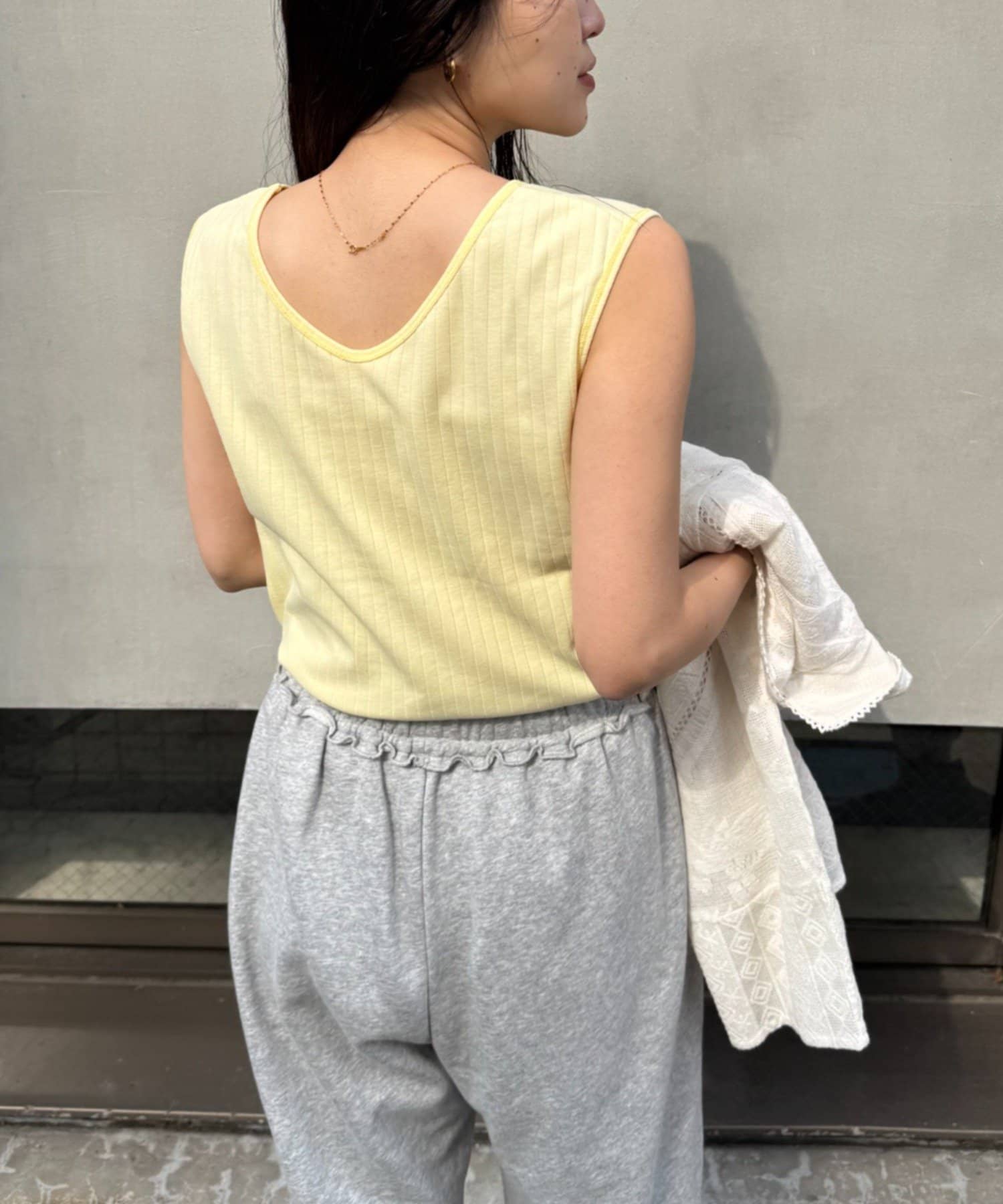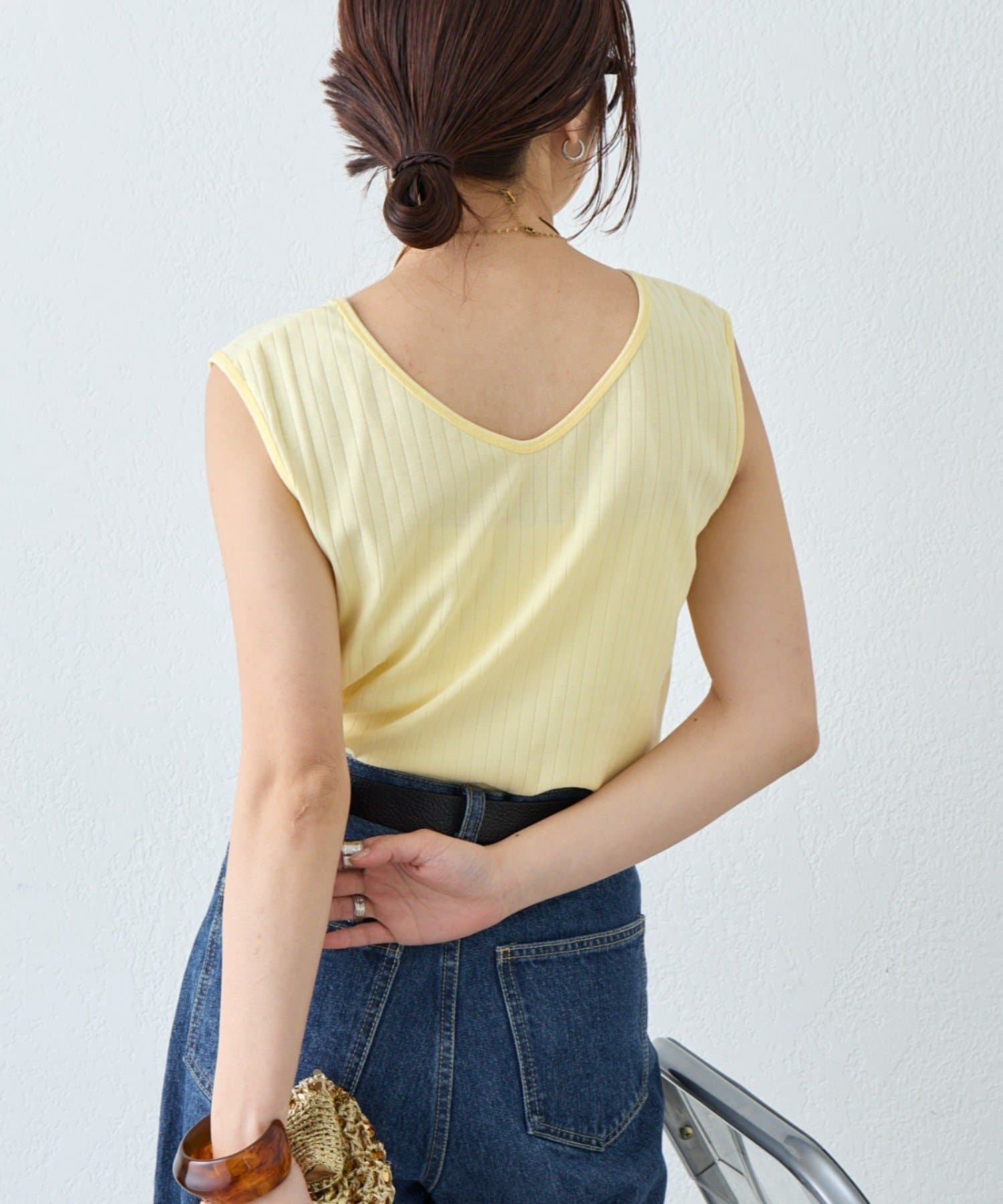 Vネックとクルーネックの前後2WAYで着用いただける便利なタンクトップ。