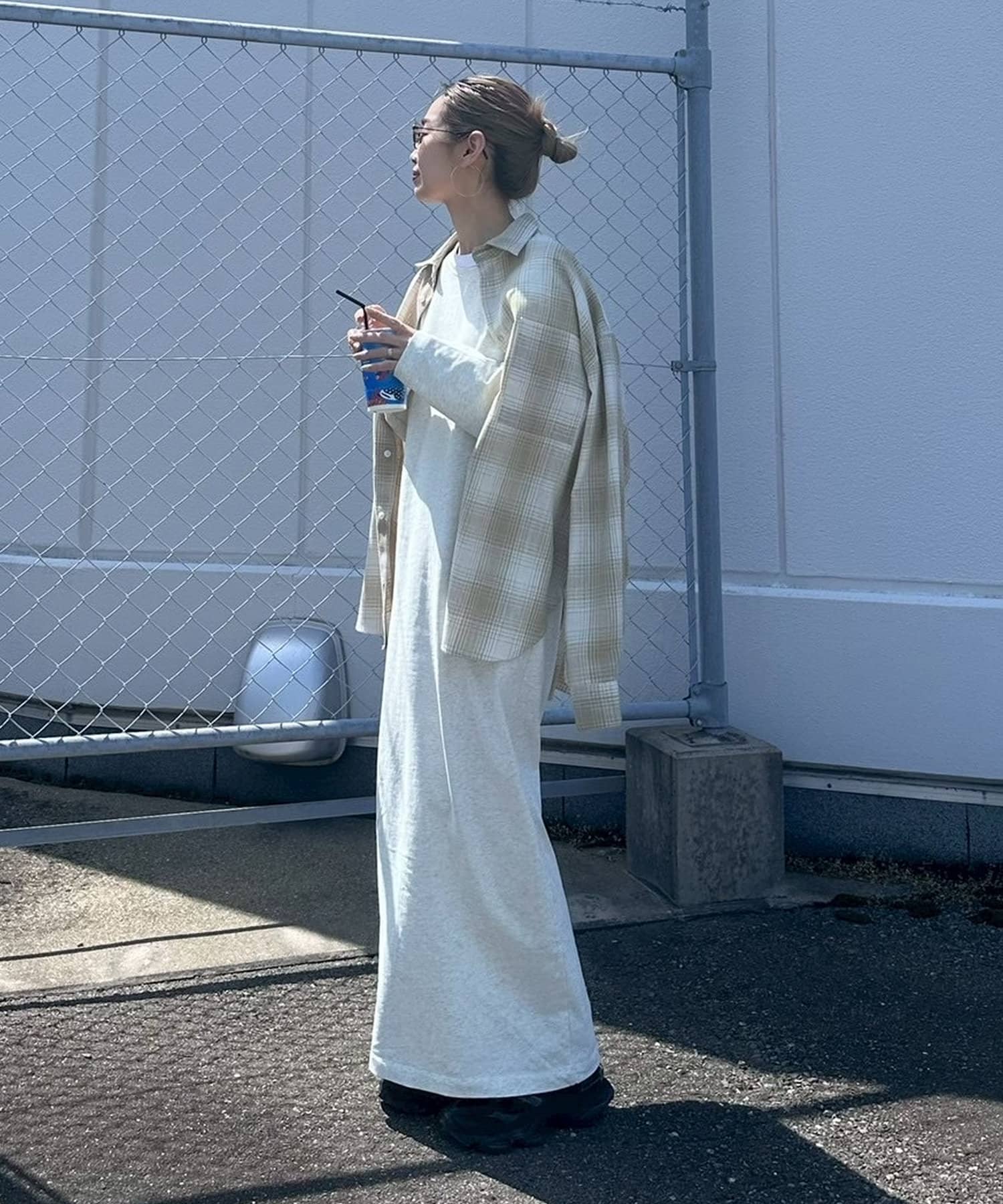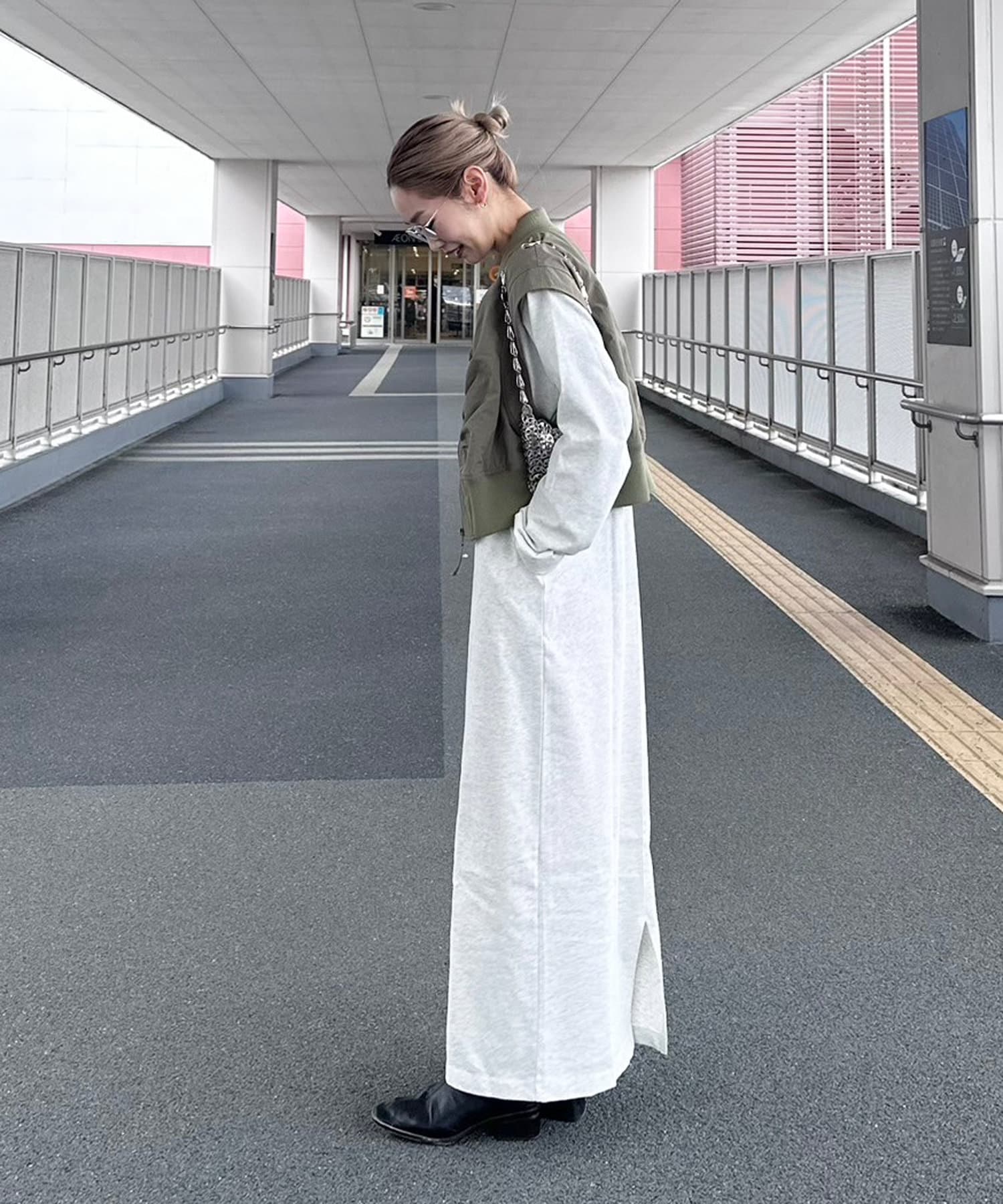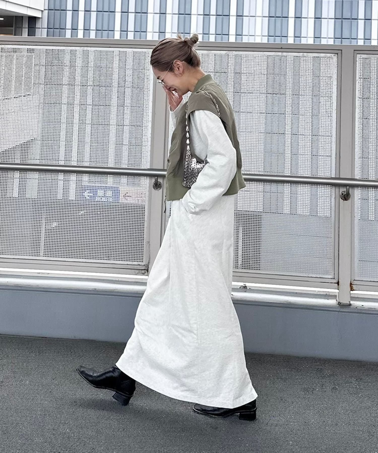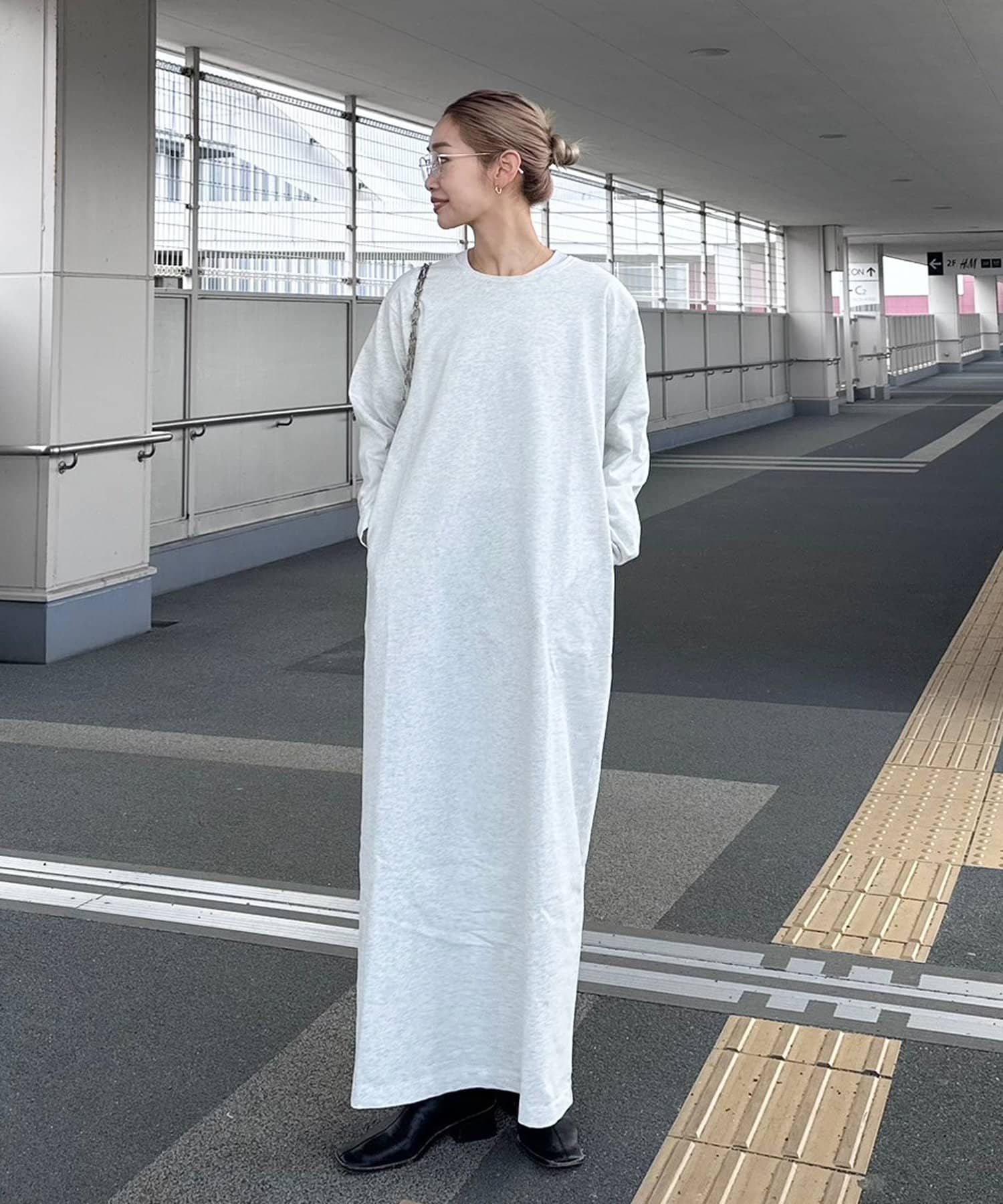 シンプルなのでいろんなアレンジ、レイヤードができる万能マキシ丈ワンピース。