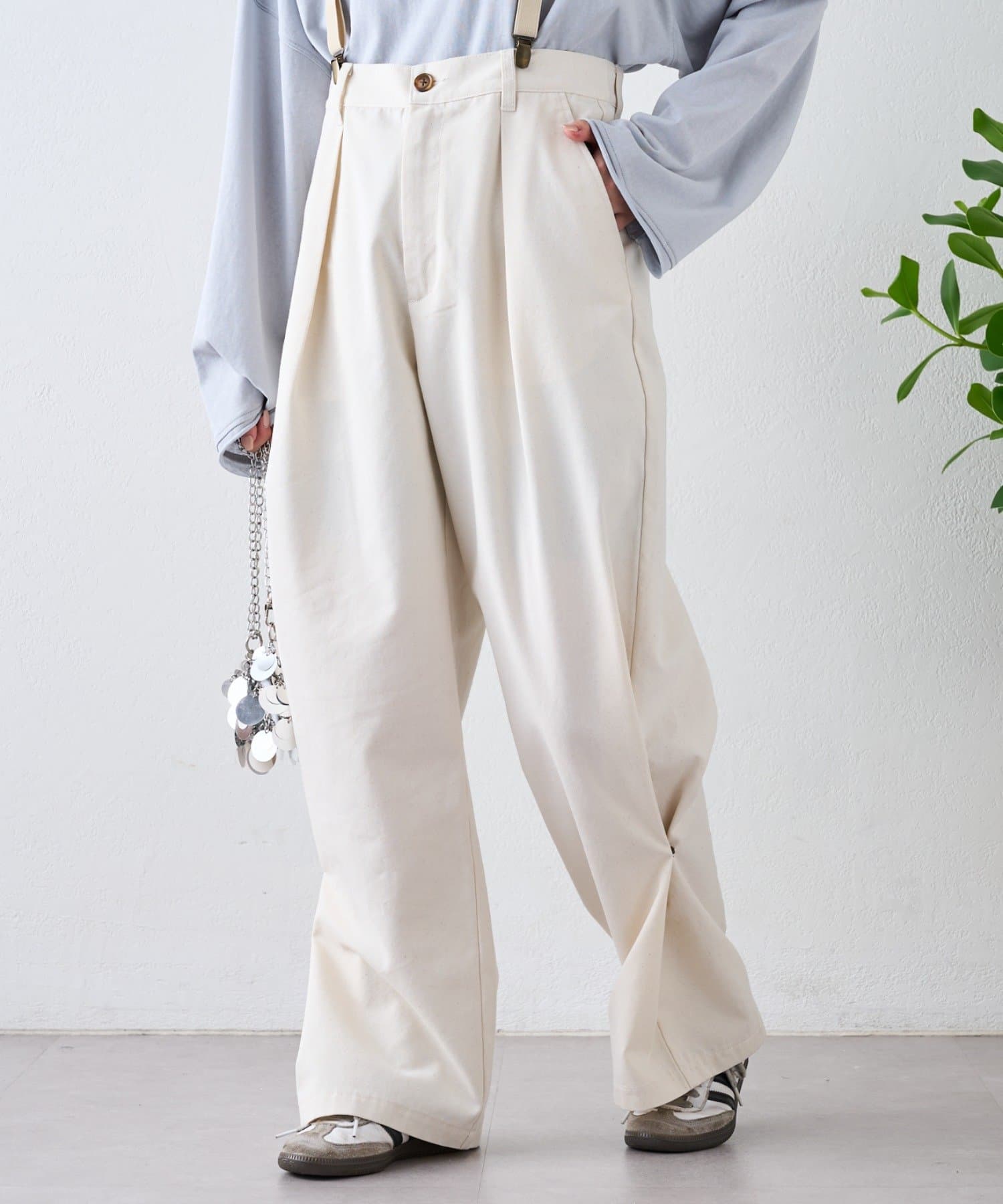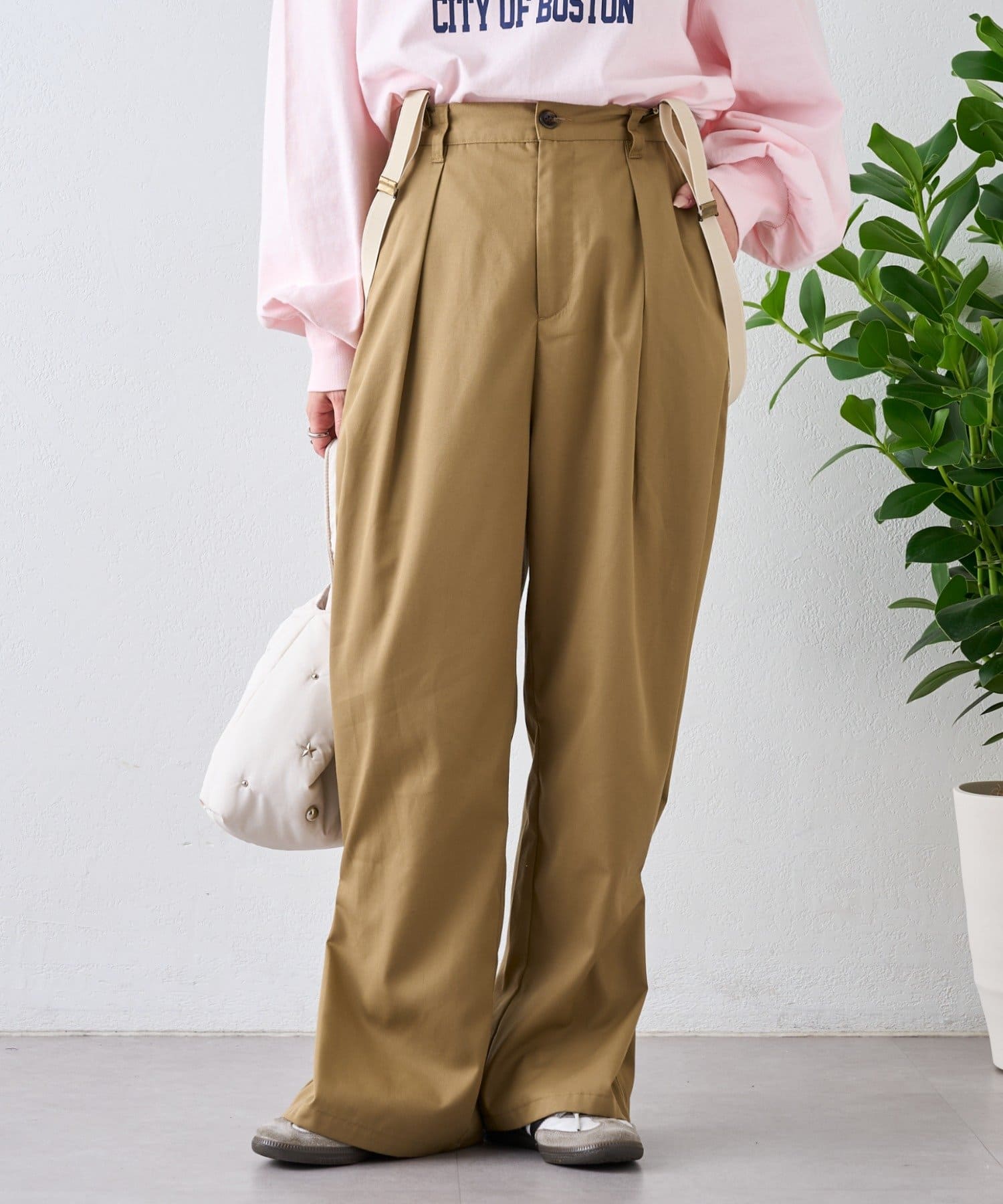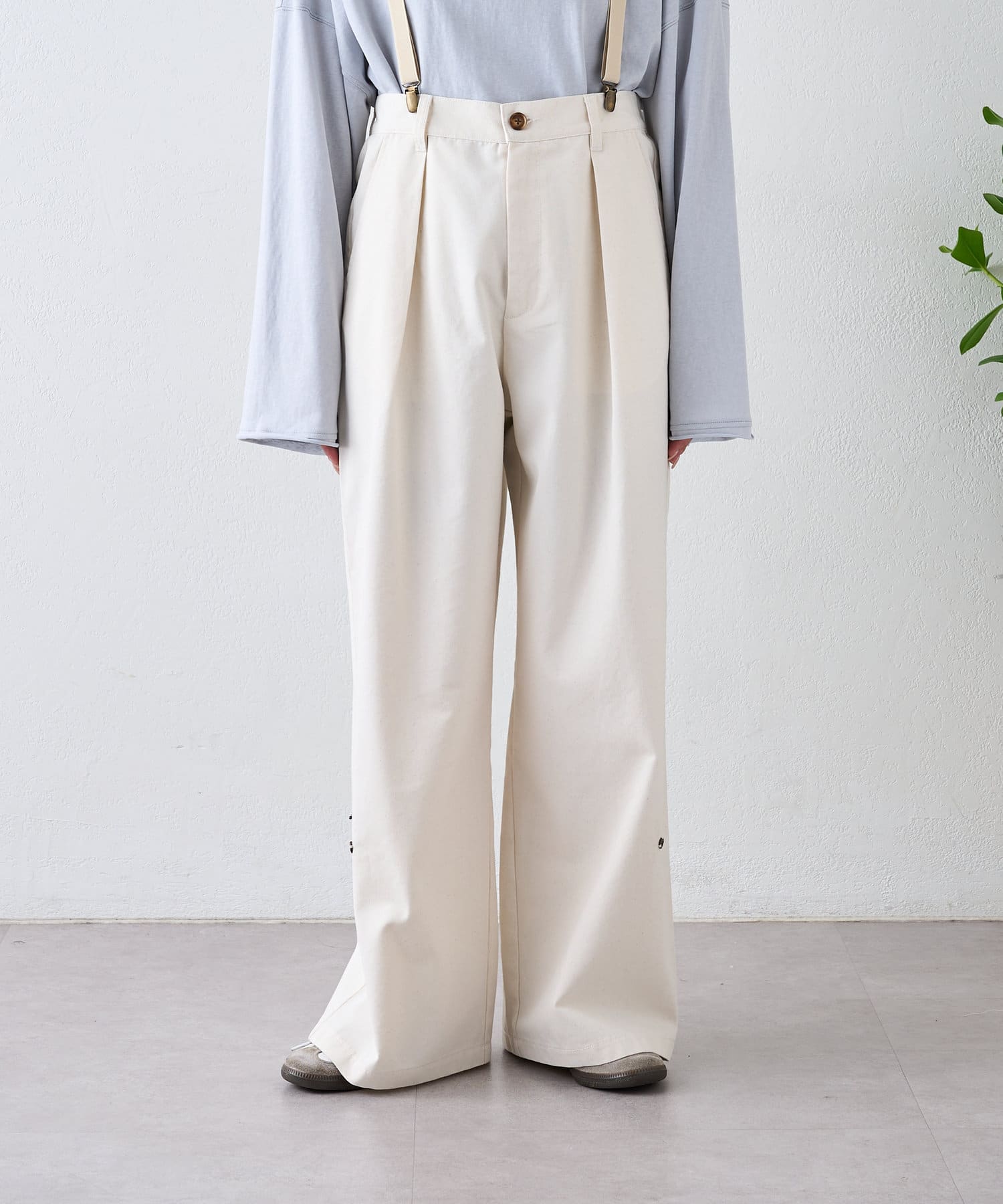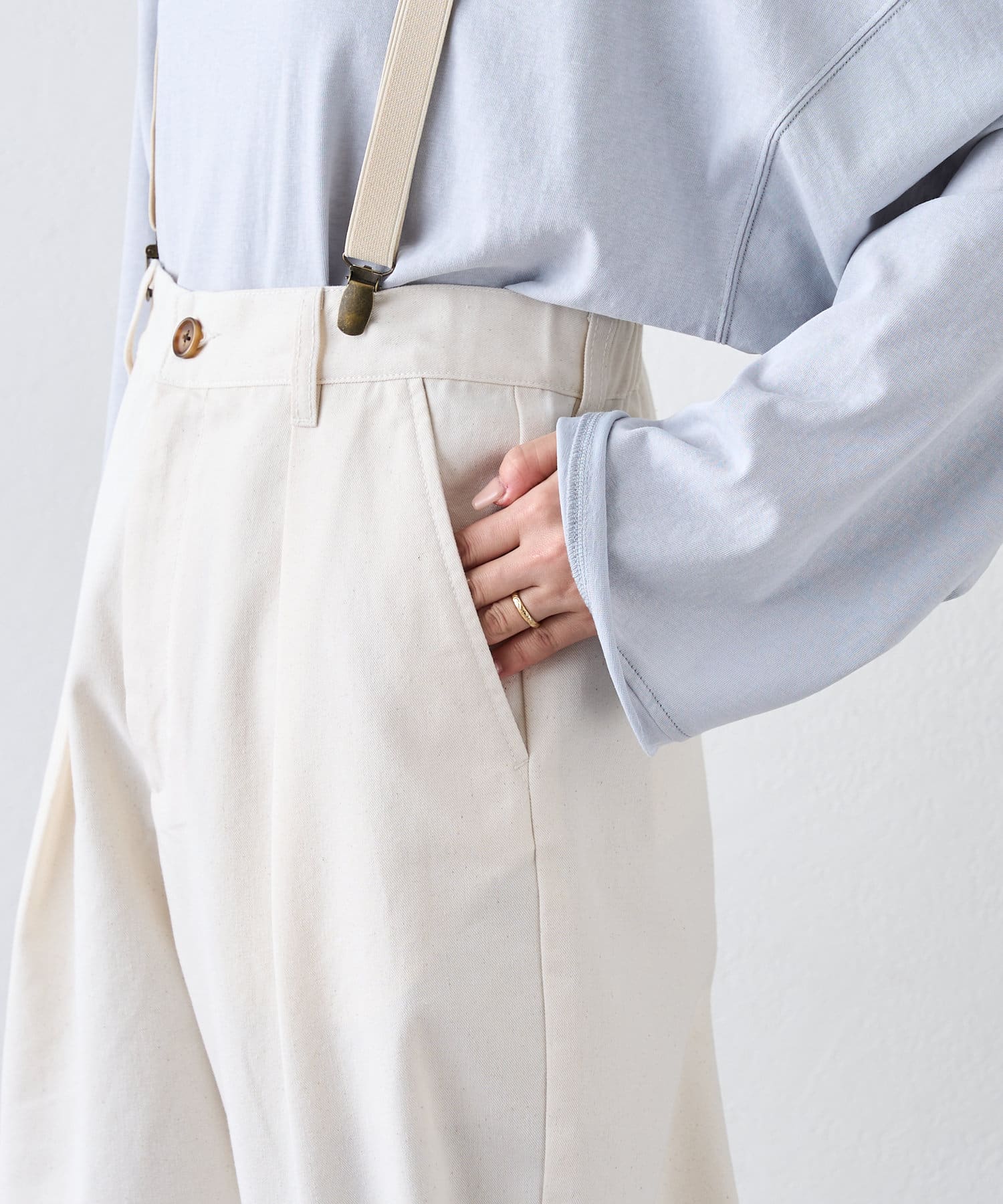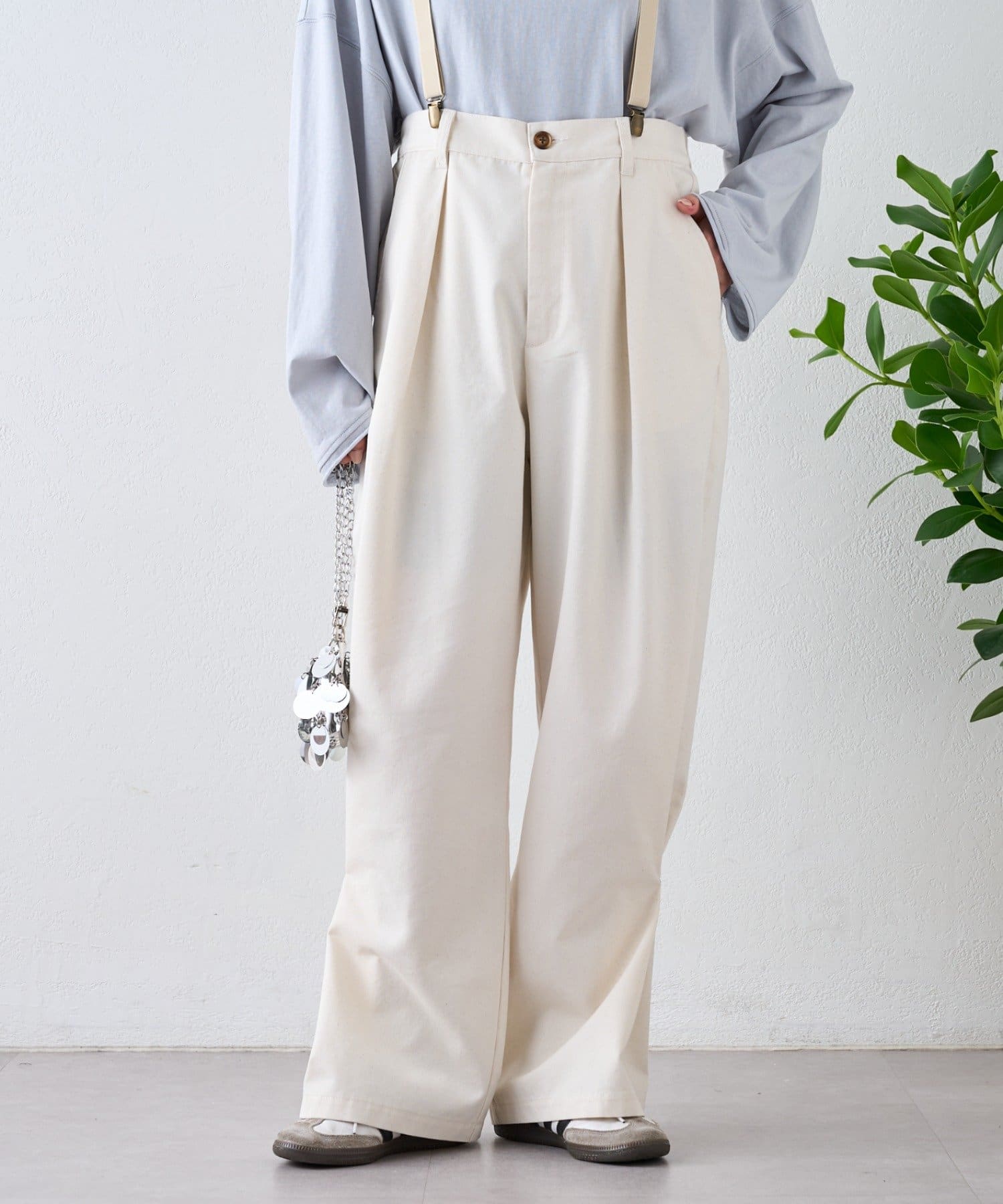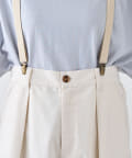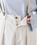 サイドボタンやサスペンダー次第で、コーデの幅が広がるパンツ。