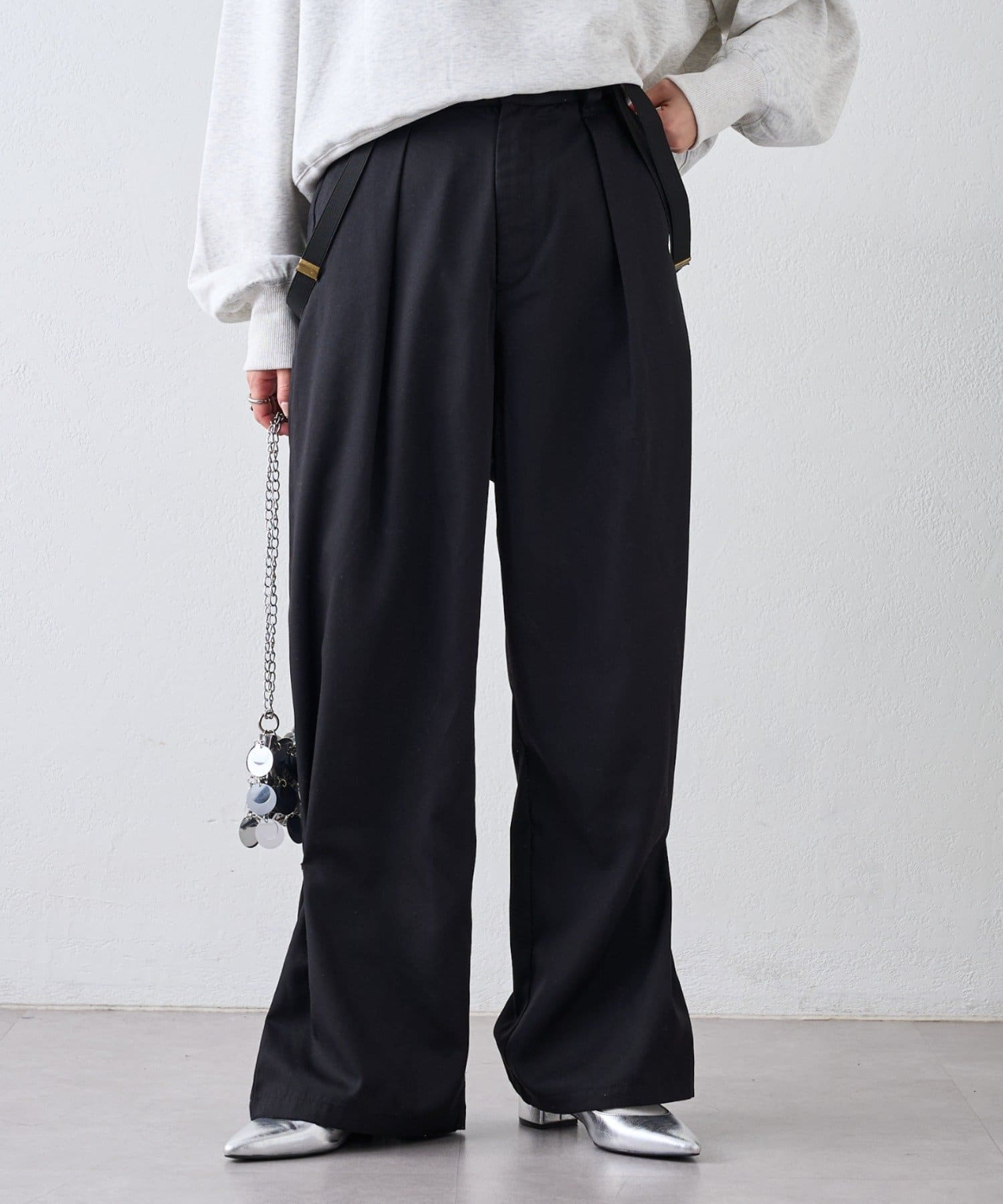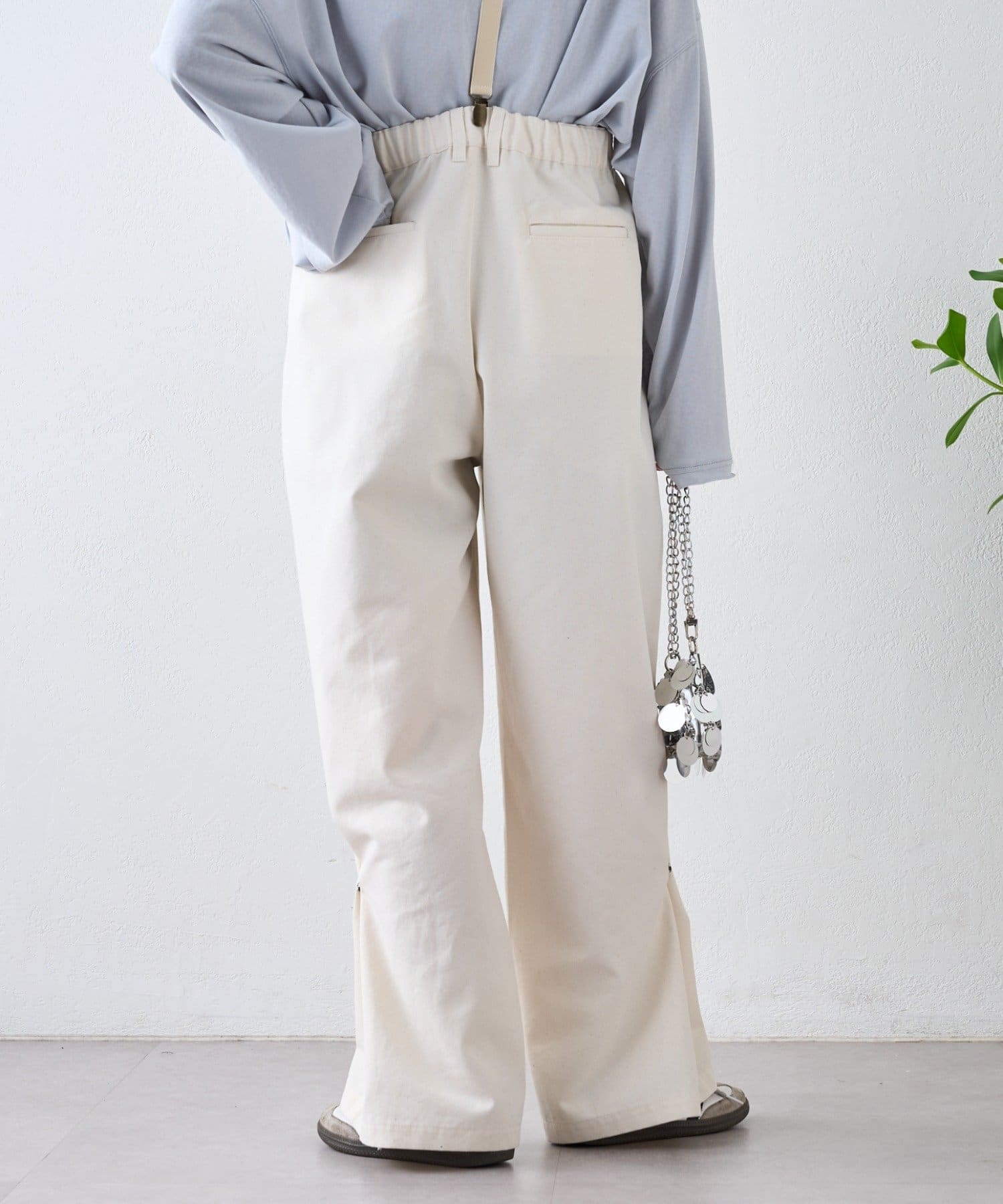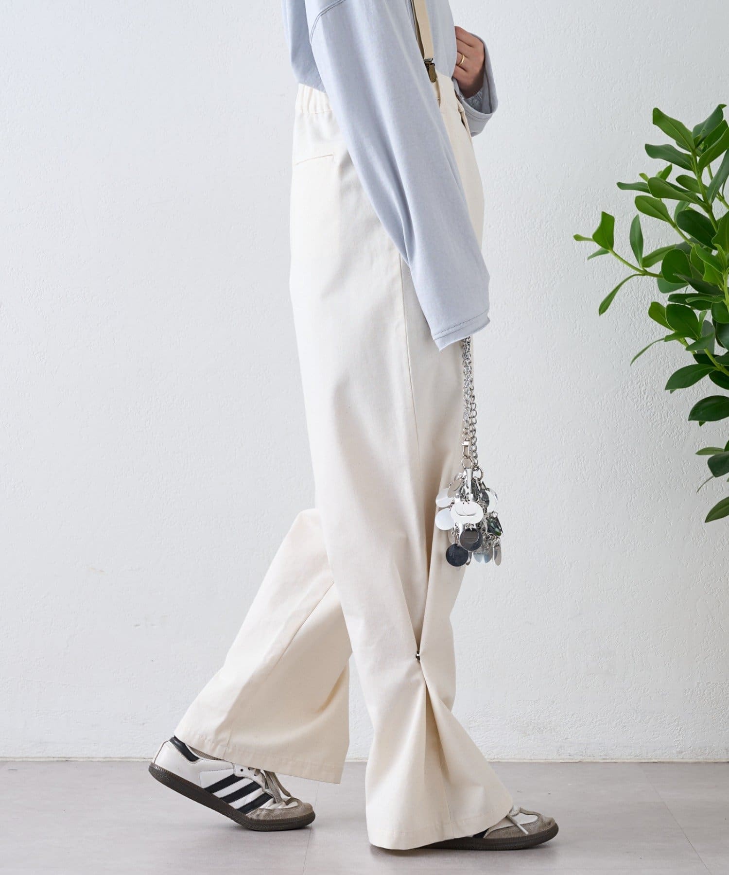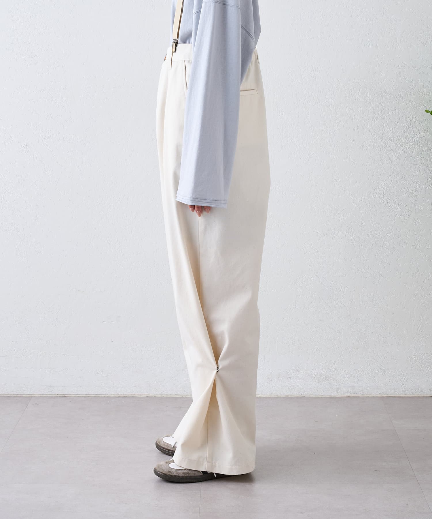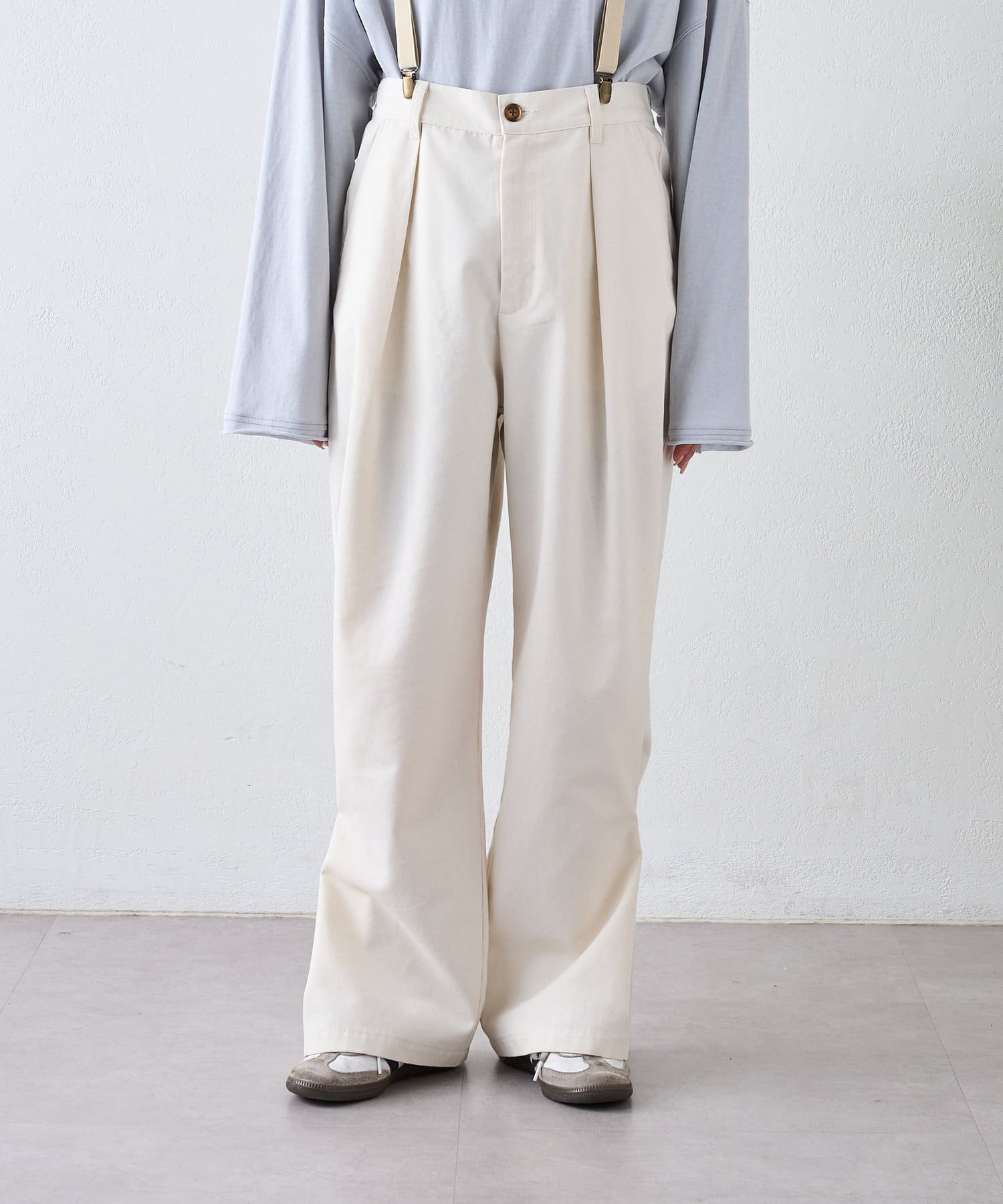 サイドボタンやサスペンダー次第で、コーデの幅が広がるパンツ。