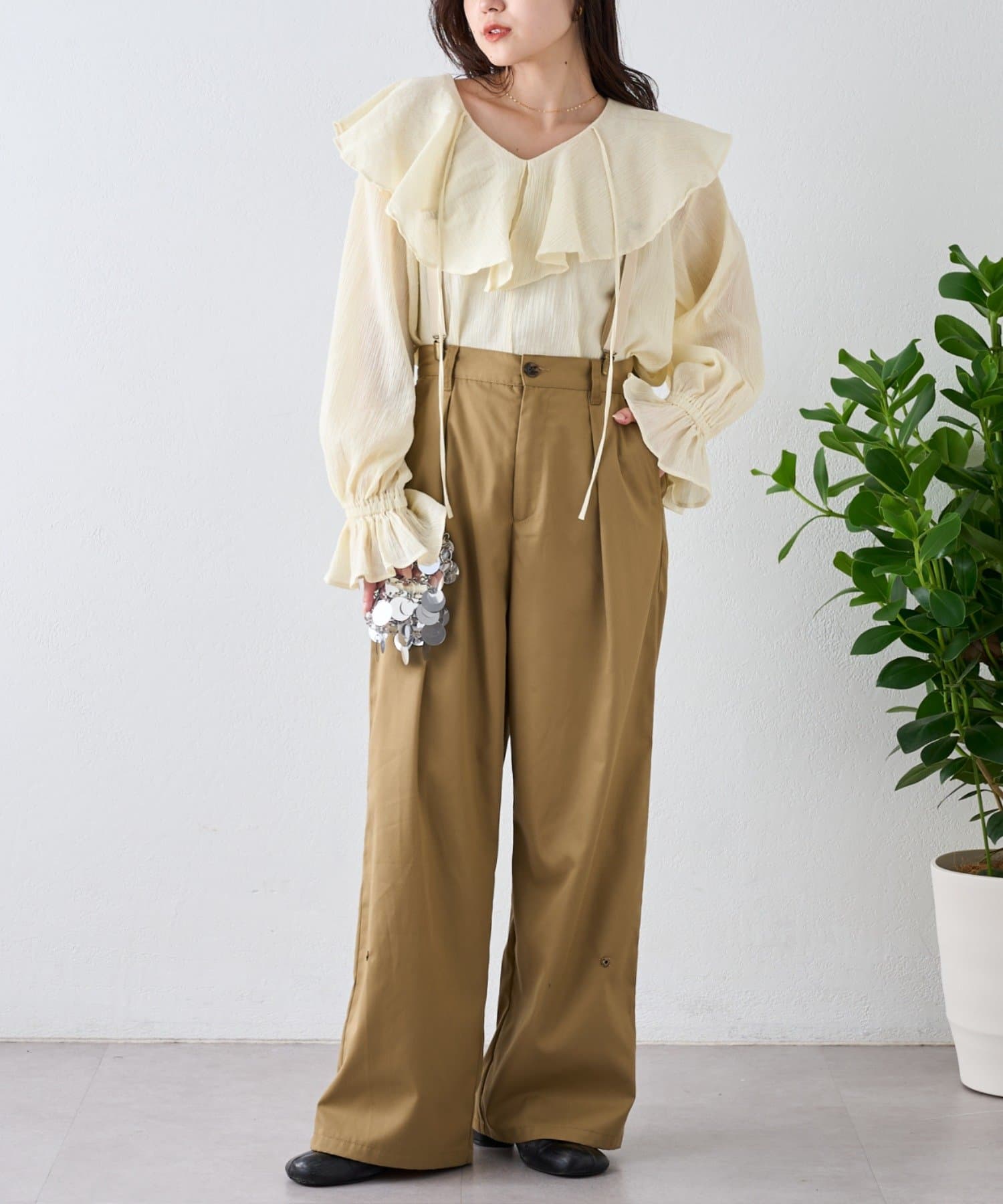 雰囲気を変えて、サイドボタンを外してワイドシルエットでも◎