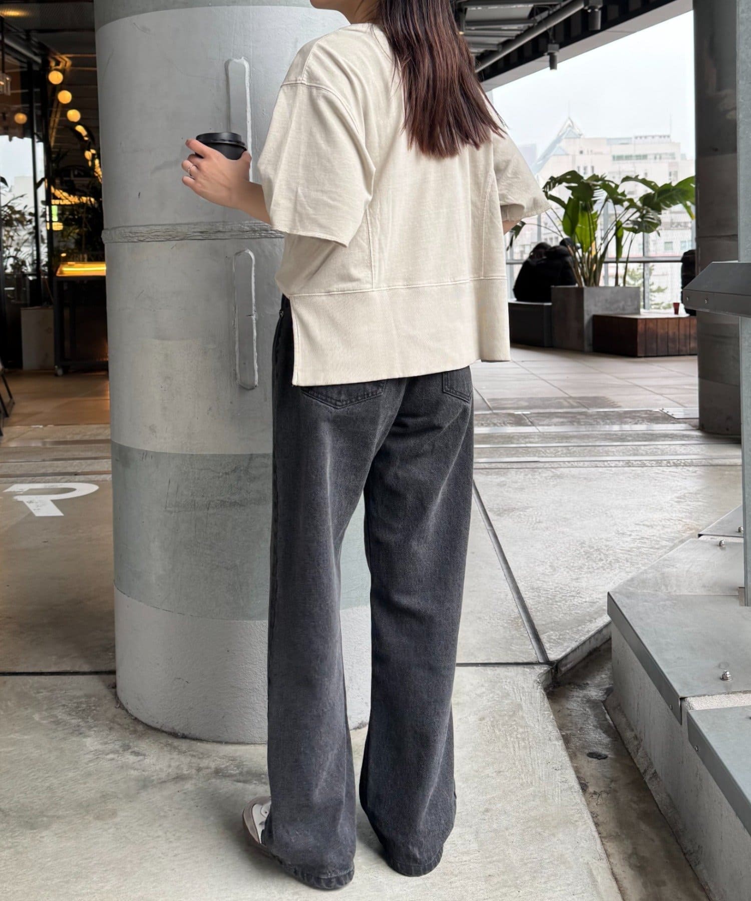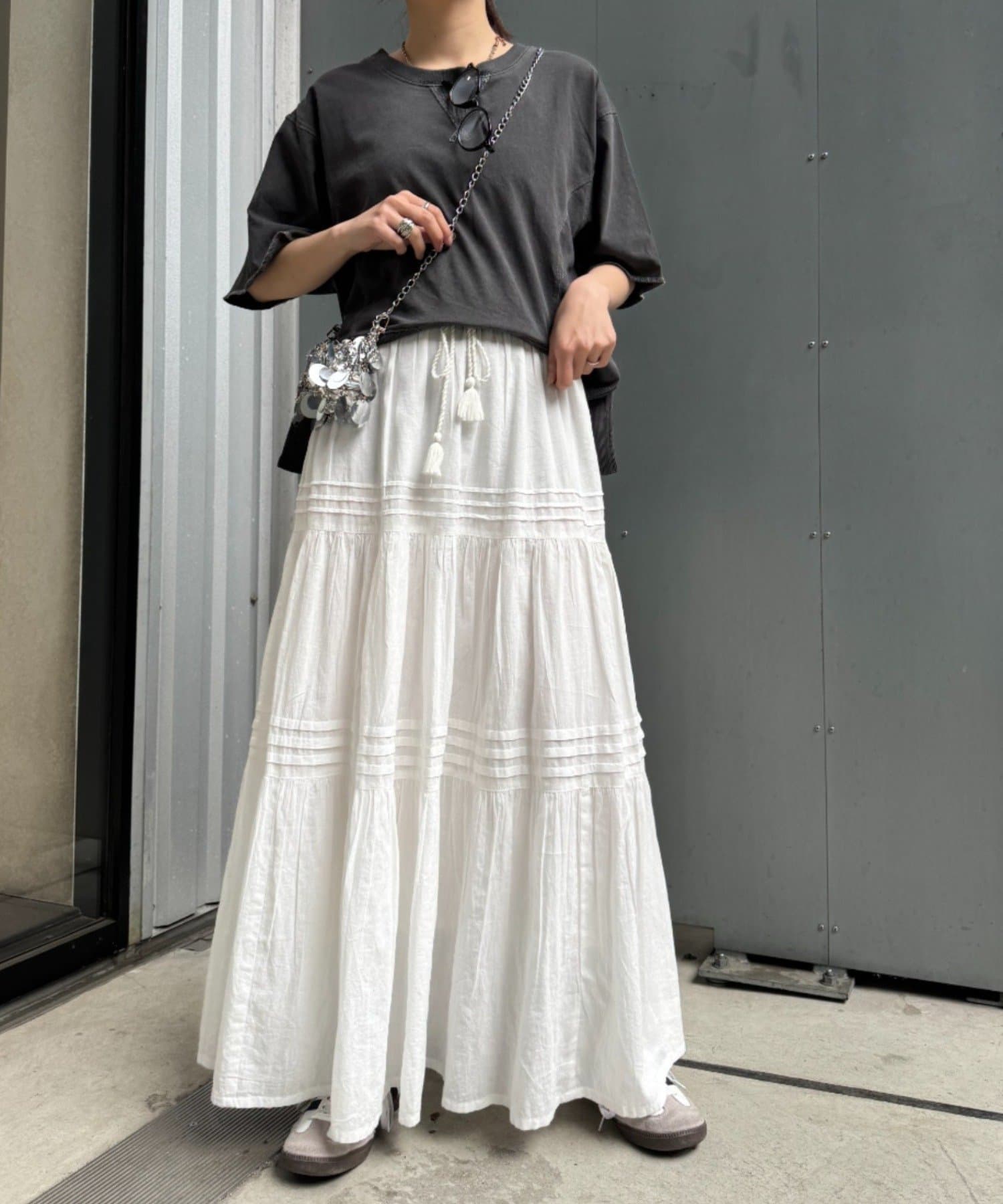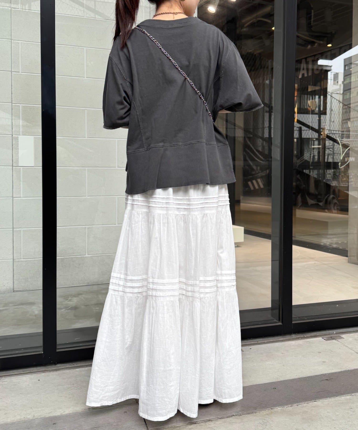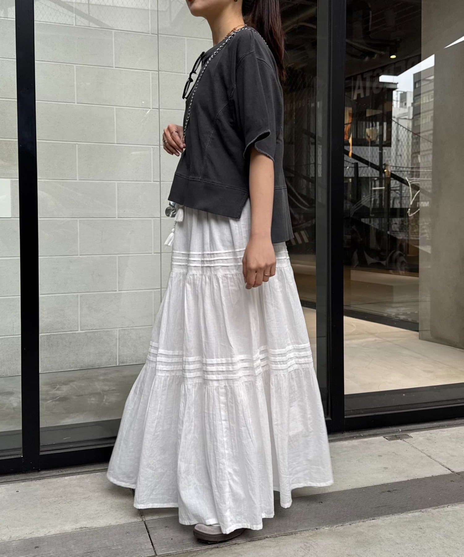 ややショート丈なので、インナーに白TEEやシャツをレイヤードするのも♡
