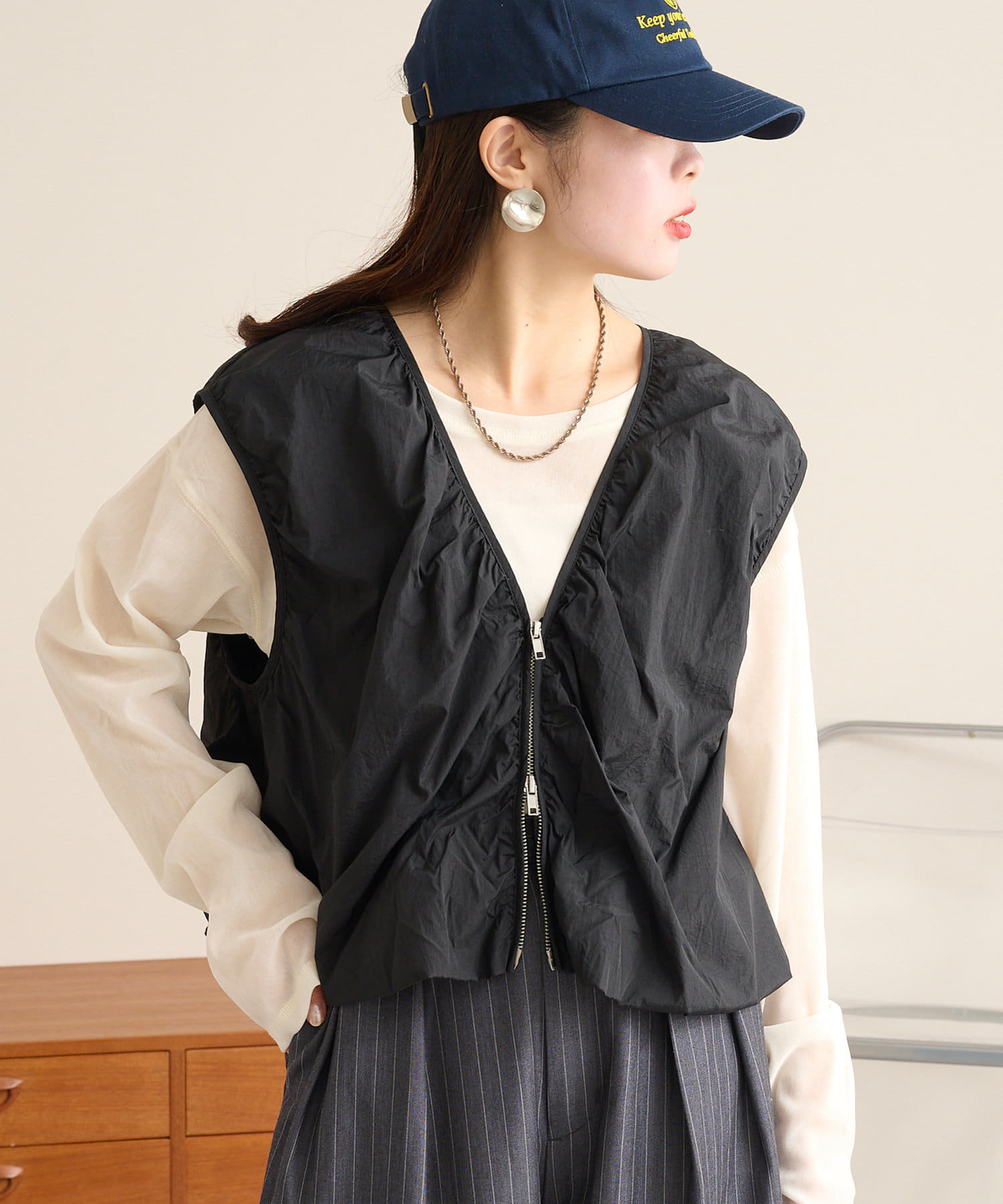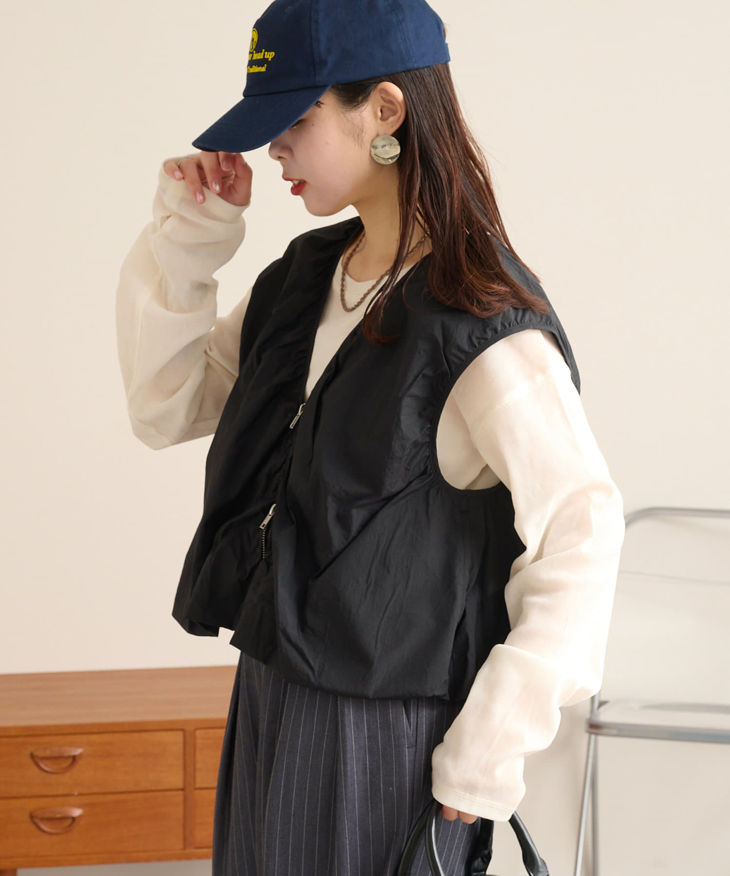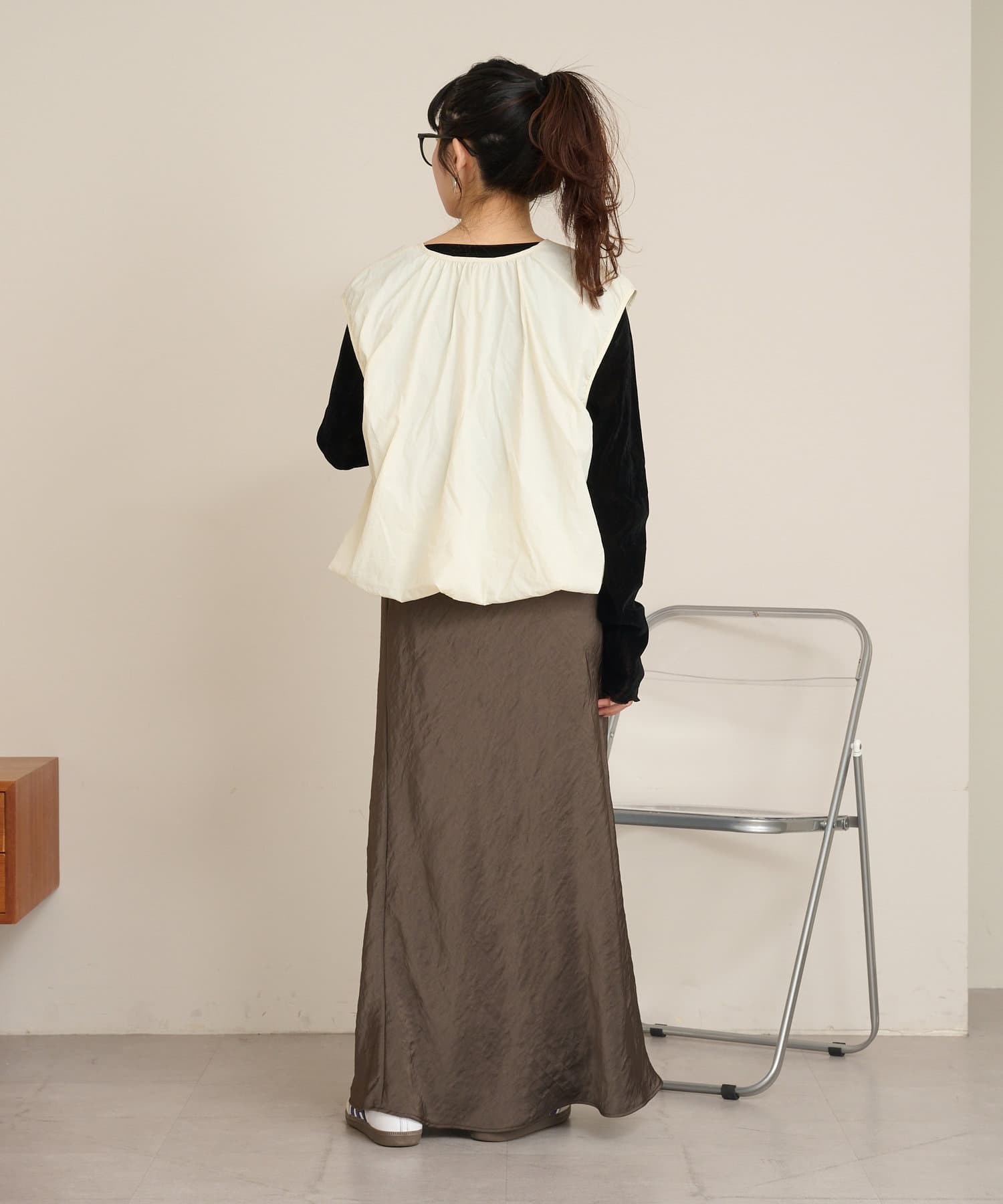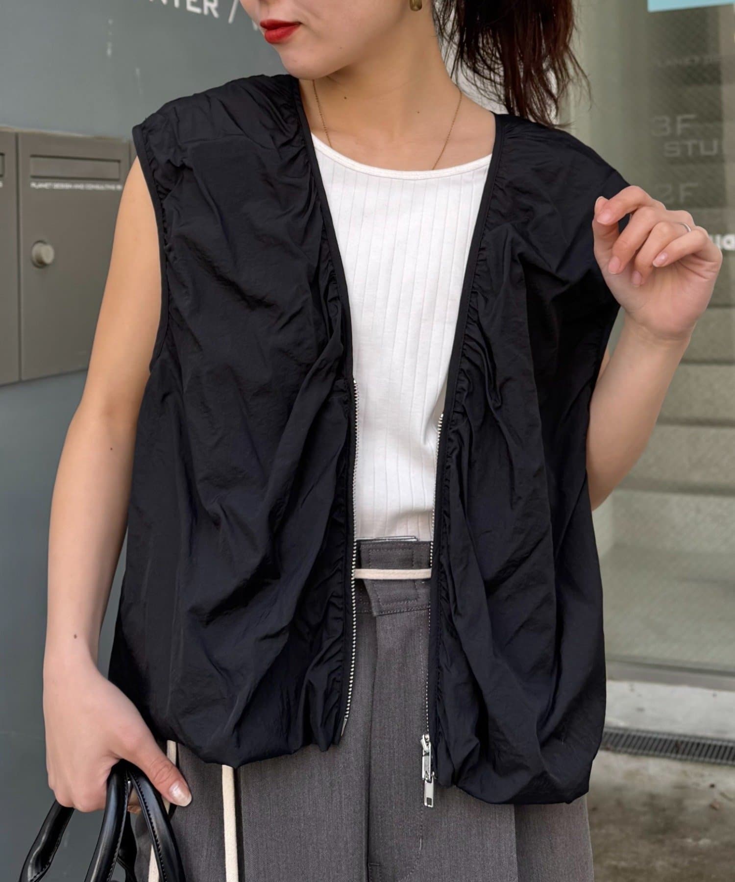 存在感抜群な裾バルーンデザインのベストは、さっとレイヤードするだけで女性らしい雰囲気に◎