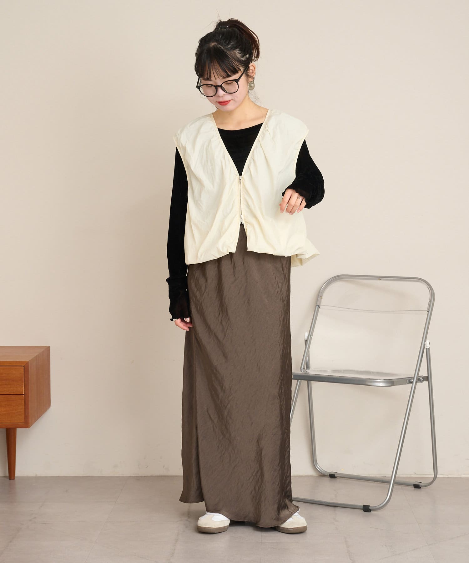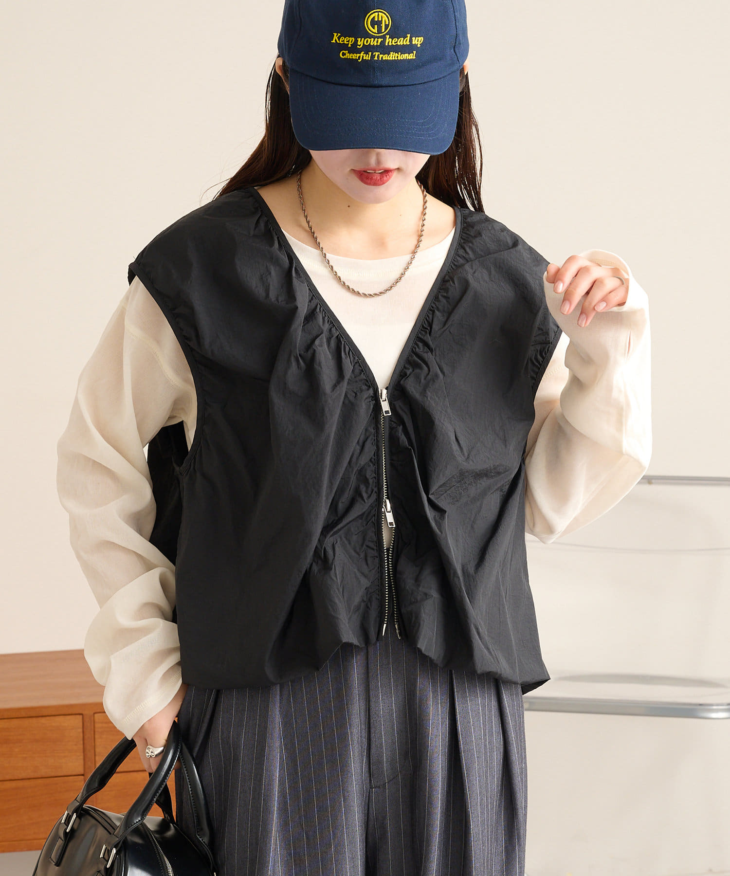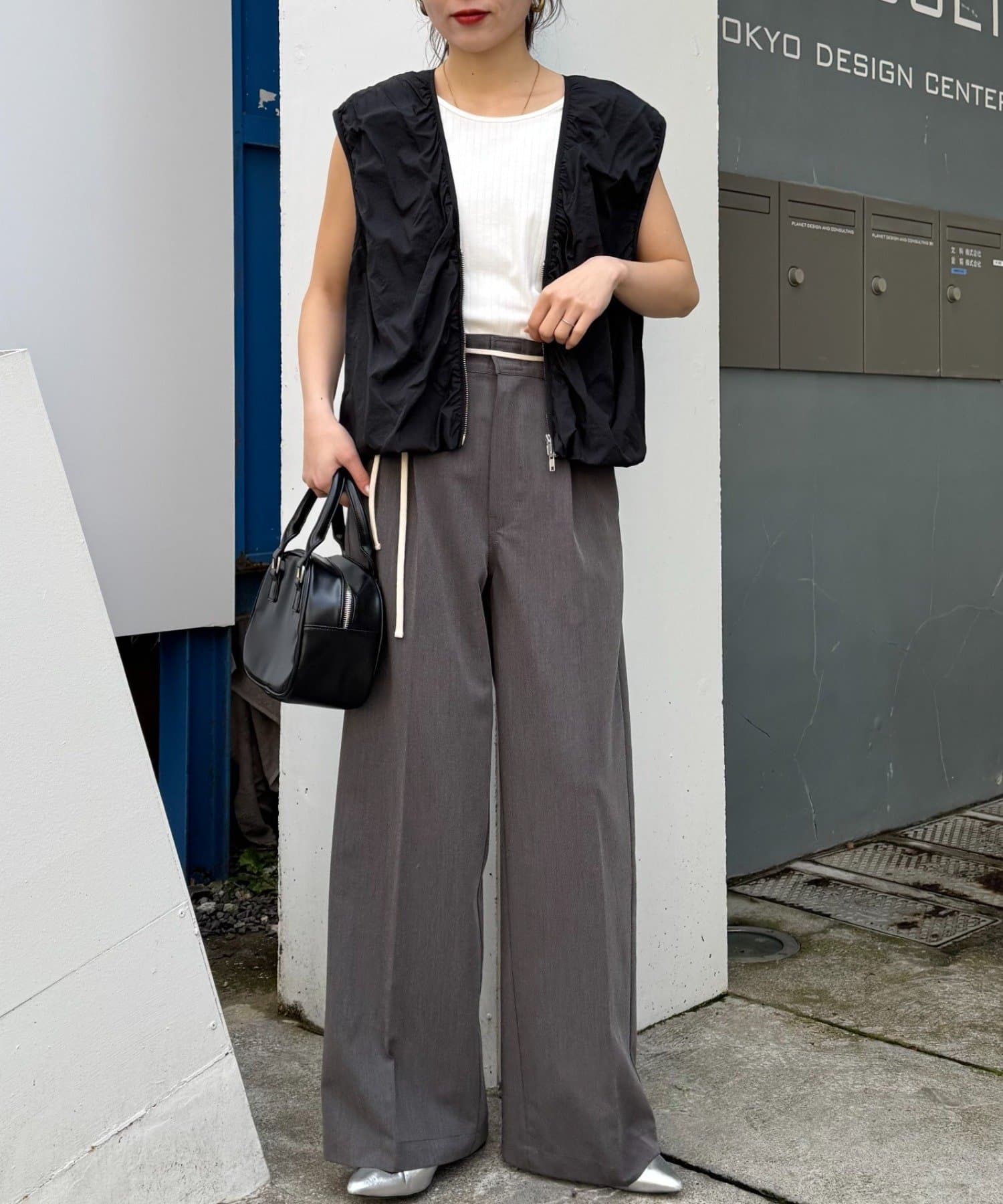 存在感抜群な裾バルーンデザインのベストは、さっとレイヤードするだけで女性らしい雰囲気に◎