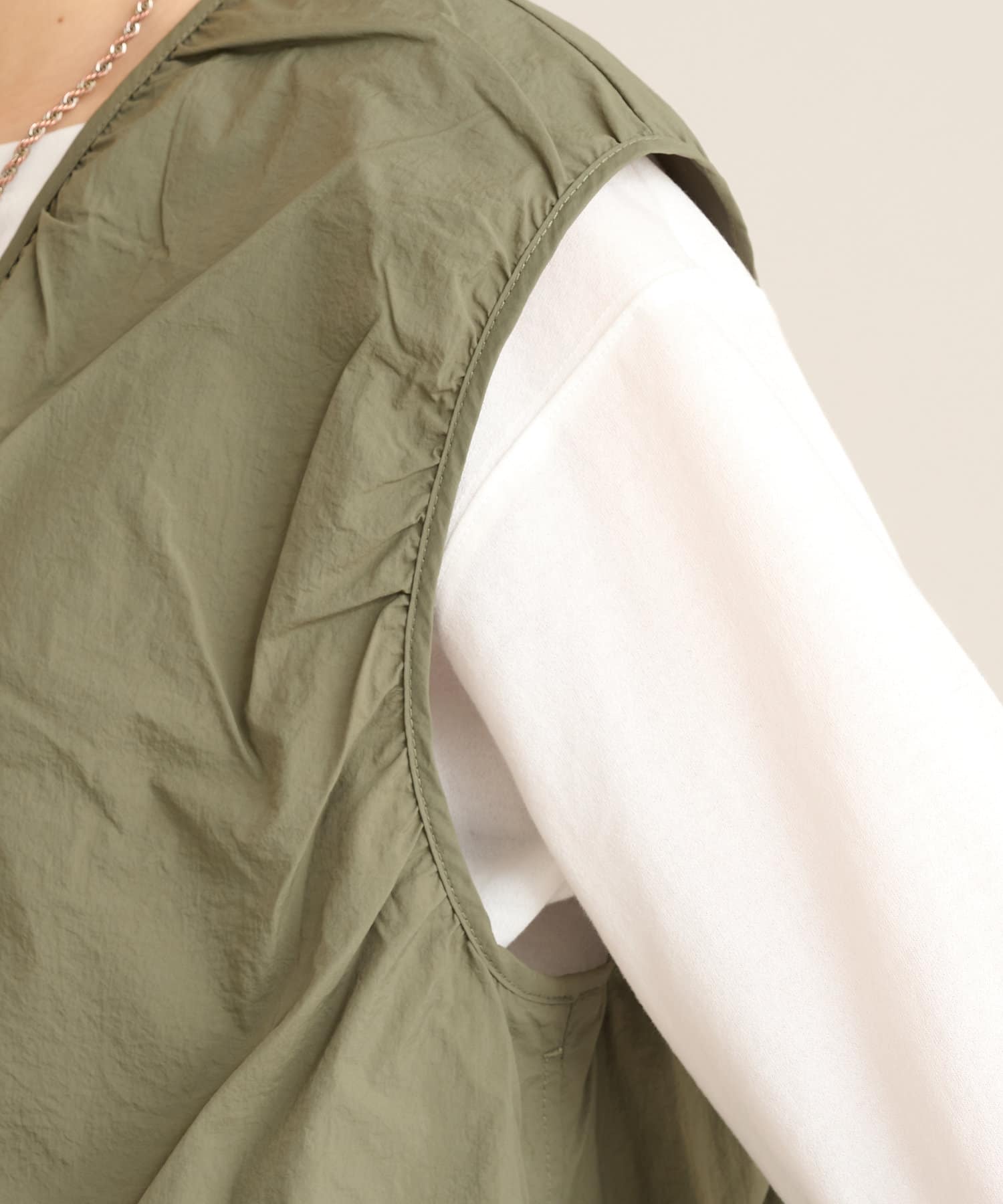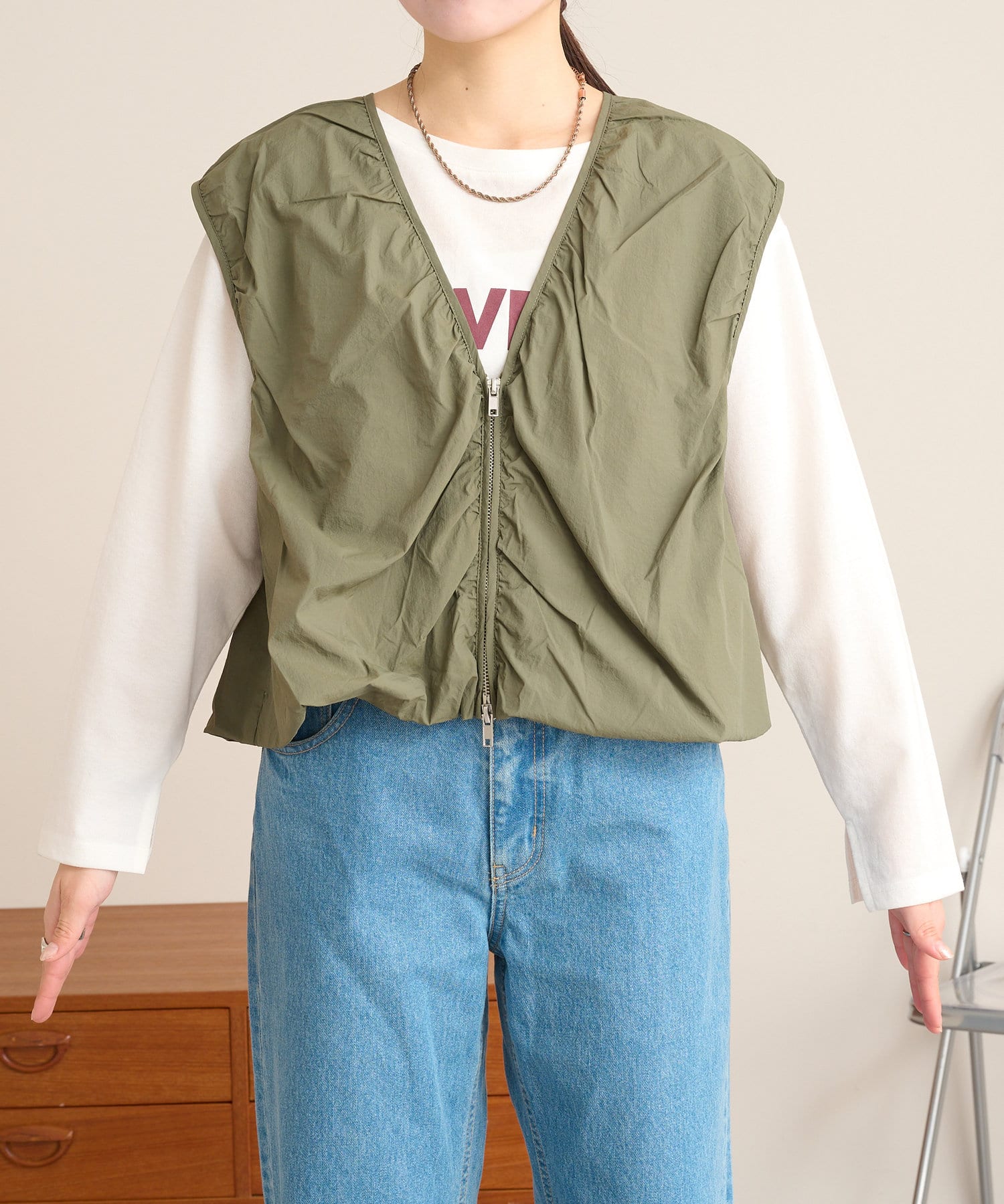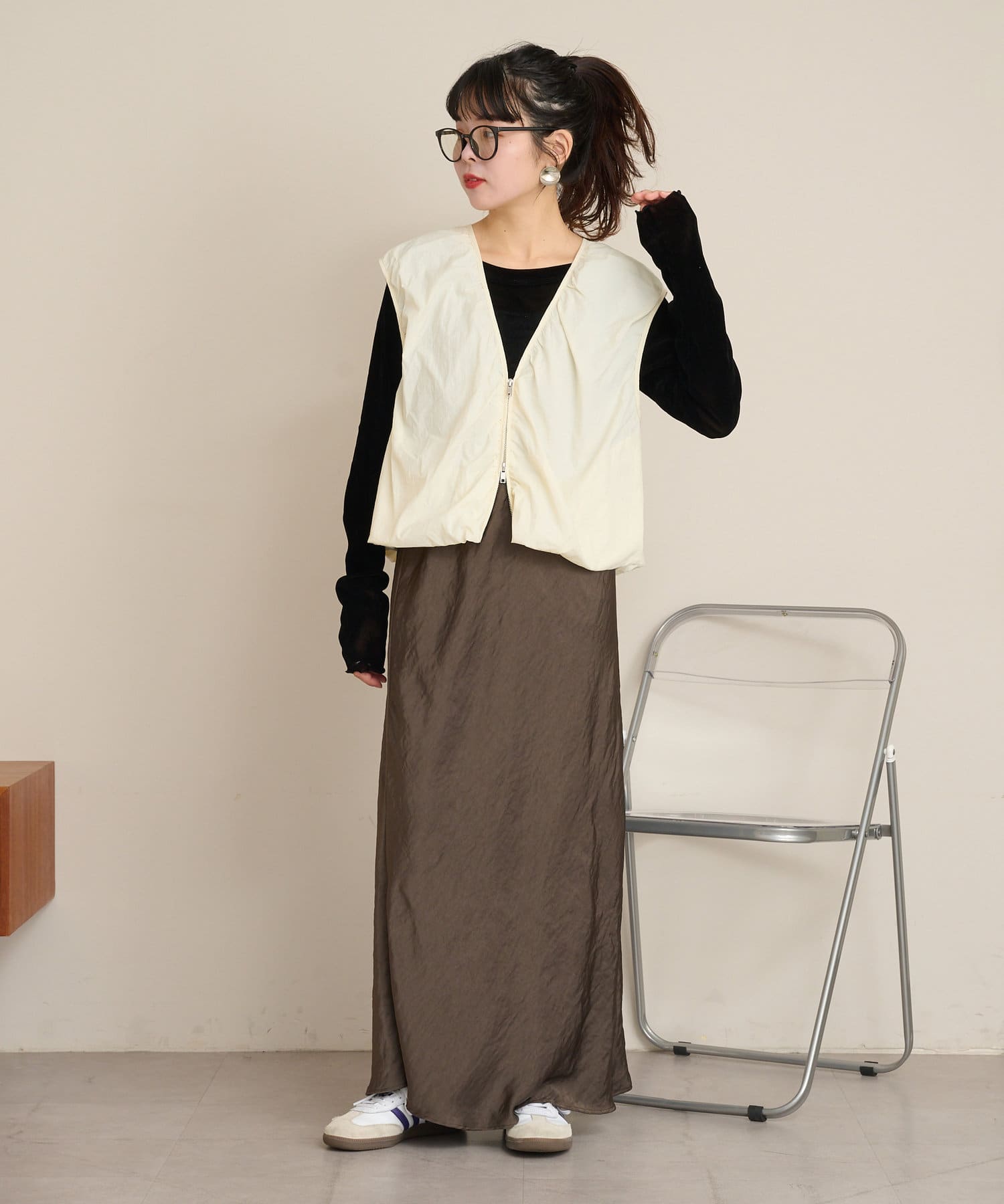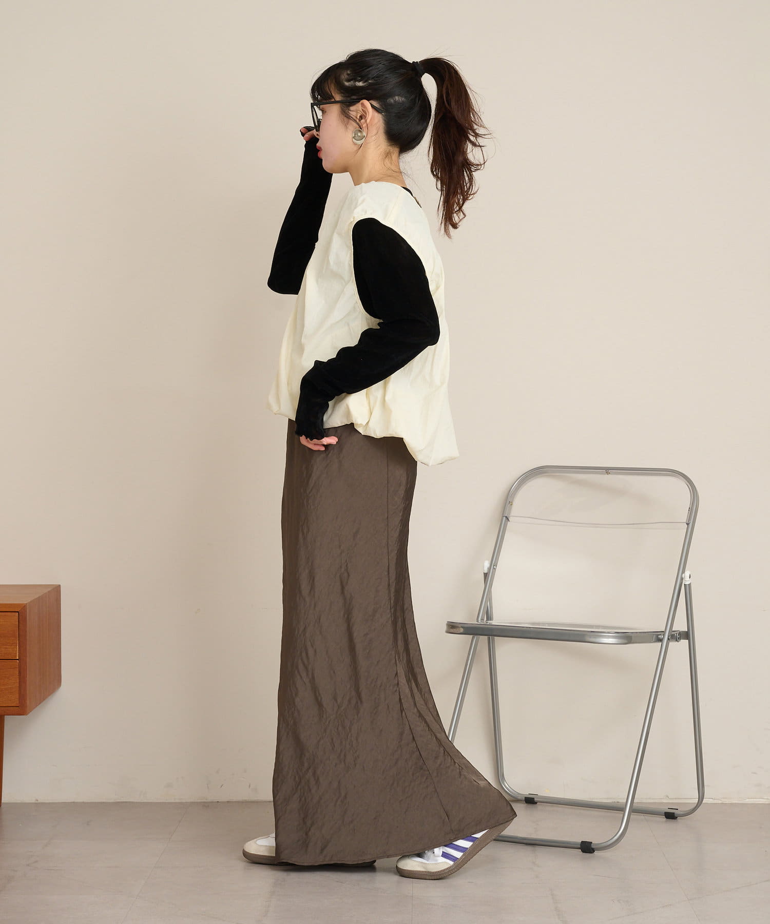 存在感抜群な裾バルーンデザインのベストは、さっとレイヤードするだけで女性らしい雰囲気に◎