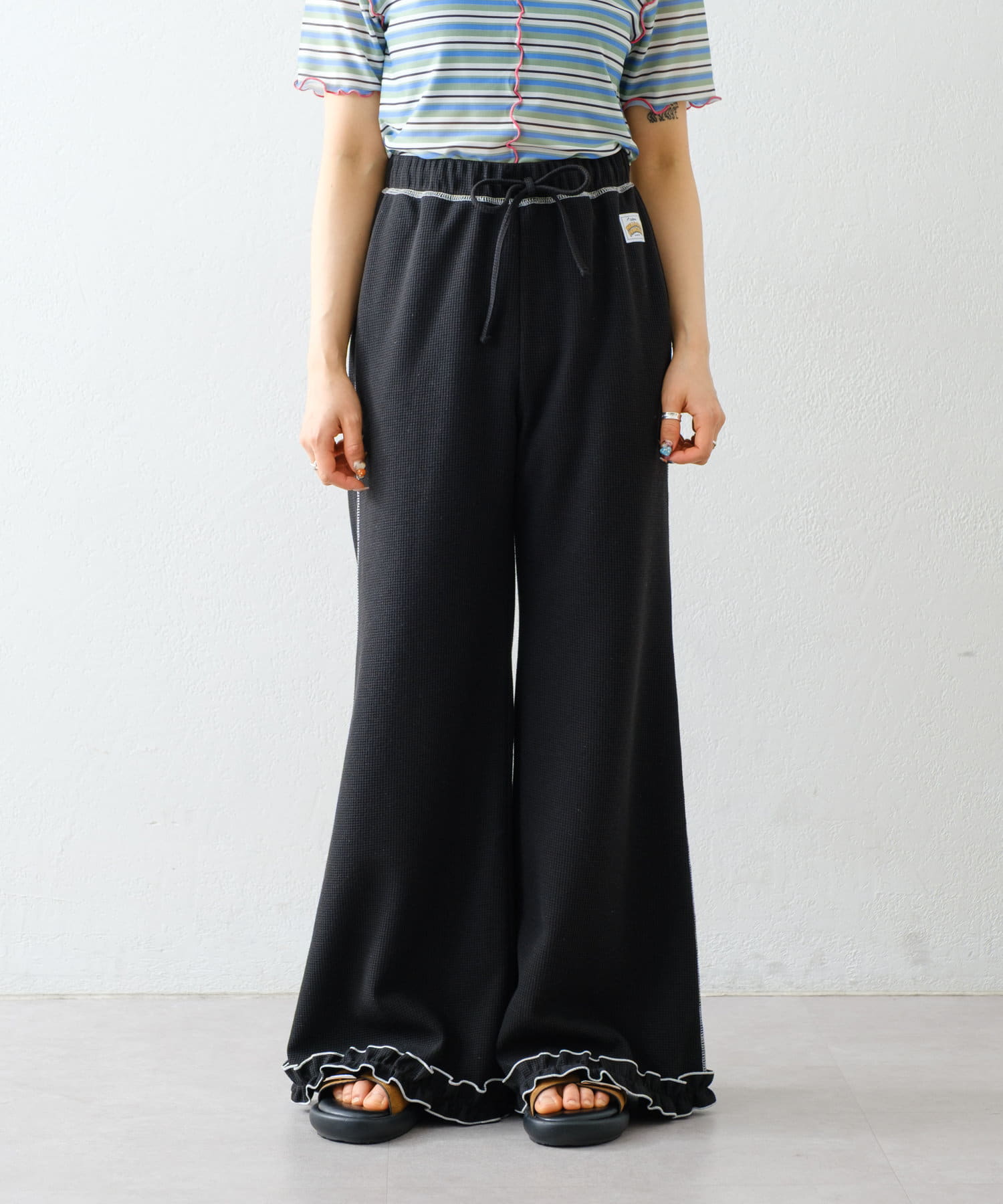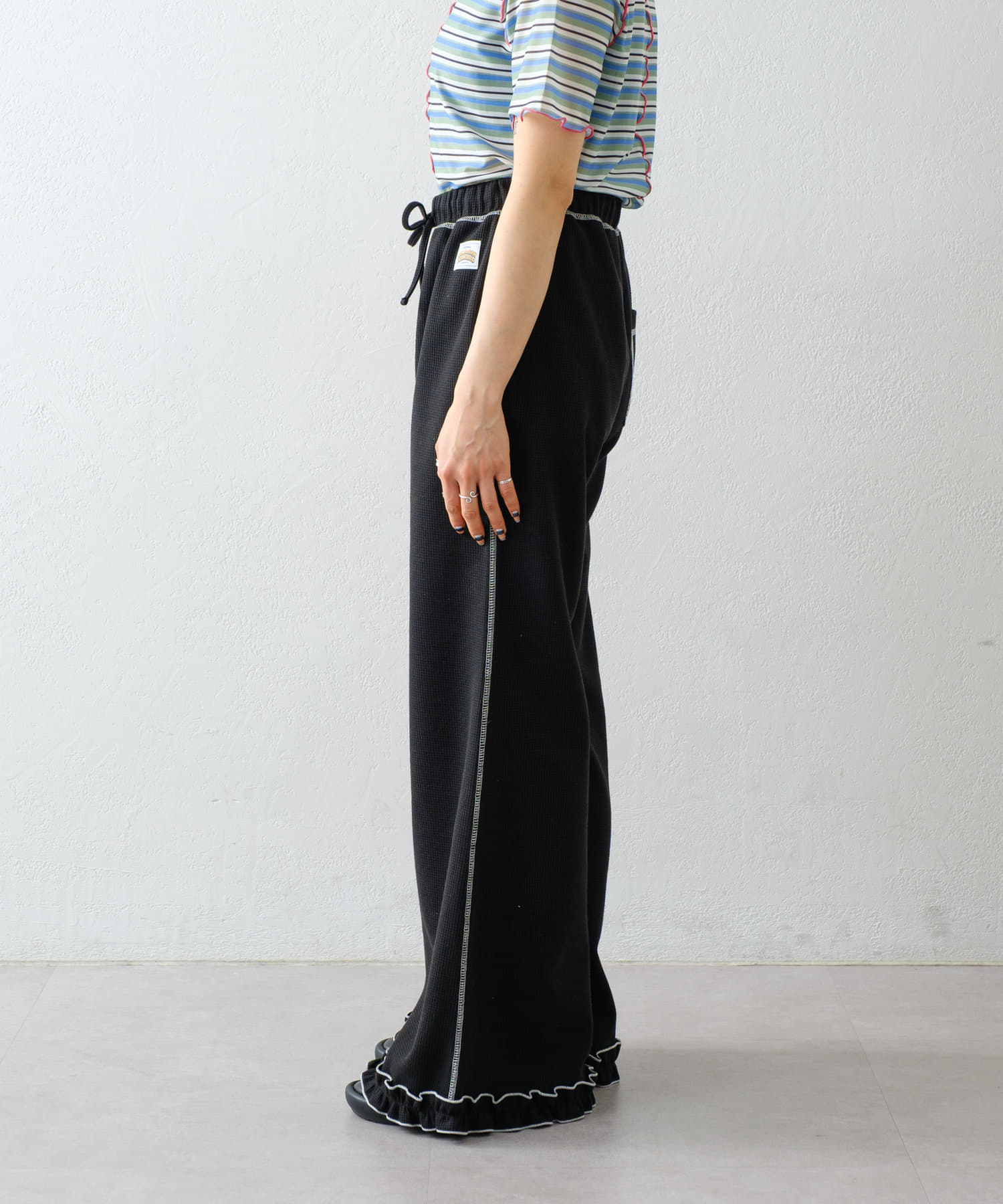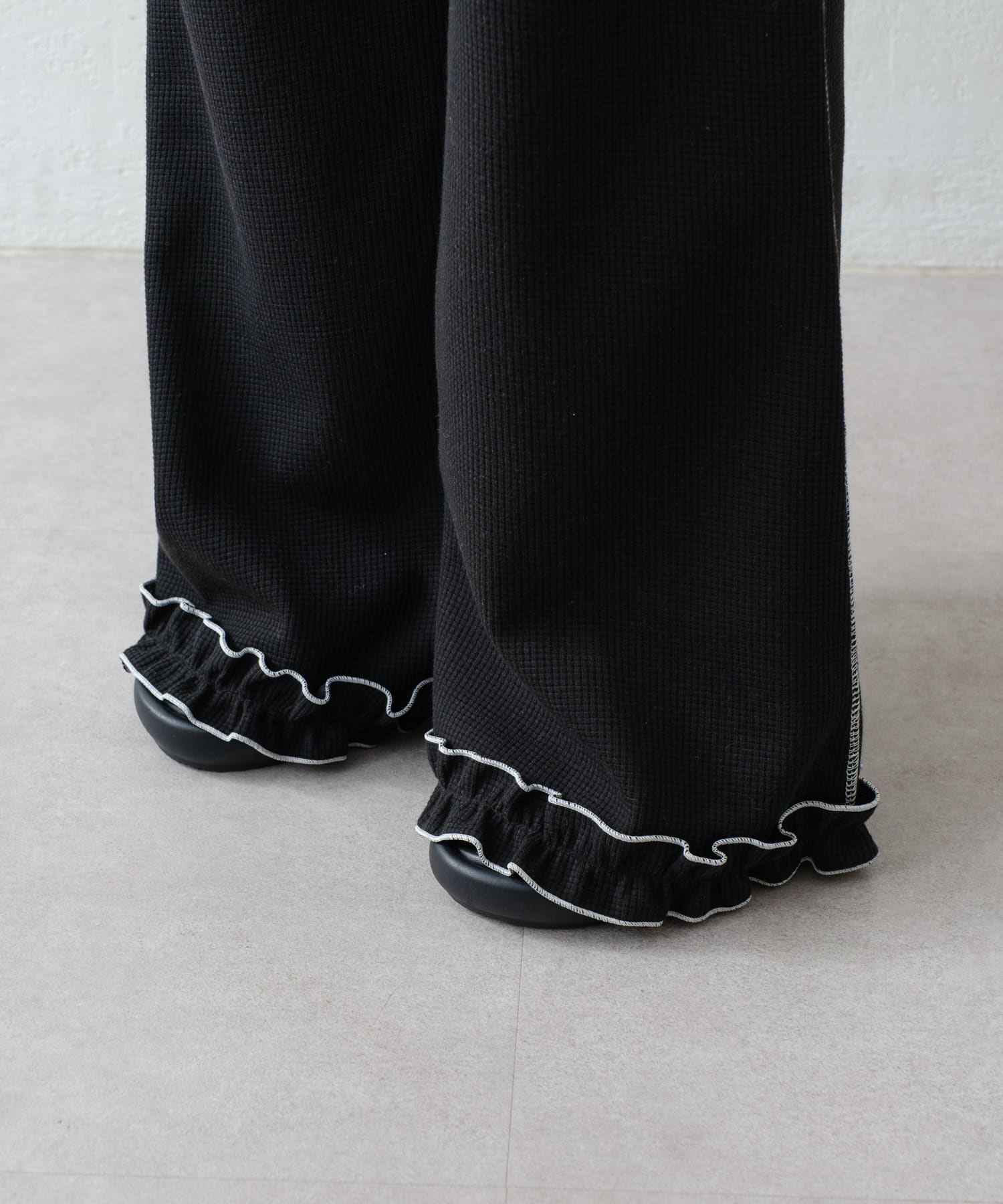 SSの定番、ワッフル生地にフリルをプラス!履き心地とデザイン性どちらも叶えるパンツができました♪