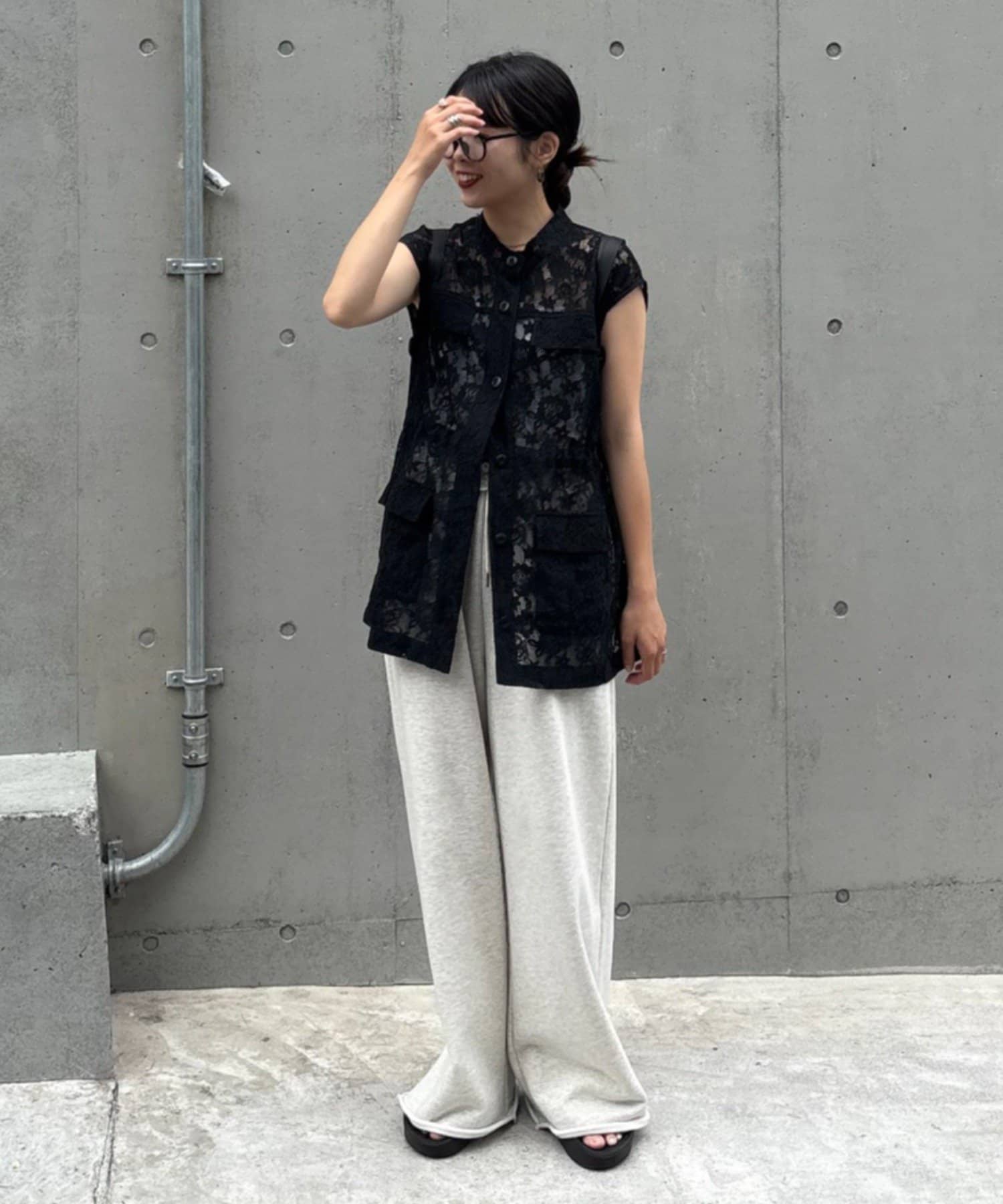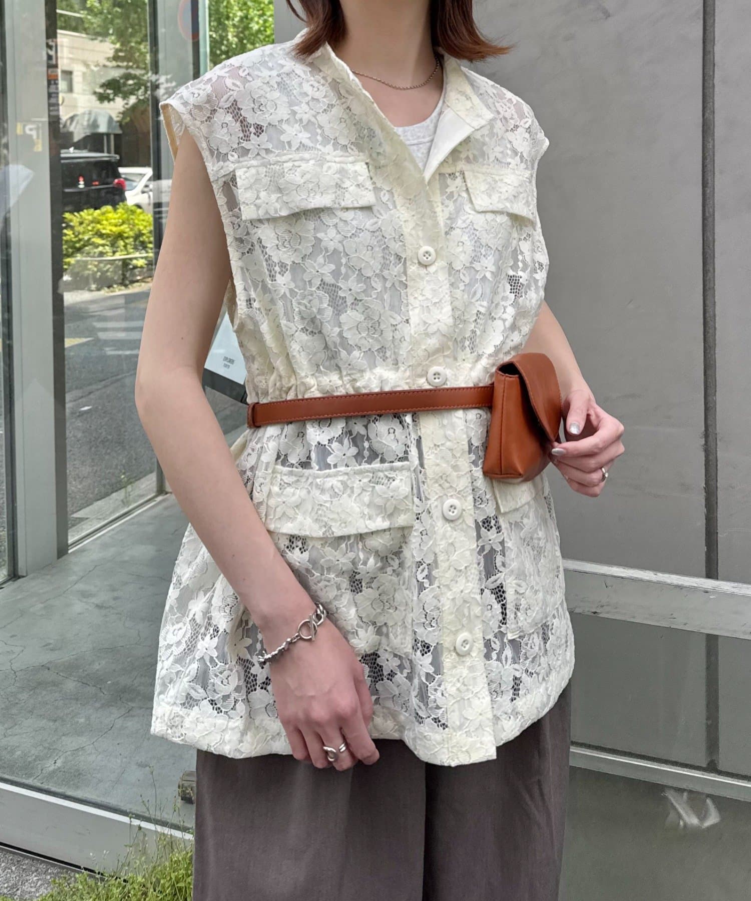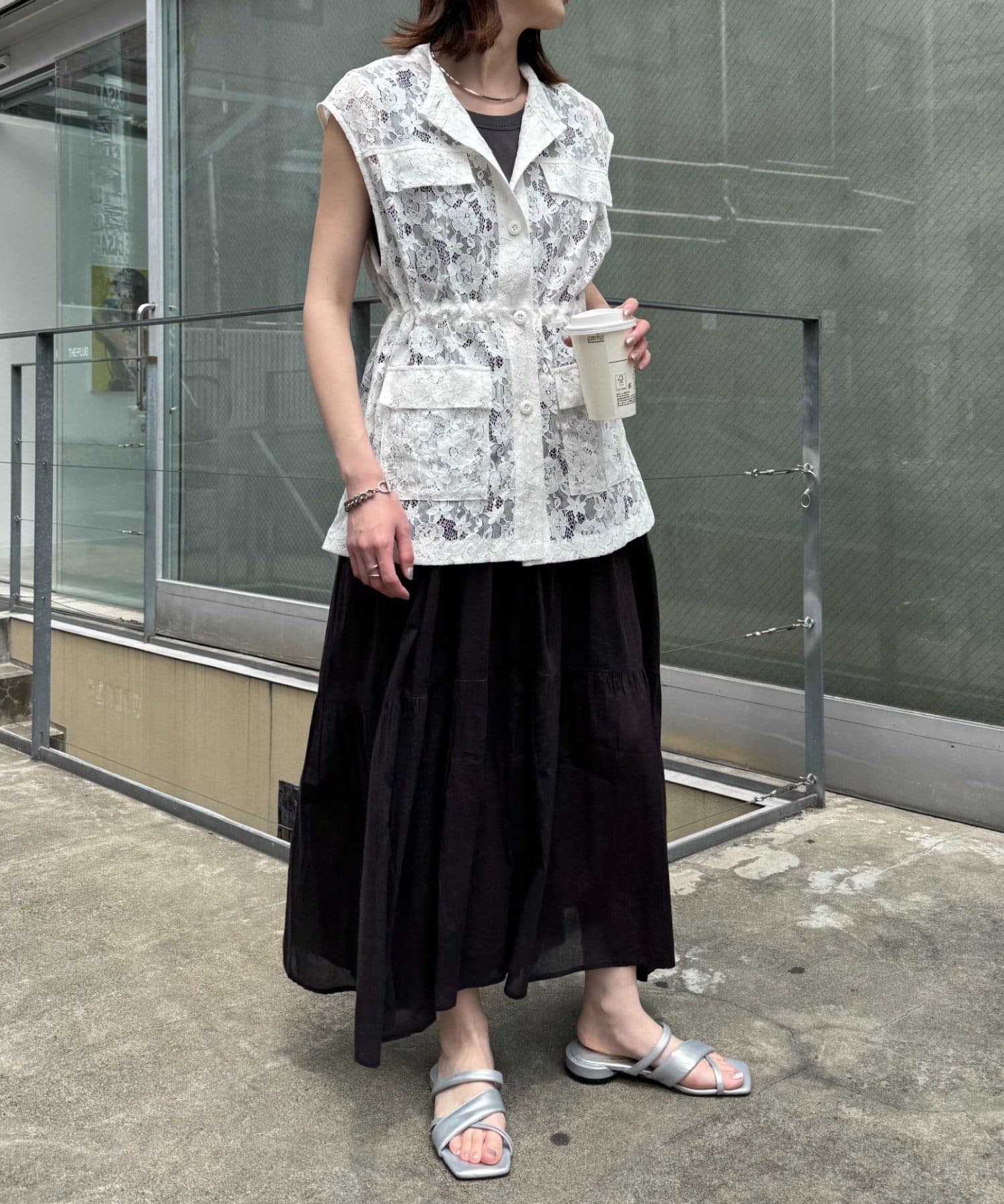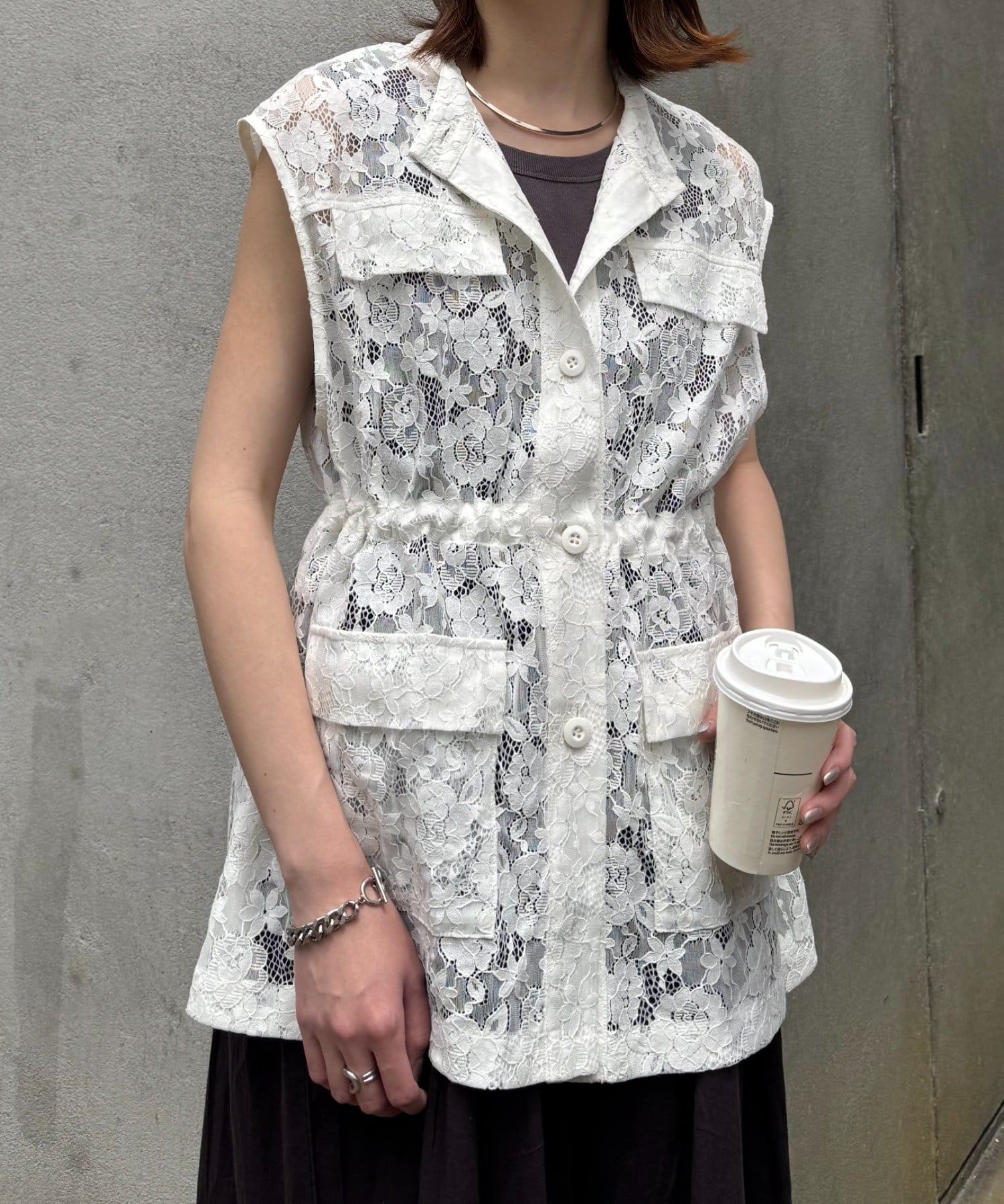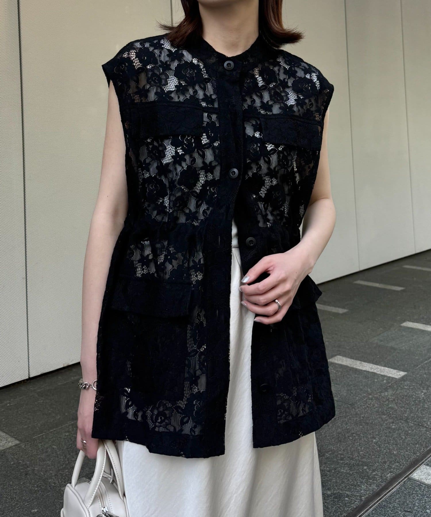メンズライクになりがちな大きめベストを、レースで女性らしく仕上げました!