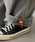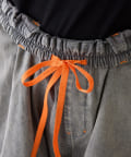 程よく色落ちした素材に、アクセントカラーのステッチやドローコードがさりげなくデザインをプラス。