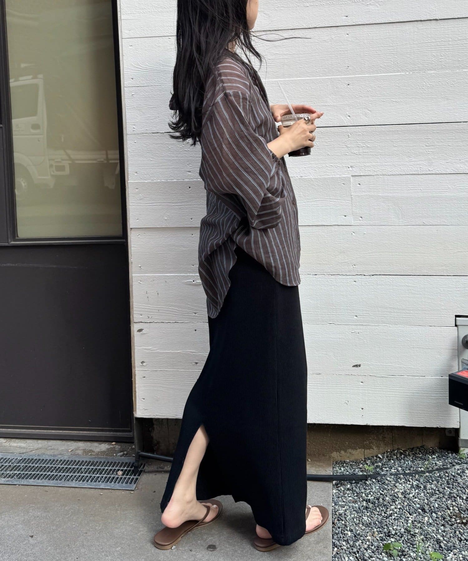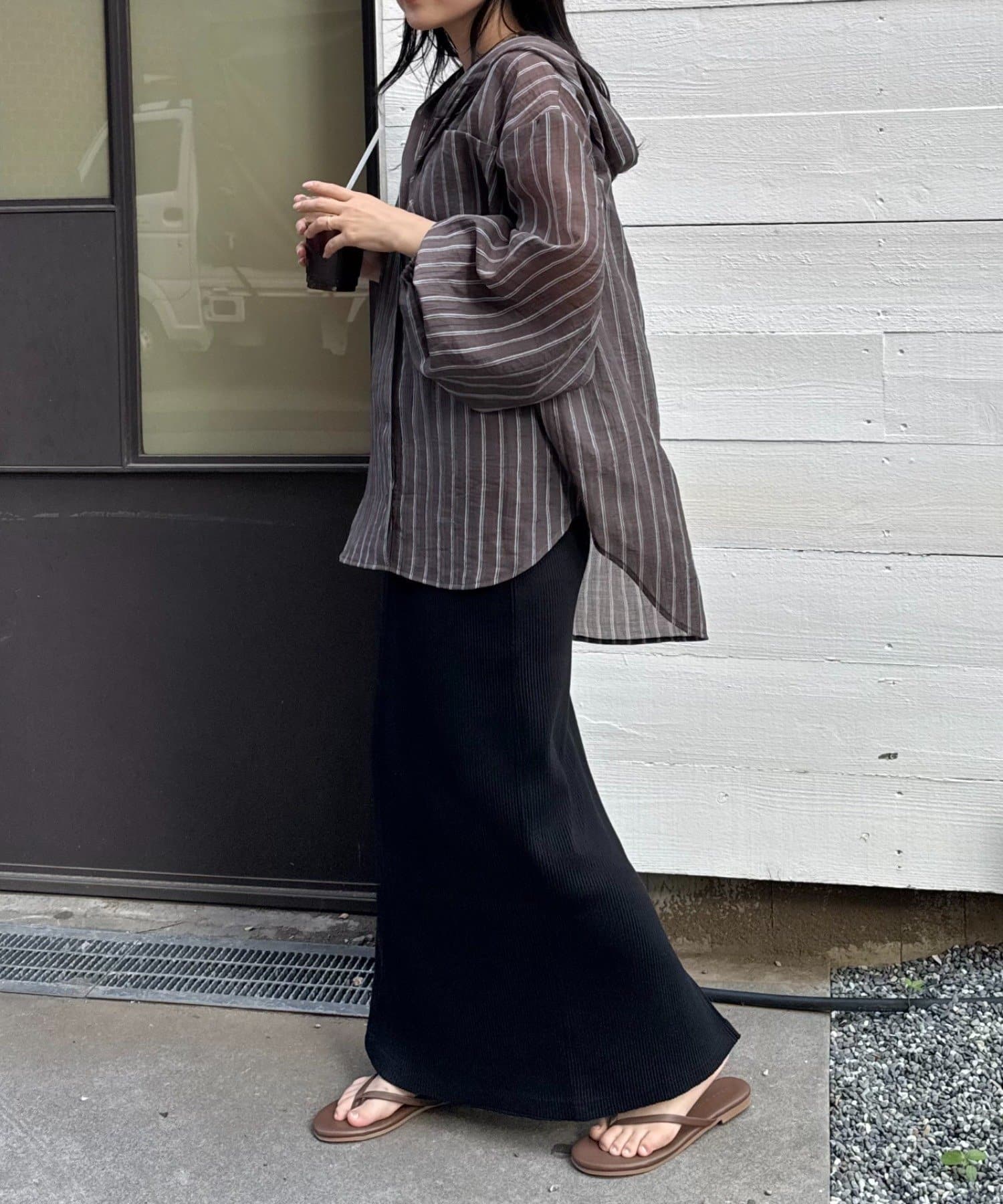 動くたびにふわっとするシルエットと程よい透け感が、女性らしさをプラス。